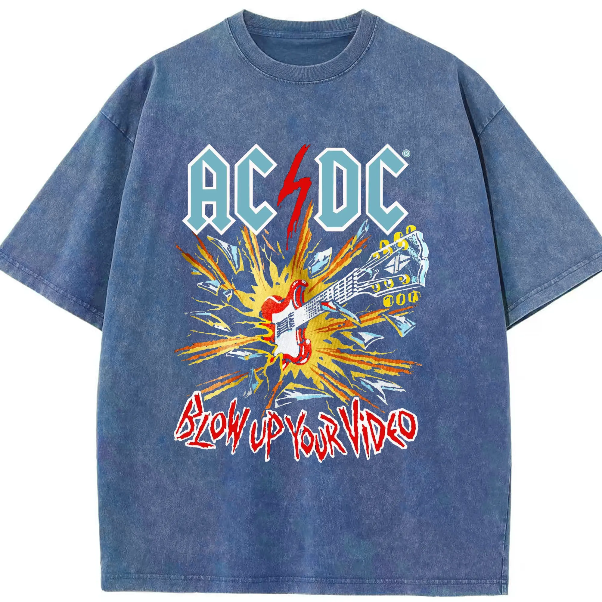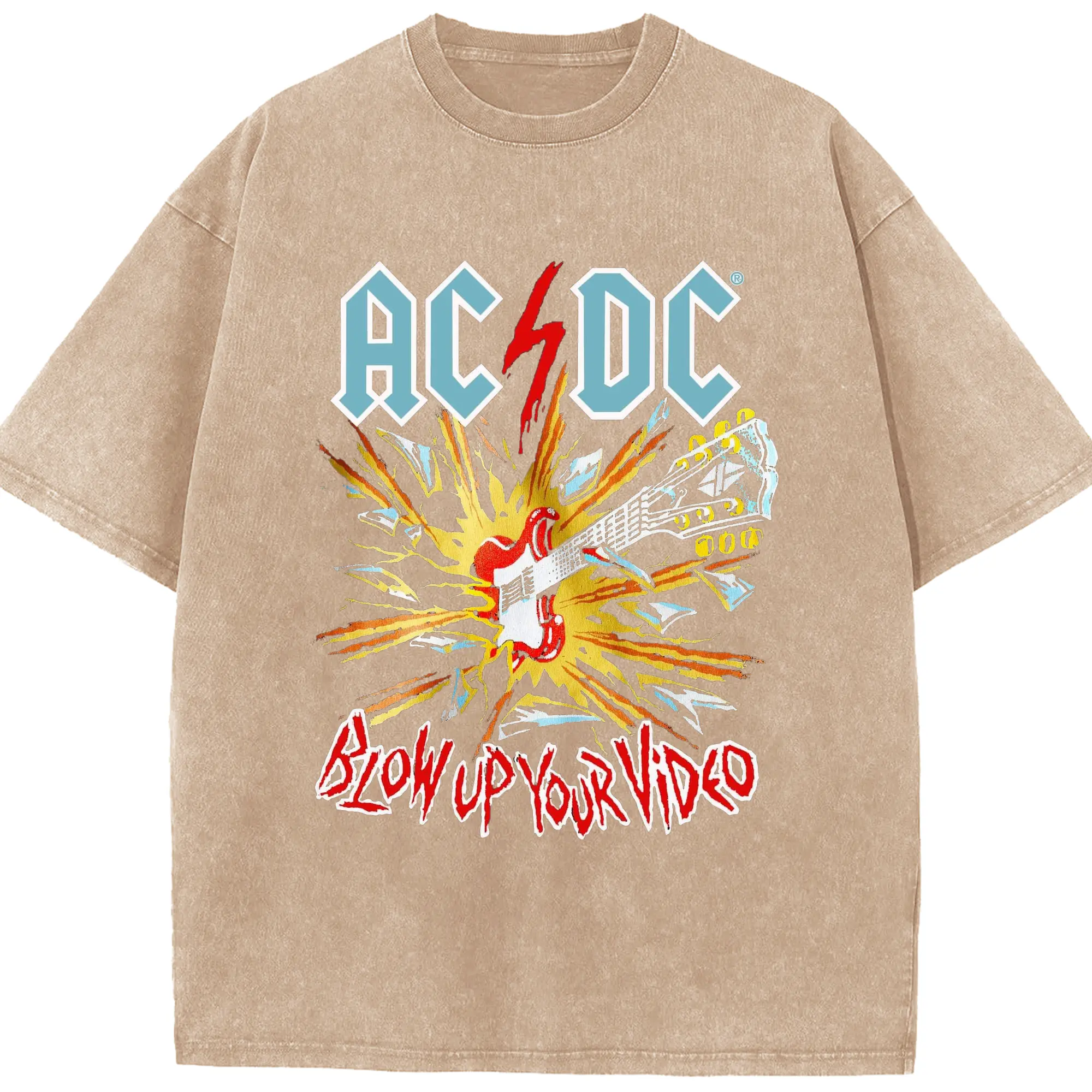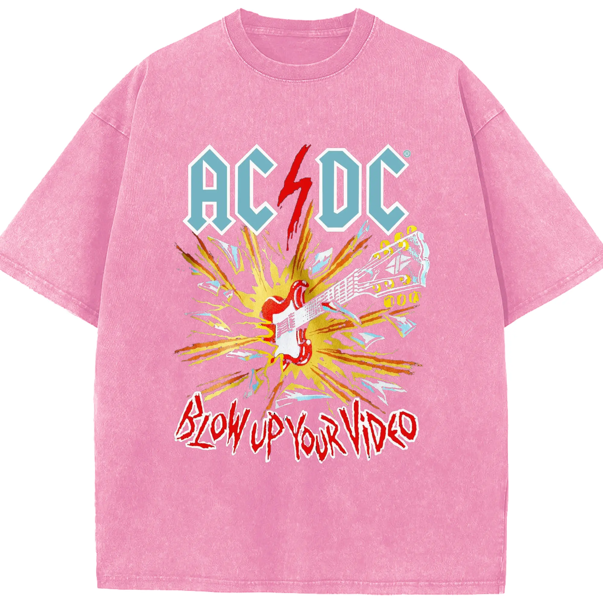 :AC/DC Hard Rock Album “Blow Up Your Video” DIY - Washed Vintage Look 230g Cotton Oversized T-Shirt With Front Heat Transfer Print – Soft, Lightweight, Stylish Fit – Comfortable Casual Wear For Sports & Everyday Use