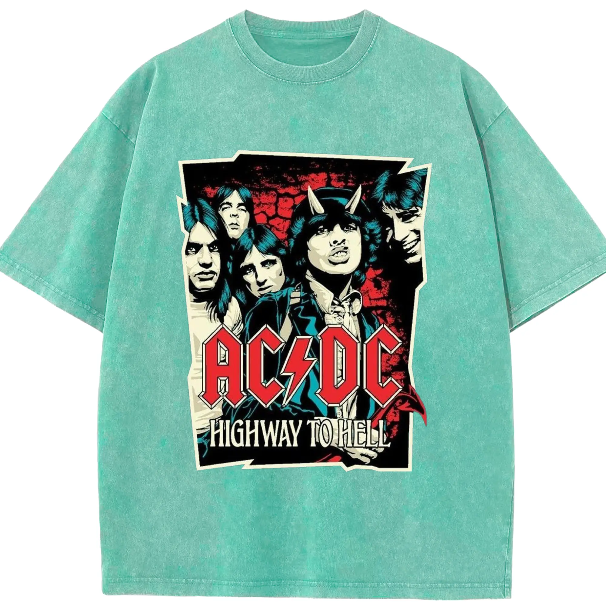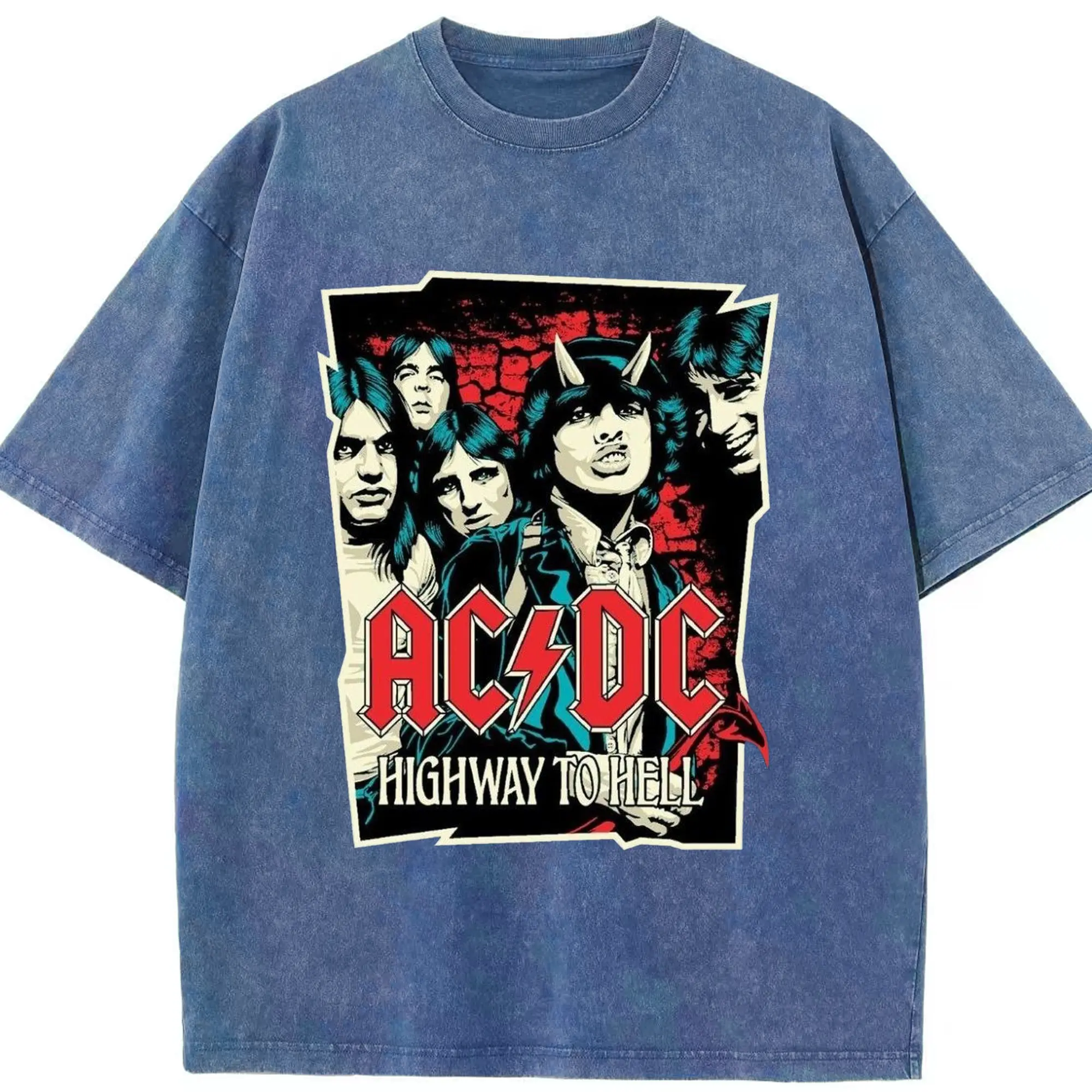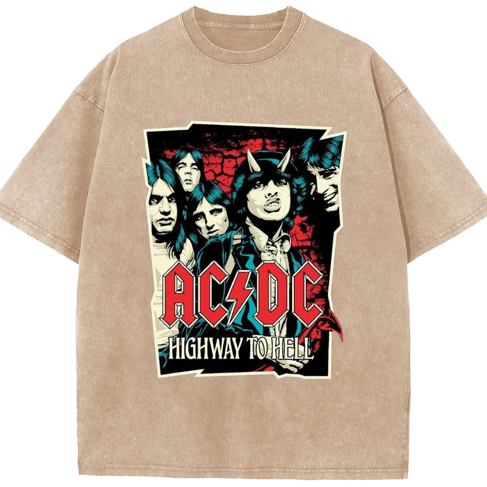 AC/DC Hard Rock “Highway to Hell” Art DIY - Washed Vintage Look 230g Cotton Oversized T-Shirt With Front Heat Transfer Print – Soft, Lightweight, Stylish Fit – Comfortable Casual Wear For Sports & Everyday Use