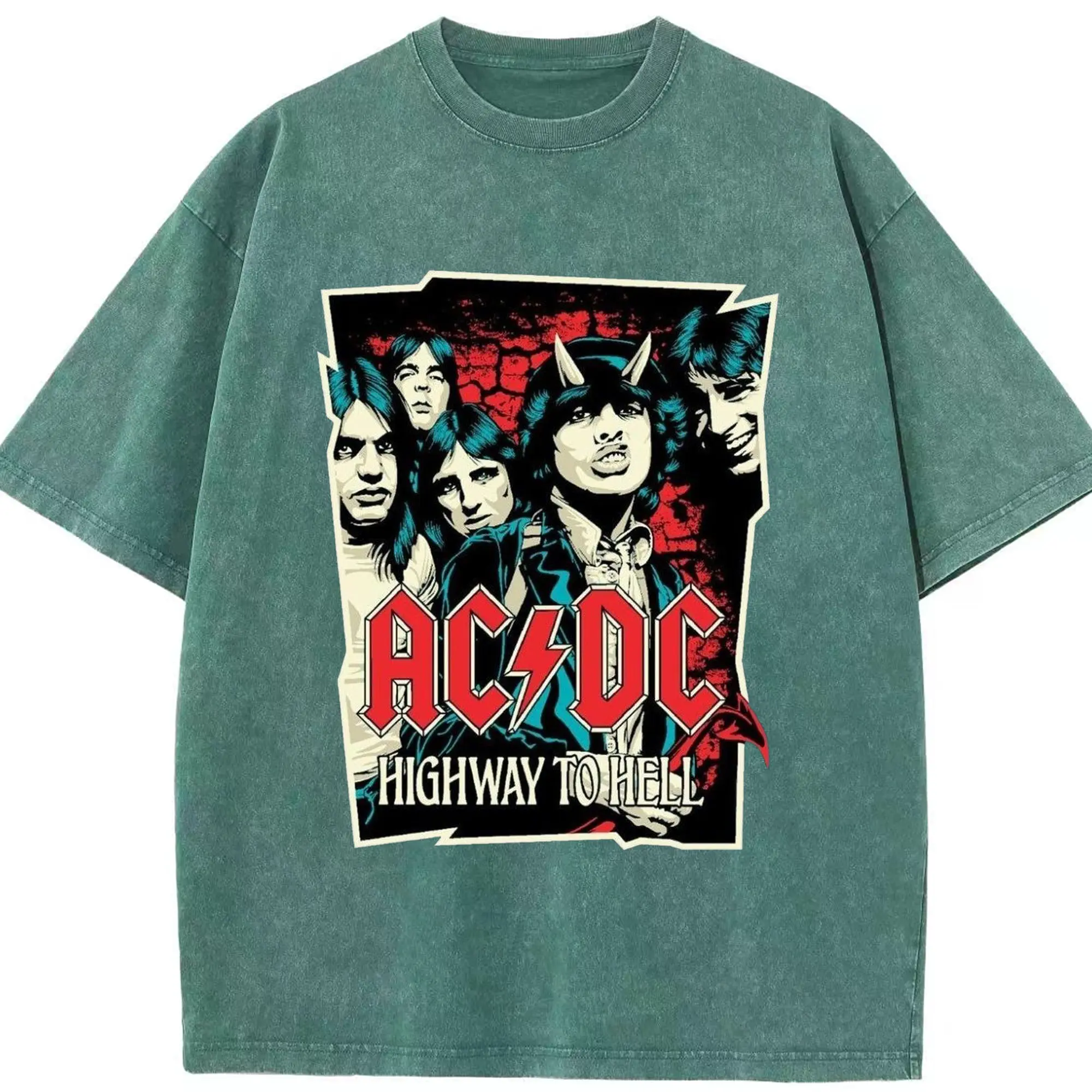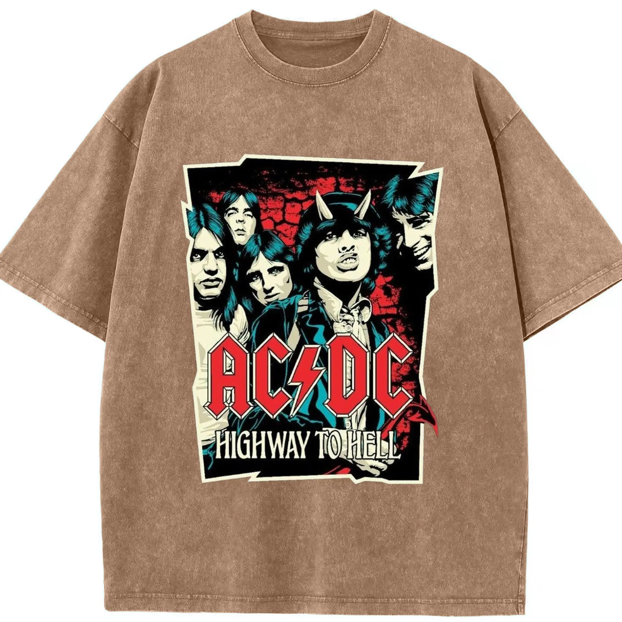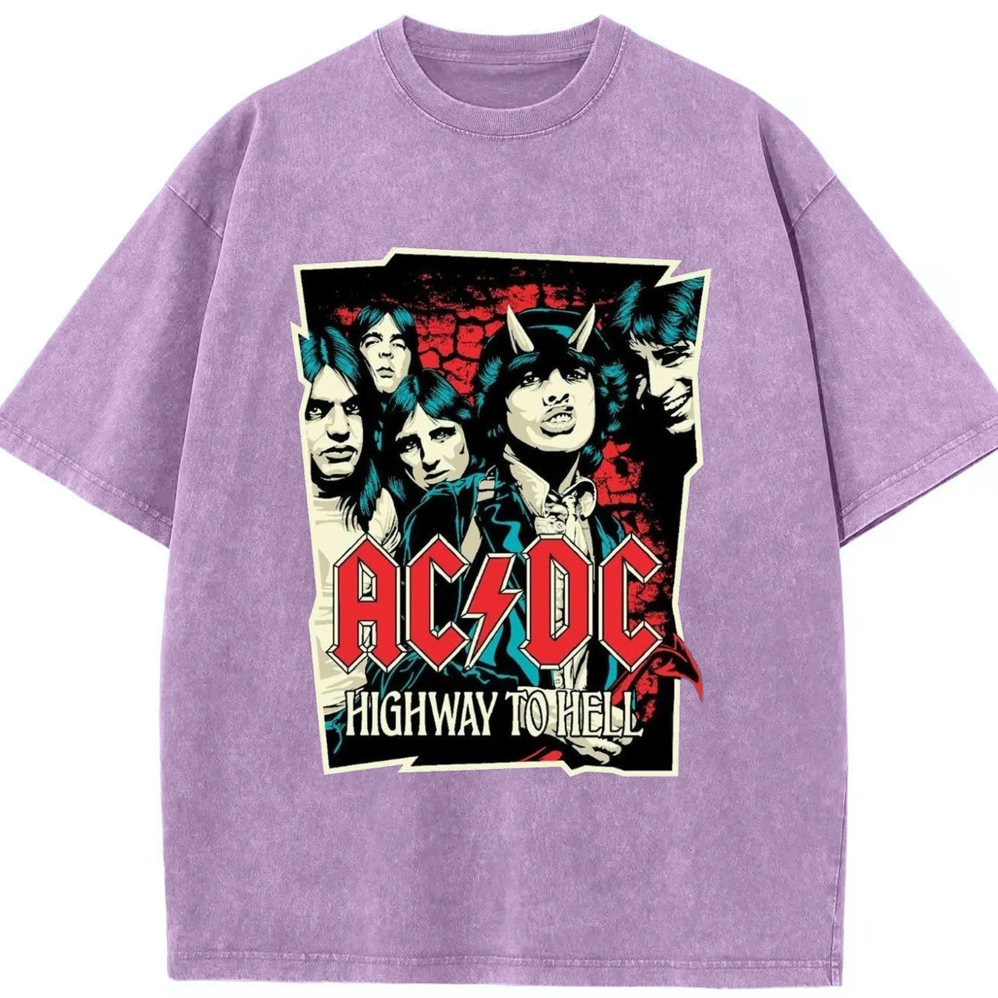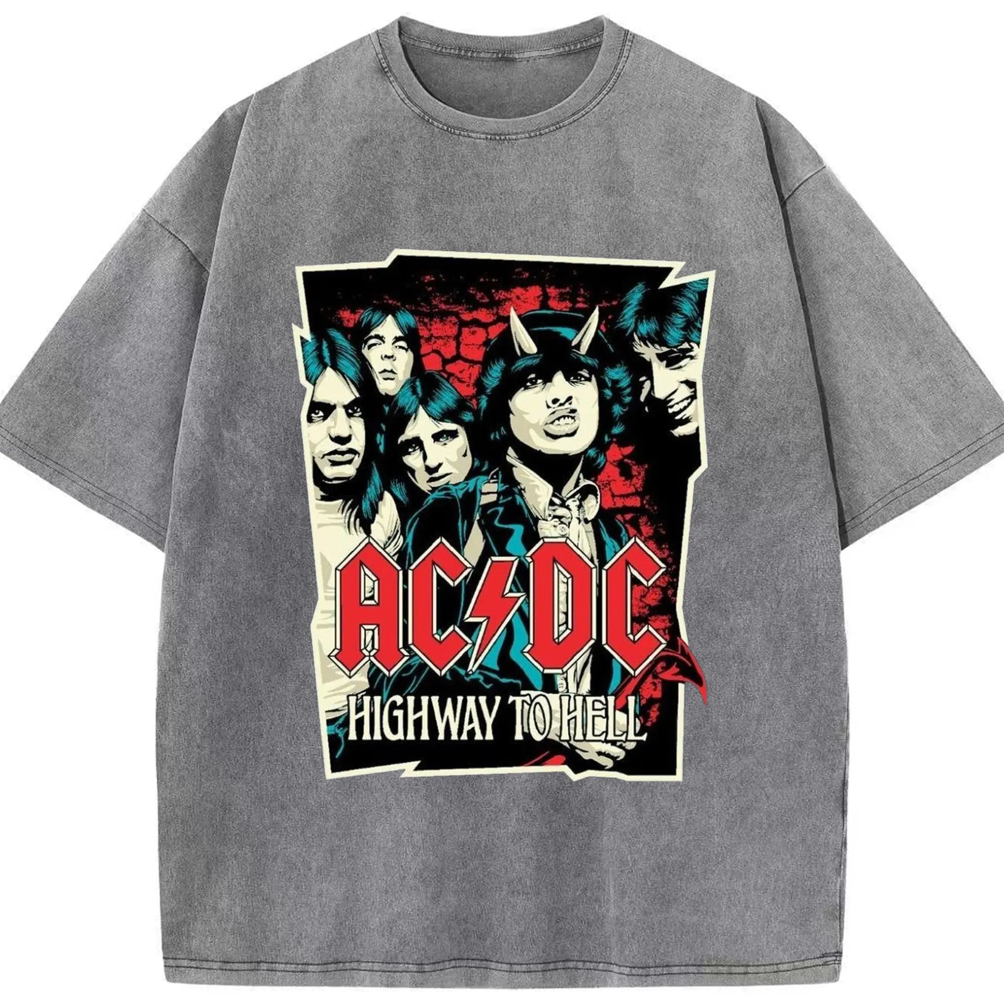 AC/DC Hard Rock “Highway to Hell” Art DIY - Washed Vintage Look 230g Cotton Oversized T-Shirt With Front Heat Transfer Print – Soft, Lightweight, Stylish Fit – Comfortable Casual Wear For Sports & Everyday Use