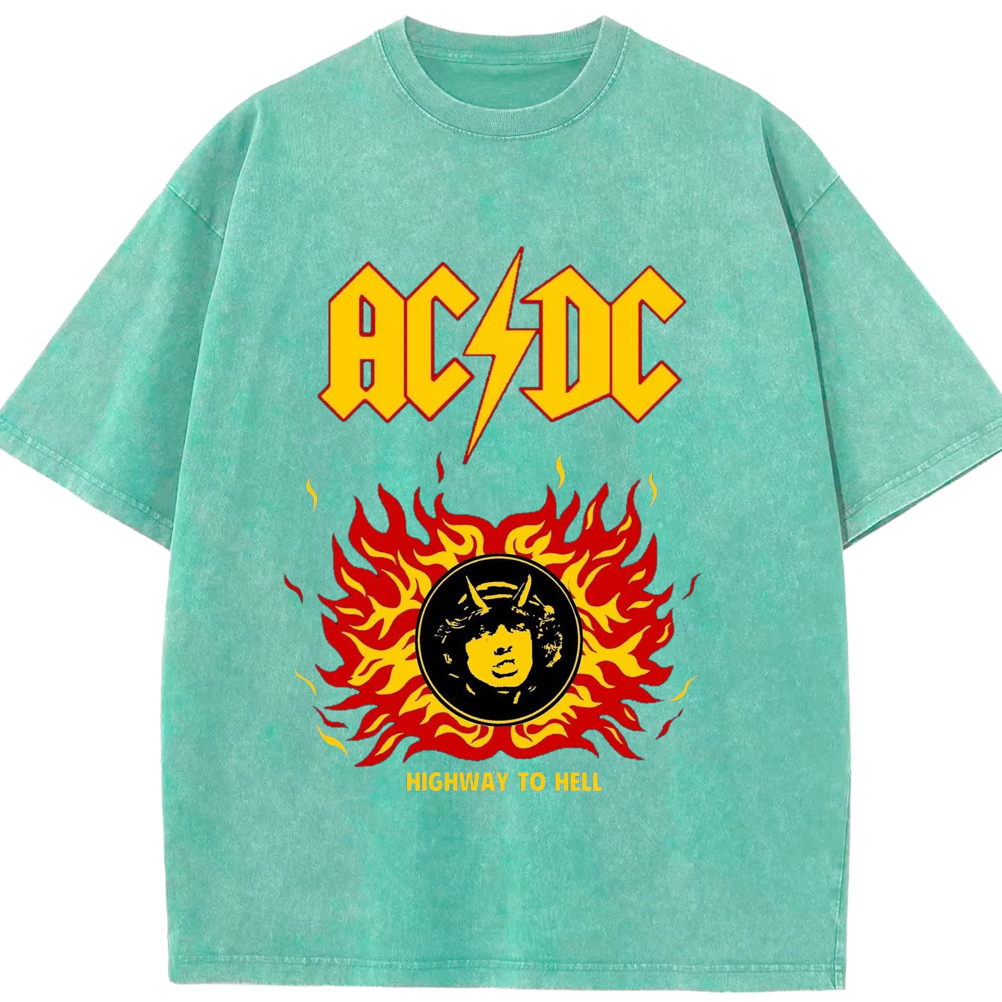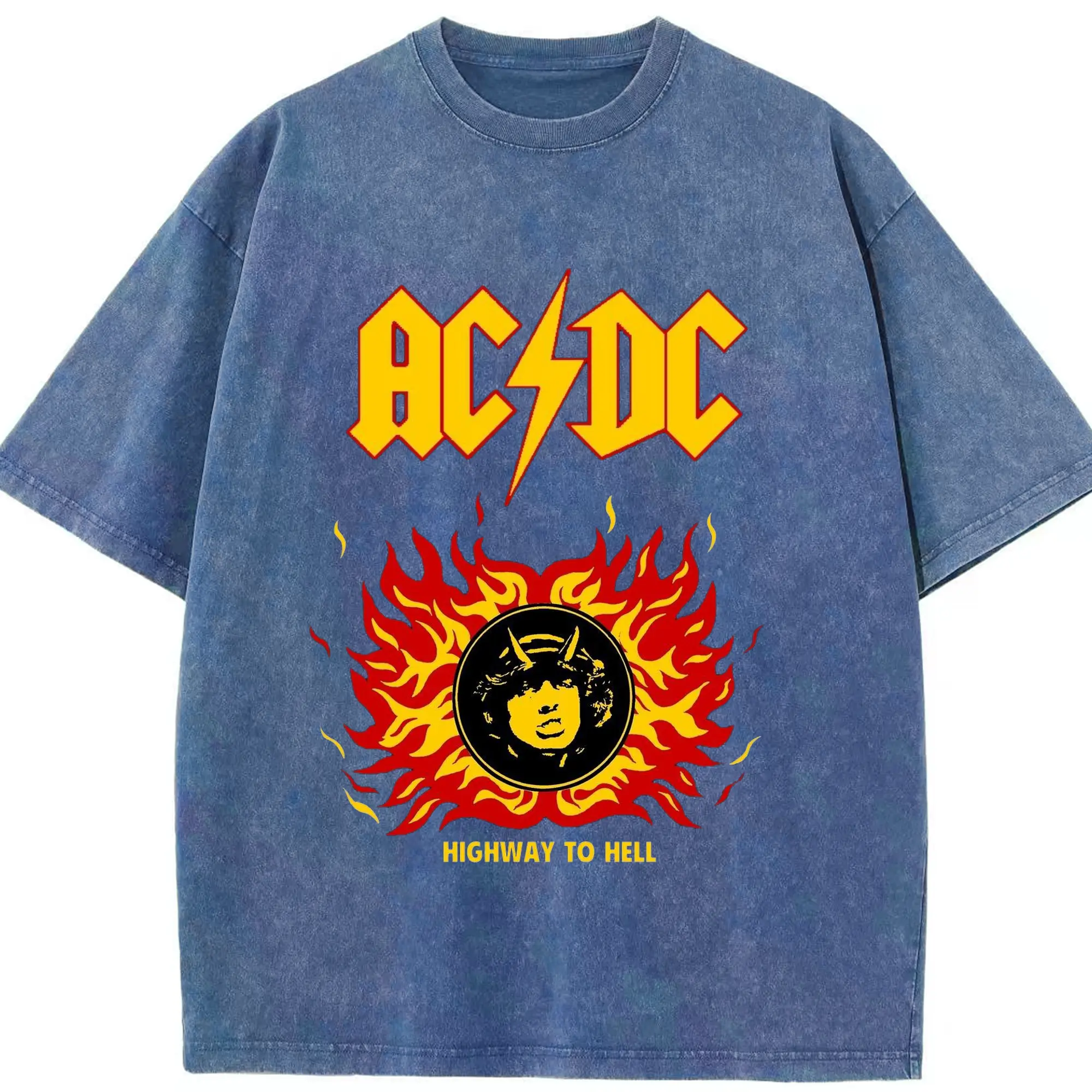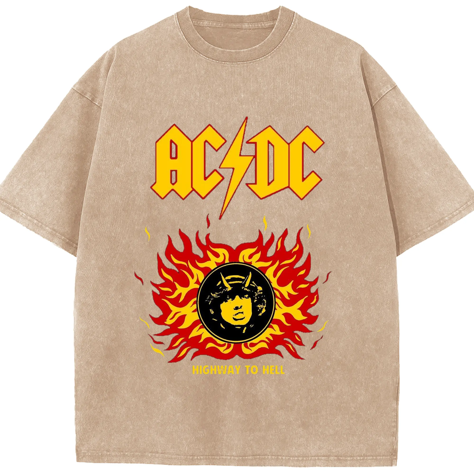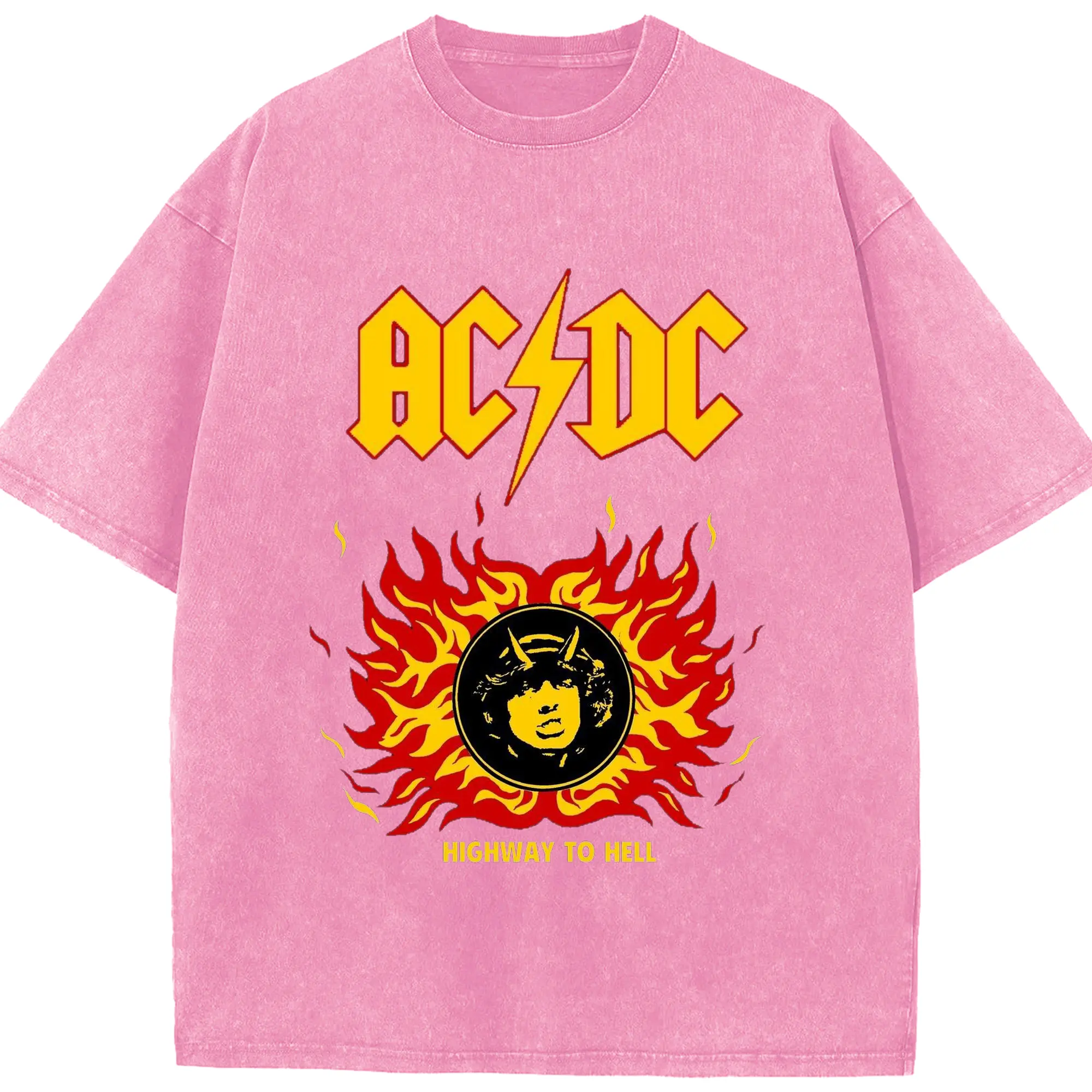 AC/DC Hard Rock “Highway to Hell” DIY - Washed Vintage Look 230g Cotton Oversized T-Shirt With Front Heat Transfer Print – Soft, Lightweight, Stylish Fit – Comfortable Casual Wear For Sports & Everyday Use