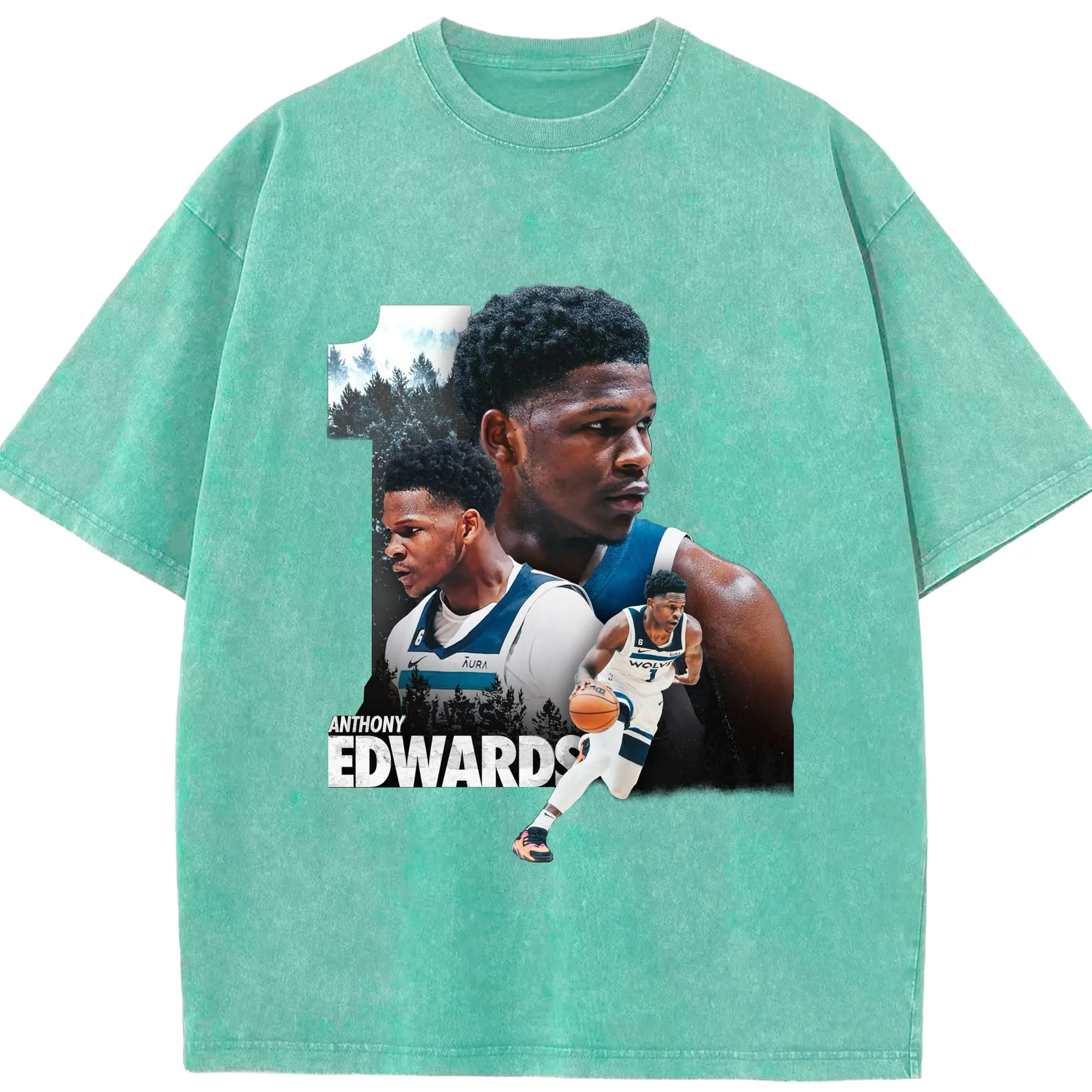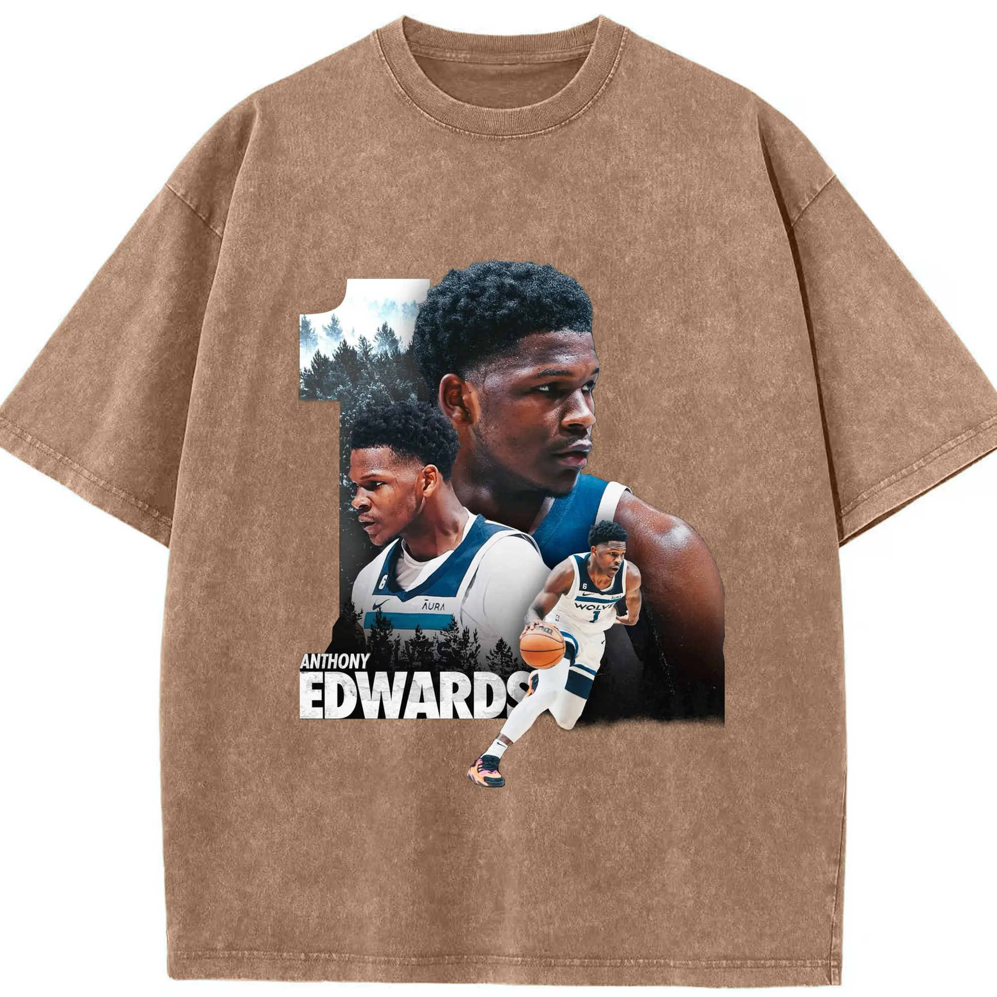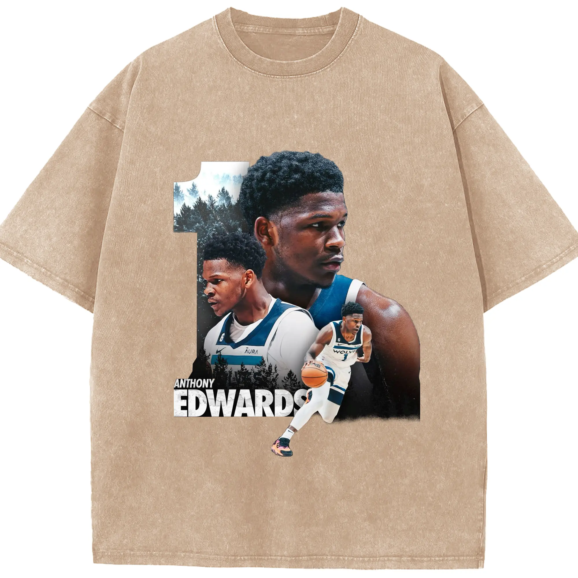 Anthony Edwards Minnesota Timberwolves #1 Art Shirt - Washed Vintage Look 230g Cotton Oversized T-Shirt With Front Heat Transfer Print – Soft, Lightweight, Stylish Fit – Comfortable Casual Wear For Sports & Everyday Use