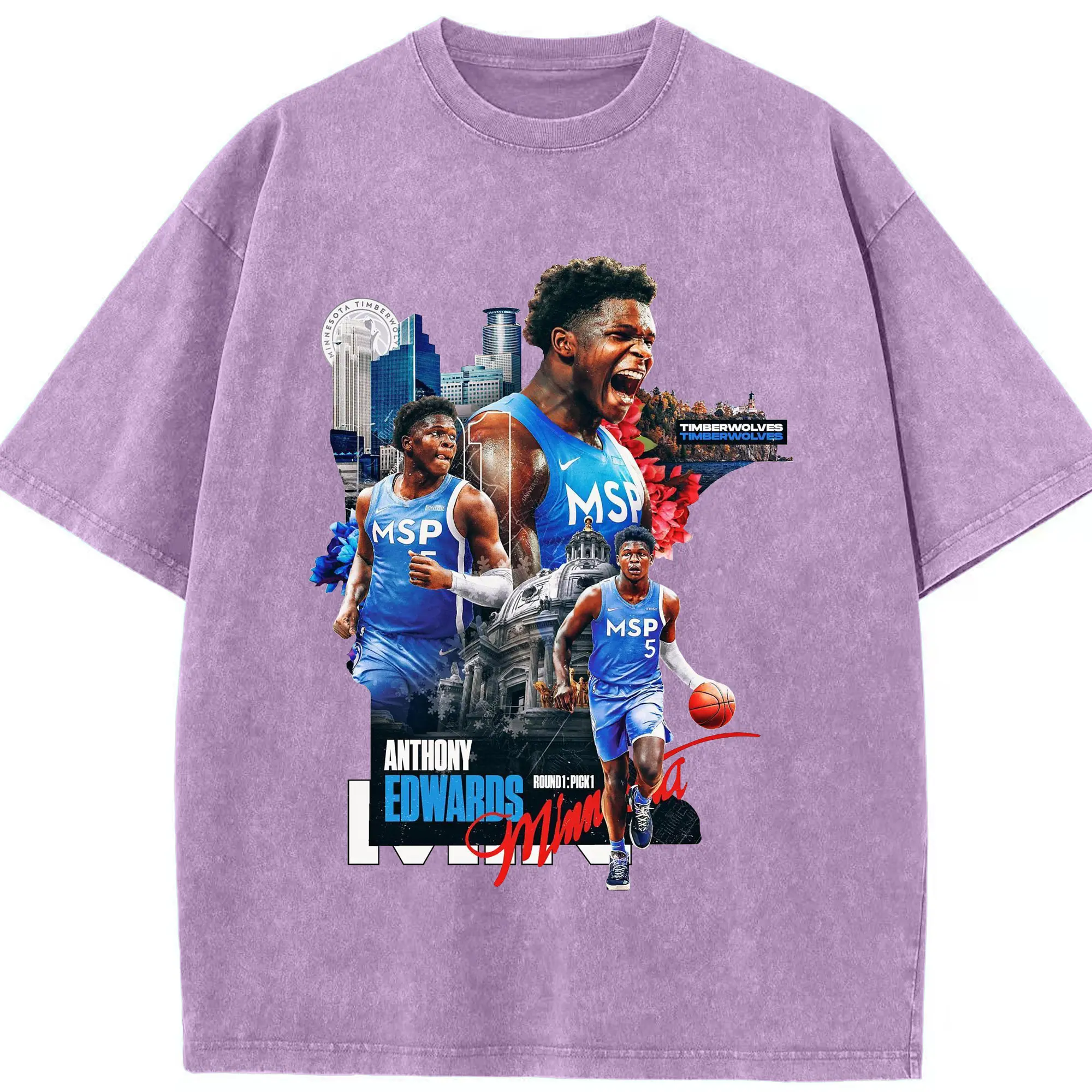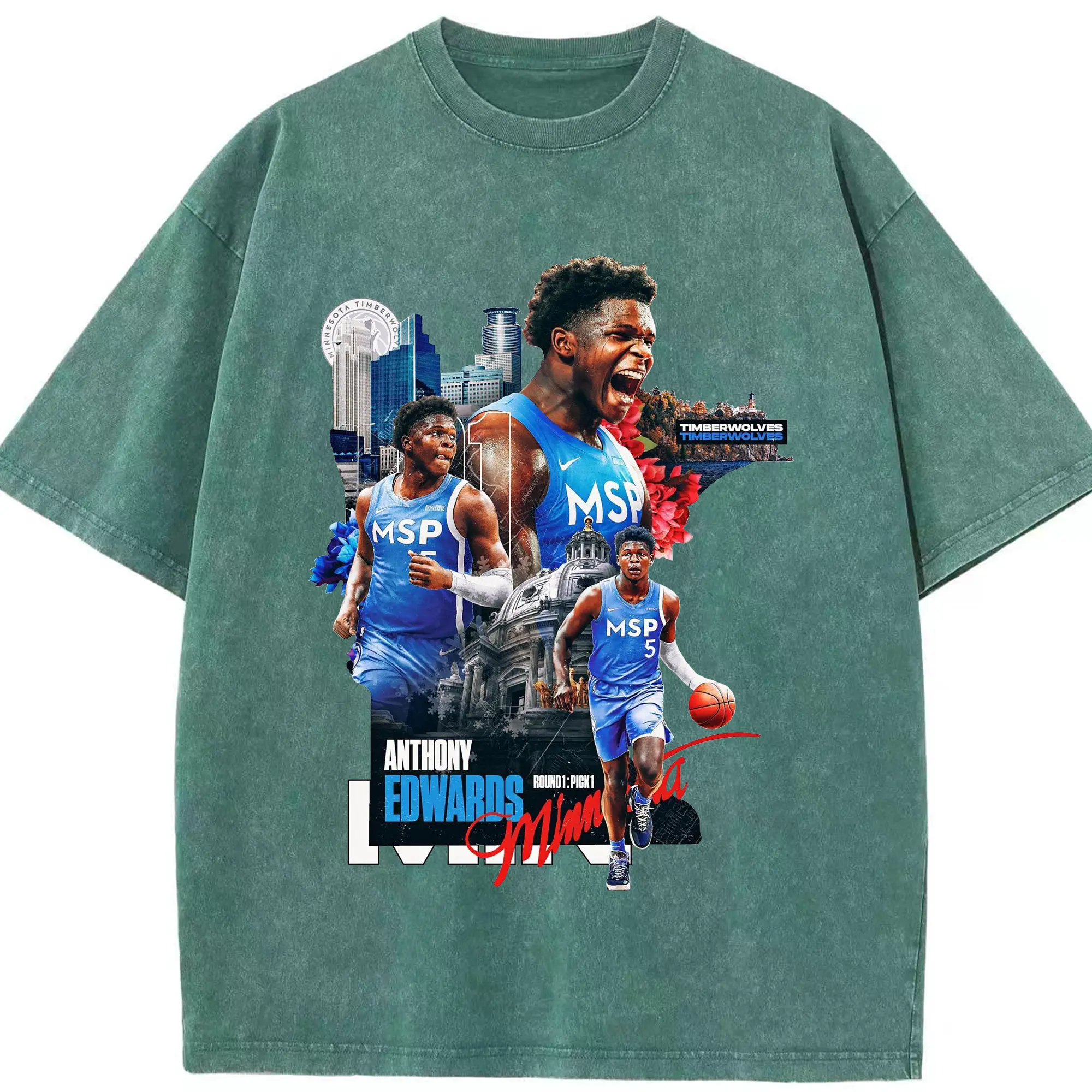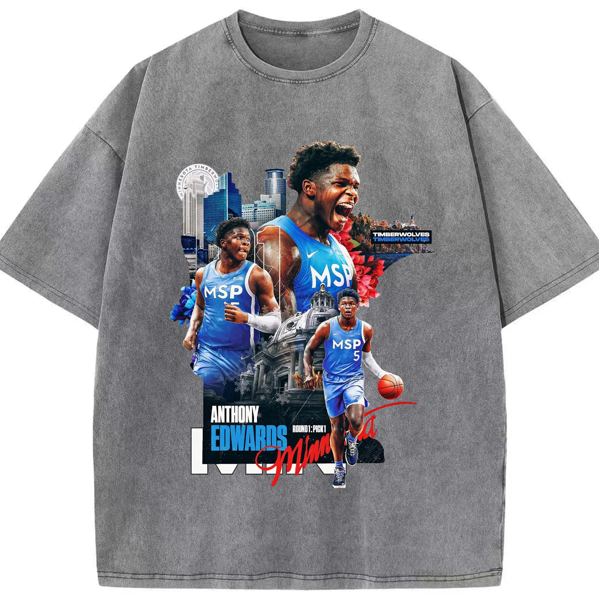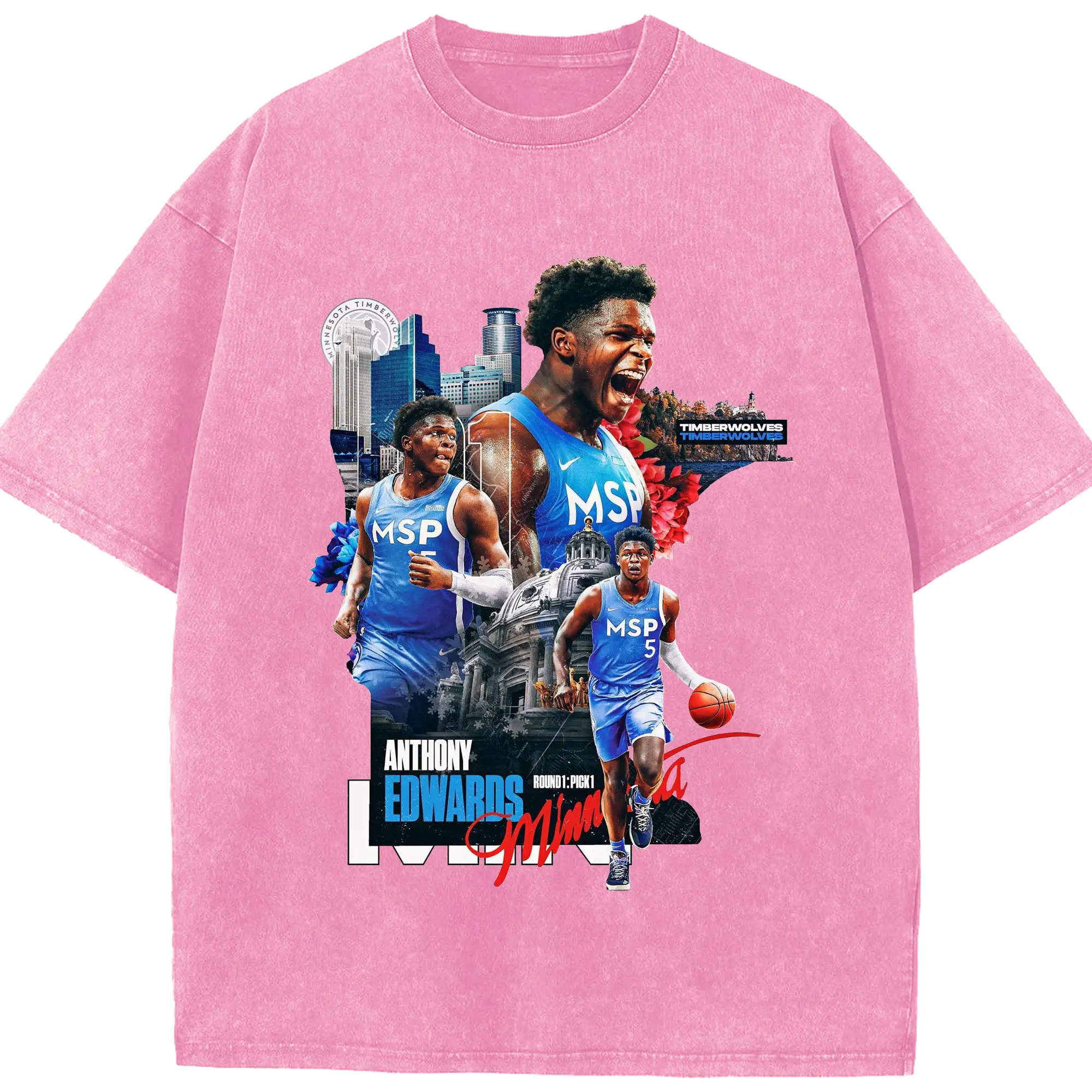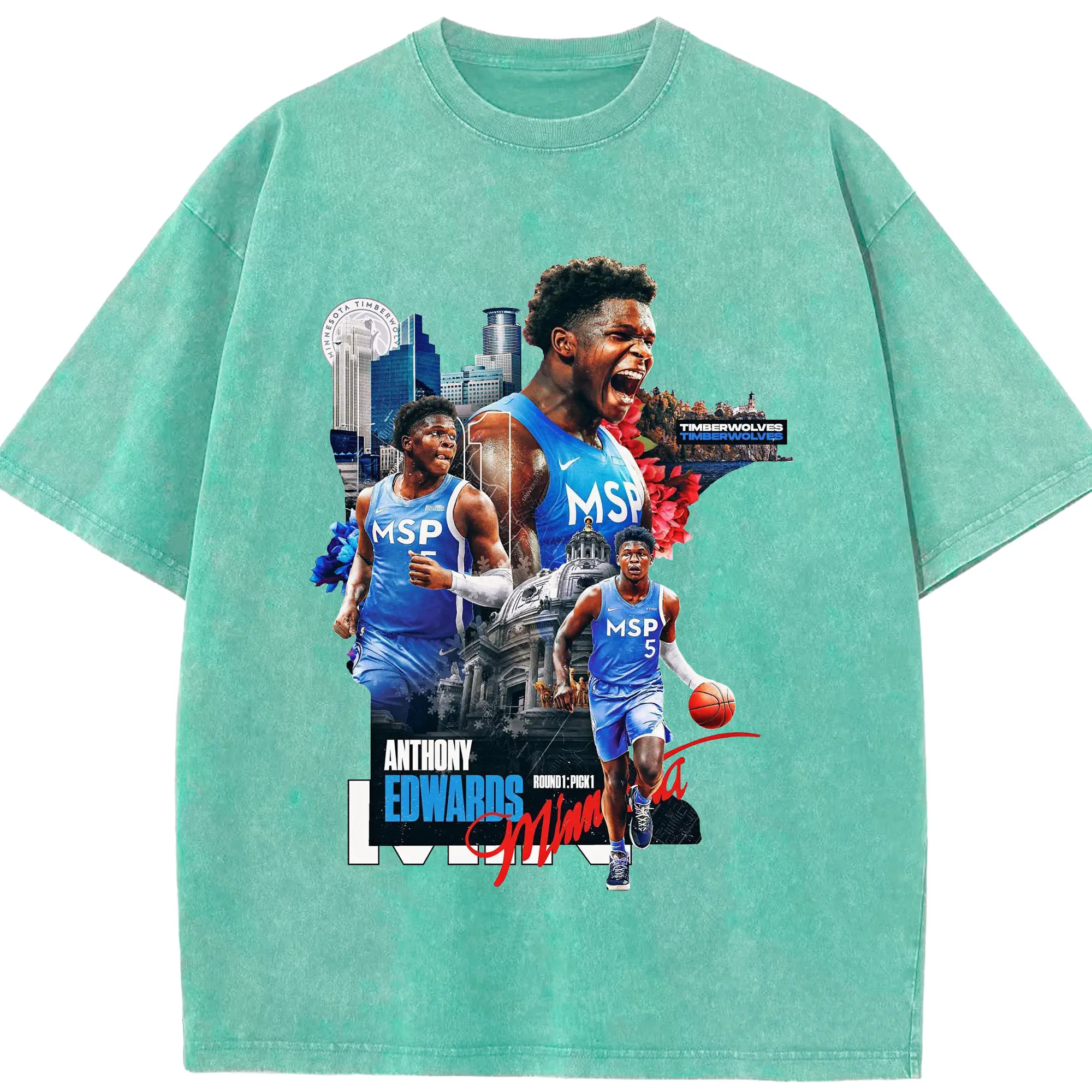 Anthony Edwards Minnesota Timberwolves City Tribute Shirt - Washed Vintage Look 230g Cotton Oversized T-Shirt With Front Heat Transfer Print – Soft, Lightweight, Stylish Fit – Comfortable Casual Wear For Sports & Everyday Use