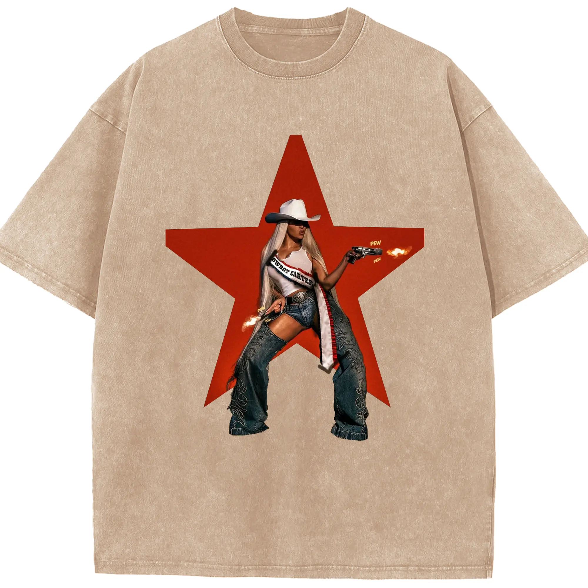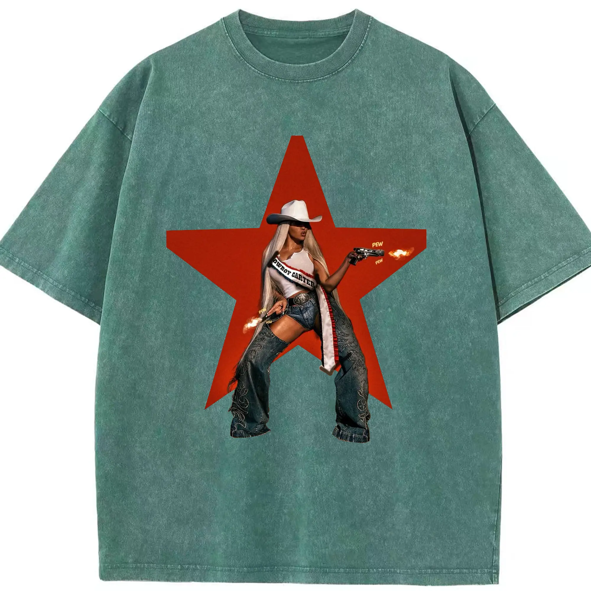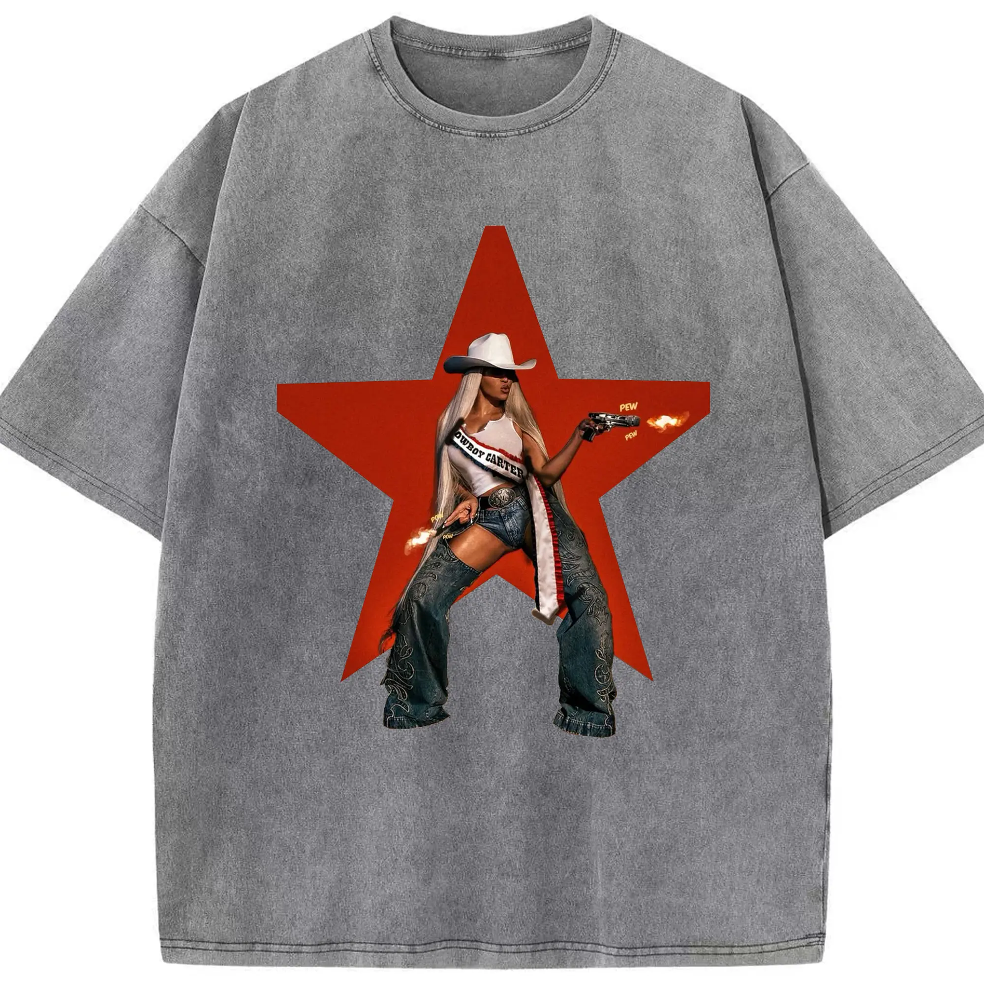 Beyoncé Cowboy Carter Western Country Music DIY - Washed Vintage Look 230g Cotton Oversized T-Shirt With Front Heat Transfer Print – Soft, Lightweight, Stylish Fit – Comfortable Casual Wear For Sports & Everyday Use