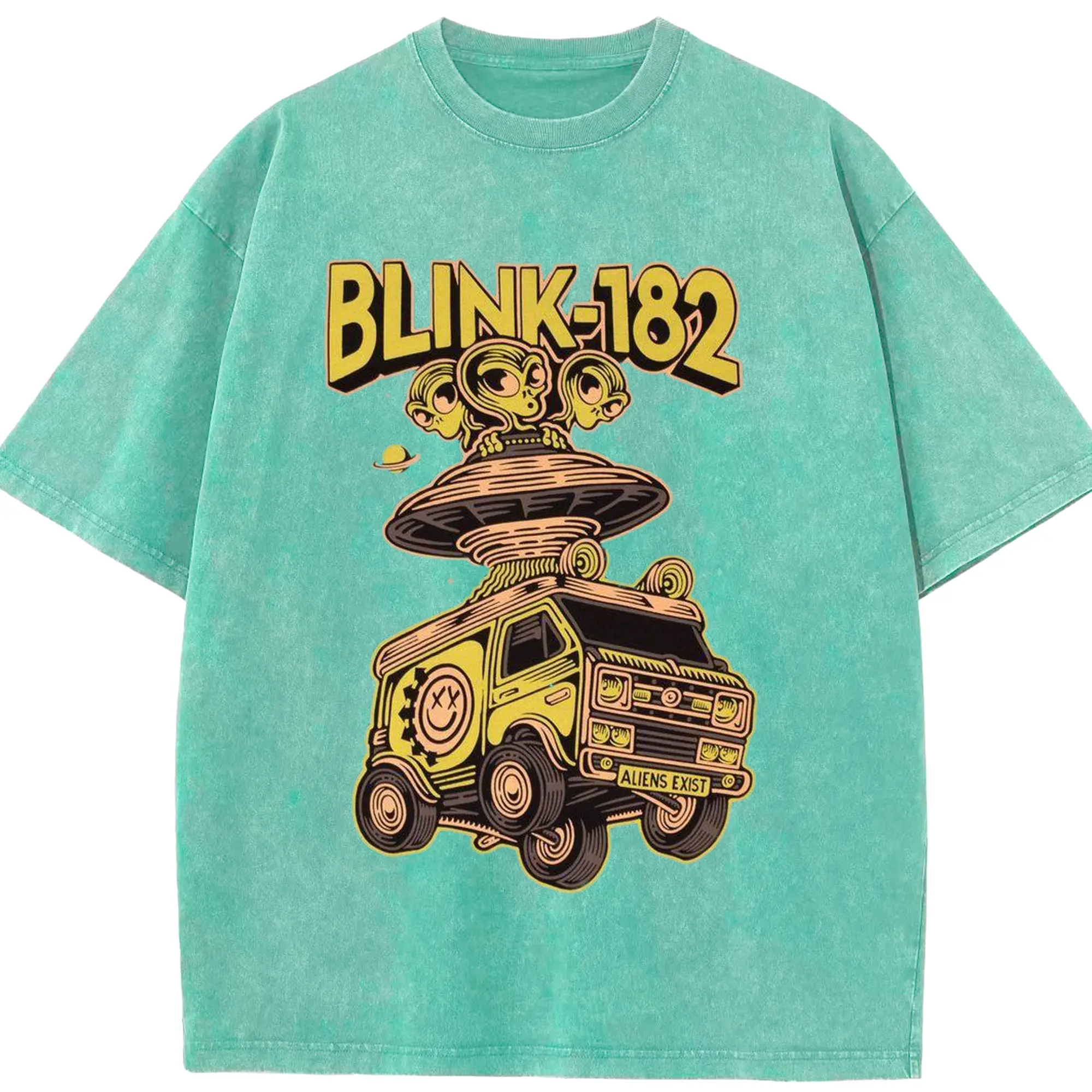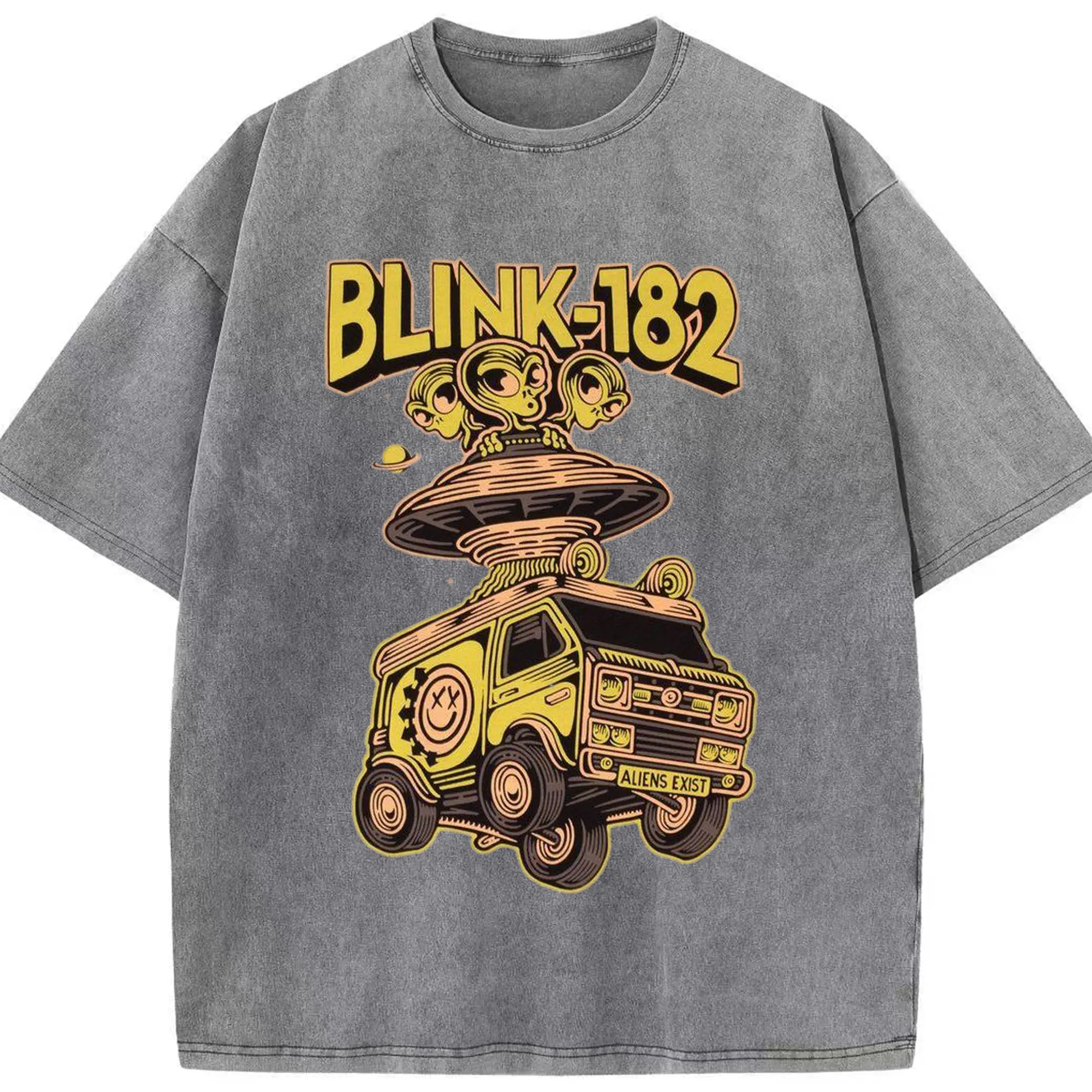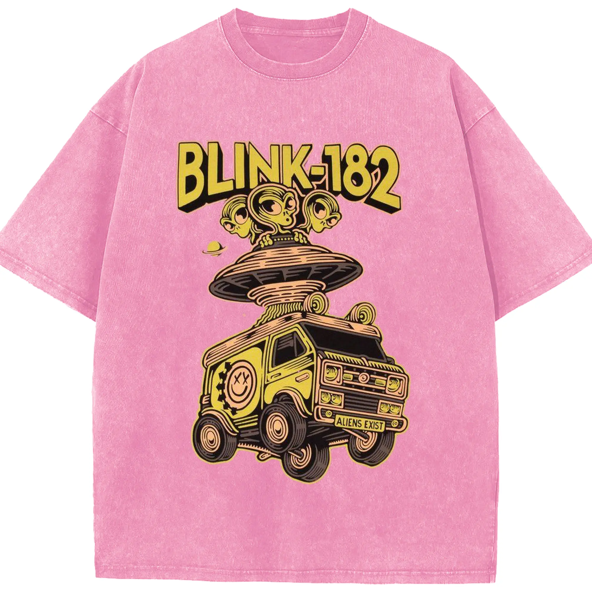 Blink-182 Retro Sci-Fi Alien Punk DIY - Washed Vintage Look 230g Cotton Oversized T-Shirt With Front Heat Transfer Print – Soft, Lightweight, Stylish Fit – Comfortable Casual Wear For Sports & Everyday Use
