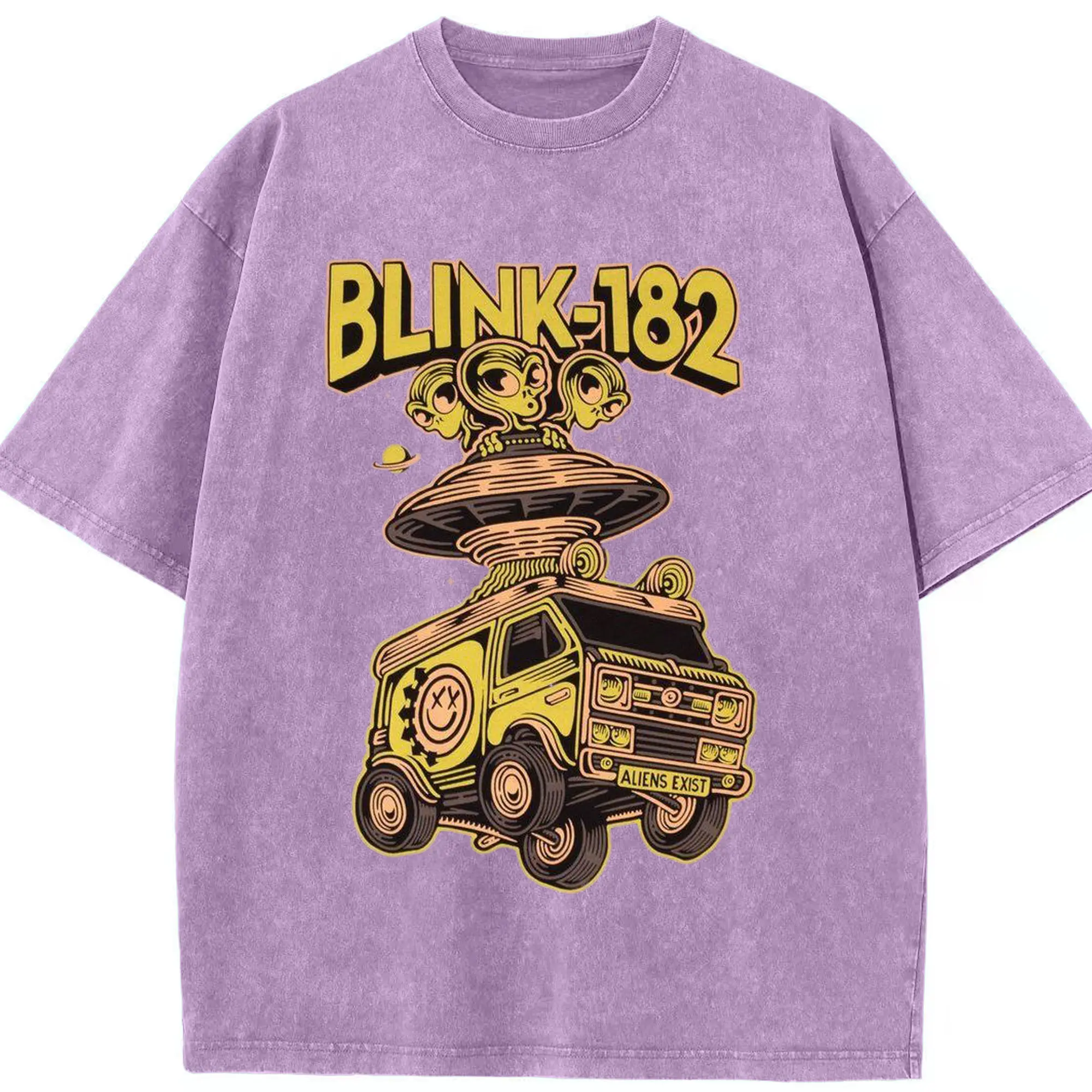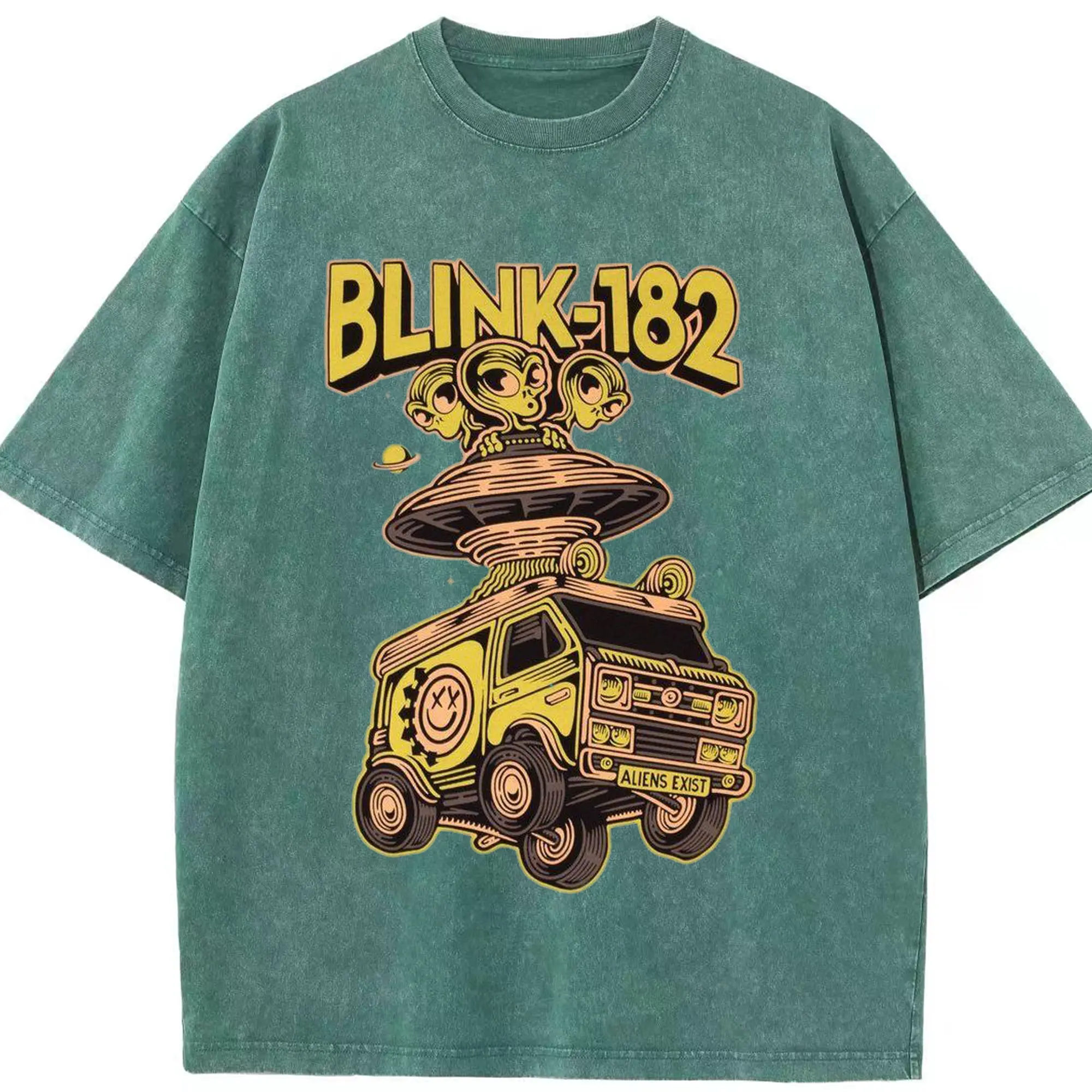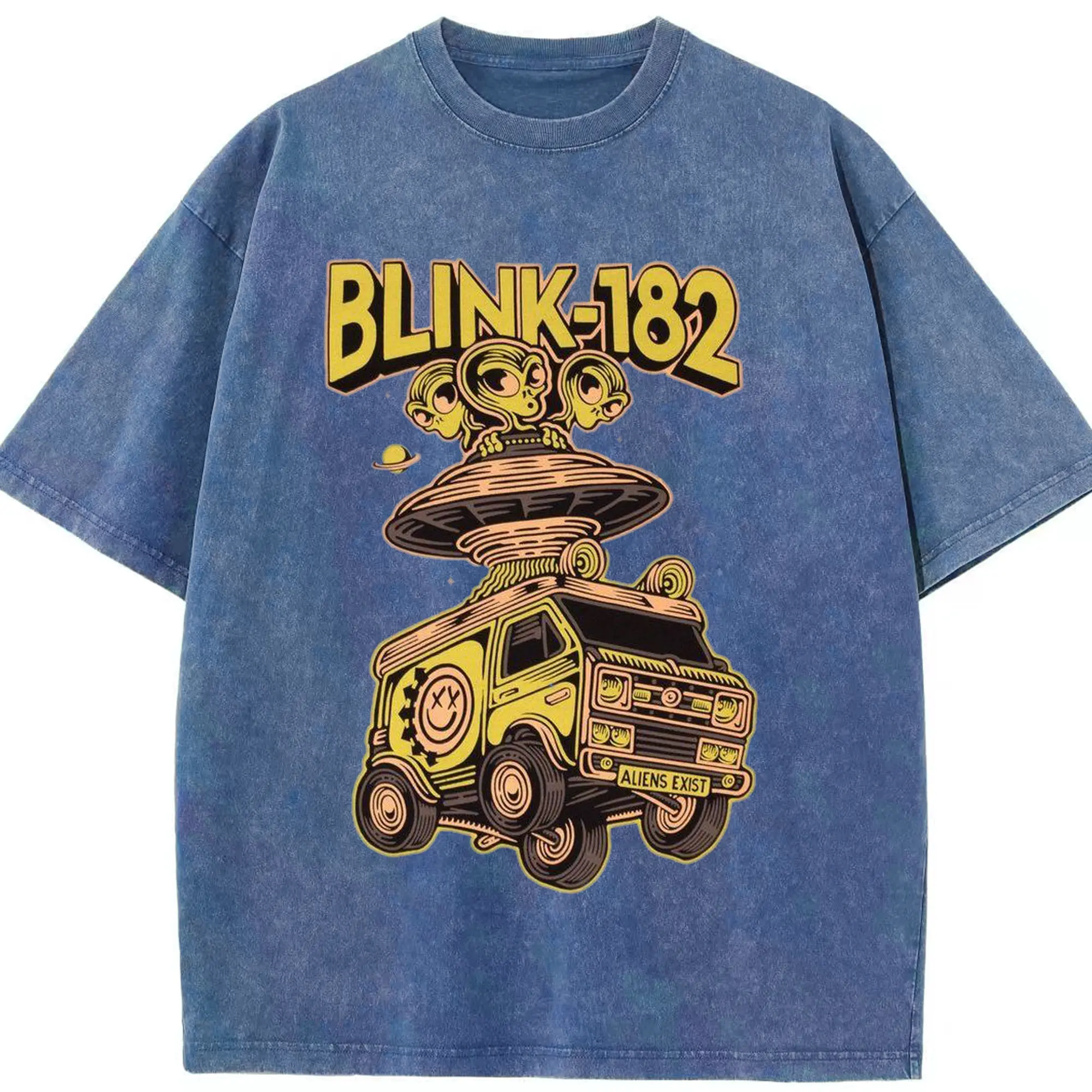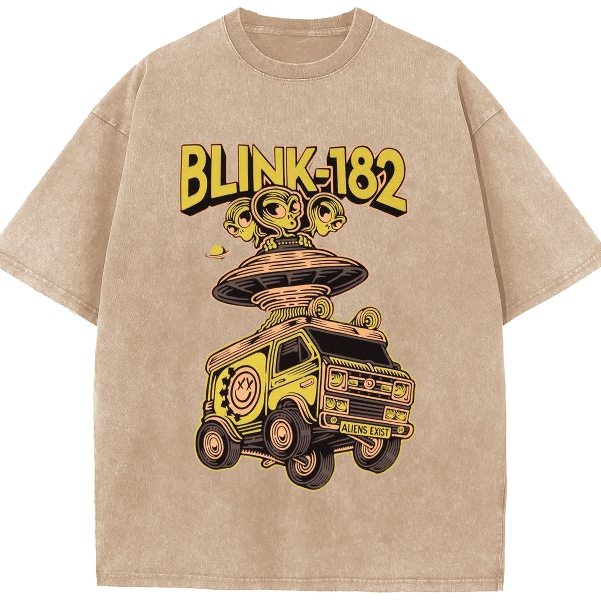 Blink-182 Retro Sci-Fi Alien Punk DIY - Washed Vintage Look 230g Cotton Oversized T-Shirt With Front Heat Transfer Print – Soft, Lightweight, Stylish Fit – Comfortable Casual Wear For Sports & Everyday Use