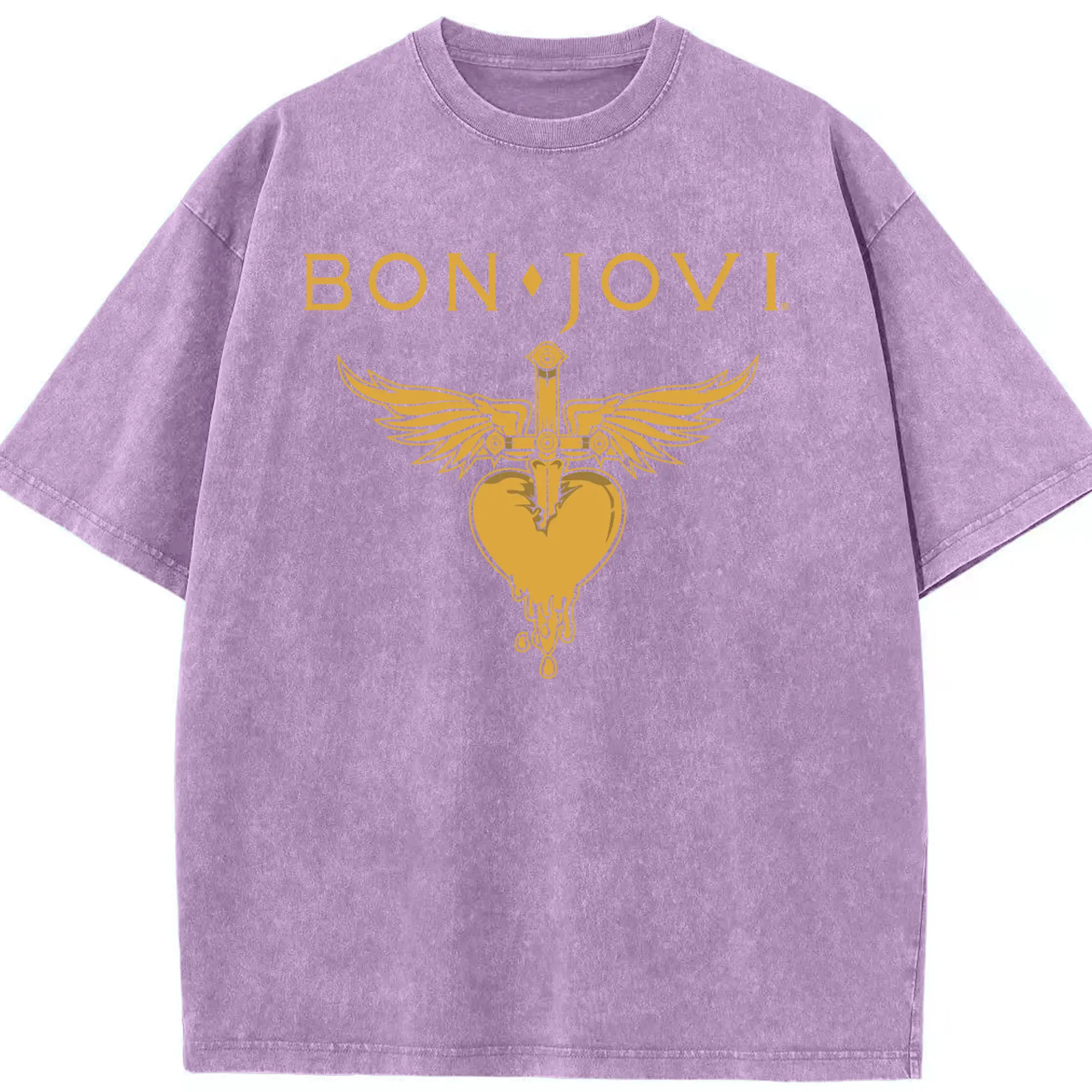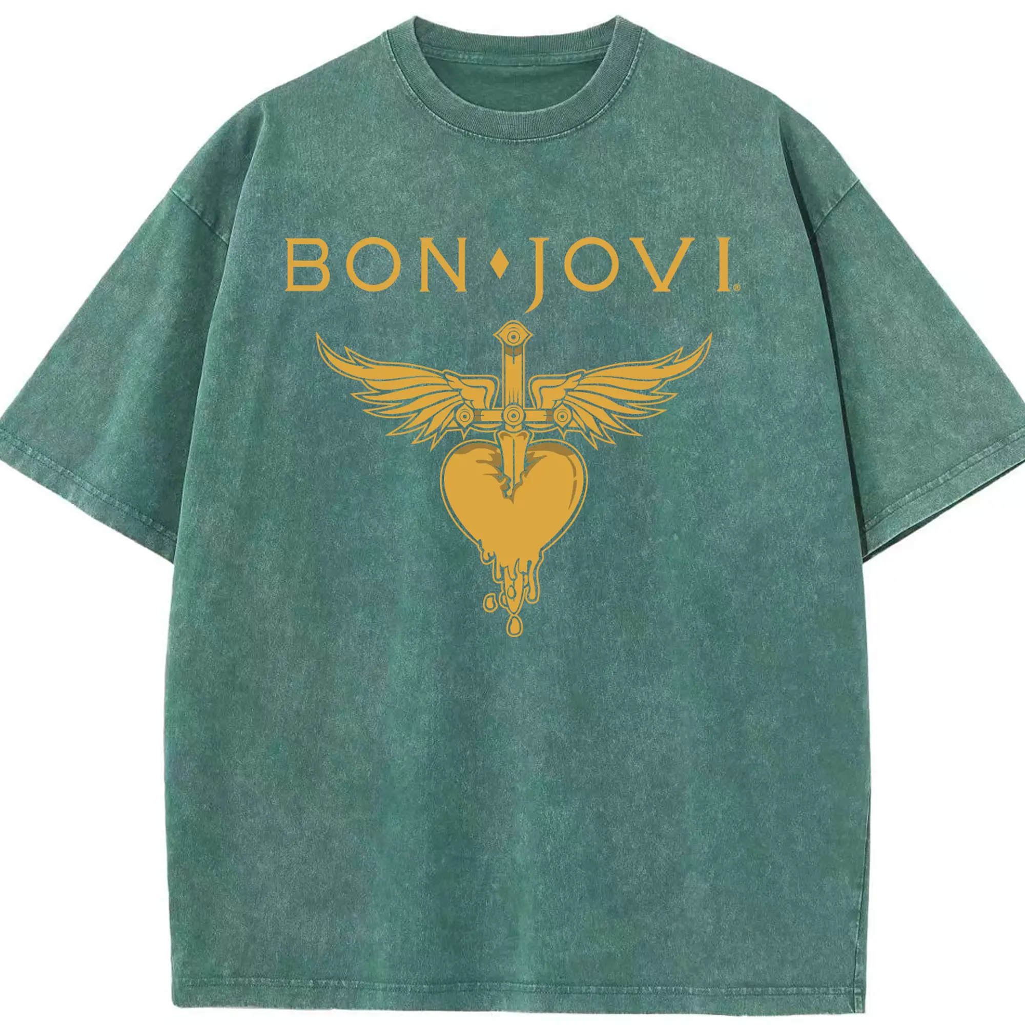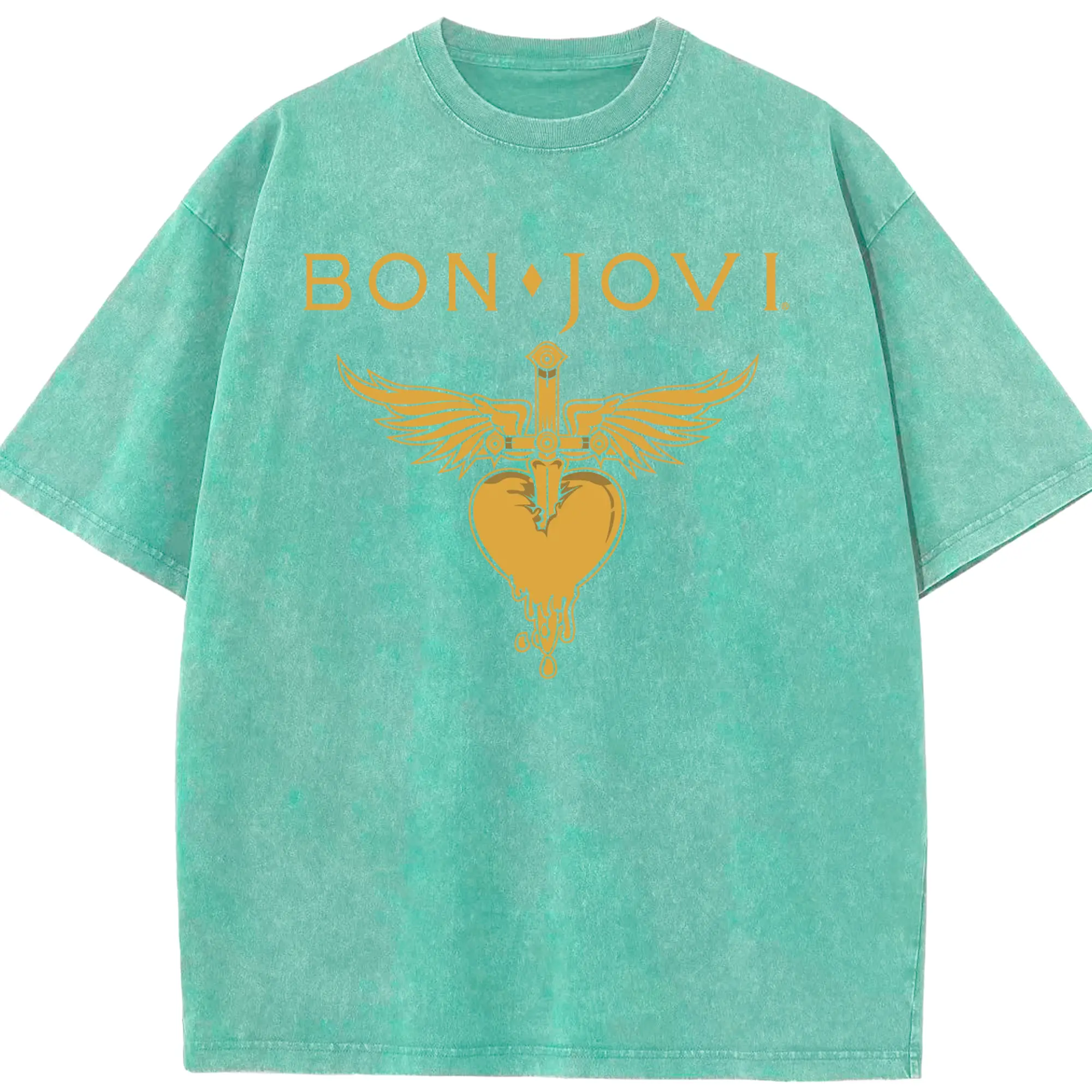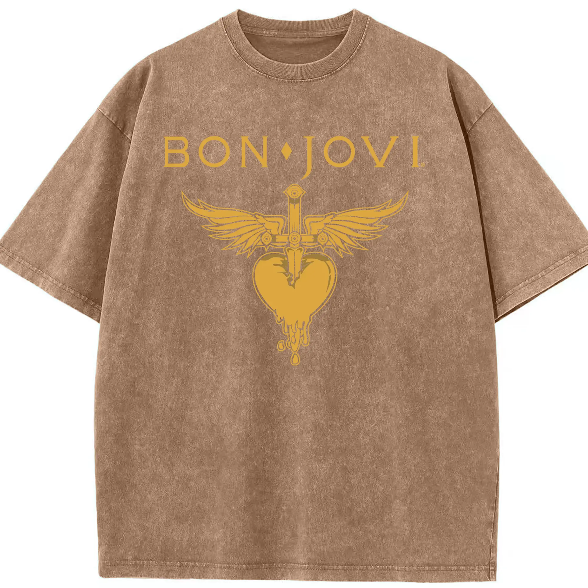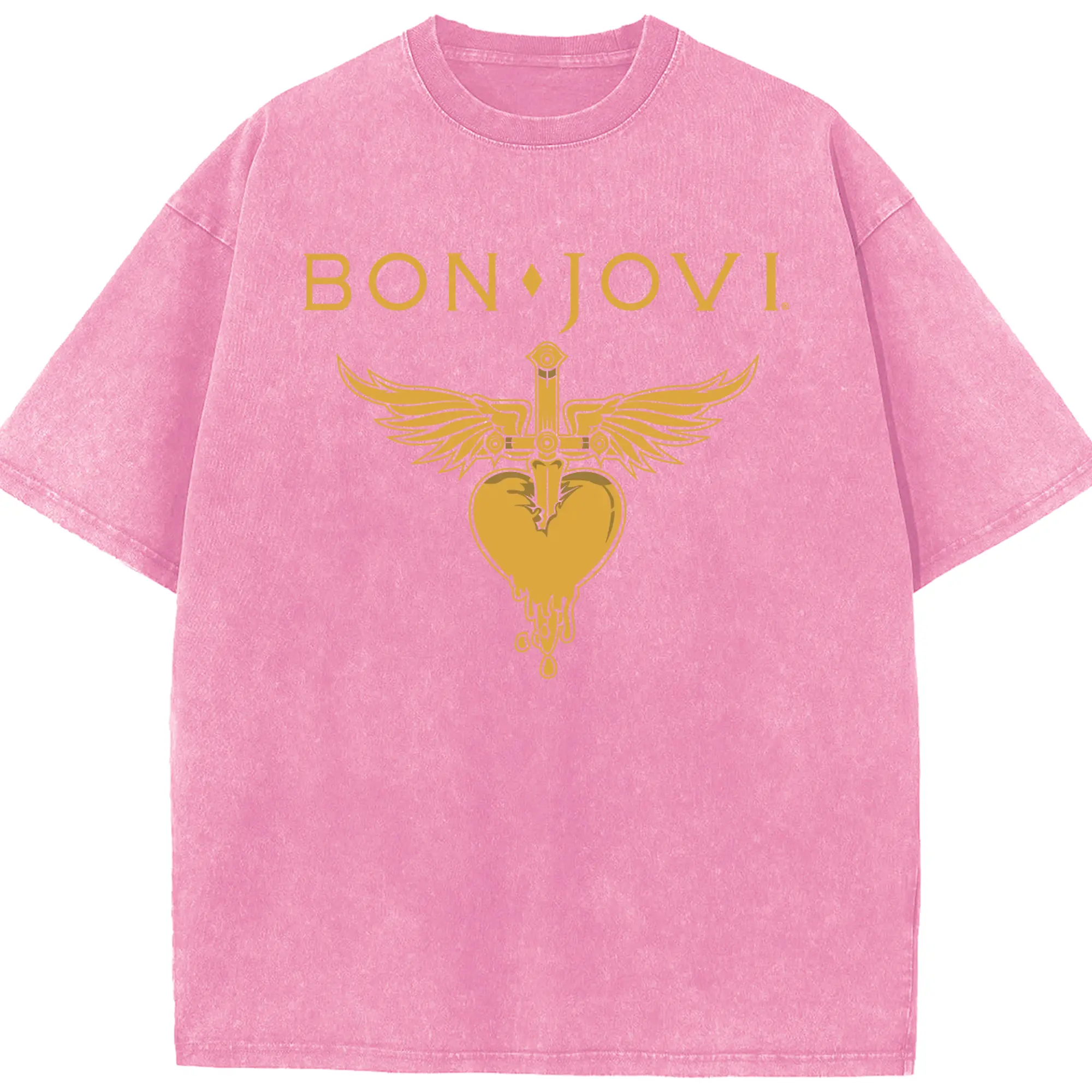 Bon Jovi Gold Rock Logo - Washed Vintage Look 230g Cotton Oversized T-Shirt With Front Heat Transfer Print – Soft, Lightweight, Stylish Fit – Comfortable Casual Wear For Sports & Everyday Use