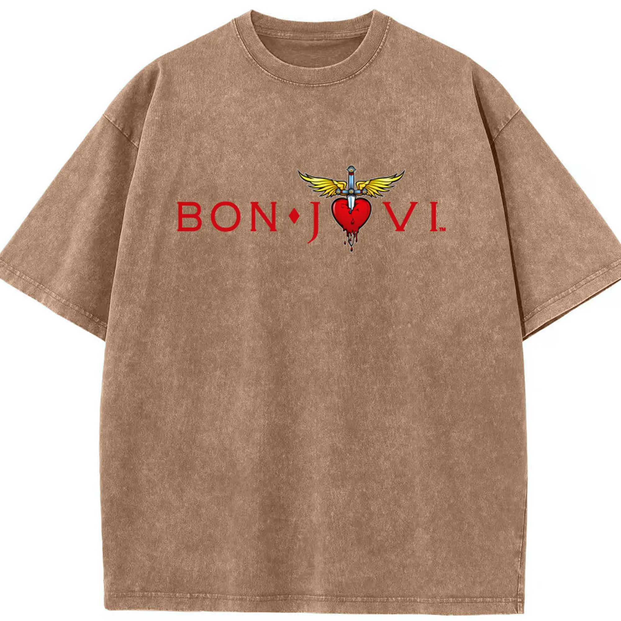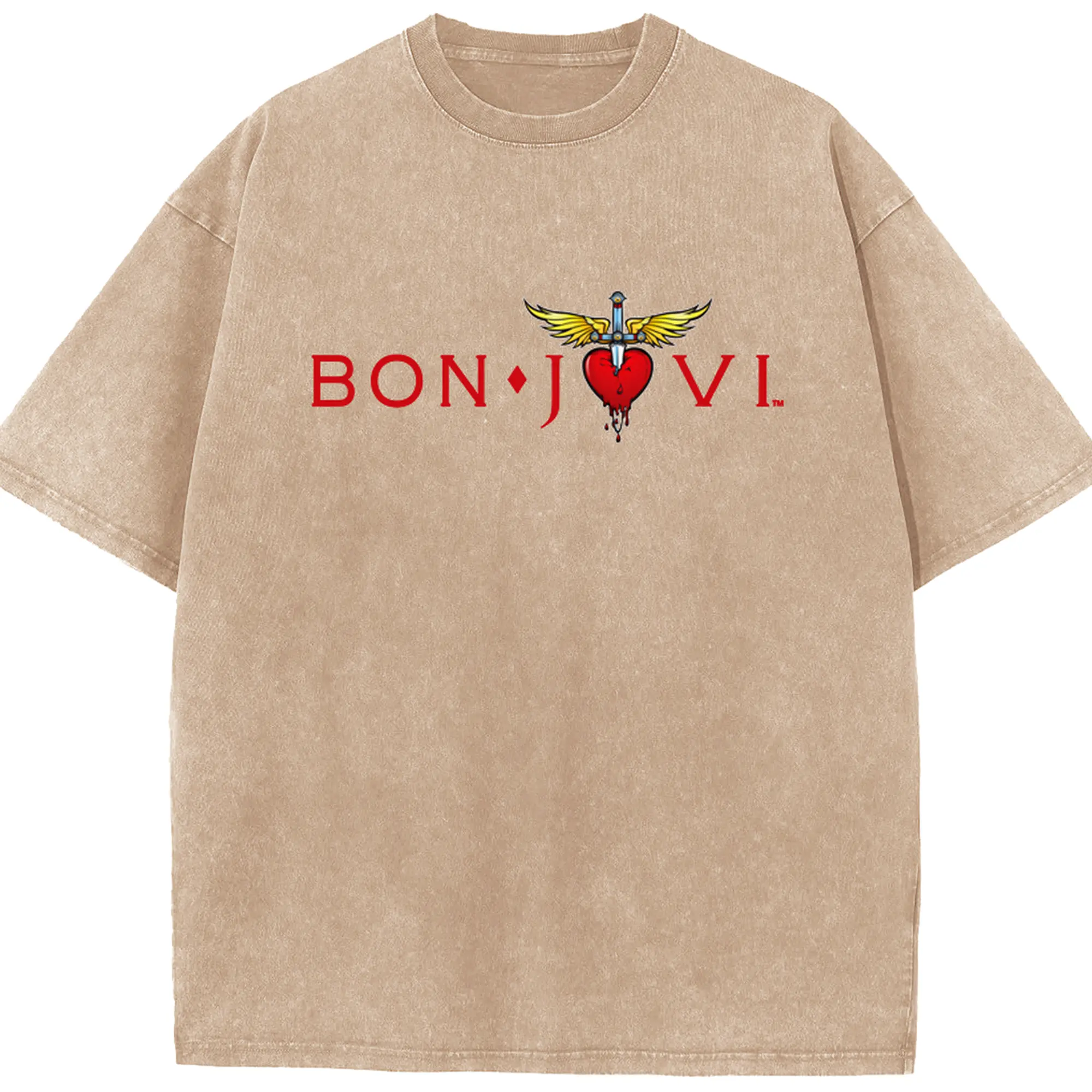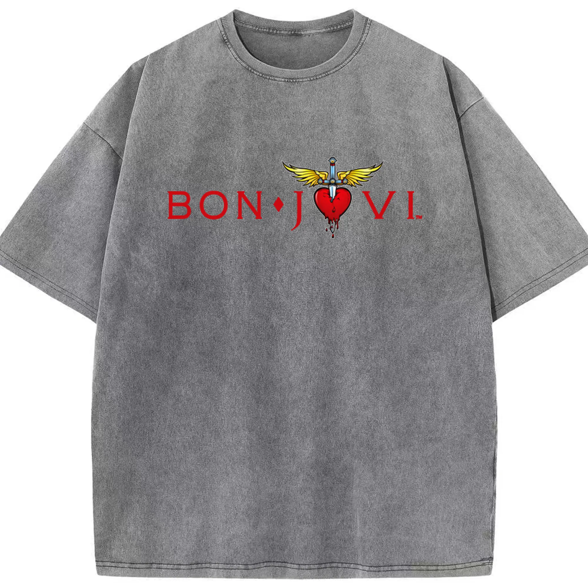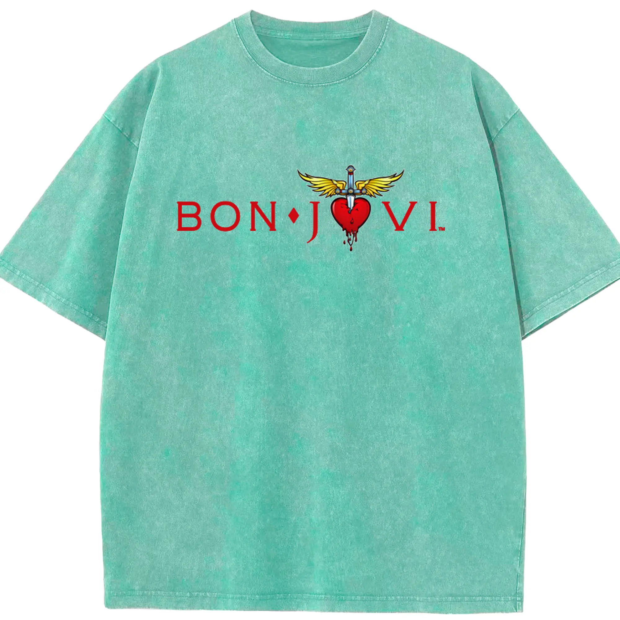 Bon Jovi New Rock Logo - Washed Vintage Look 230g Cotton Oversized T-Shirt With Front Heat Transfer Print – Soft, Lightweight, Stylish Fit – Comfortable Casual Wear For Sports & Everyday Use