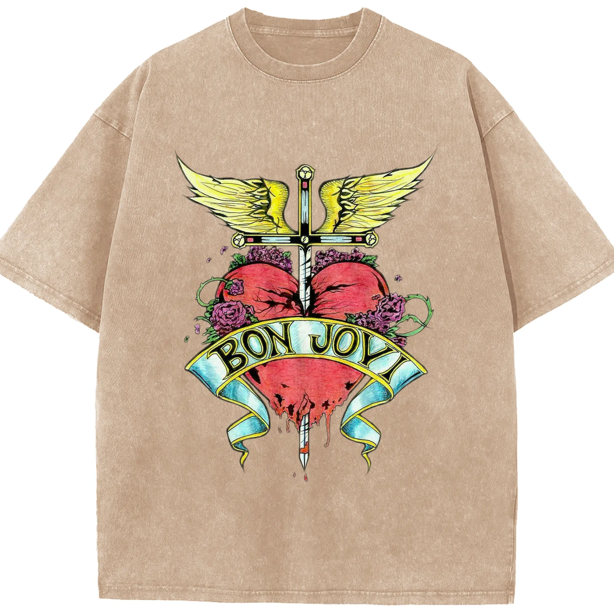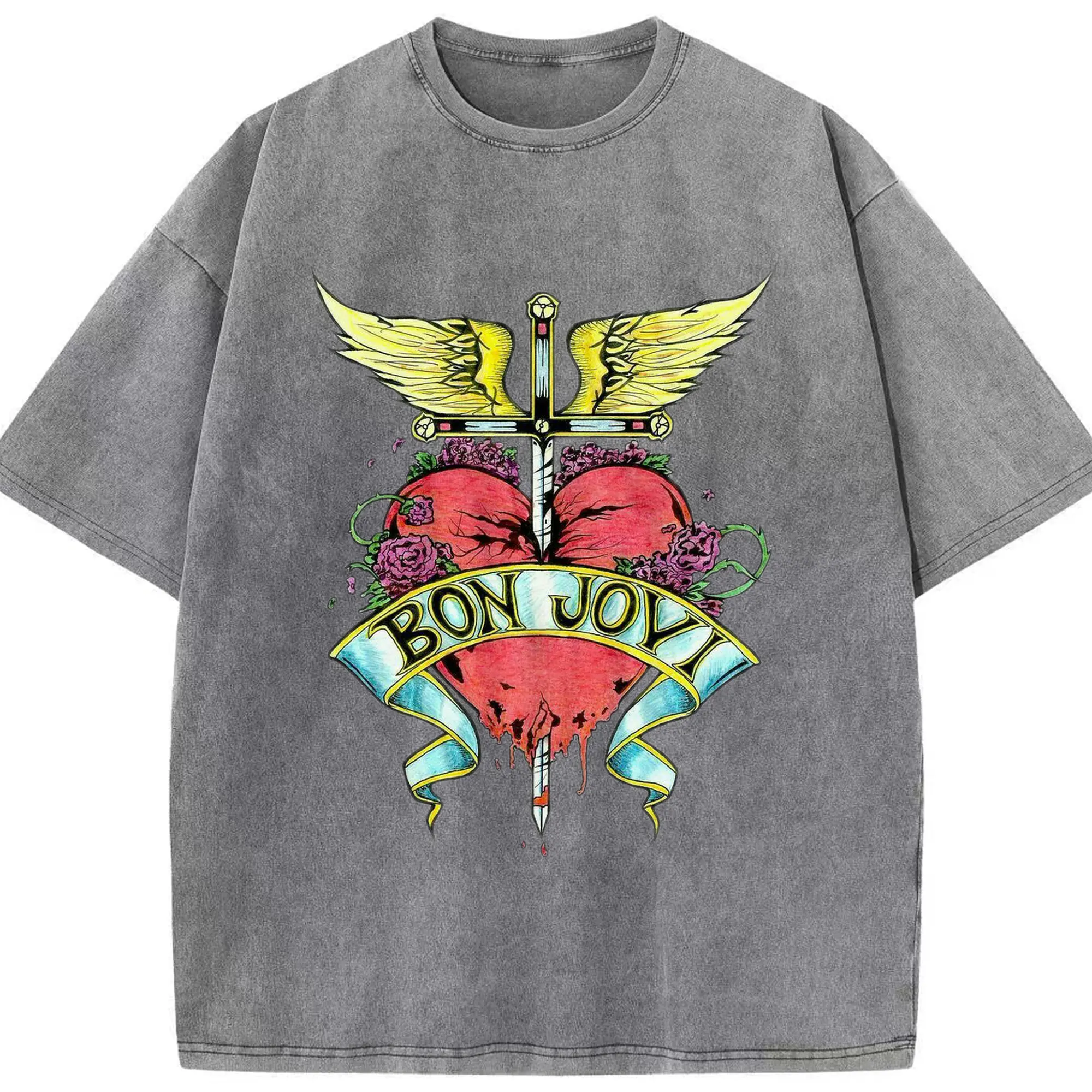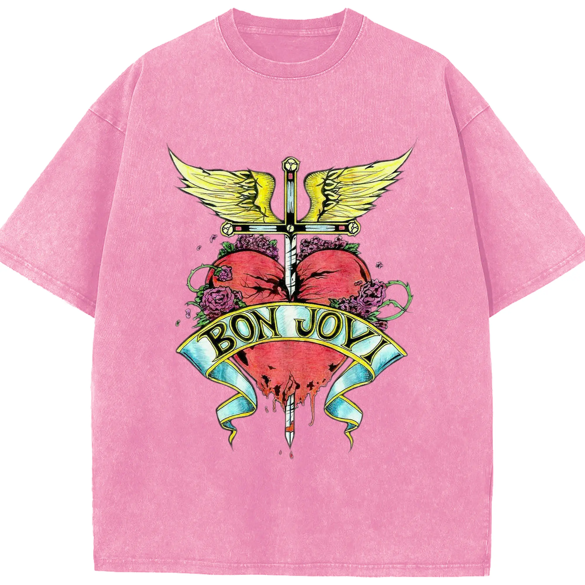 Bon Jovi Rock Heart Cross DIY Sihirt - Washed Vintage Look 230g Cotton Oversized T-Shirt With Front Heat Transfer Print – Soft, Lightweight, Stylish Fit – Comfortable Casual Wear For Sports & Everyday Use