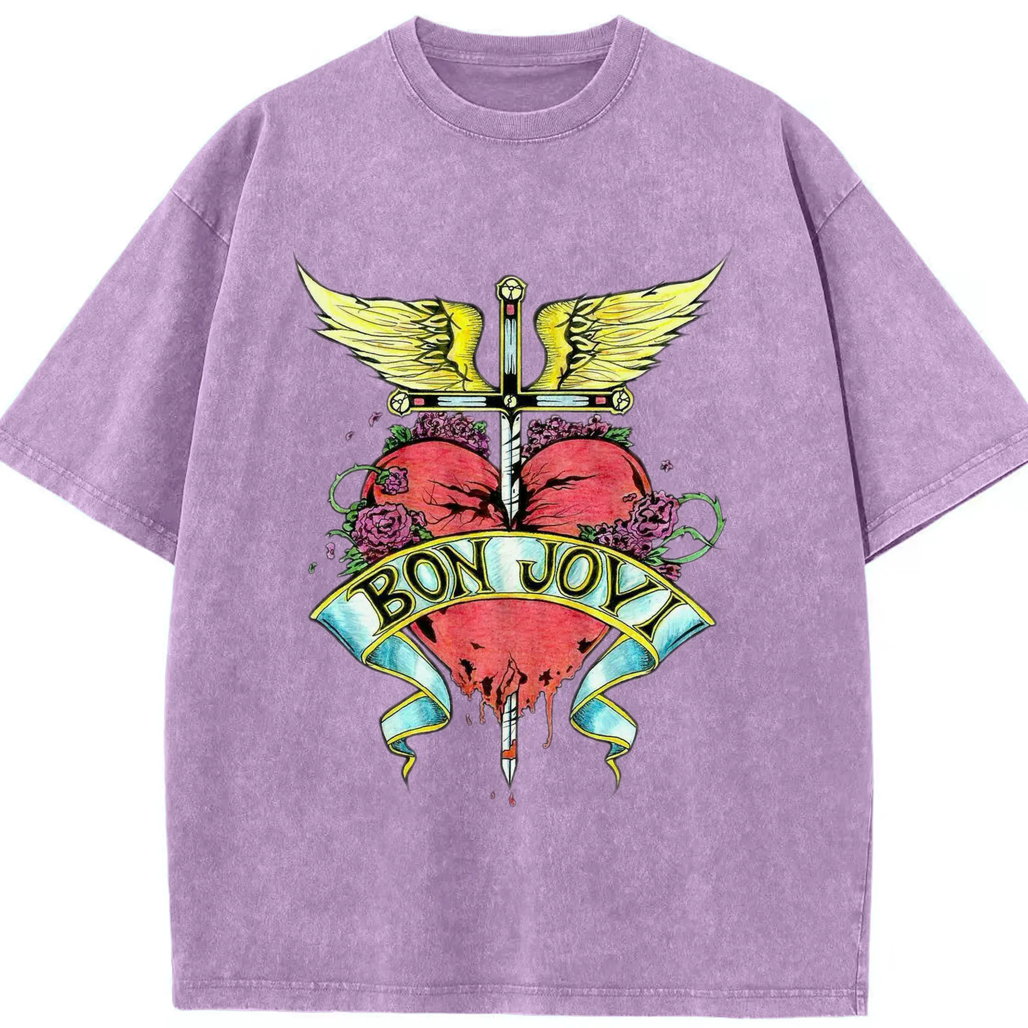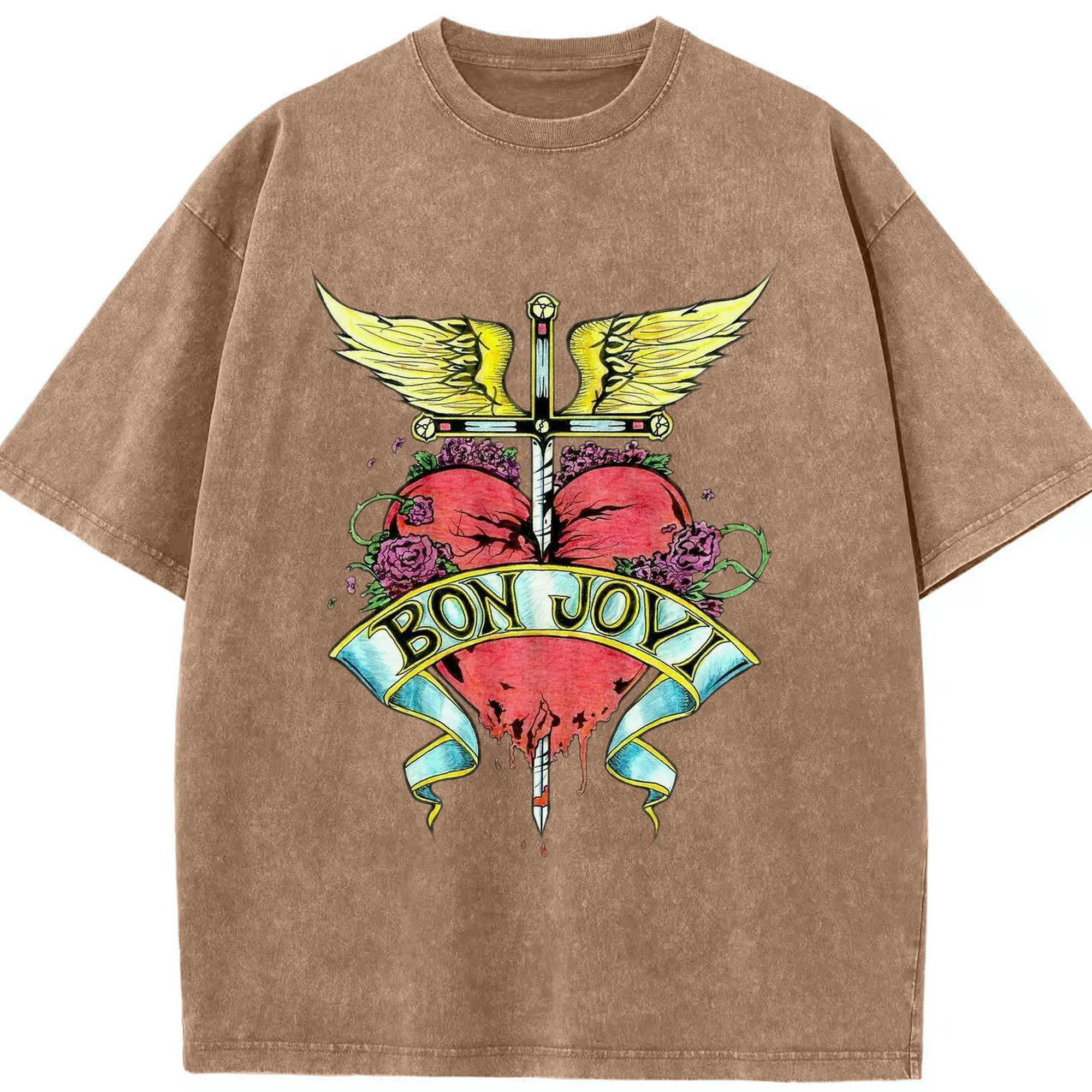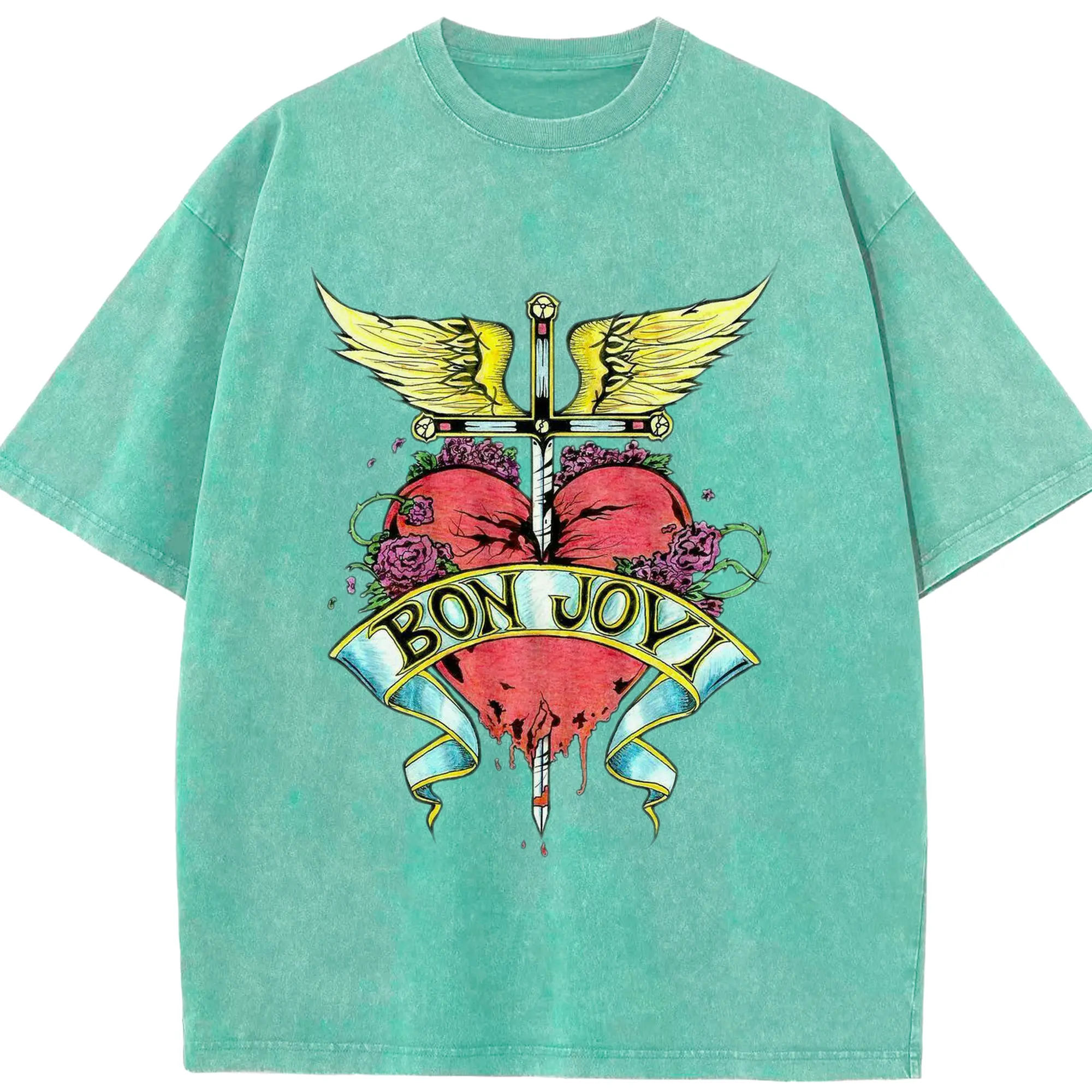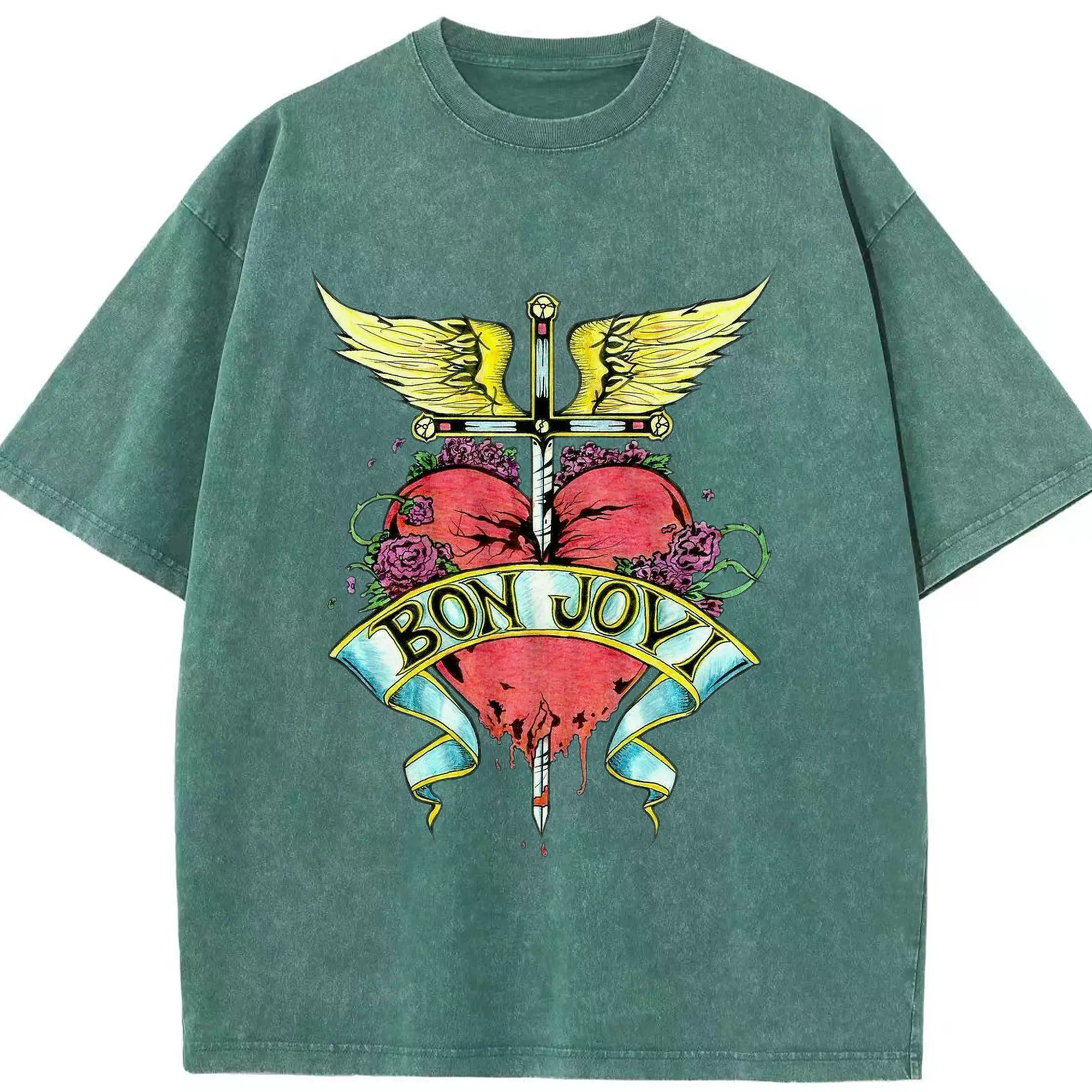 Bon Jovi Rock Heart Cross DIY Sihirt - Washed Vintage Look 230g Cotton Oversized T-Shirt With Front Heat Transfer Print – Soft, Lightweight, Stylish Fit – Comfortable Casual Wear For Sports & Everyday Use