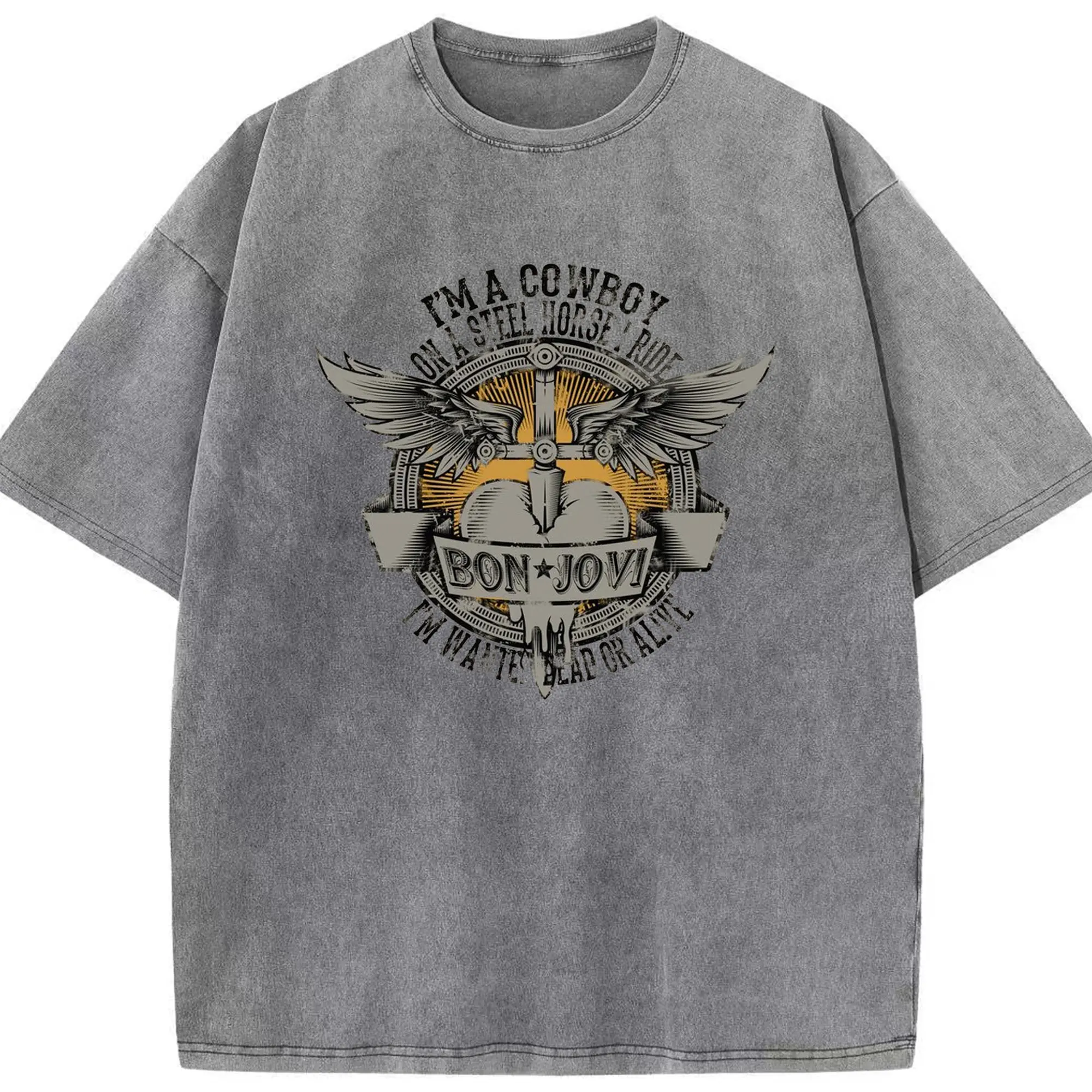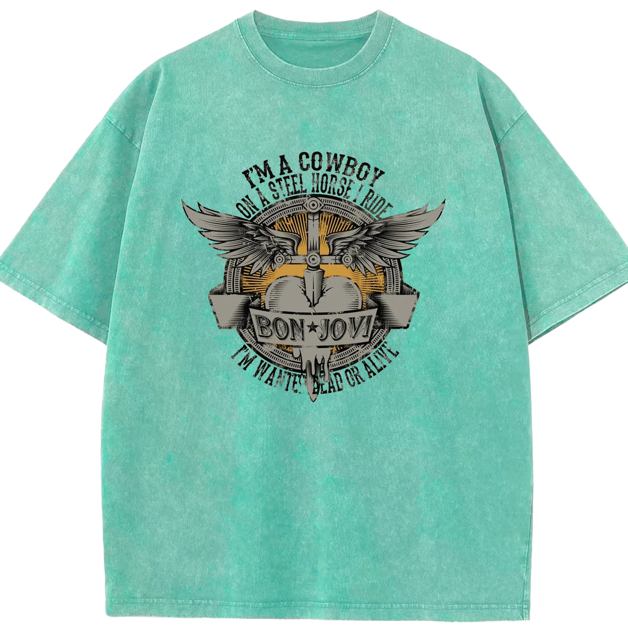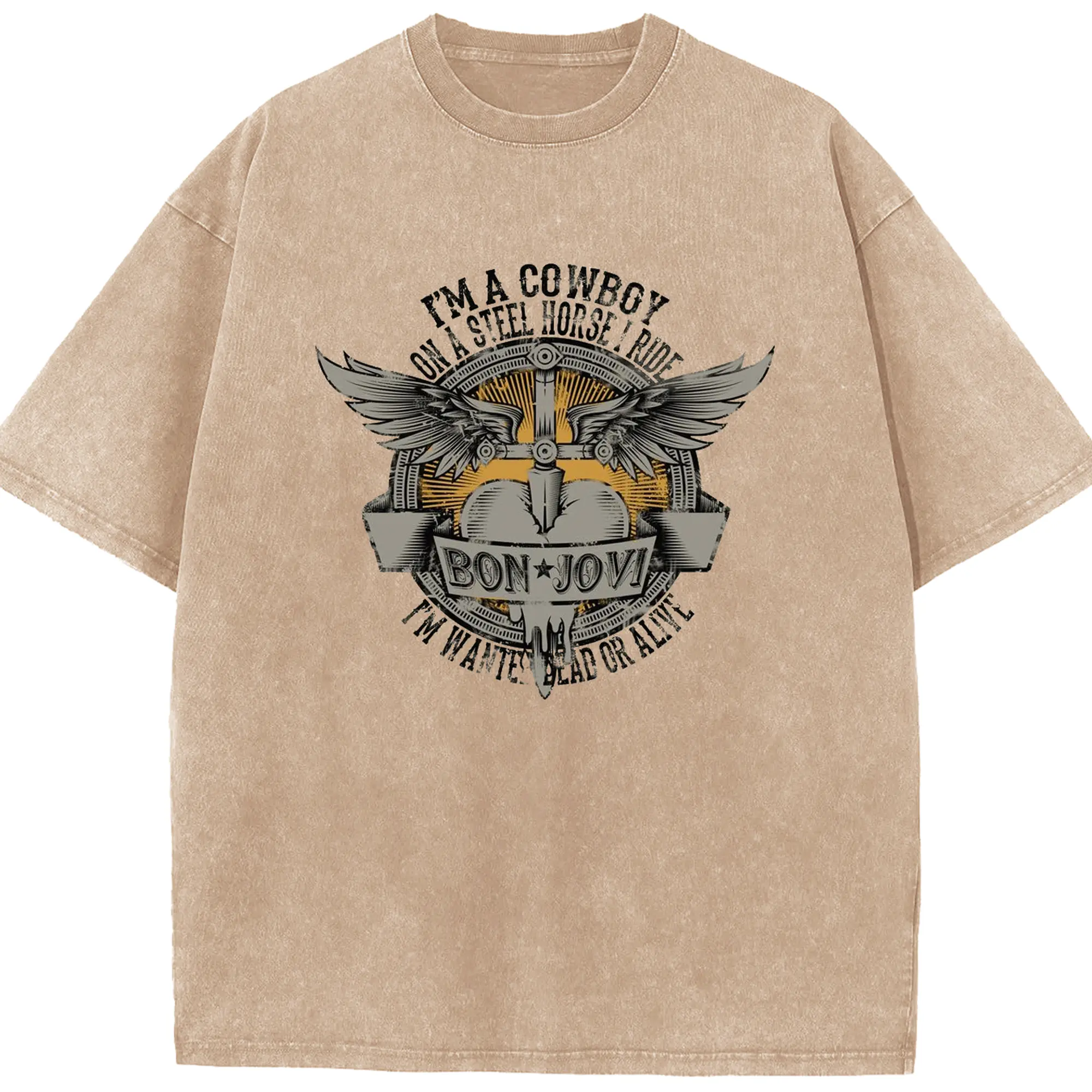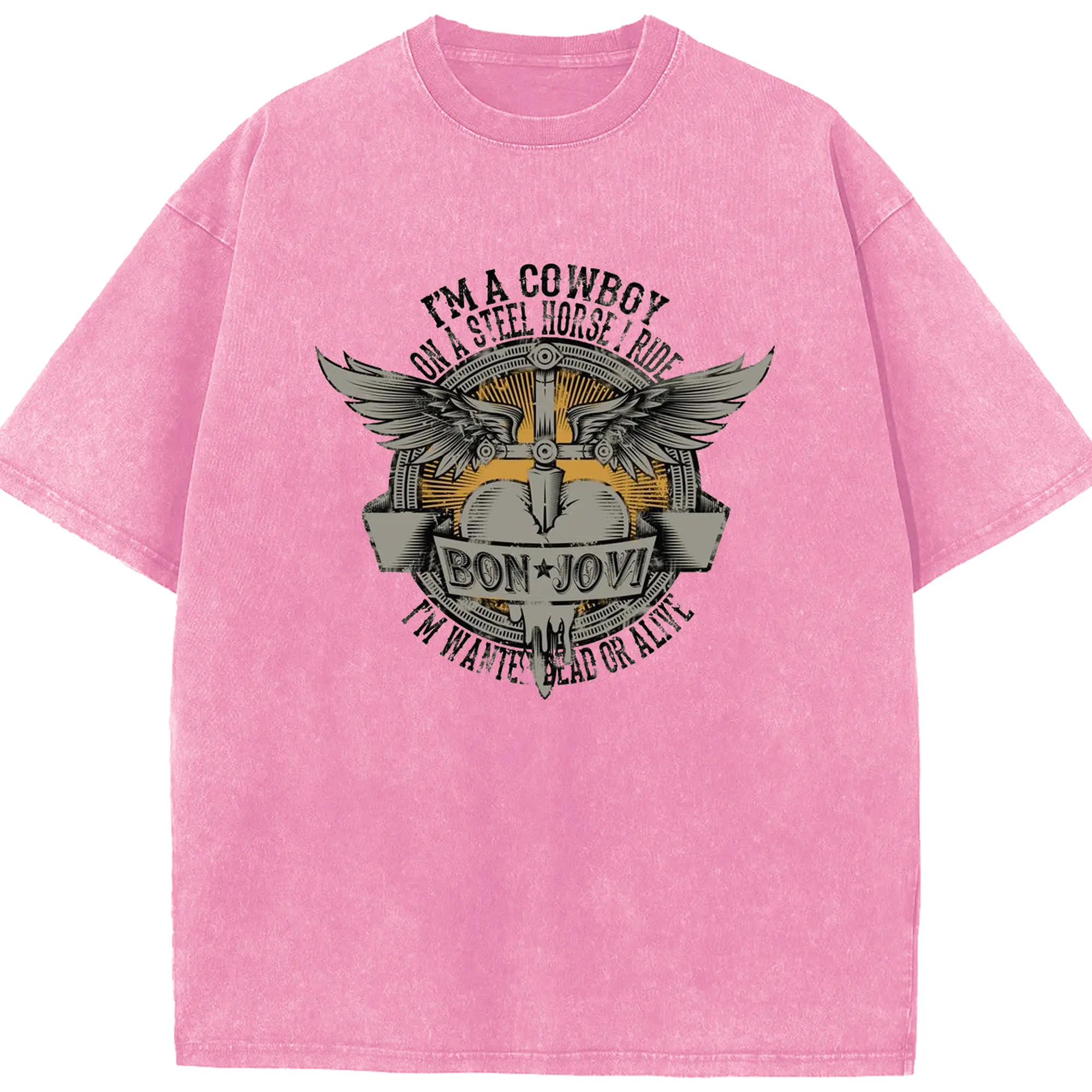 Bon Jovi Wanted Dead or Alive Retro Rock DIY Shirt - Washed Vintage Look 230g Cotton Oversized T-Shirt With Front Heat Transfer Print – Soft, Lightweight, Stylish Fit – Comfortable Casual Wear For Sports & Everyday Use
