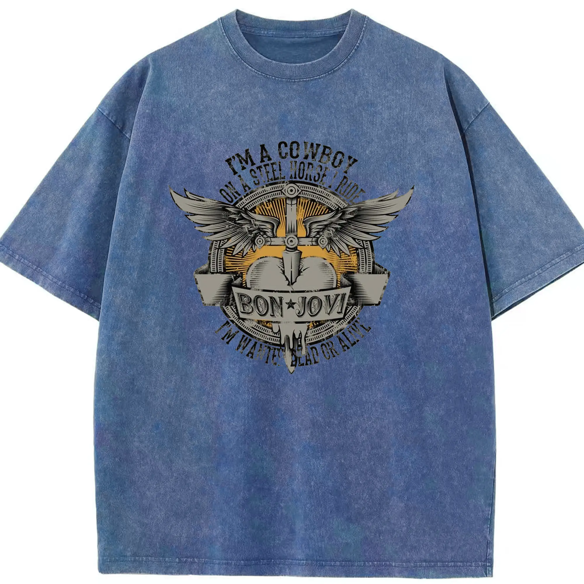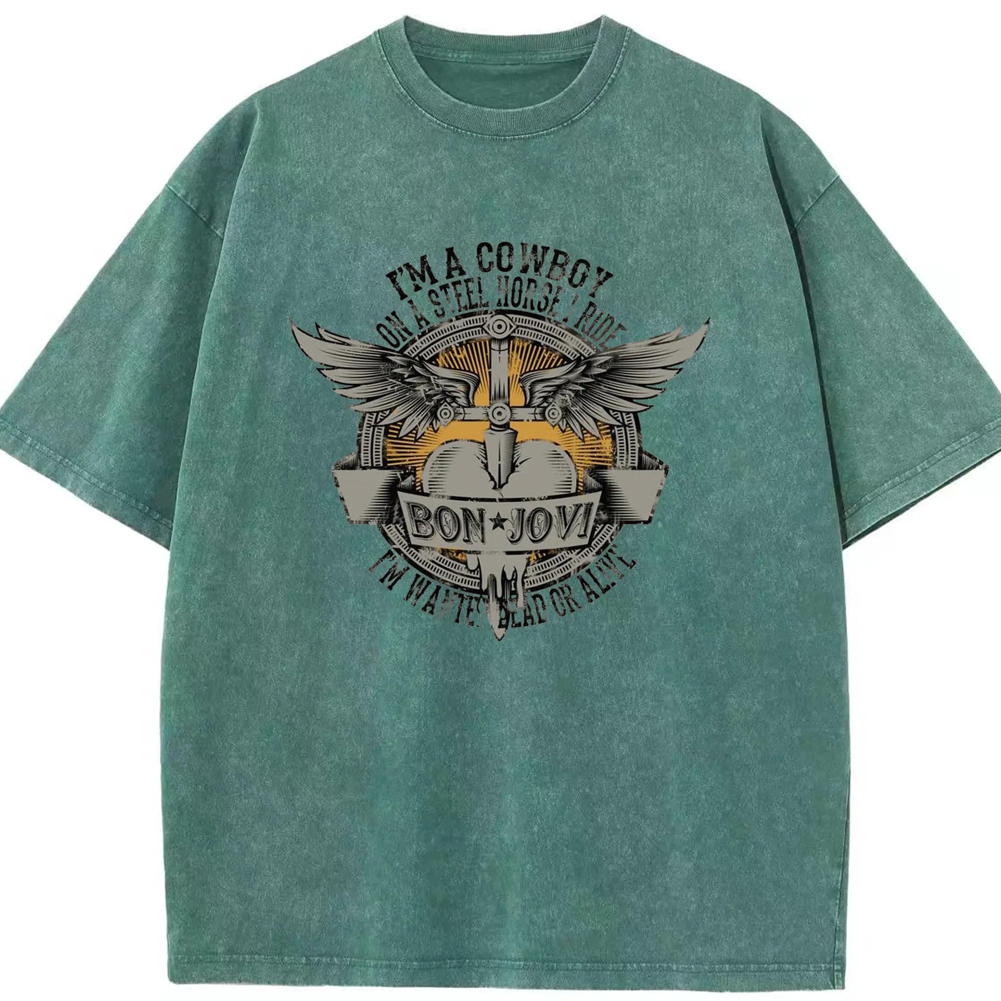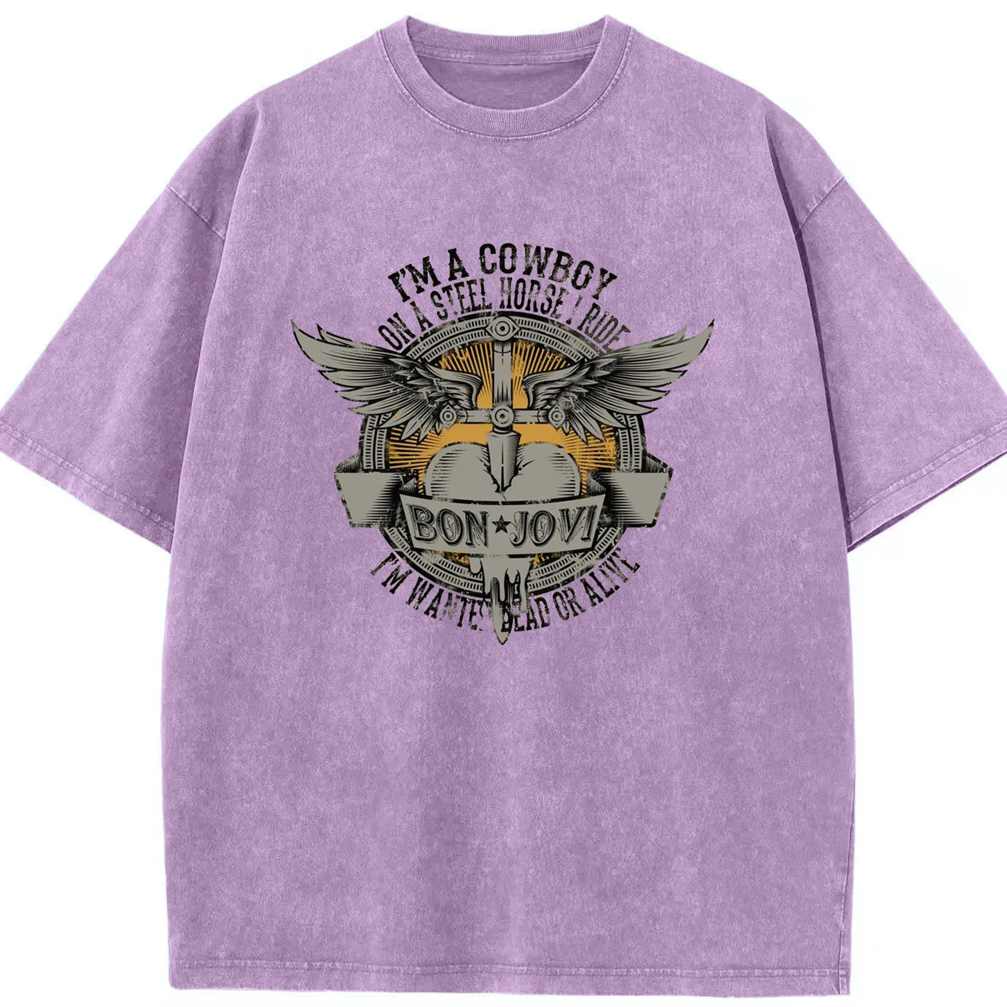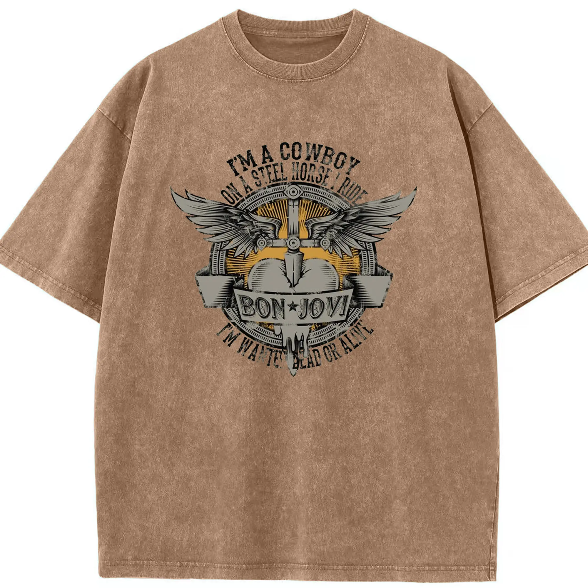 Bon Jovi Wanted Dead or Alive Retro Rock DIY Shirt - Washed Vintage Look 230g Cotton Oversized T-Shirt With Front Heat Transfer Print – Soft, Lightweight, Stylish Fit – Comfortable Casual Wear For Sports & Everyday Use