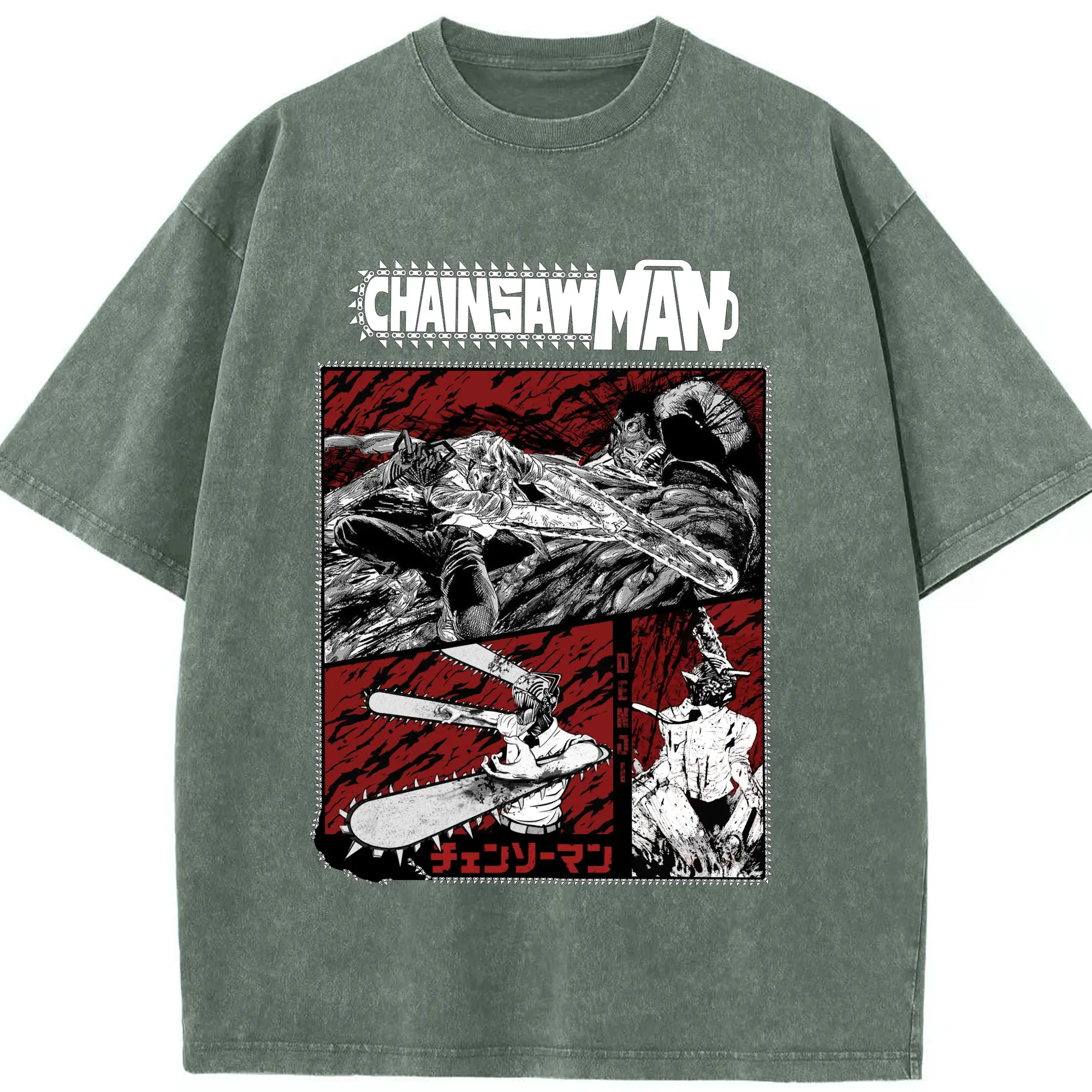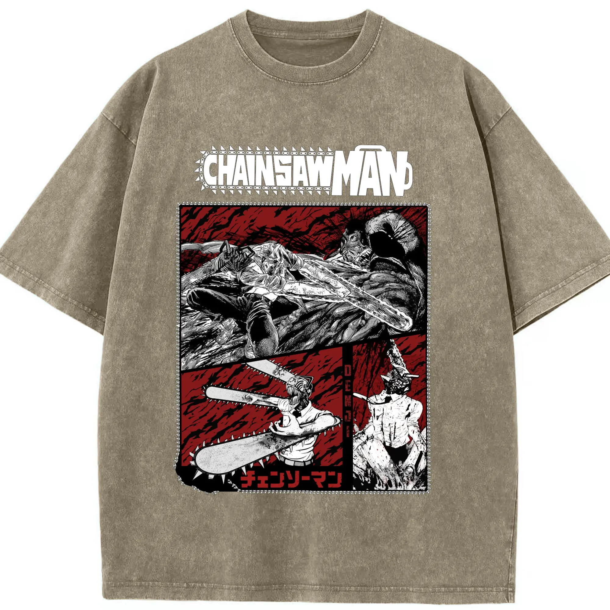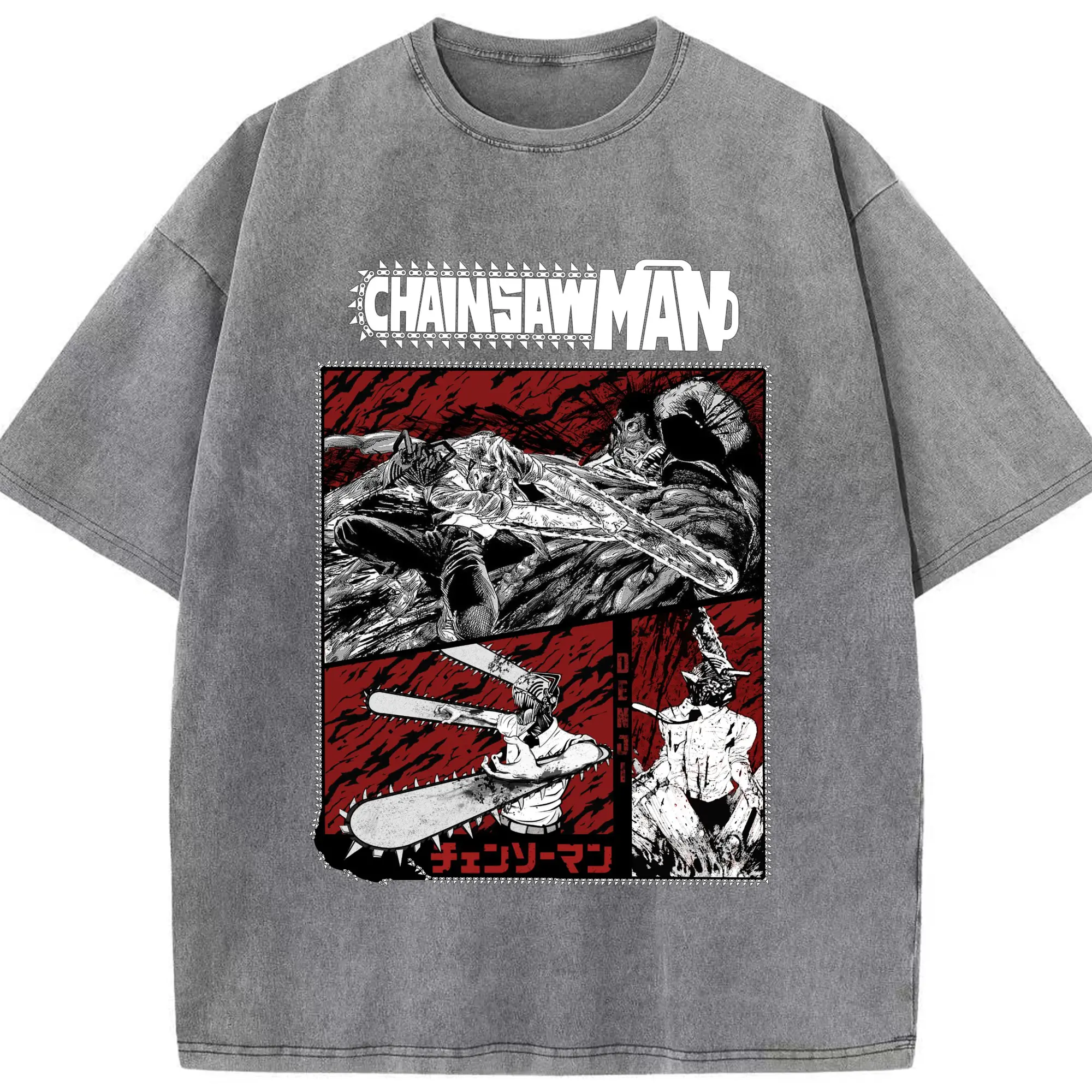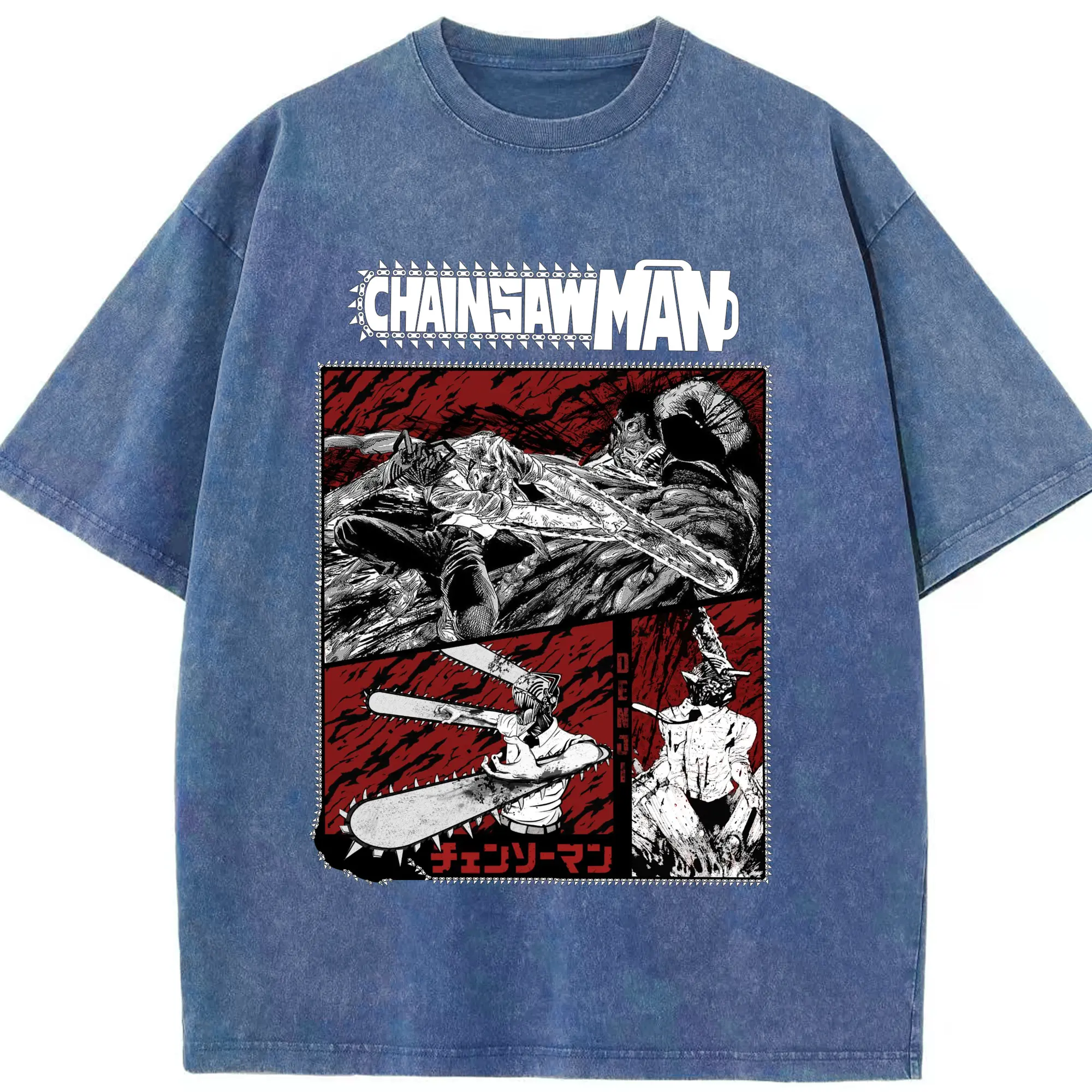 Chainsaw Man Dark Battle Manga-Style DIY Shirt - Washed Vintage Look 230g Cotton Oversized T-Shirt With Front Heat Transfer Print – Soft, Lightweight, Stylish Fit – Comfortable Casual Wear For Sports & Everyday Use