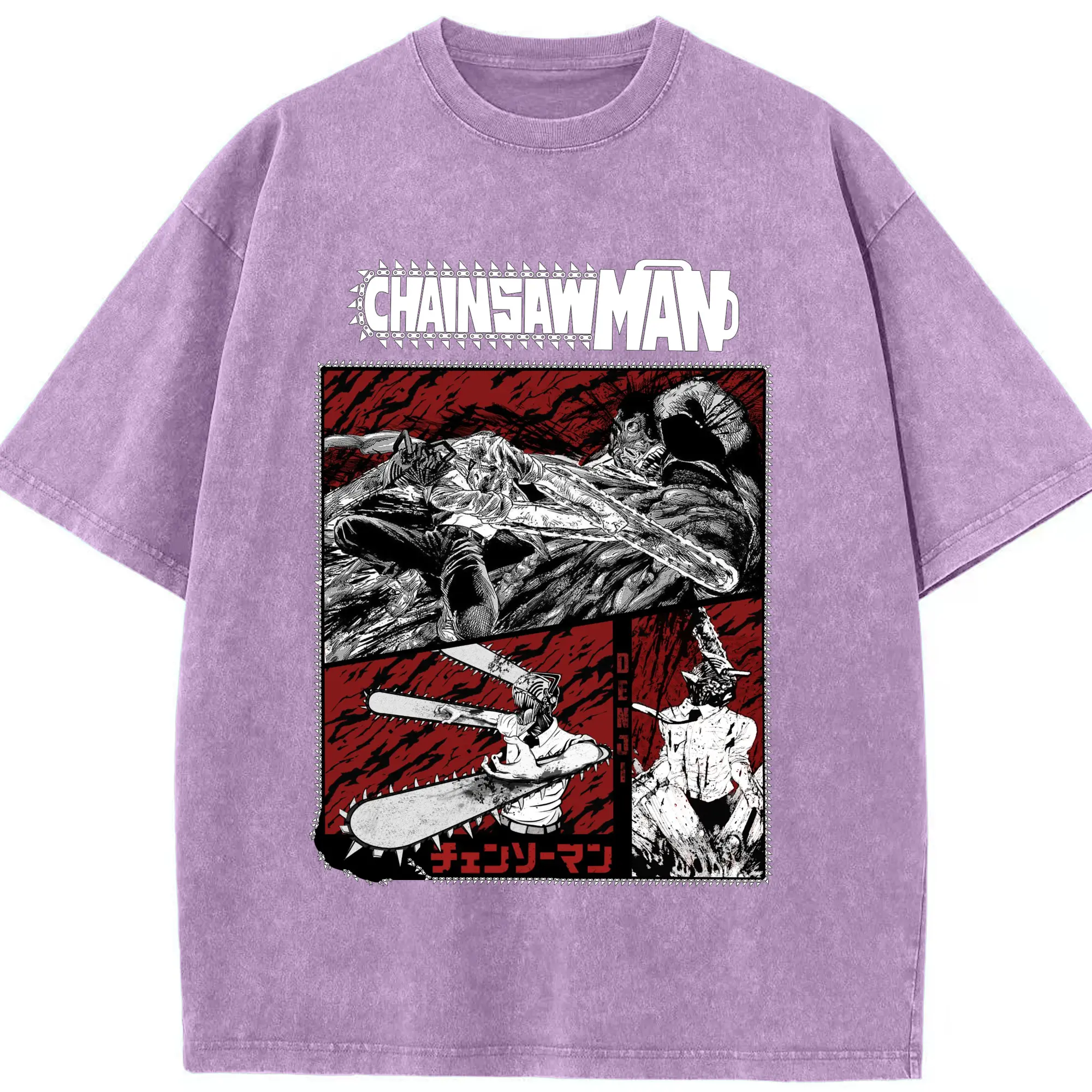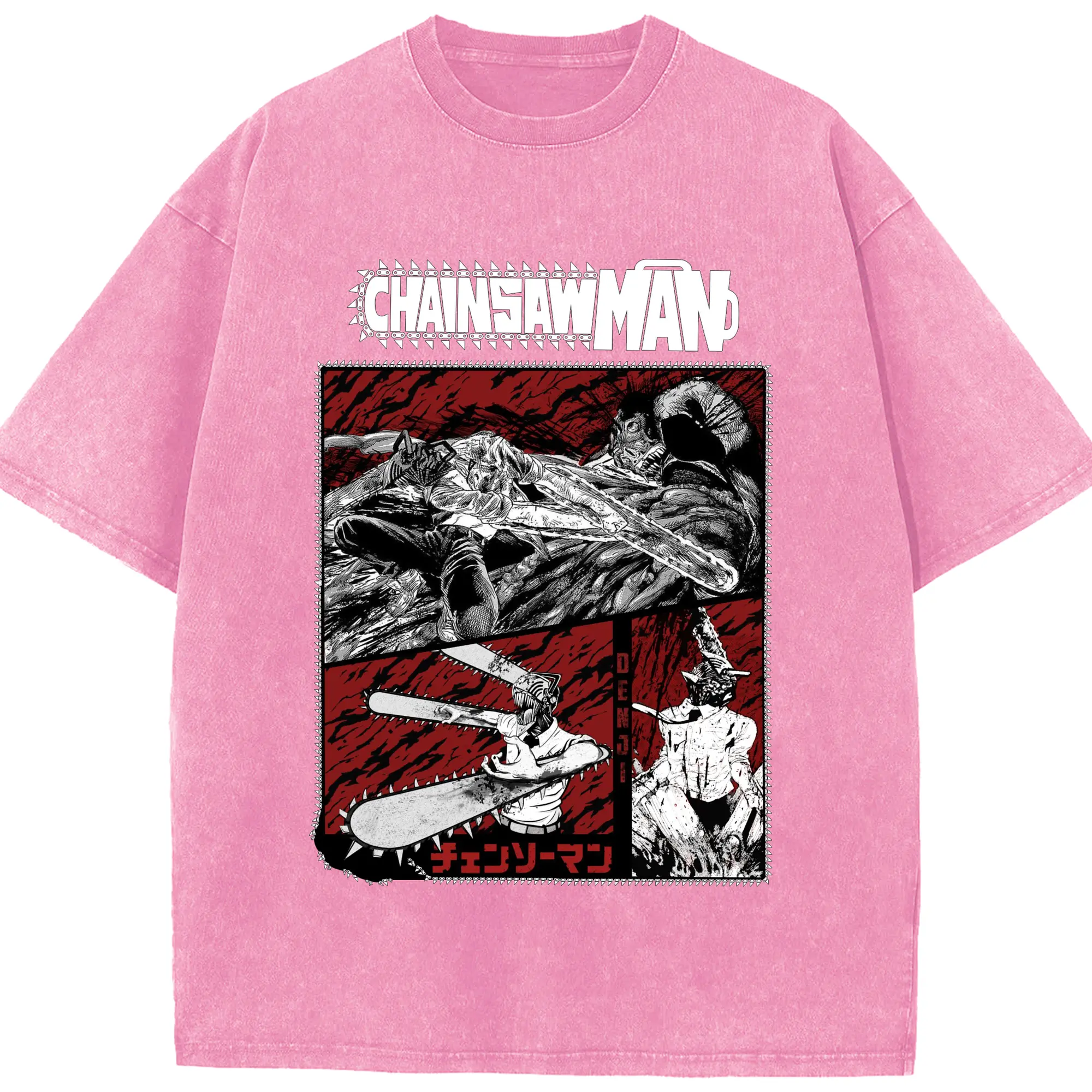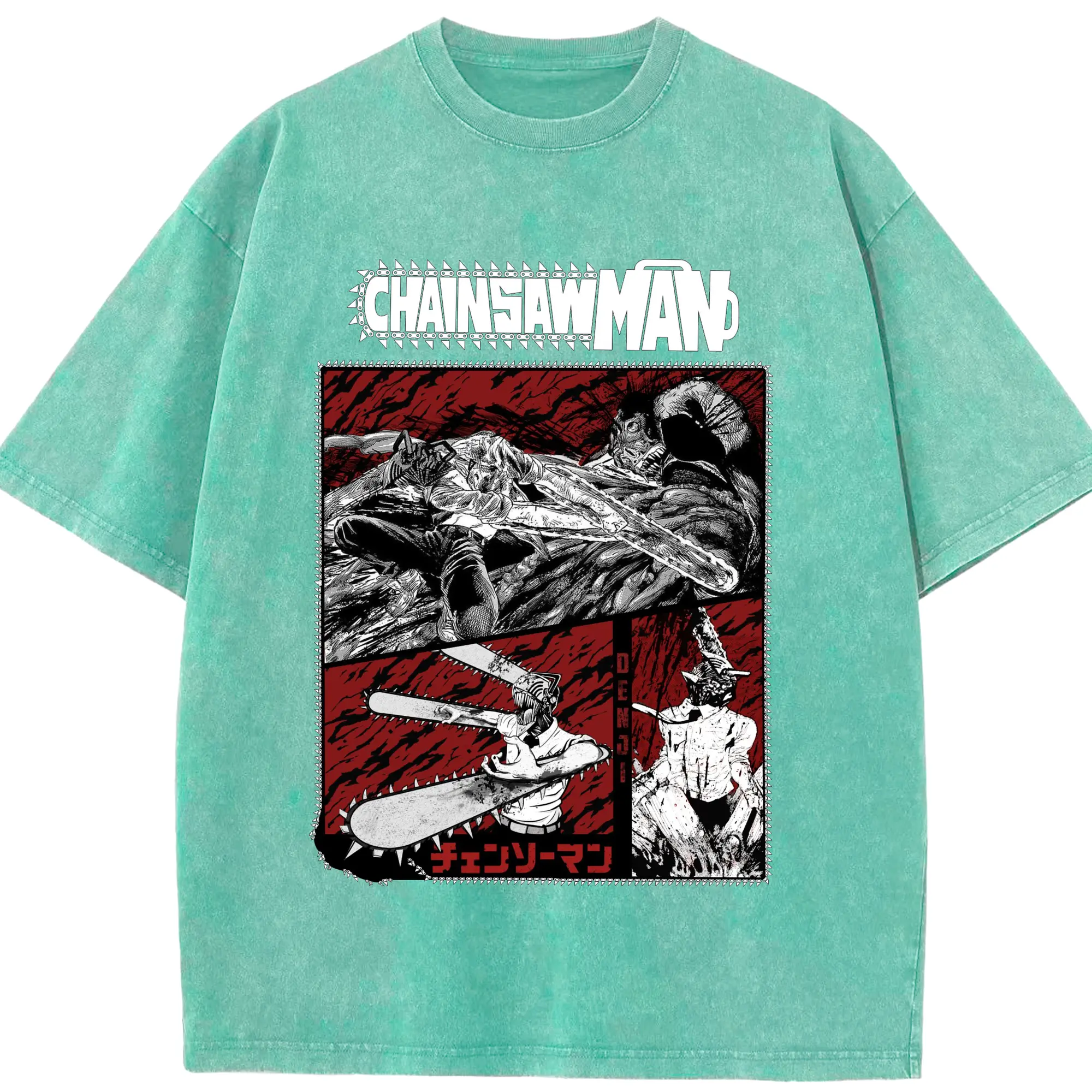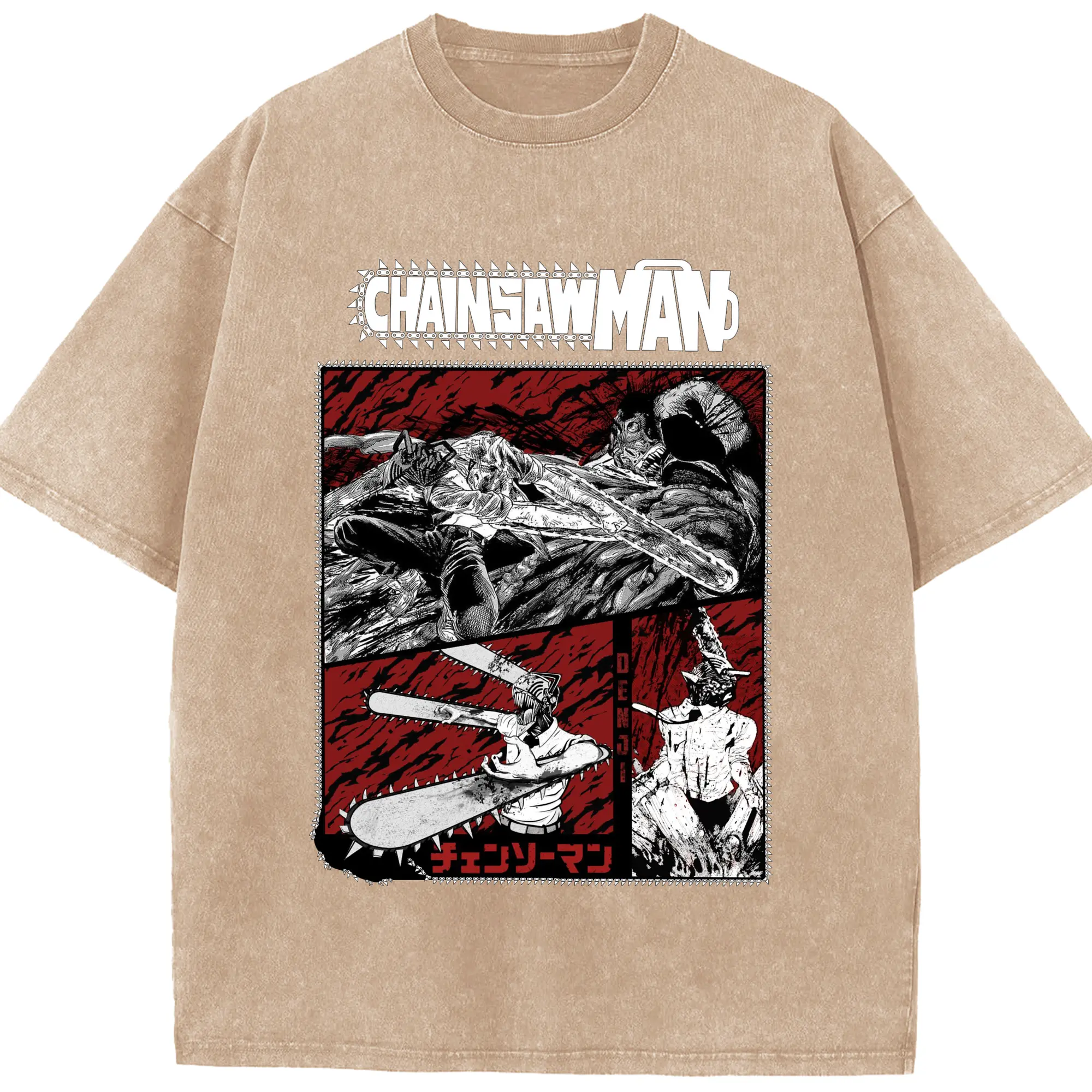 Chainsaw Man Dark Battle Manga-Style DIY Shirt - Washed Vintage Look 230g Cotton Oversized T-Shirt With Front Heat Transfer Print – Soft, Lightweight, Stylish Fit – Comfortable Casual Wear For Sports & Everyday Use