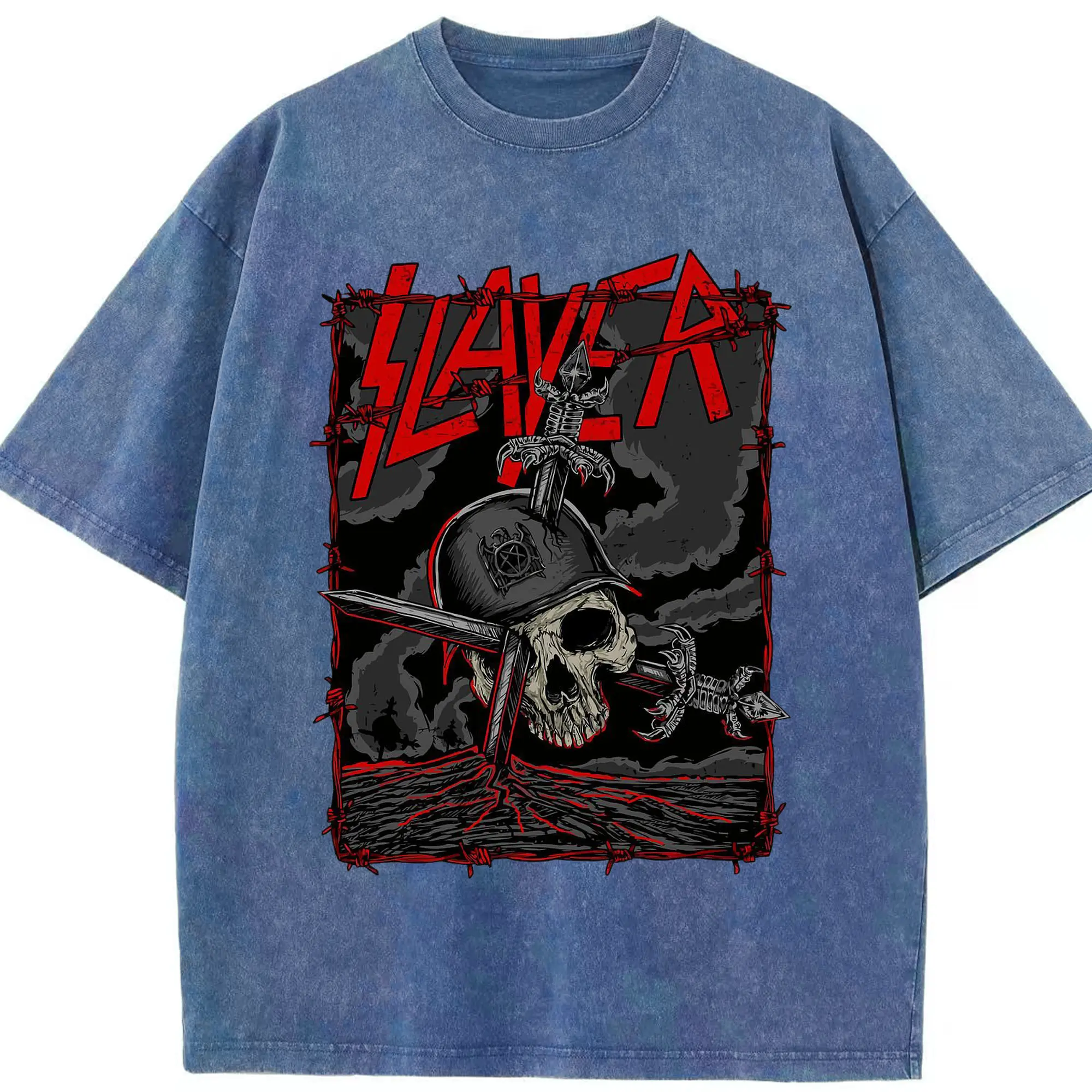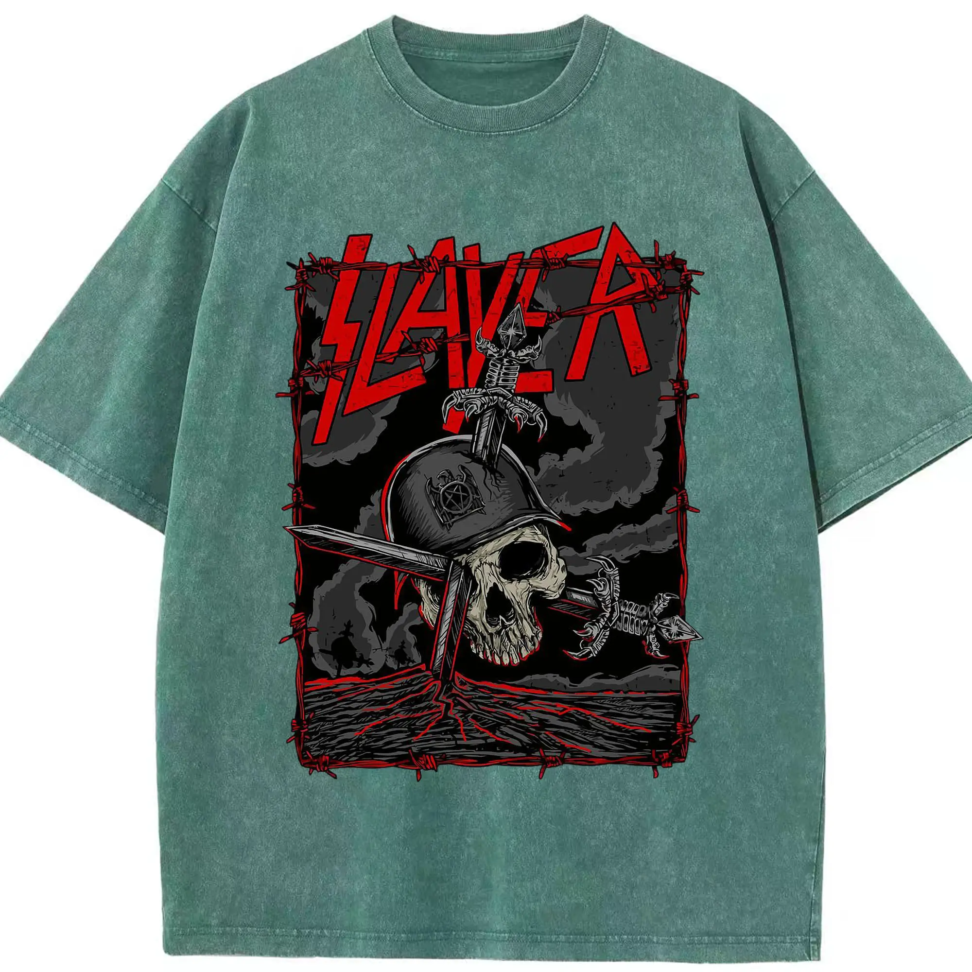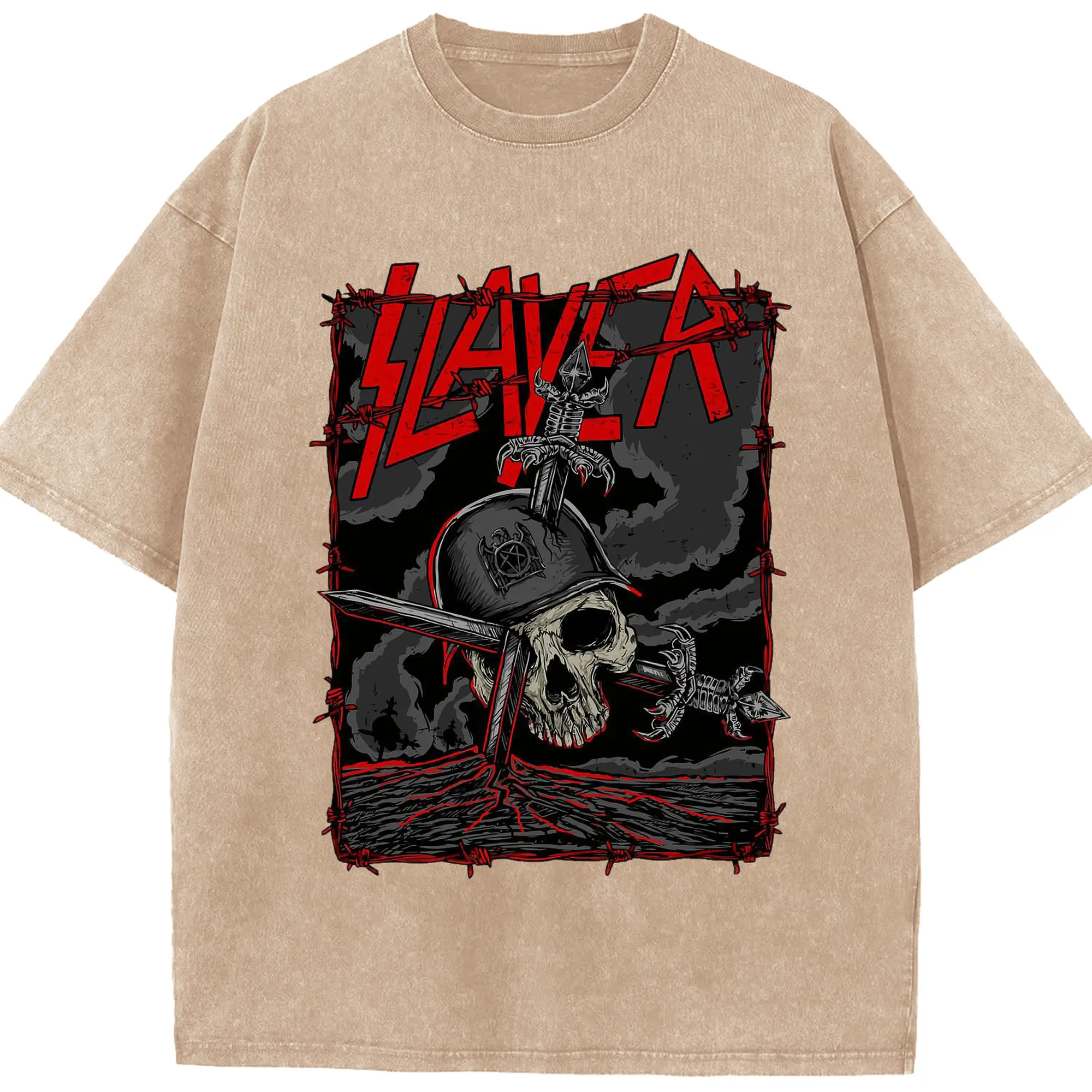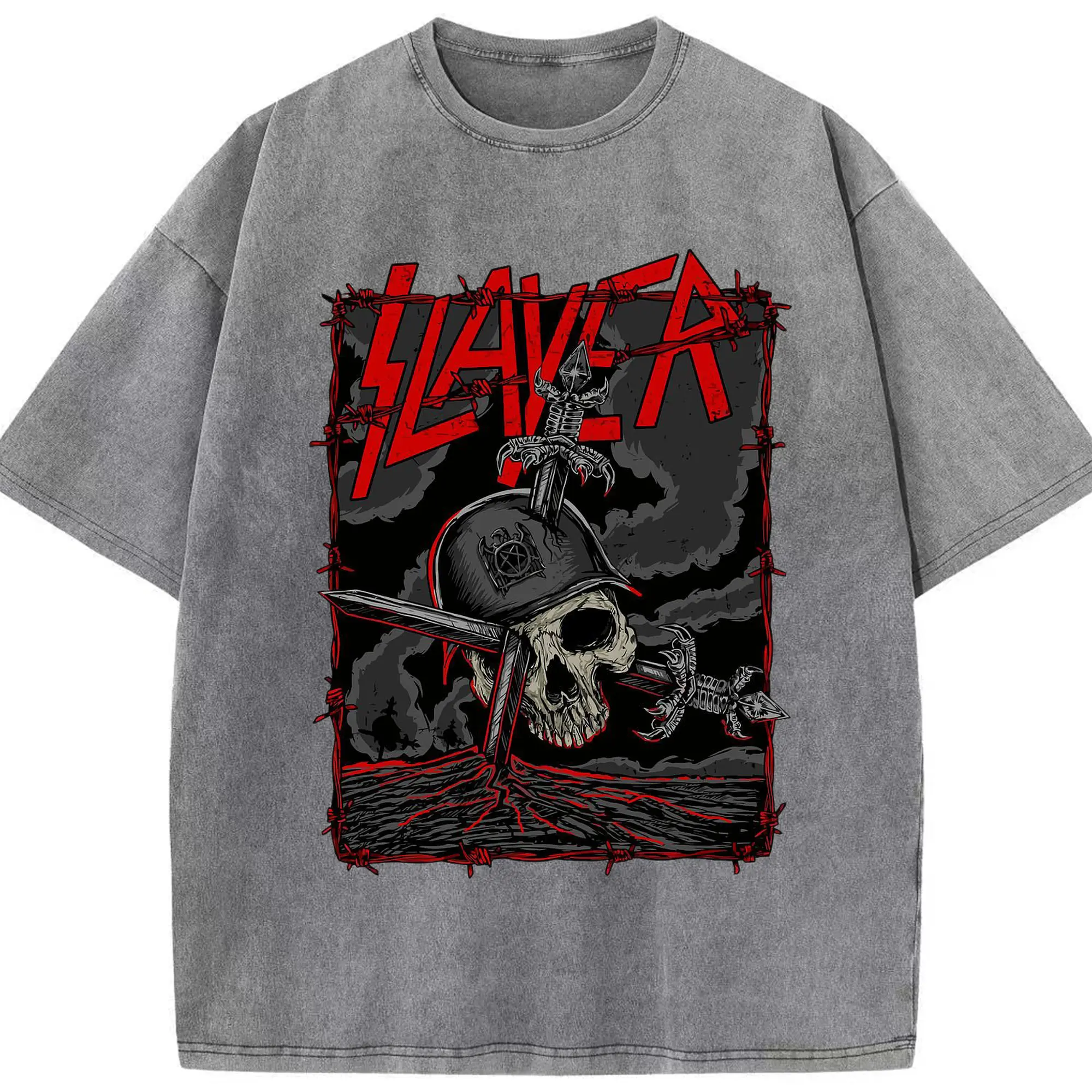 Dark Rock Style Slayer Military Skull DIY Shirt - Washed Vintage Look 230g Cotton Oversized T-Shirt With Front Heat Transfer Print – Soft, Lightweight, Stylish Fit – Comfortable Casual Wear For Sports & Everyday Use