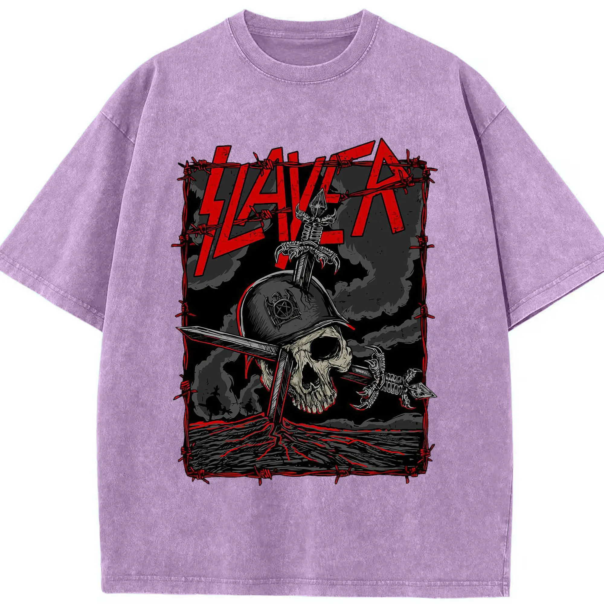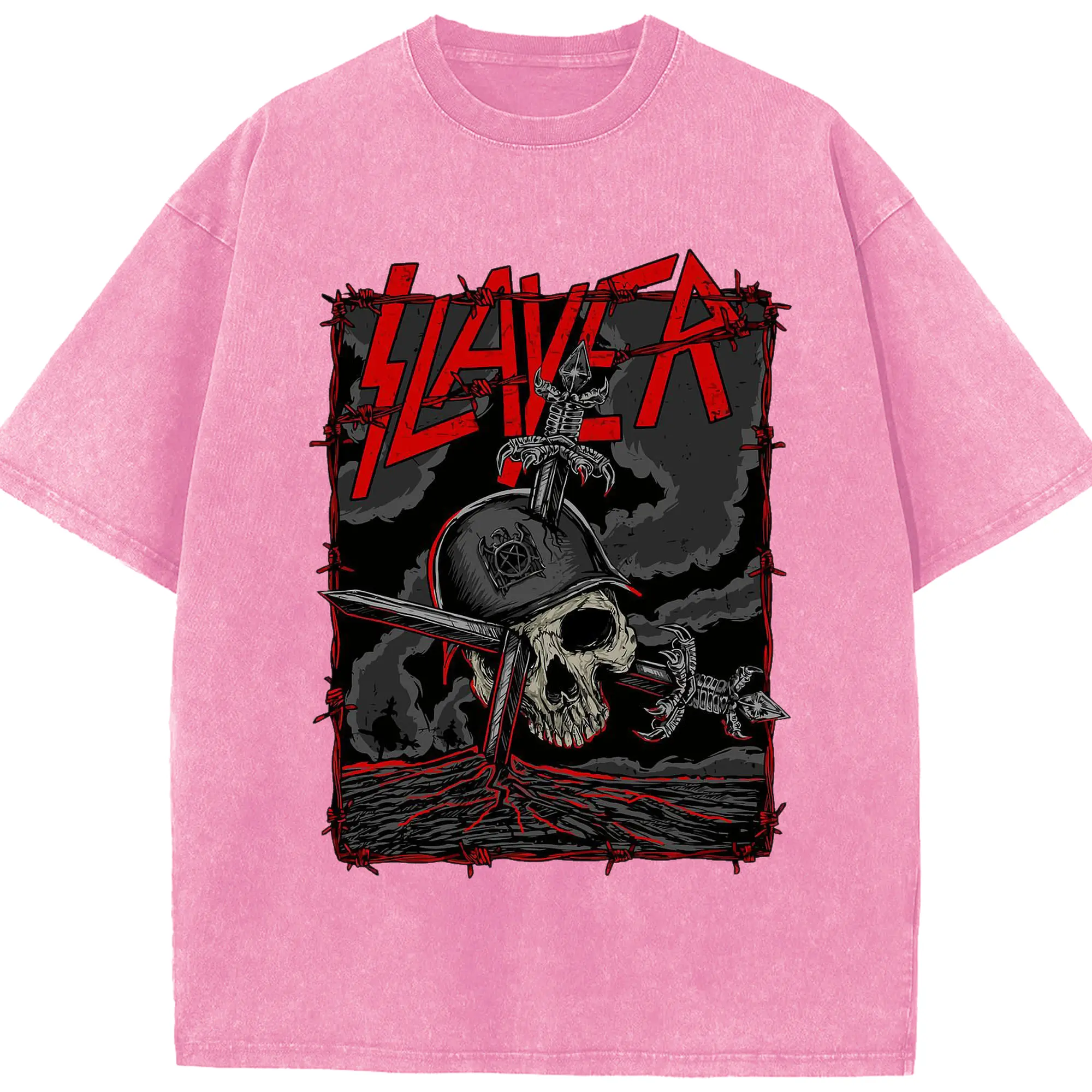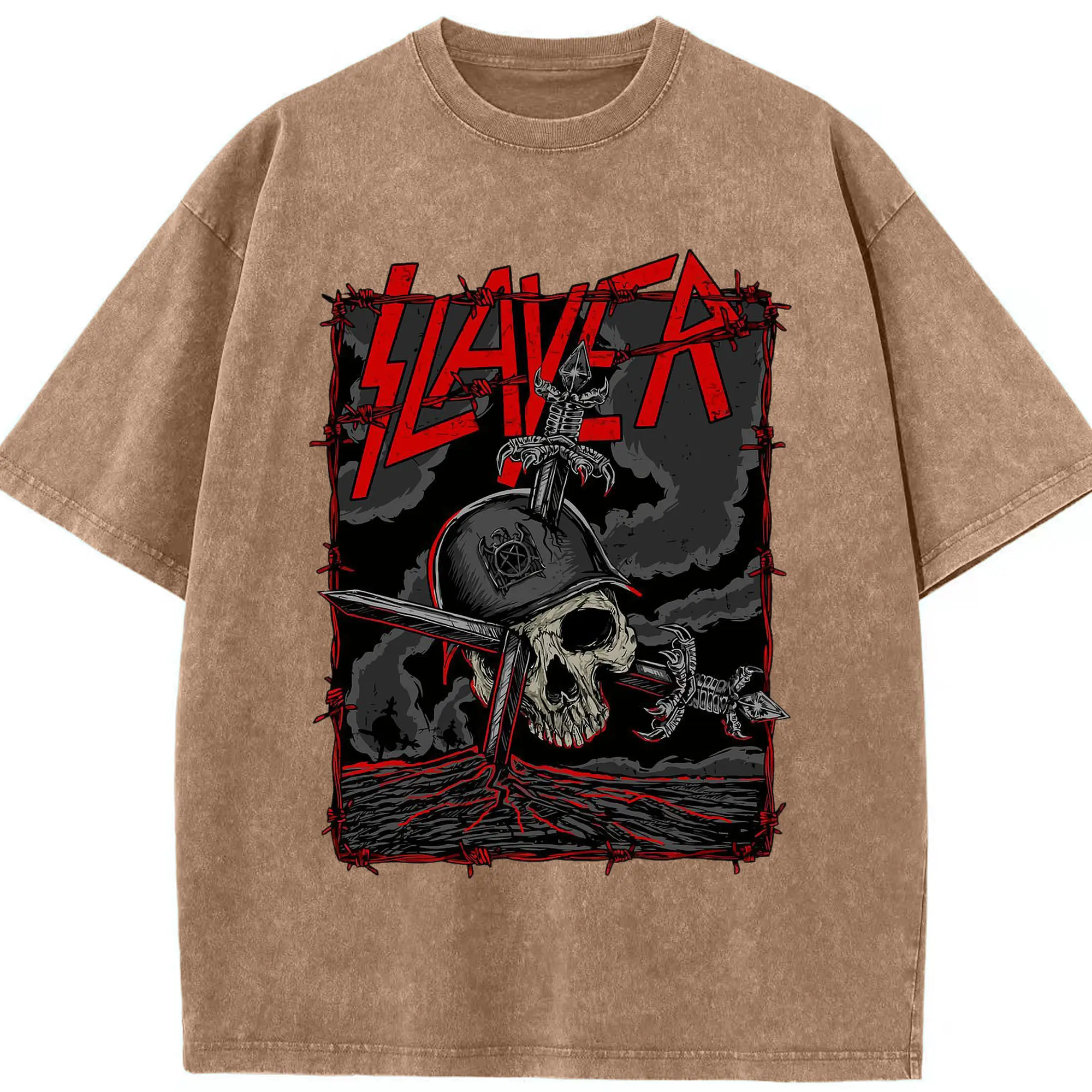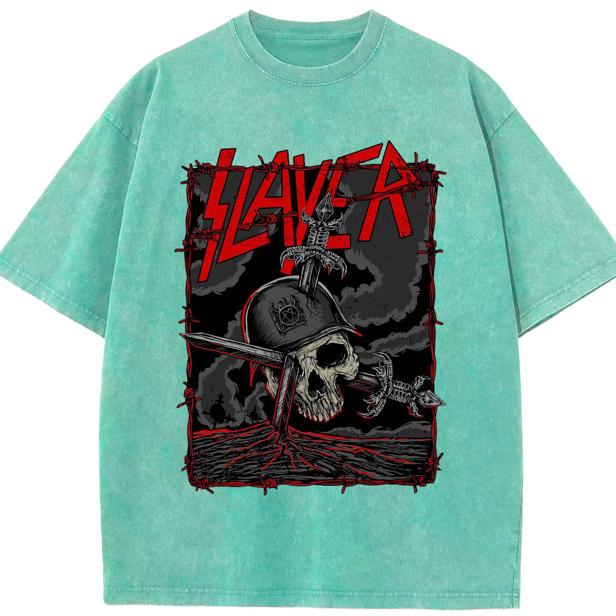Dark Rock Style Slayer Military Skull DIY Shirt - Washed Vintage Look 230g Cotton Oversized T-Shirt With Front Heat Transfer Print – Soft, Lightweight, Stylish Fit – Comfortable Casual Wear For Sports & Everyday Use