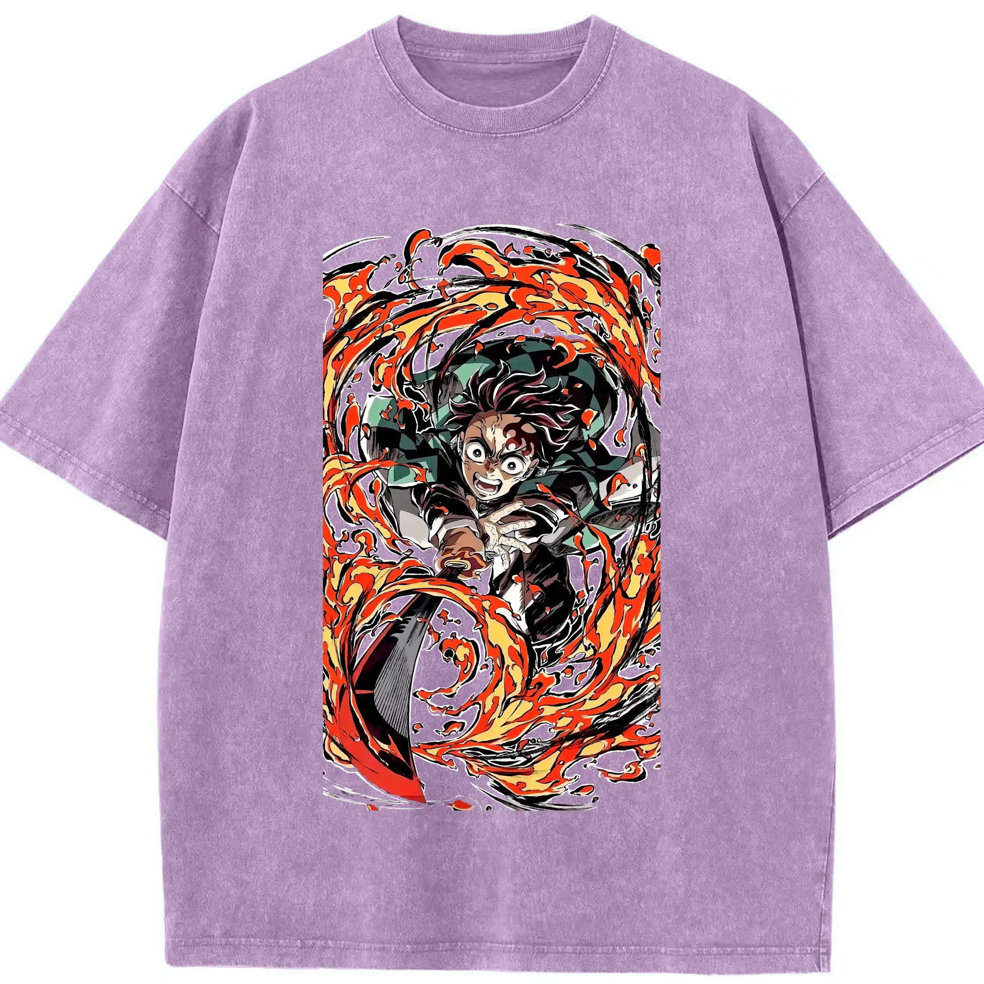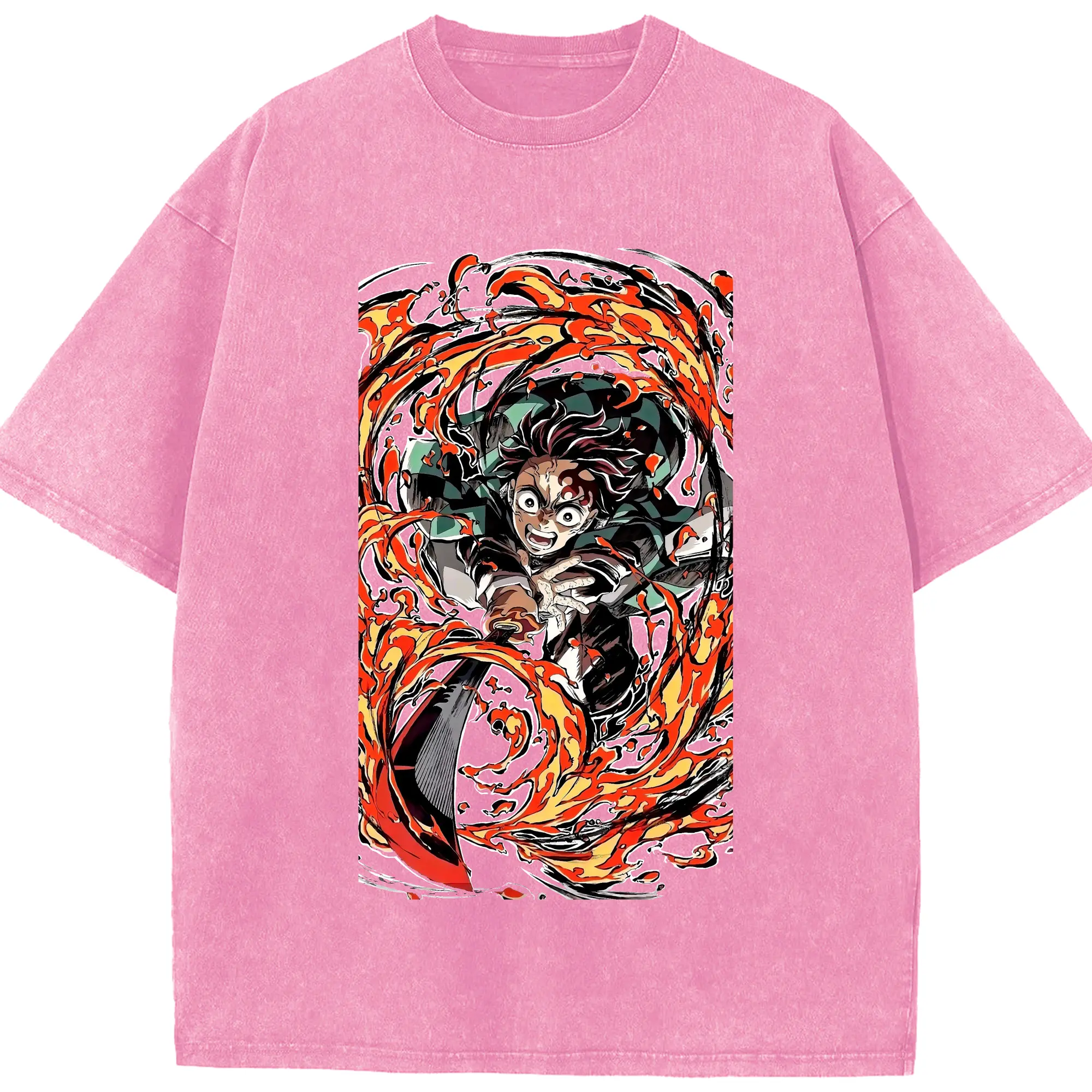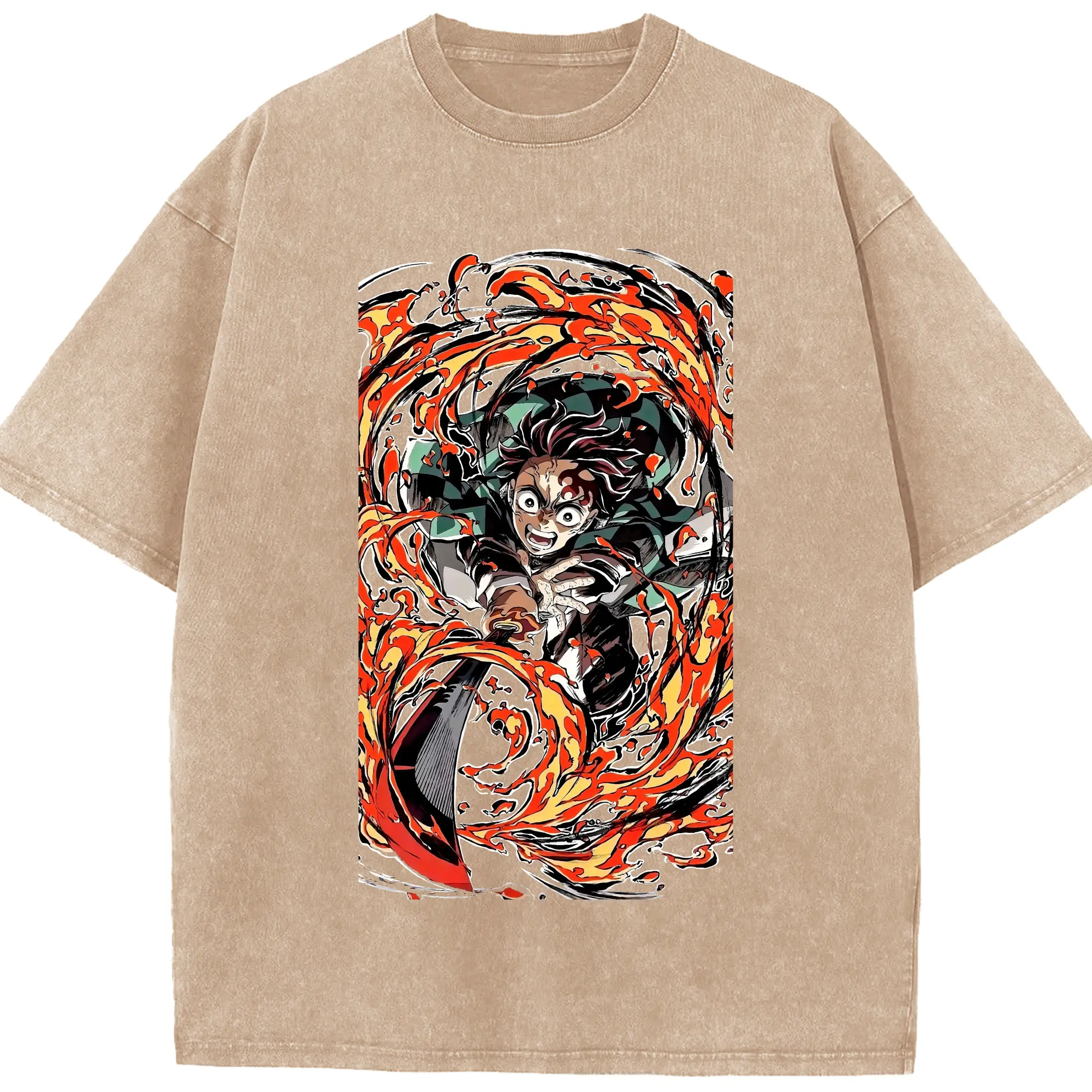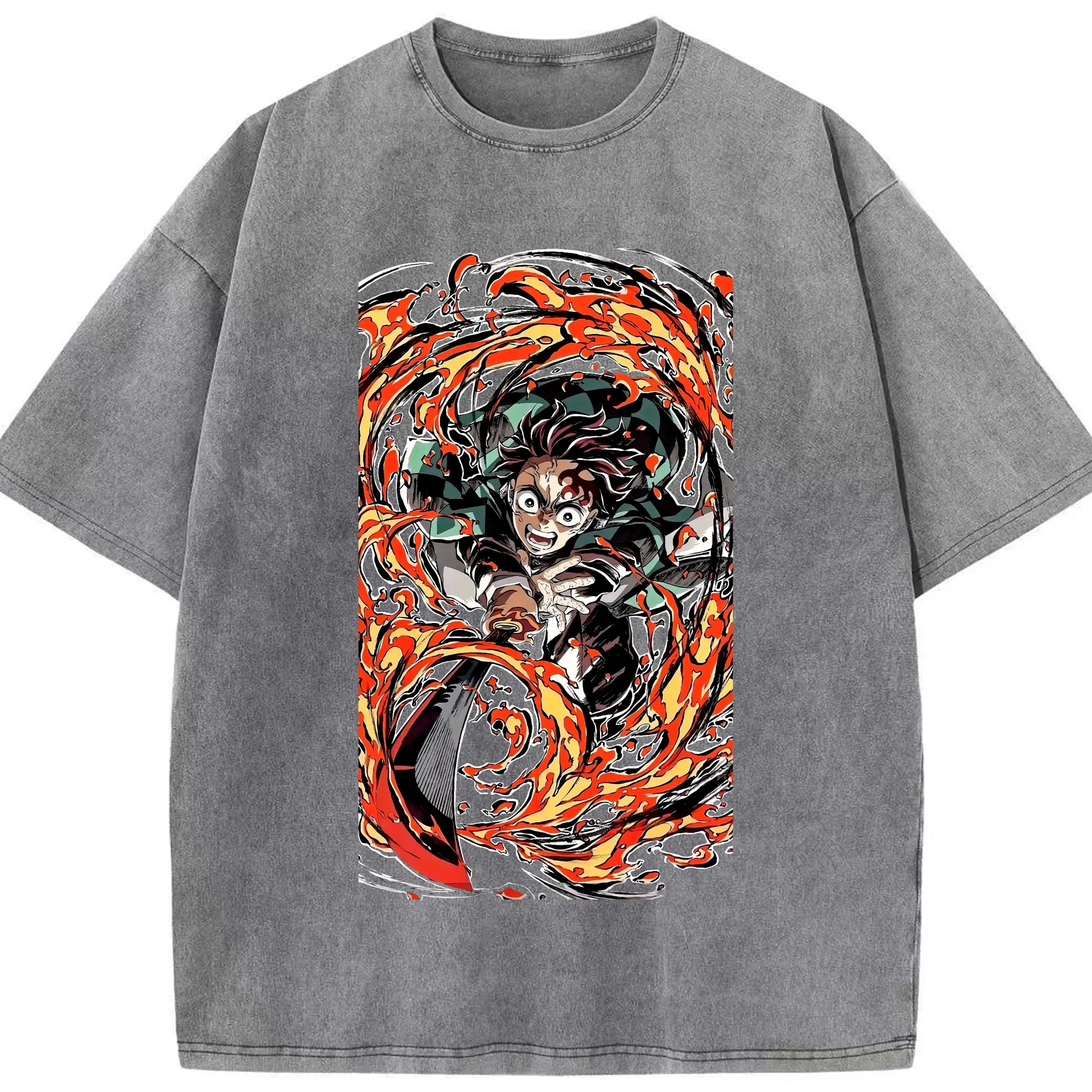 Demon Slayer Tanjiro Battle Flame DIY Shirt - Washed Vintage Look 230g Cotton Oversized T-Shirt With Front Heat Transfer Print – Soft, Lightweight, Stylish Fit – Comfortable Casual Wear For Sports & Everyday Use