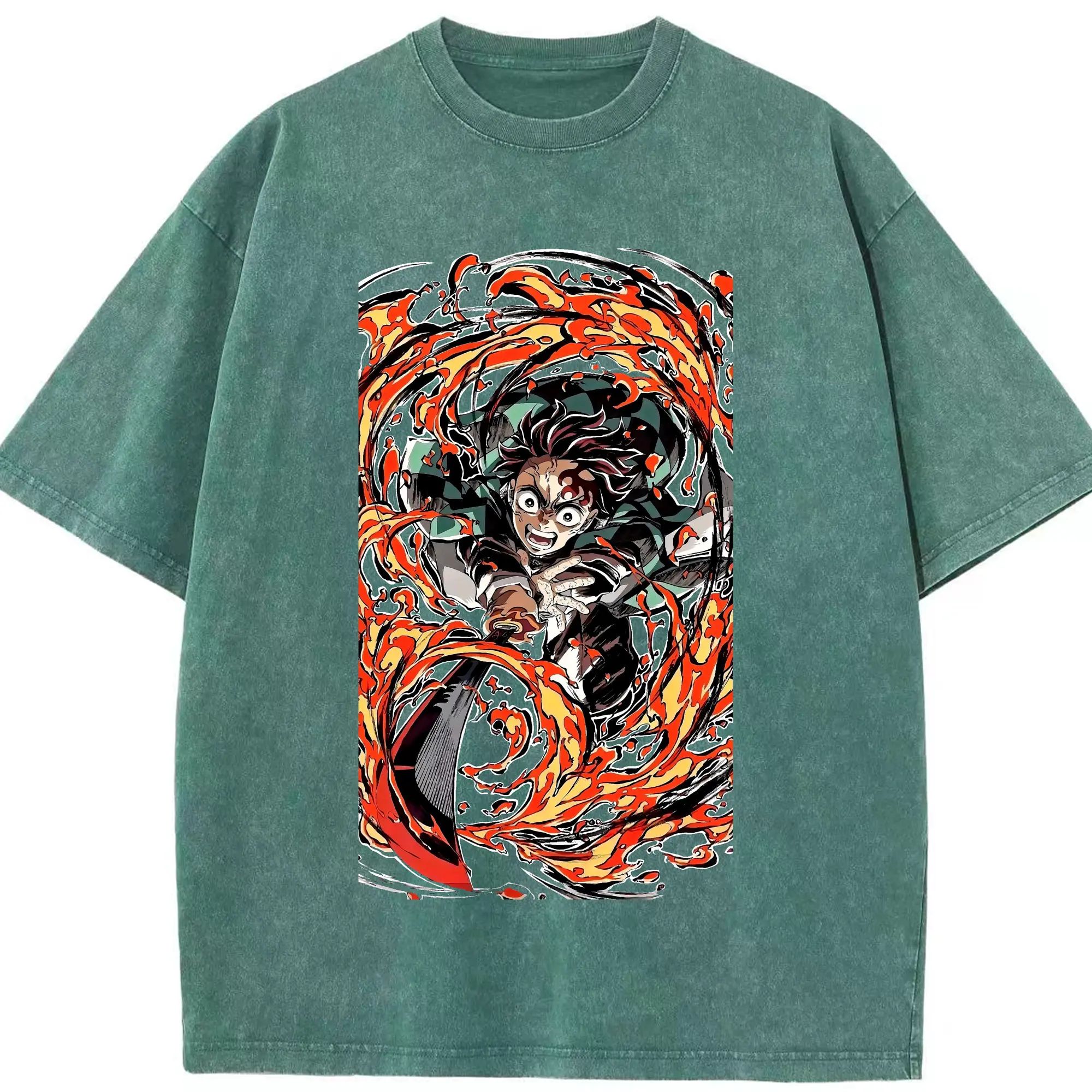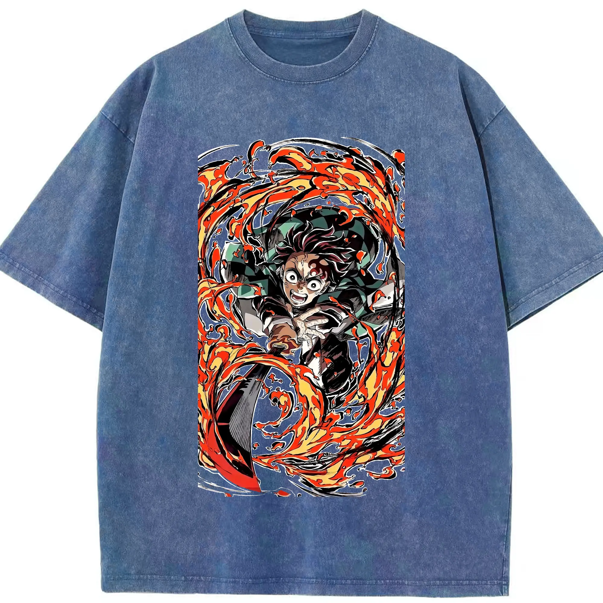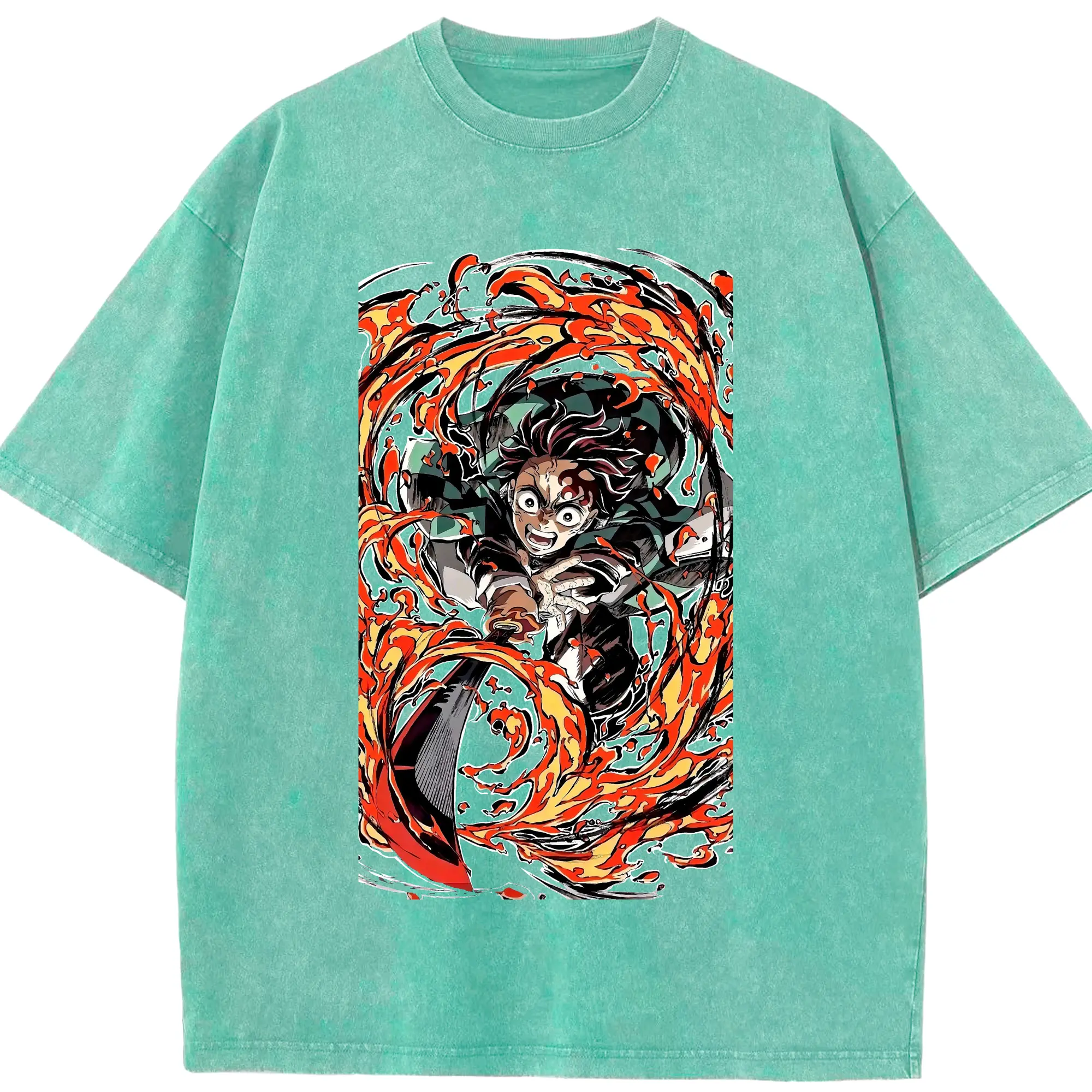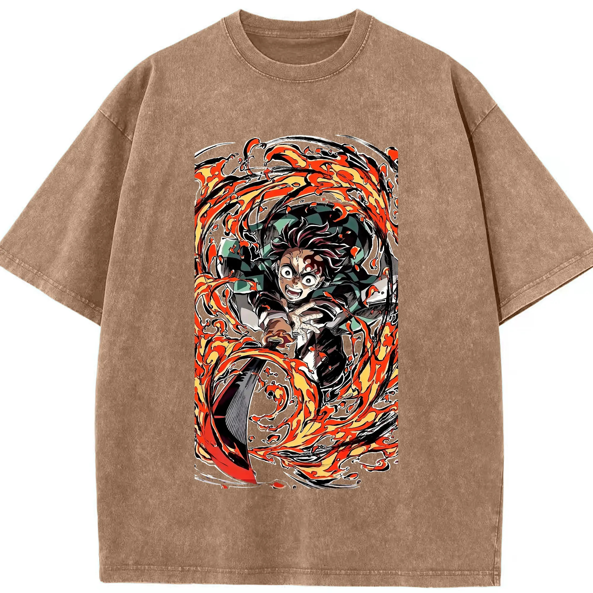 Demon Slayer Tanjiro Battle Flame DIY Shirt - Washed Vintage Look 230g Cotton Oversized T-Shirt With Front Heat Transfer Print – Soft, Lightweight, Stylish Fit – Comfortable Casual Wear For Sports & Everyday Use