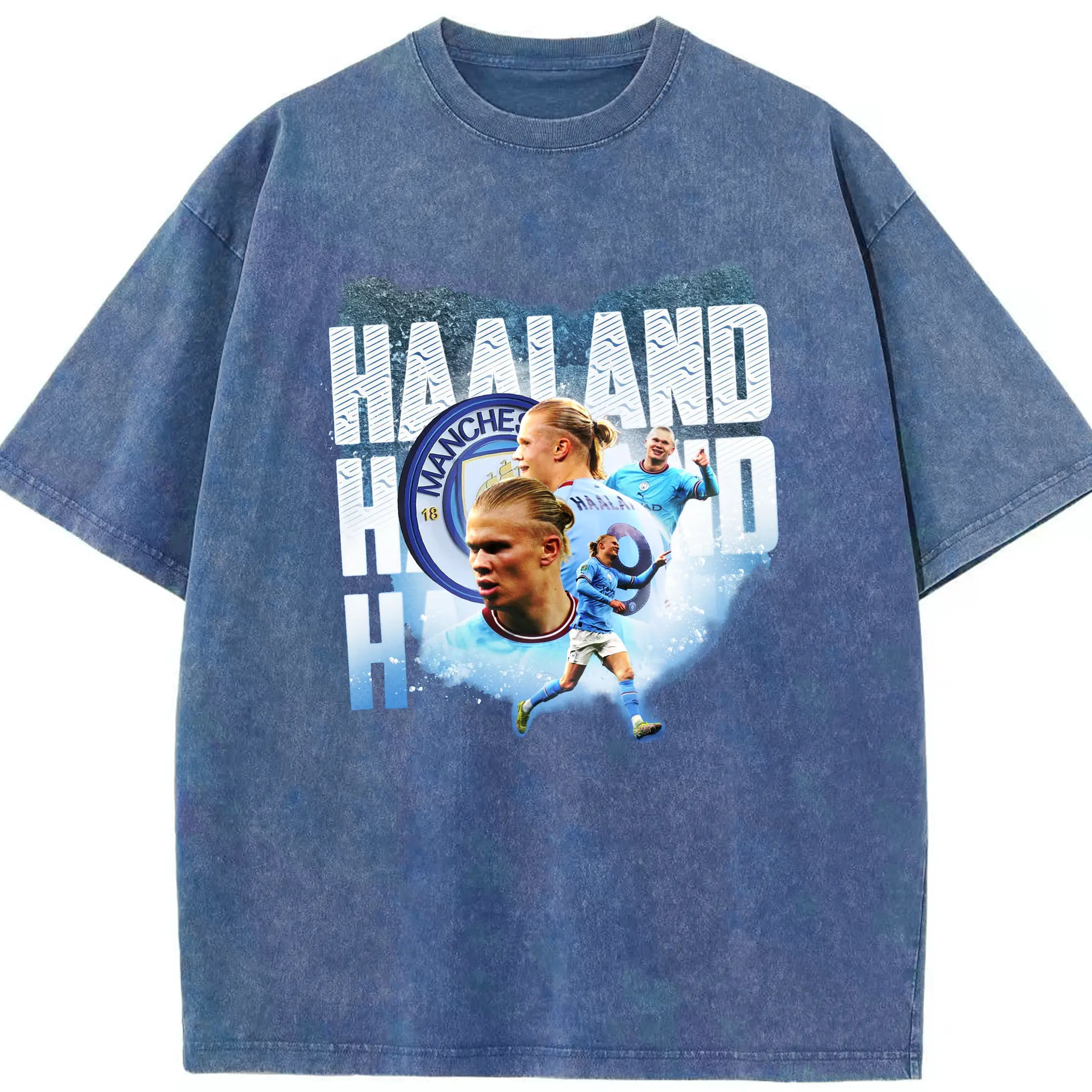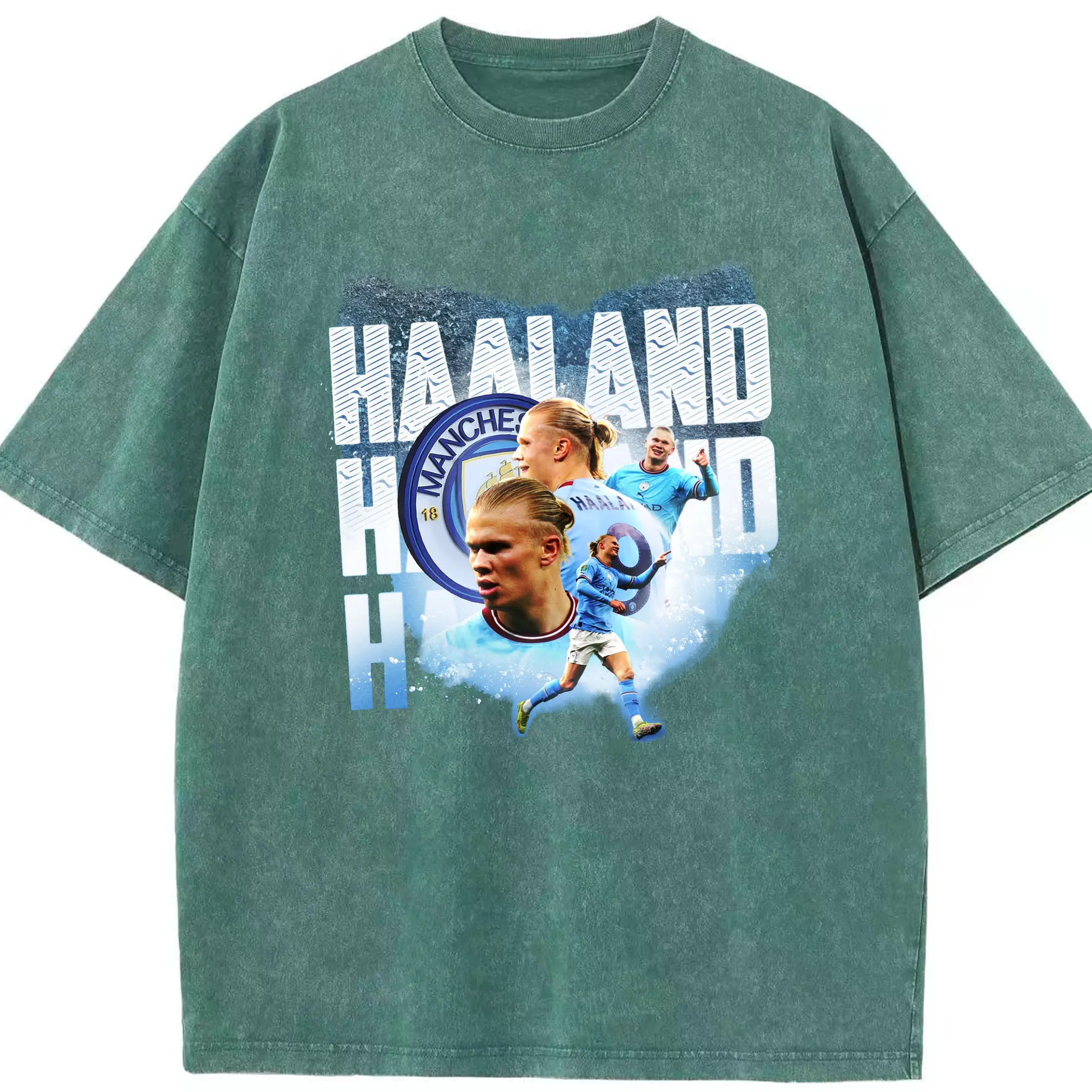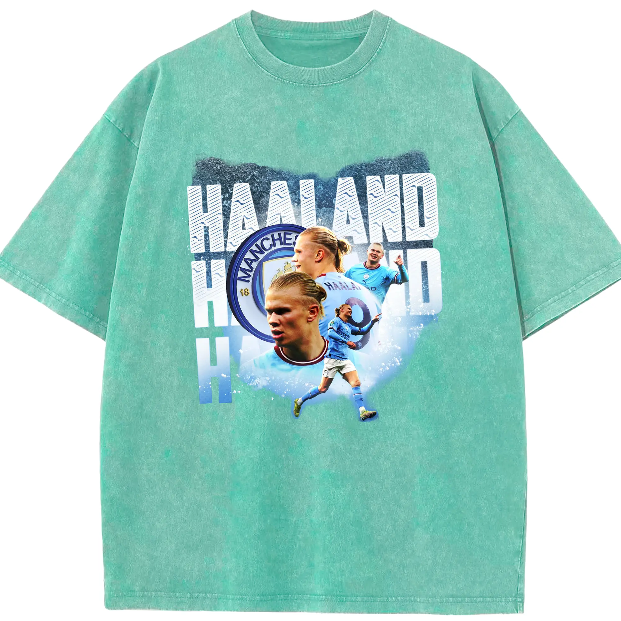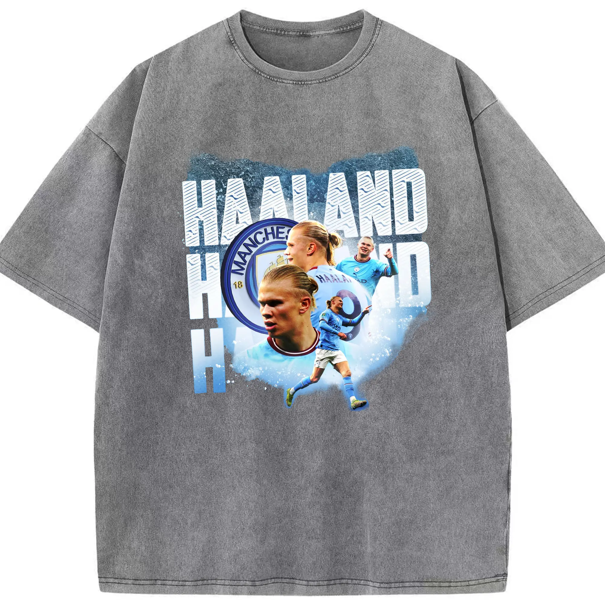 Erling Haaland Manchester City Soccer Star Collage DIY Shirt - Washed Vintage Look 230g Cotton Oversized T-Shirt With Front Heat Transfer Print – Soft, Lightweight, Stylish Fit – Comfortable Casual Wear For Sports & Everyday Use