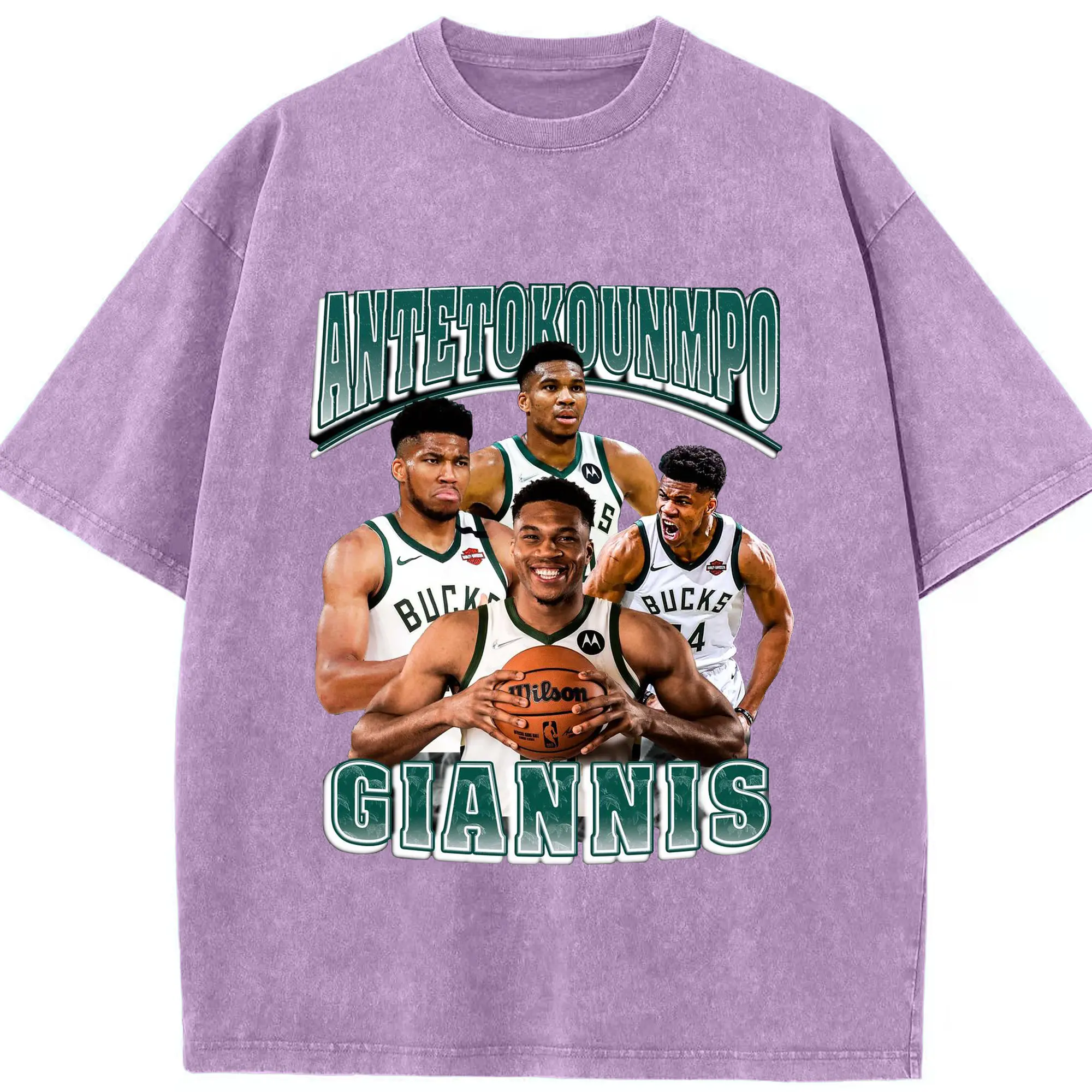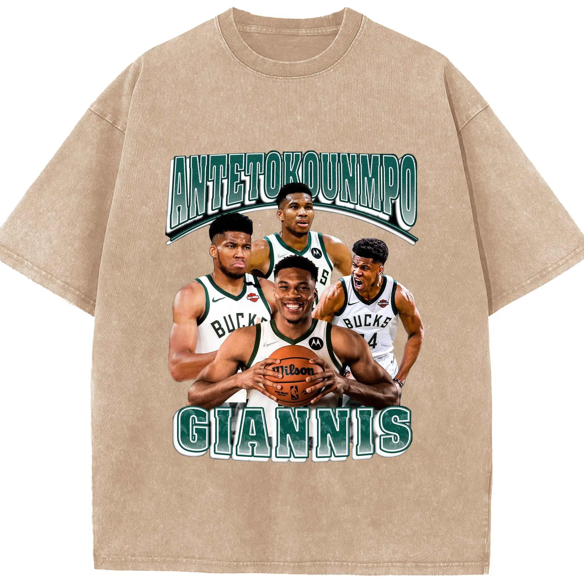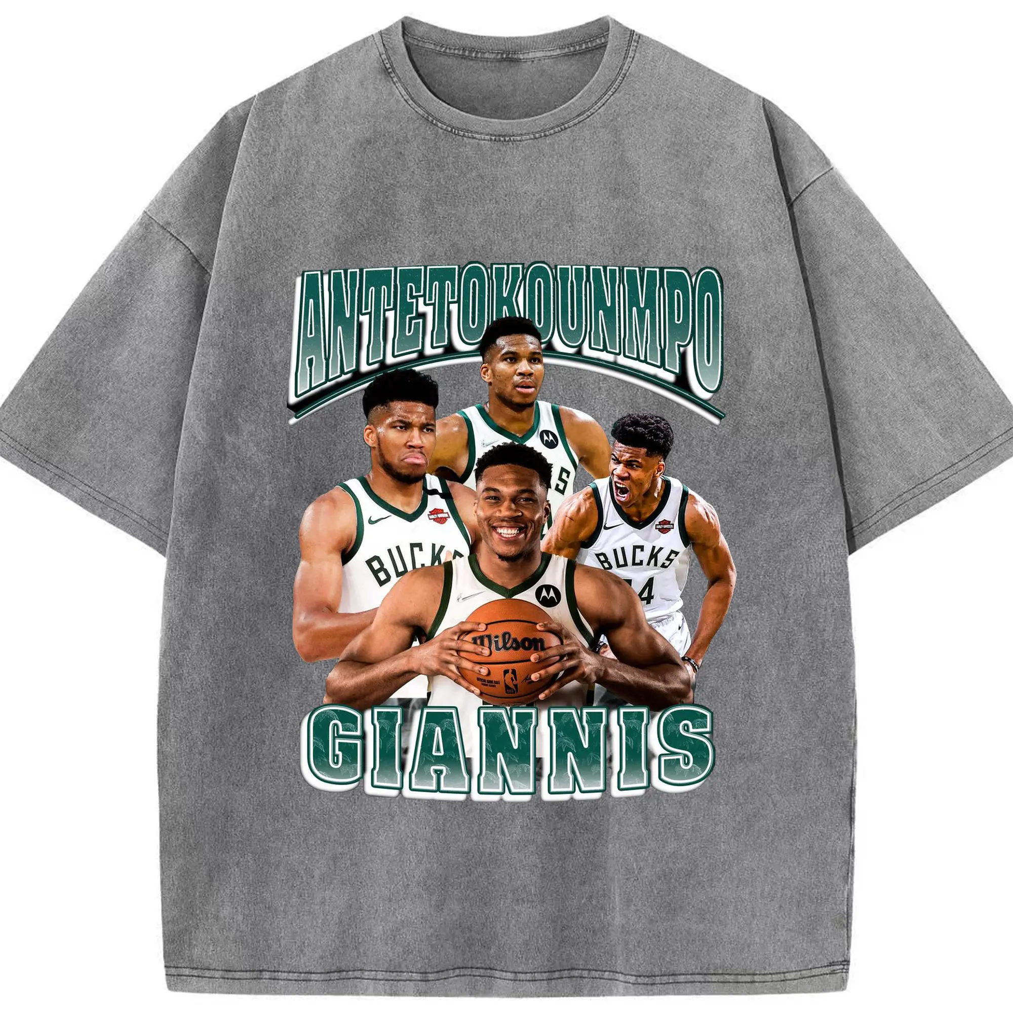 Giannis Antetokounmpo Multi-Pose Fan Shirt - Washed Vintage Look 230g Cotton Oversized T-Shirt With Front Heat Transfer Print – Soft, Lightweight, Stylish Fit – Comfortable Casual Wear For Sports & Everyday Use