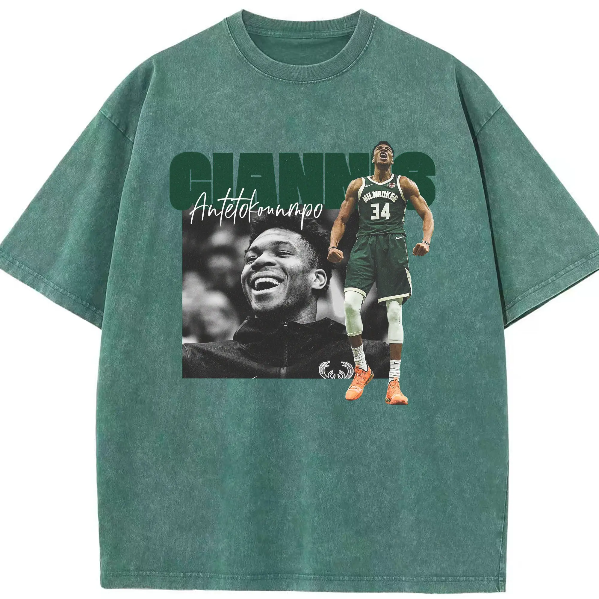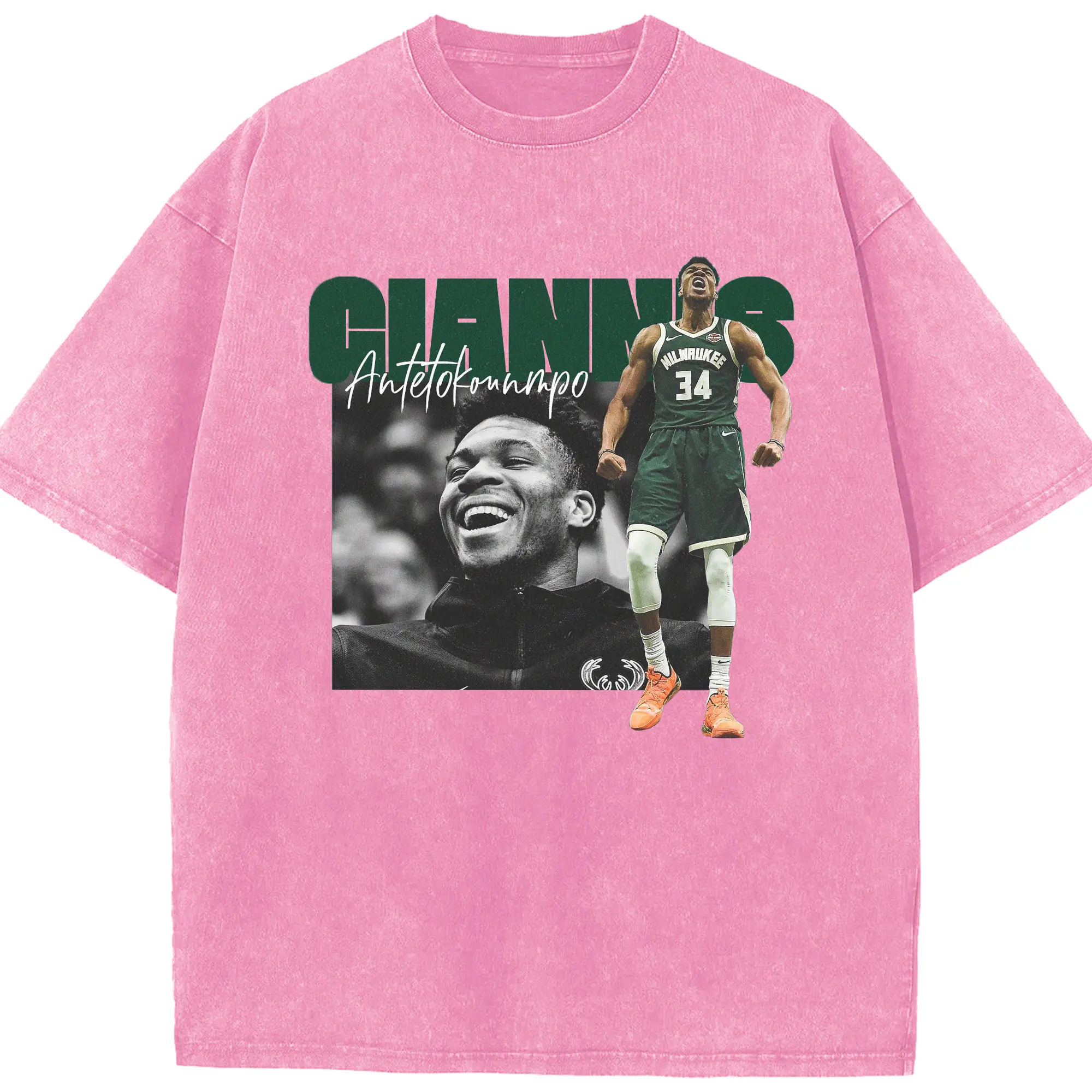 Giannis Antetokounmpo raises his arms to vent - Washed Vintage Look 230g Cotton Oversized T-Shirt With Front Heat Transfer Print – Soft, Lightweight, Stylish Fit – Comfortable Casual Wear For Sports & Everyday Use