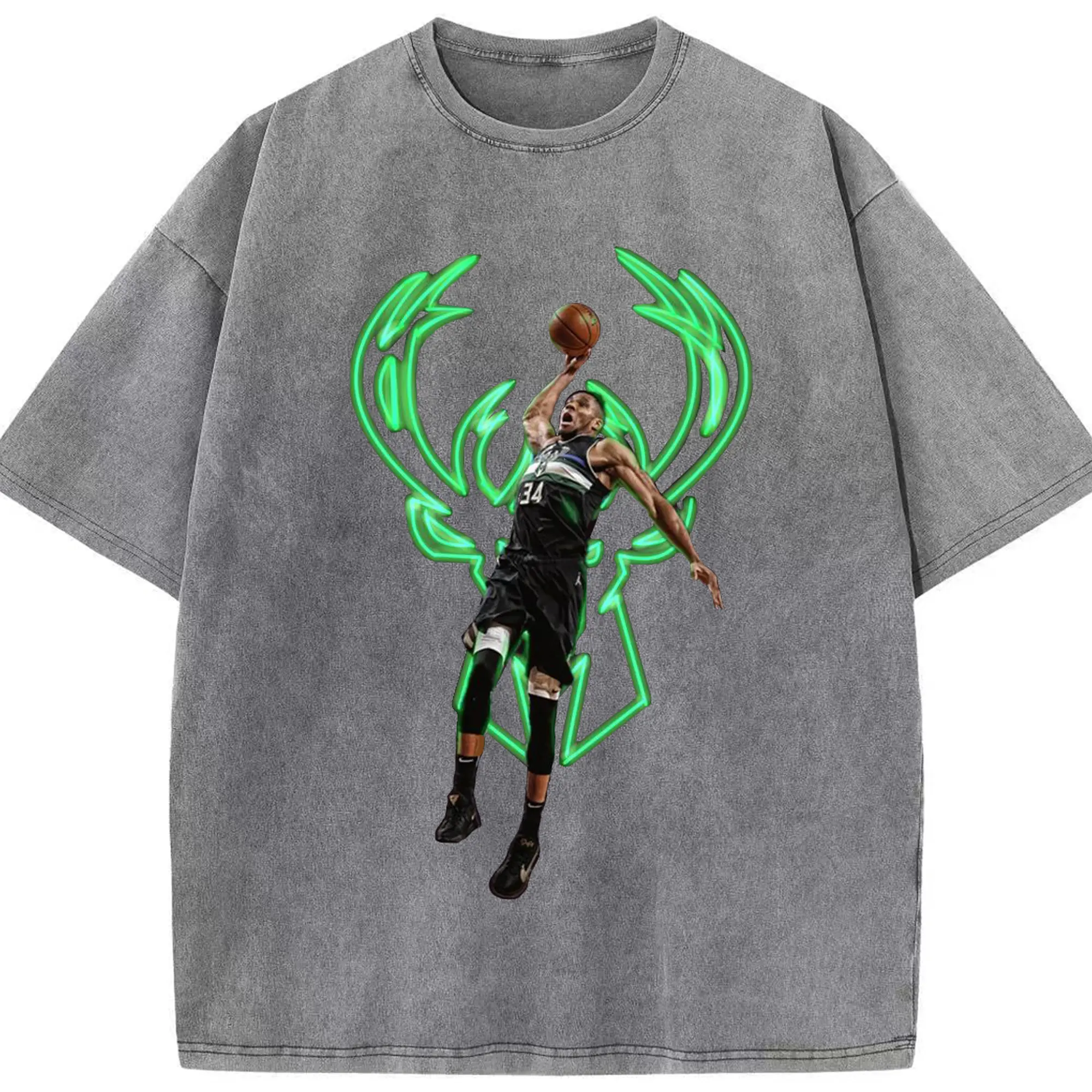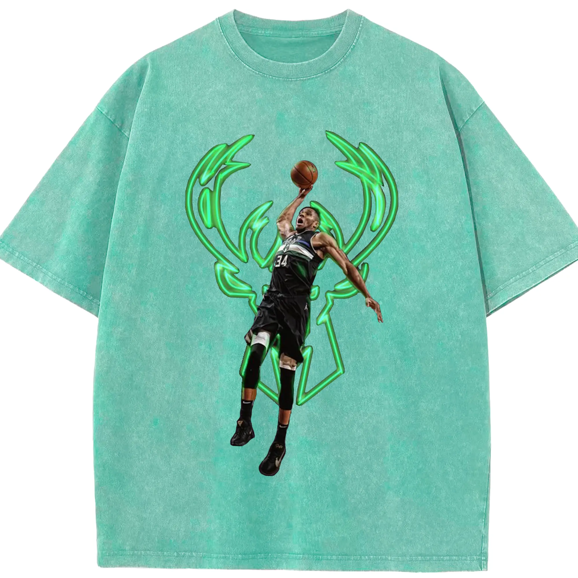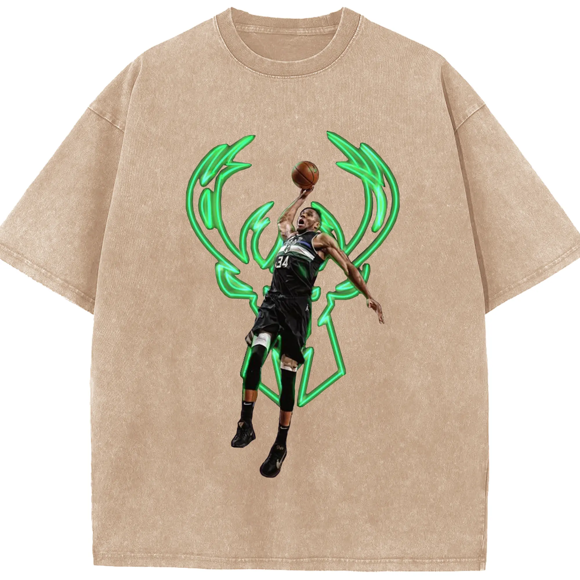 Giannis Antetokounmpo's slam dunk - Washed Vintage Look 230g Cotton Oversized T-Shirt With Front Heat Transfer Print – Soft, Lightweight, Stylish Fit – Comfortable Casual Wear For Sports & Everyday Use