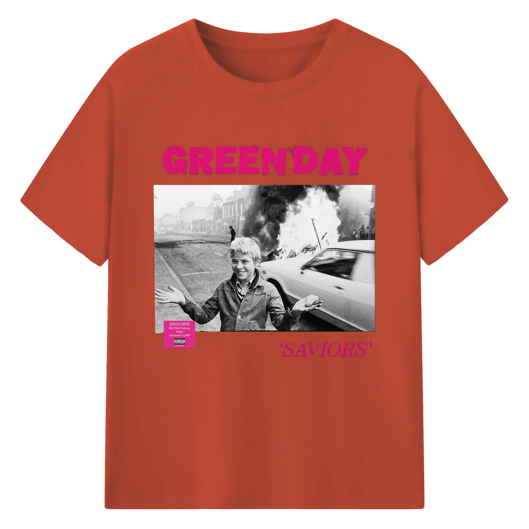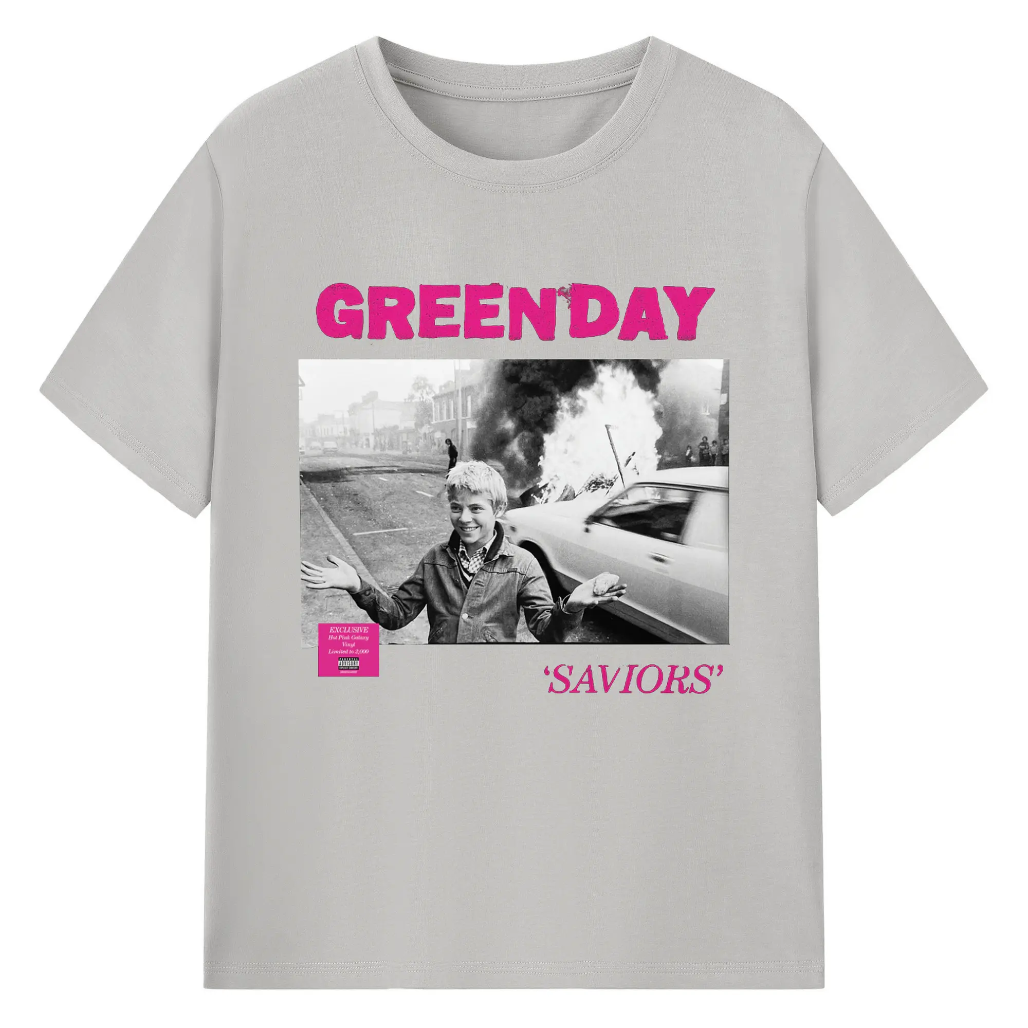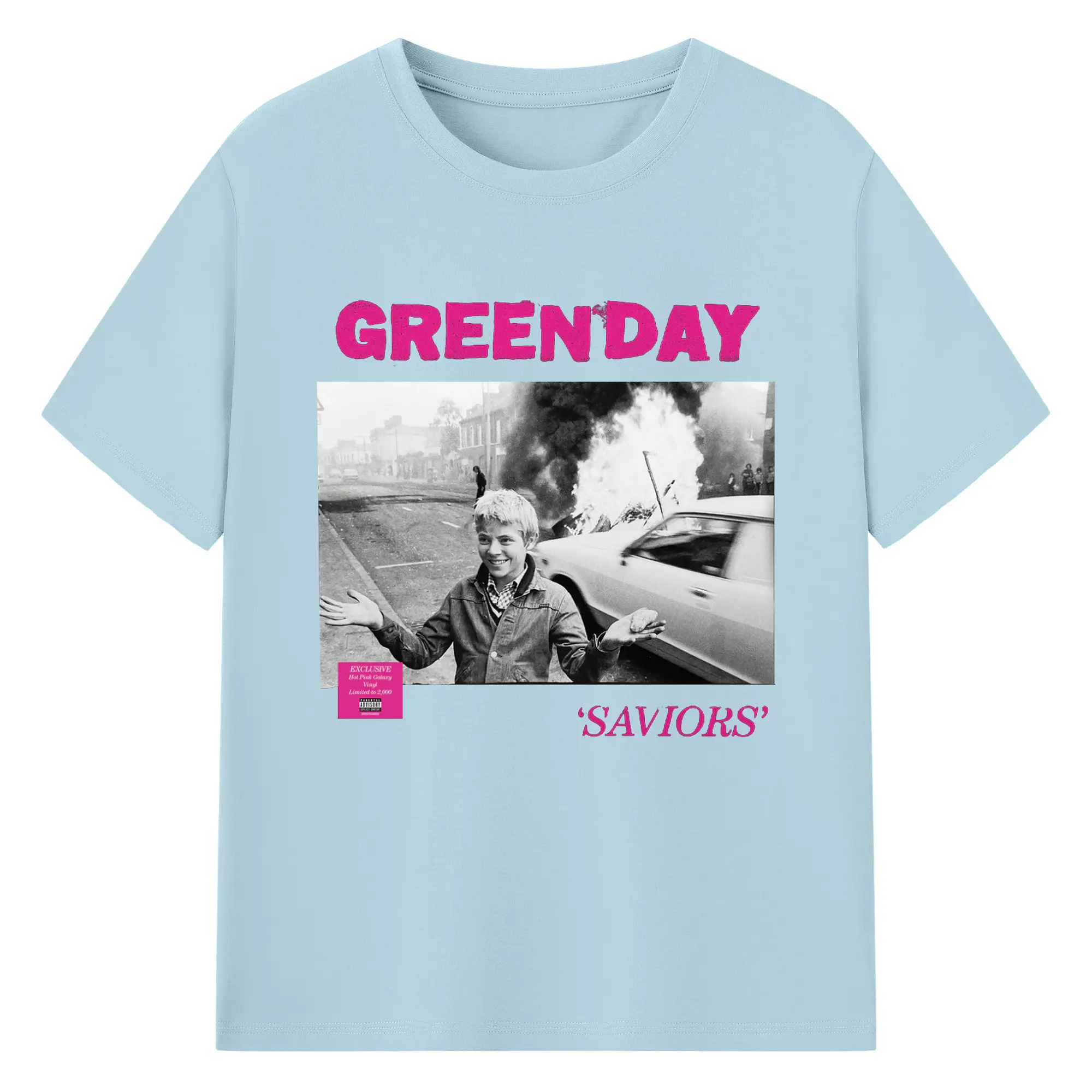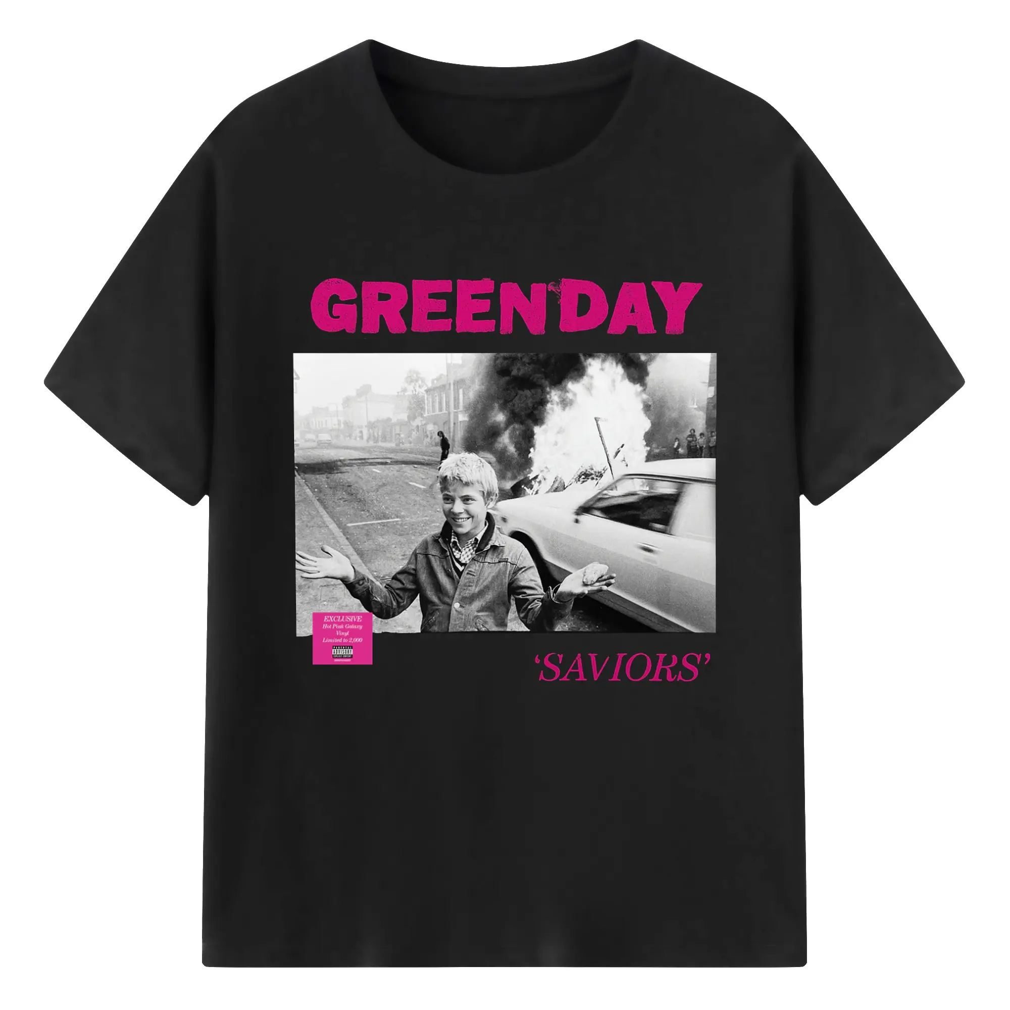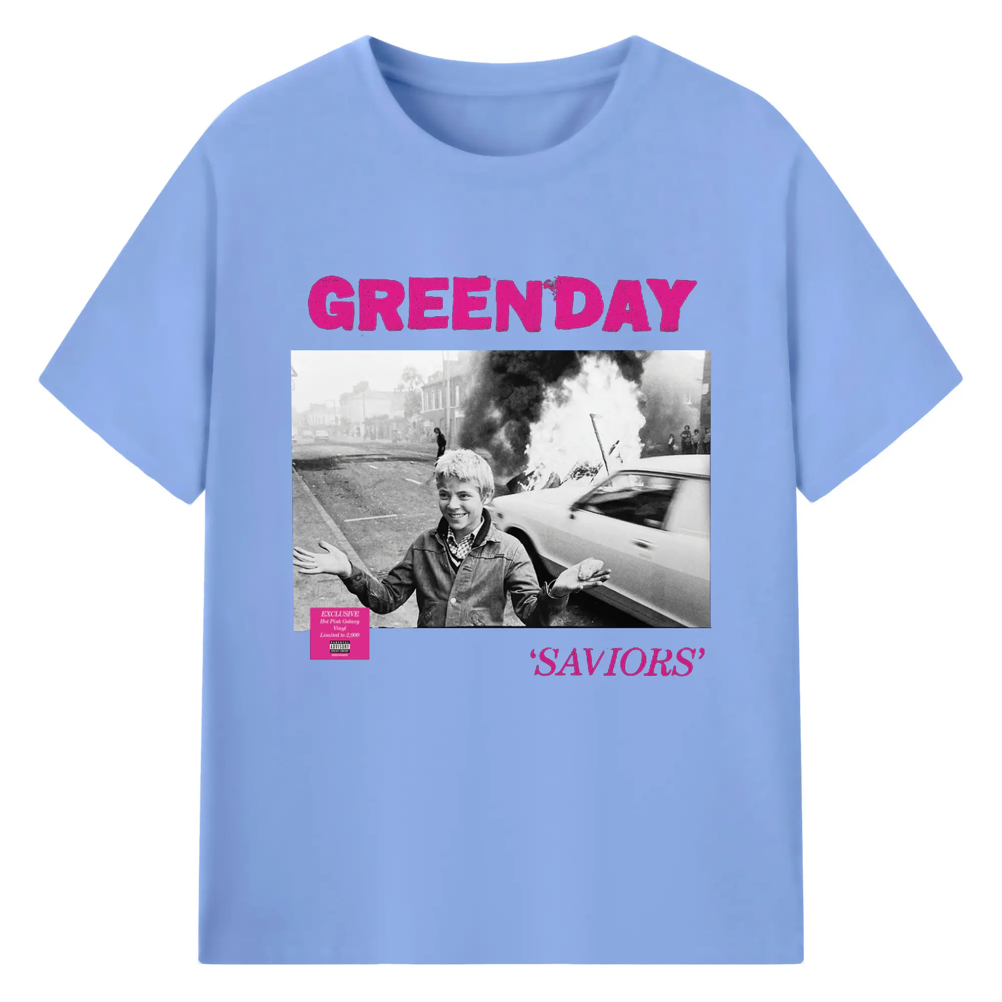 Green Day《Saviors》Punk Rock DIY Shirt - 180g Cotton T-Shirt With Front Heat Transfer Print – Soft, Lightweight, Fitted Design – Comfortable Casual Wear For Sports & Everyday Use