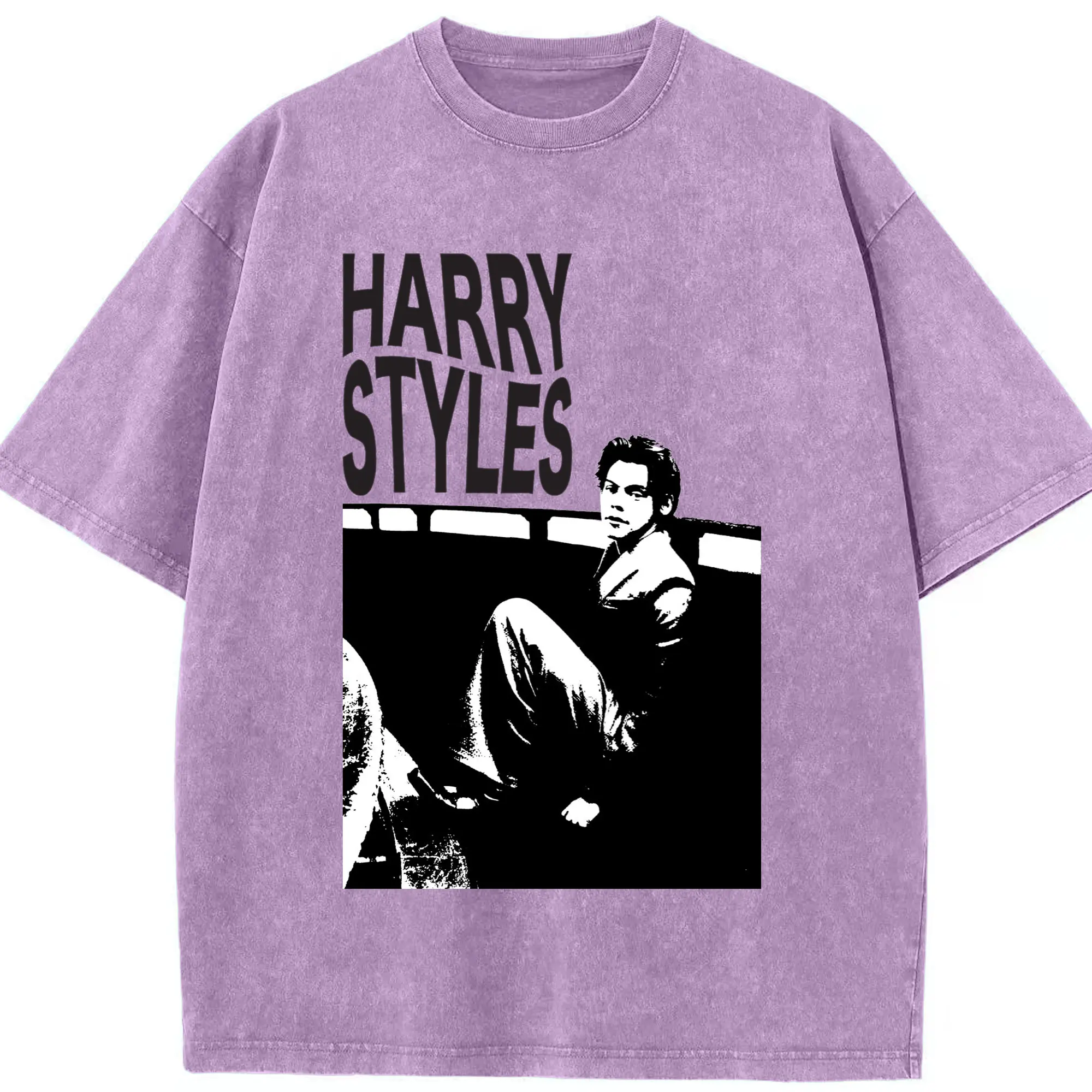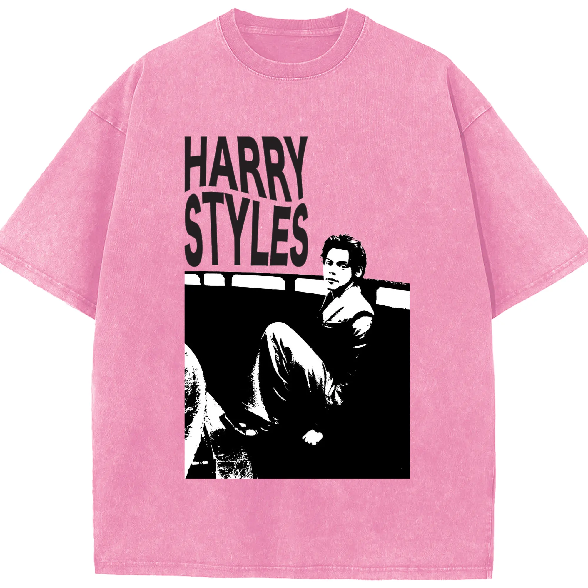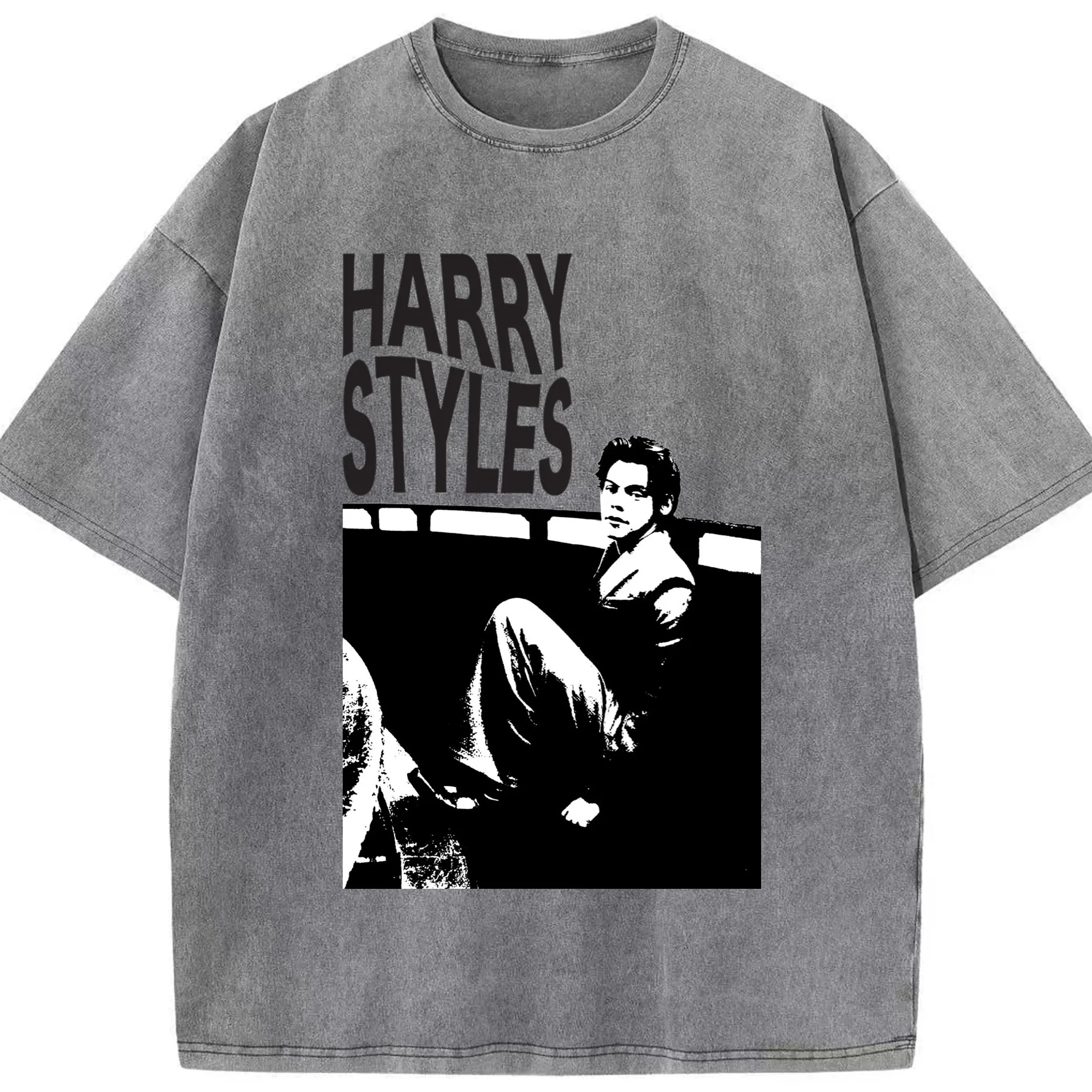 Harry Styles Black And White Retro Art Style DIY - Washed Vintage Look 230g Cotton Oversized T-Shirt With Front Heat Transfer Print – Soft, Lightweight, Stylish Fit – Comfortable Casual Wear For Sports & Everyday Use