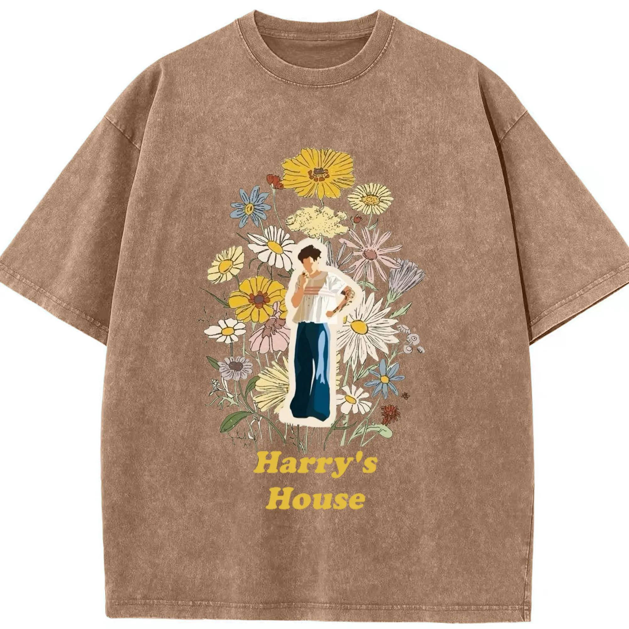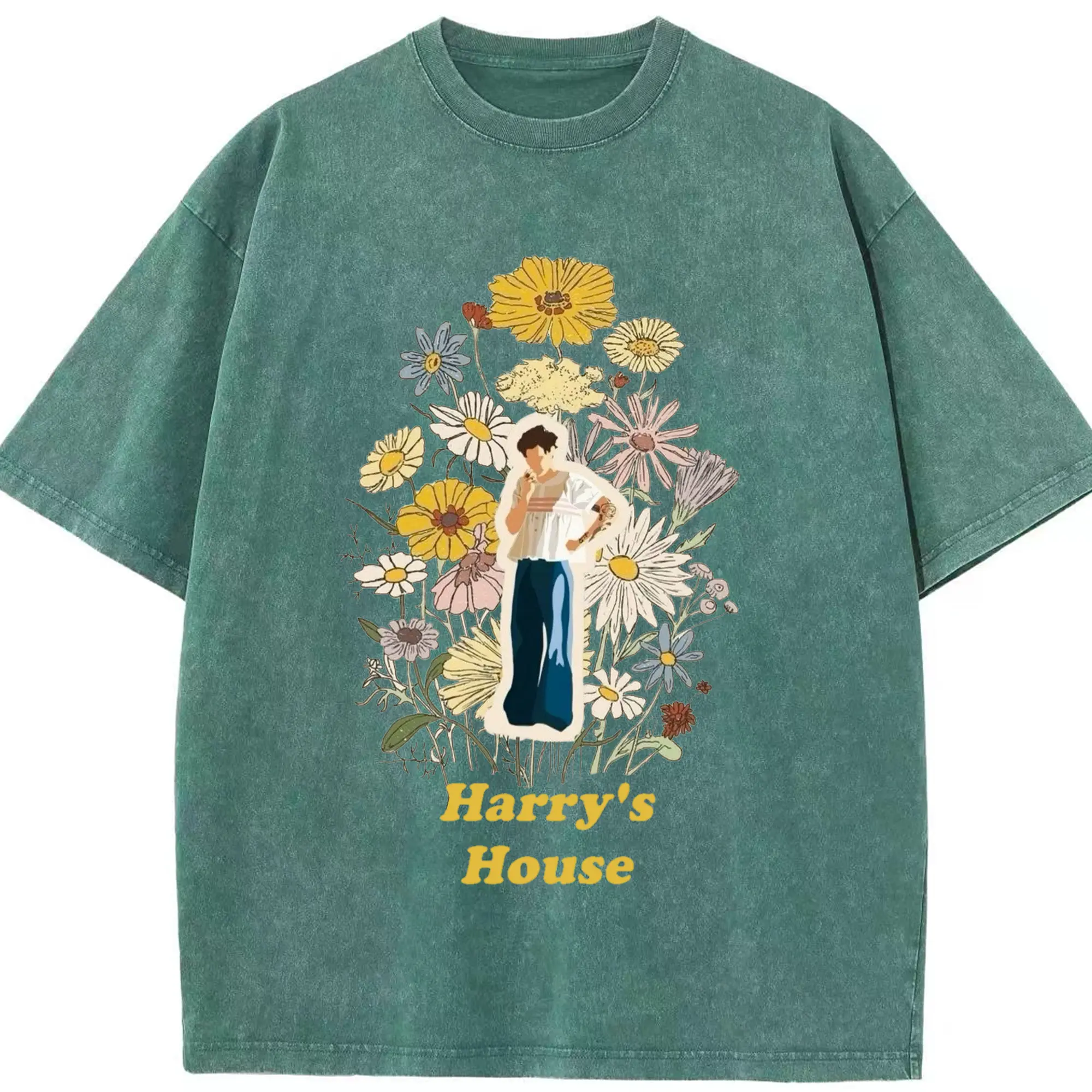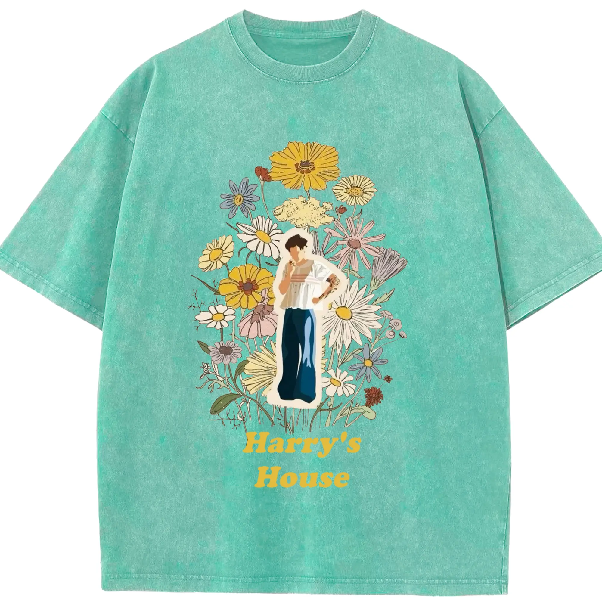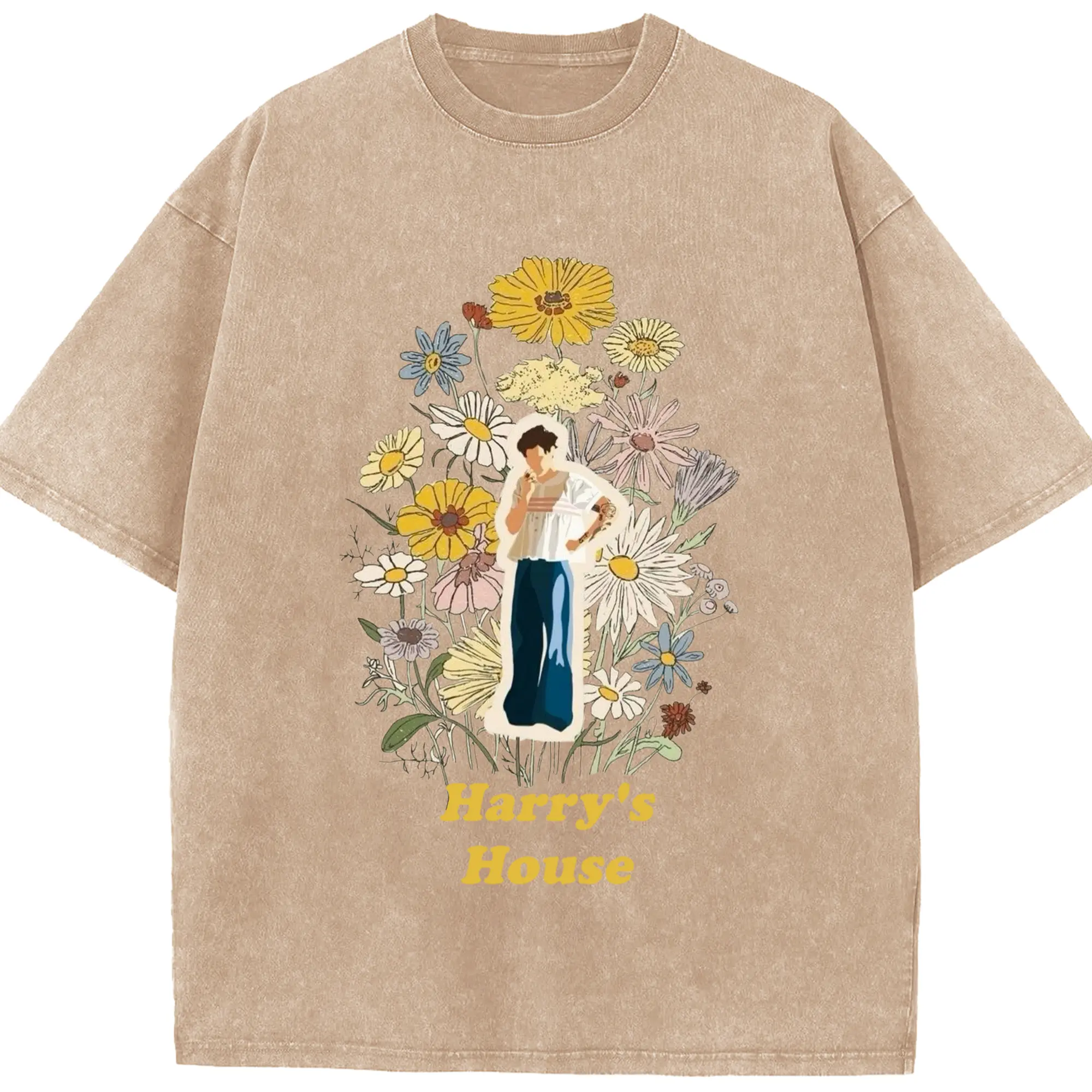 Harry Styles Harry's House Retro Floral DIY - Washed Vintage Look 230g Cotton Oversized T-Shirt With Front Heat Transfer Print – Soft, Lightweight, Stylish Fit – Comfortable Casual Wear For Sports & Everyday Use