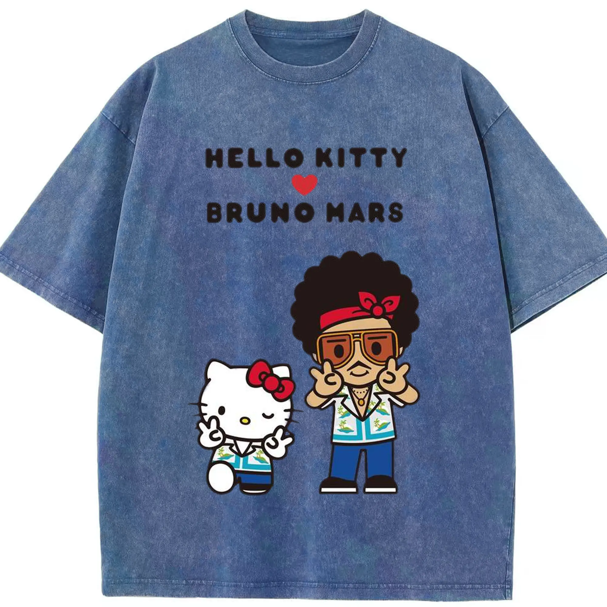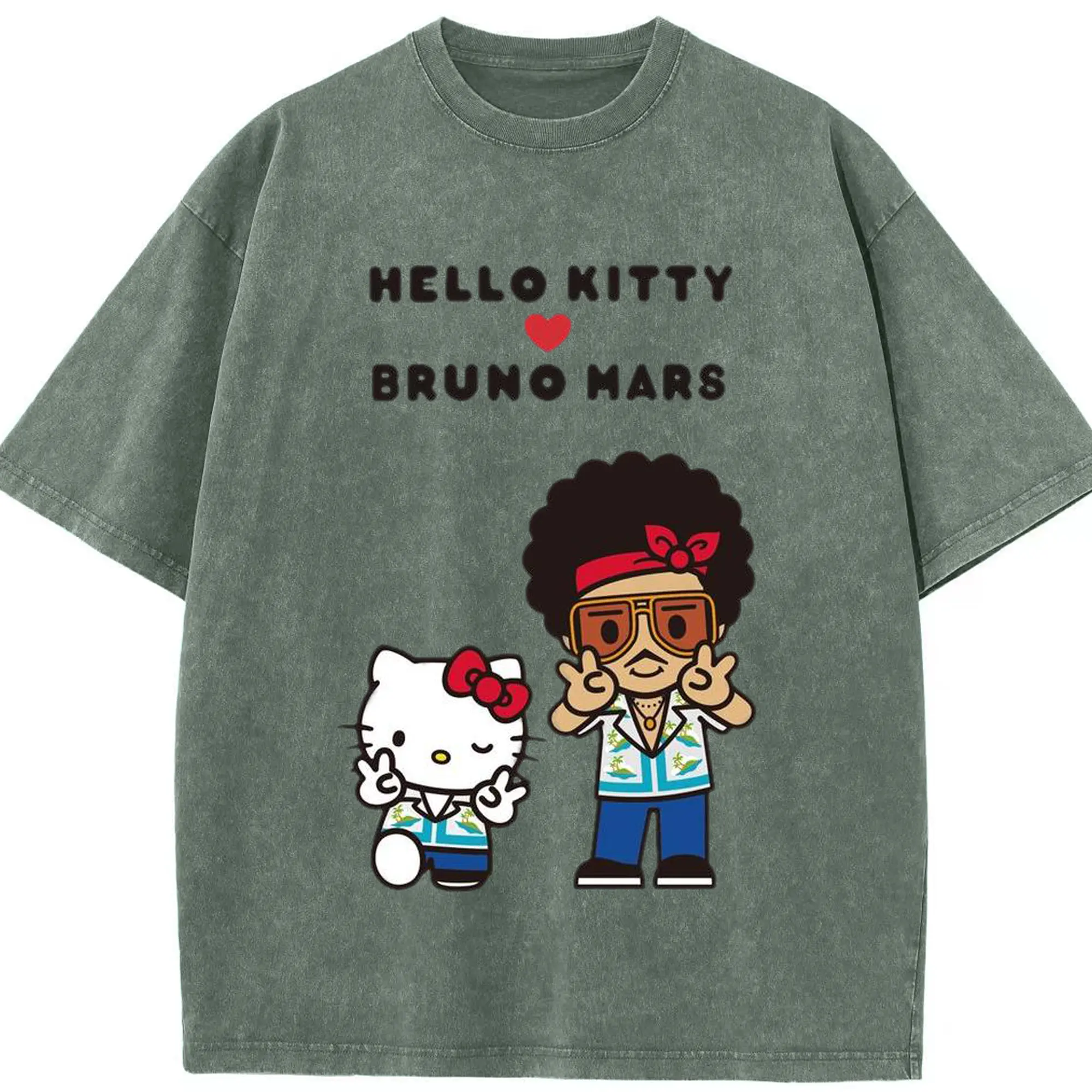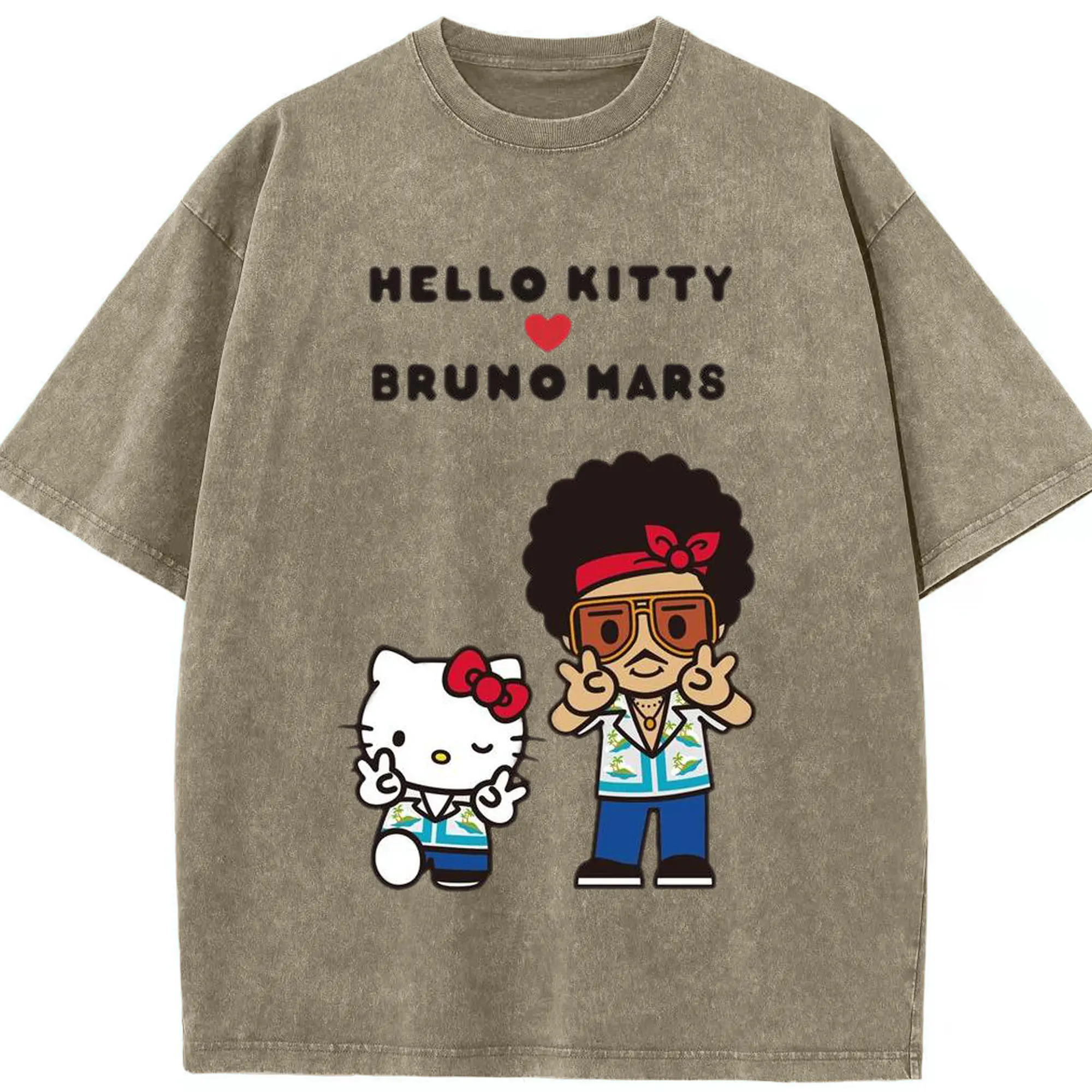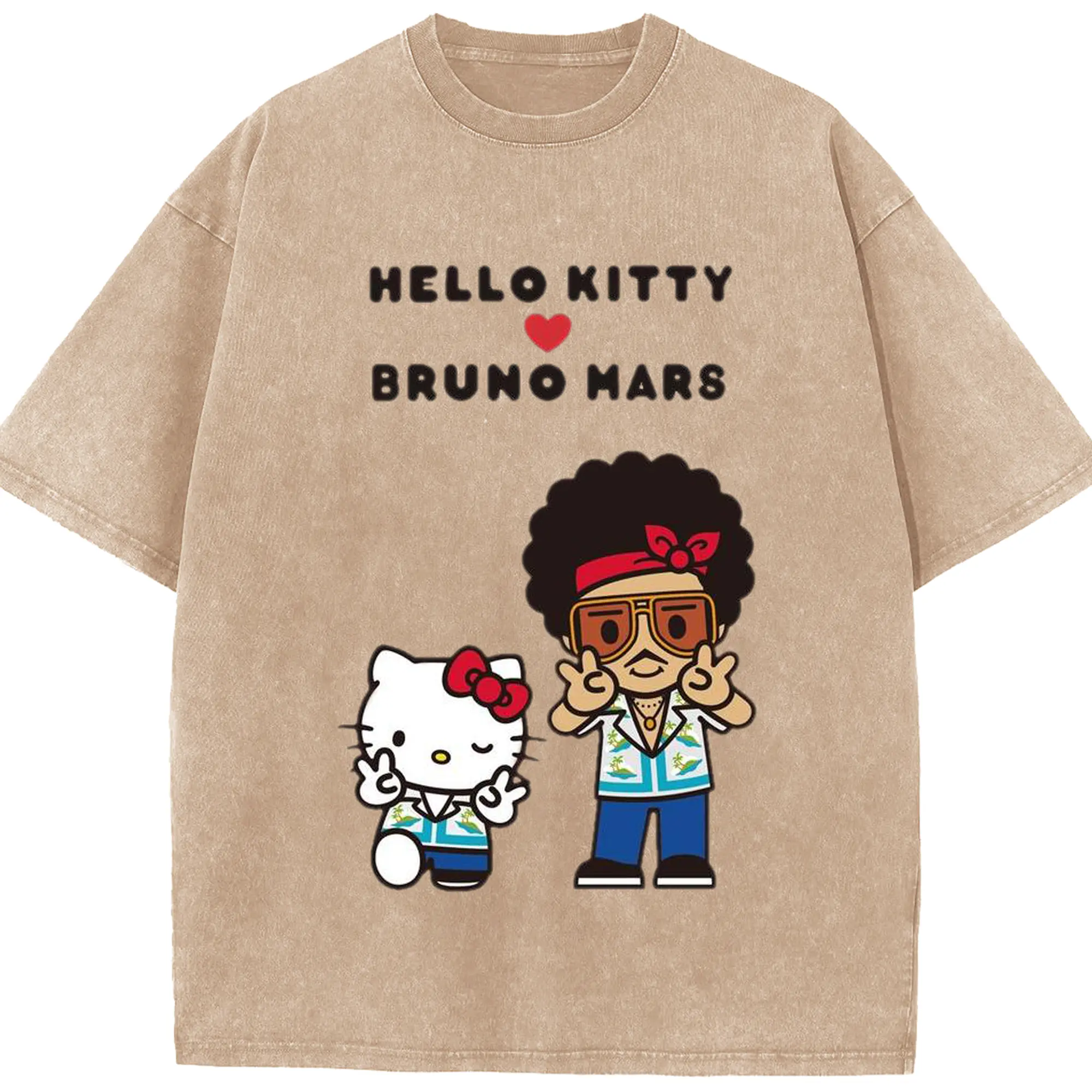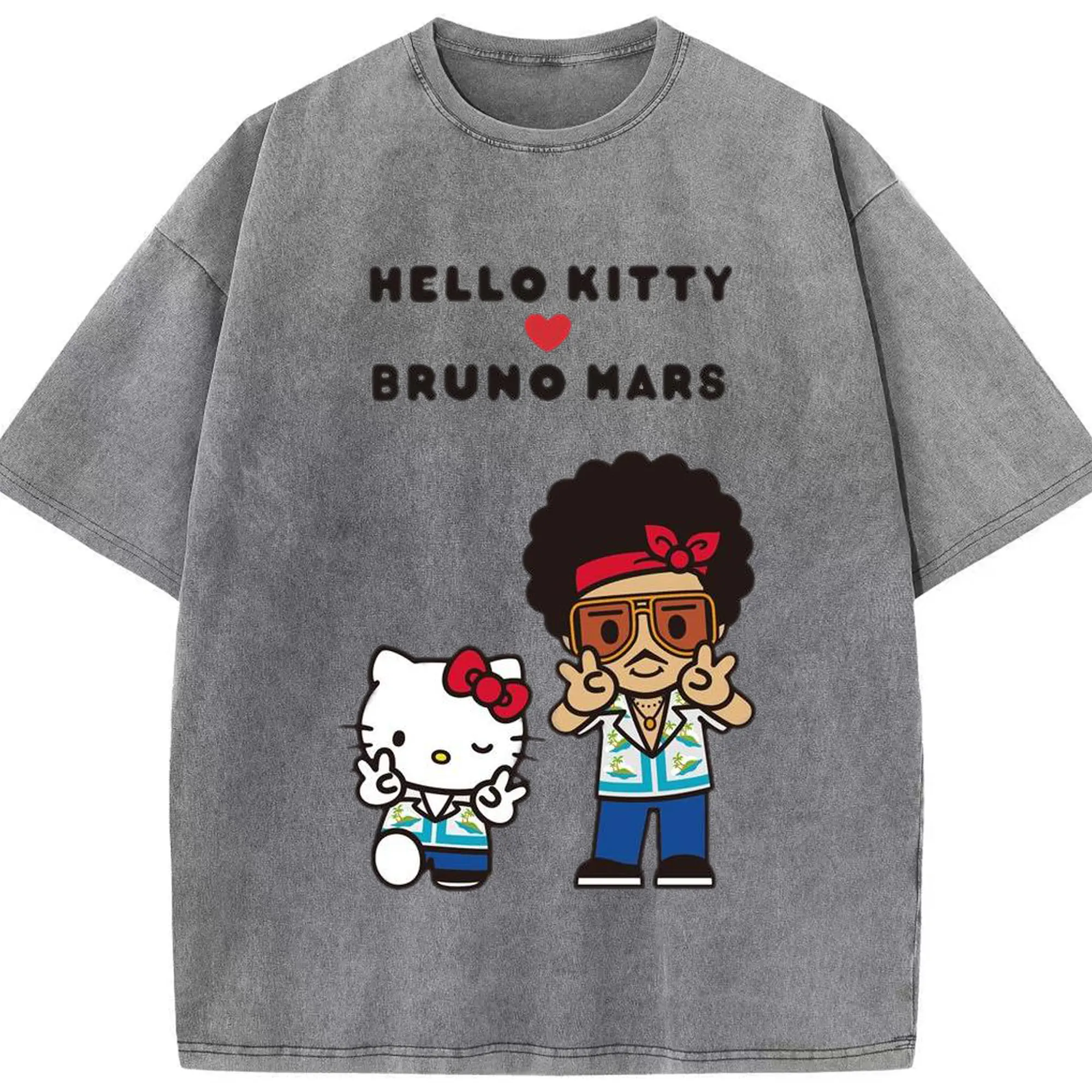 “Hello Kitty Loves Bruno Mars” Cartoon Music DIY Shirt - Washed Vintage Look 230g Cotton Oversized T-Shirt With Front Heat Transfer Print – Soft, Lightweight, Stylish Fit – Comfortable Casual Wear For Sports & Everyday Use
