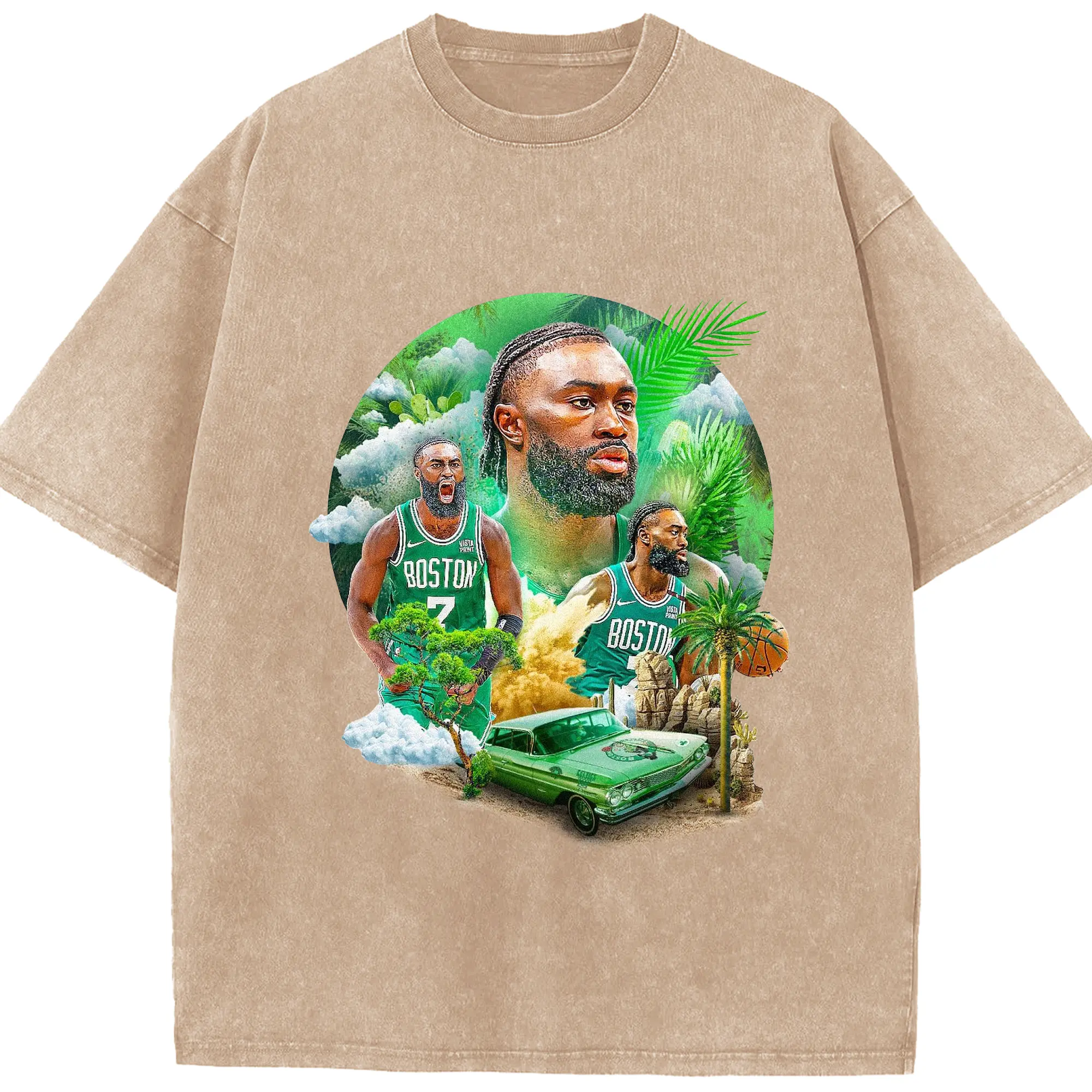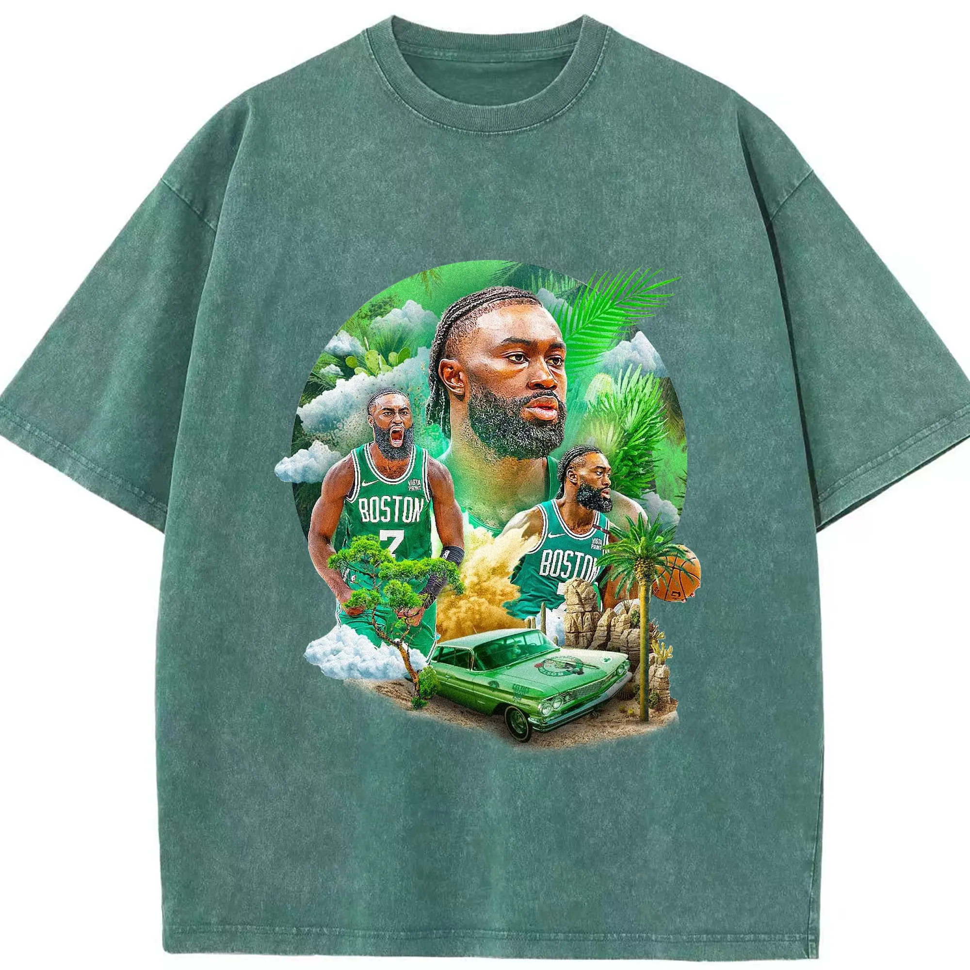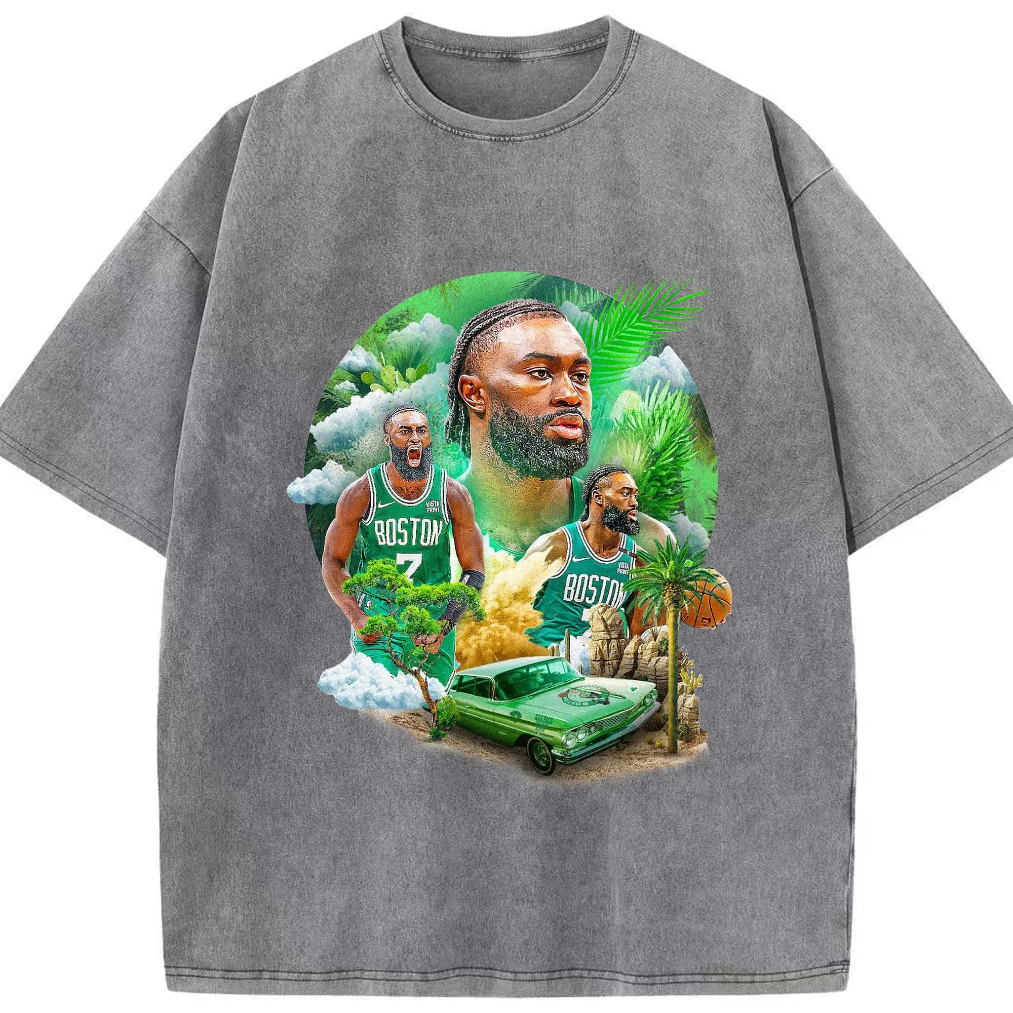 “Island of Green” Jaylen Brown Fantasy Shirt - Washed Vintage Look 230g Cotton Oversized T-Shirt With Front Heat Transfer Print – Soft, Lightweight, Stylish Fit – Comfortable Casual Wear For Sports & Everyday Use