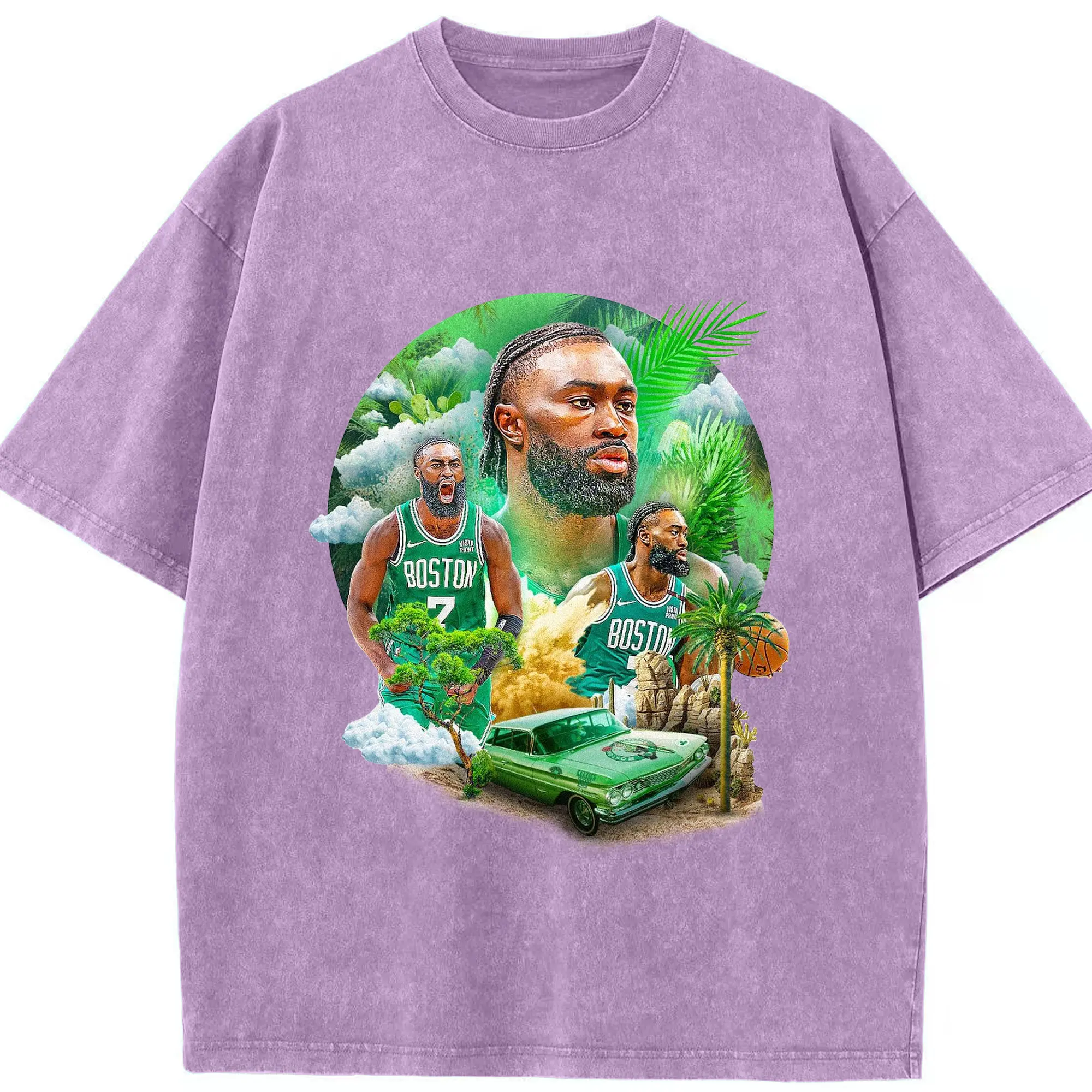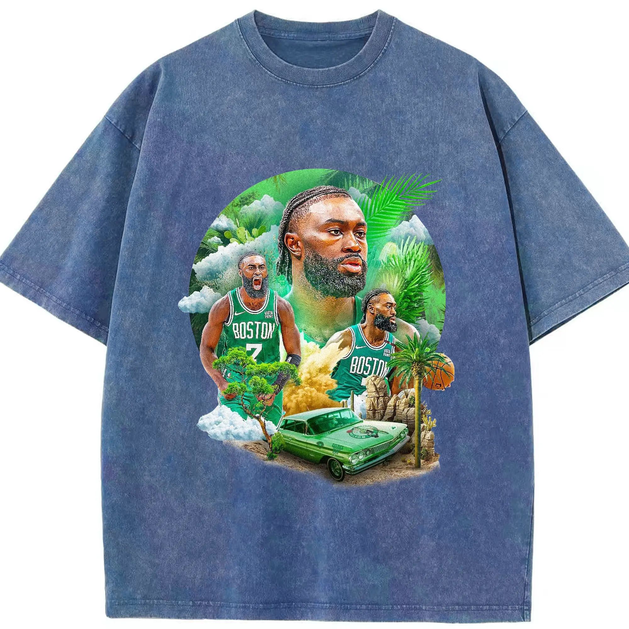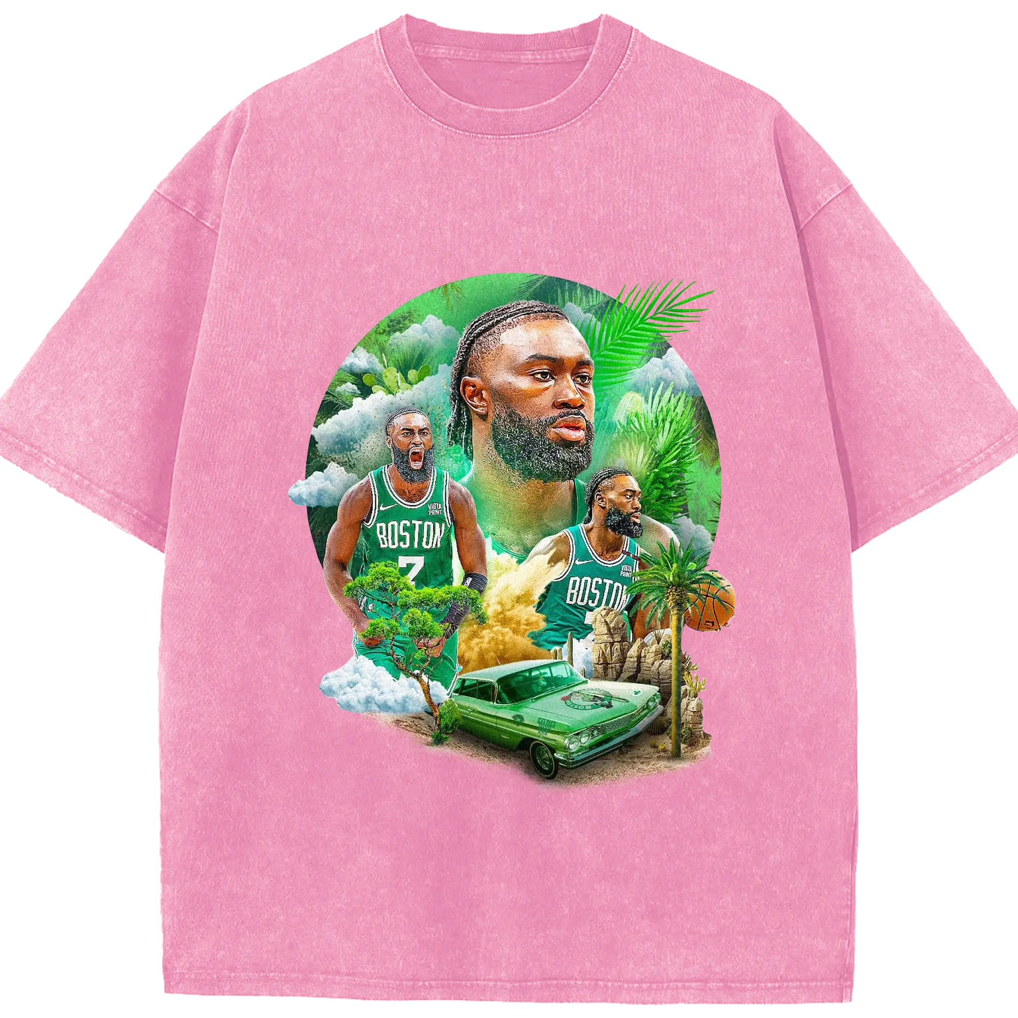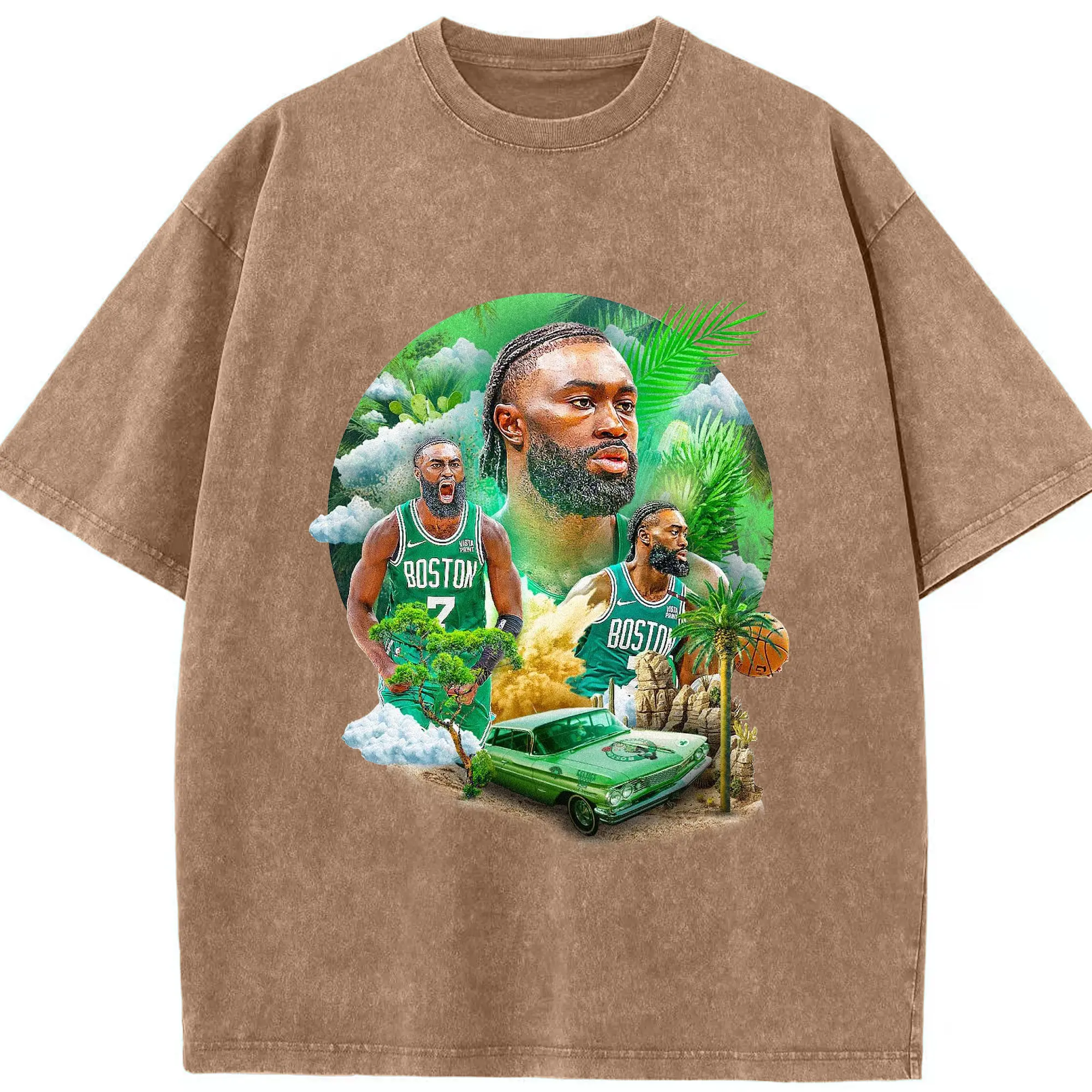 “Island of Green” Jaylen Brown Fantasy Shirt - Washed Vintage Look 230g Cotton Oversized T-Shirt With Front Heat Transfer Print – Soft, Lightweight, Stylish Fit – Comfortable Casual Wear For Sports & Everyday Use