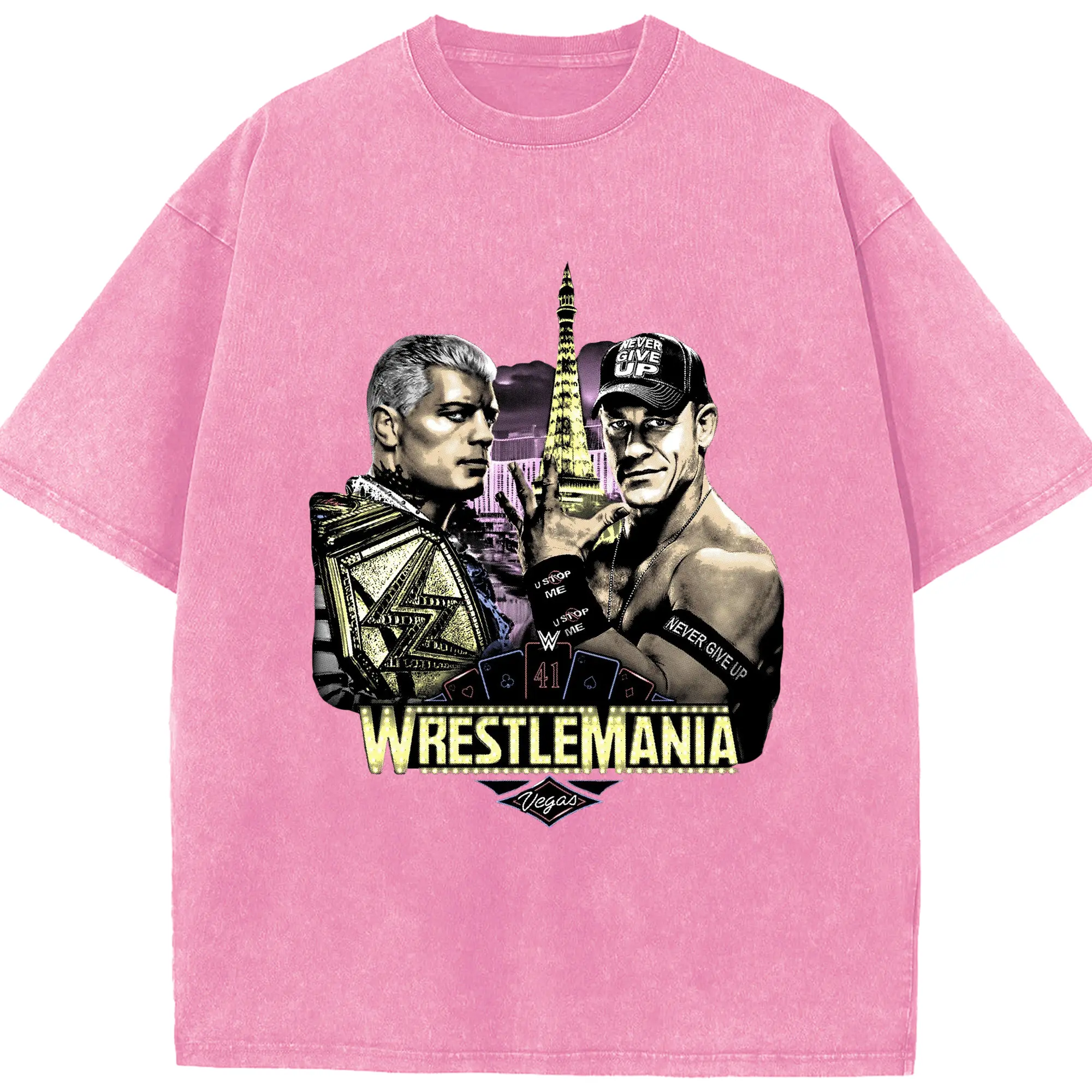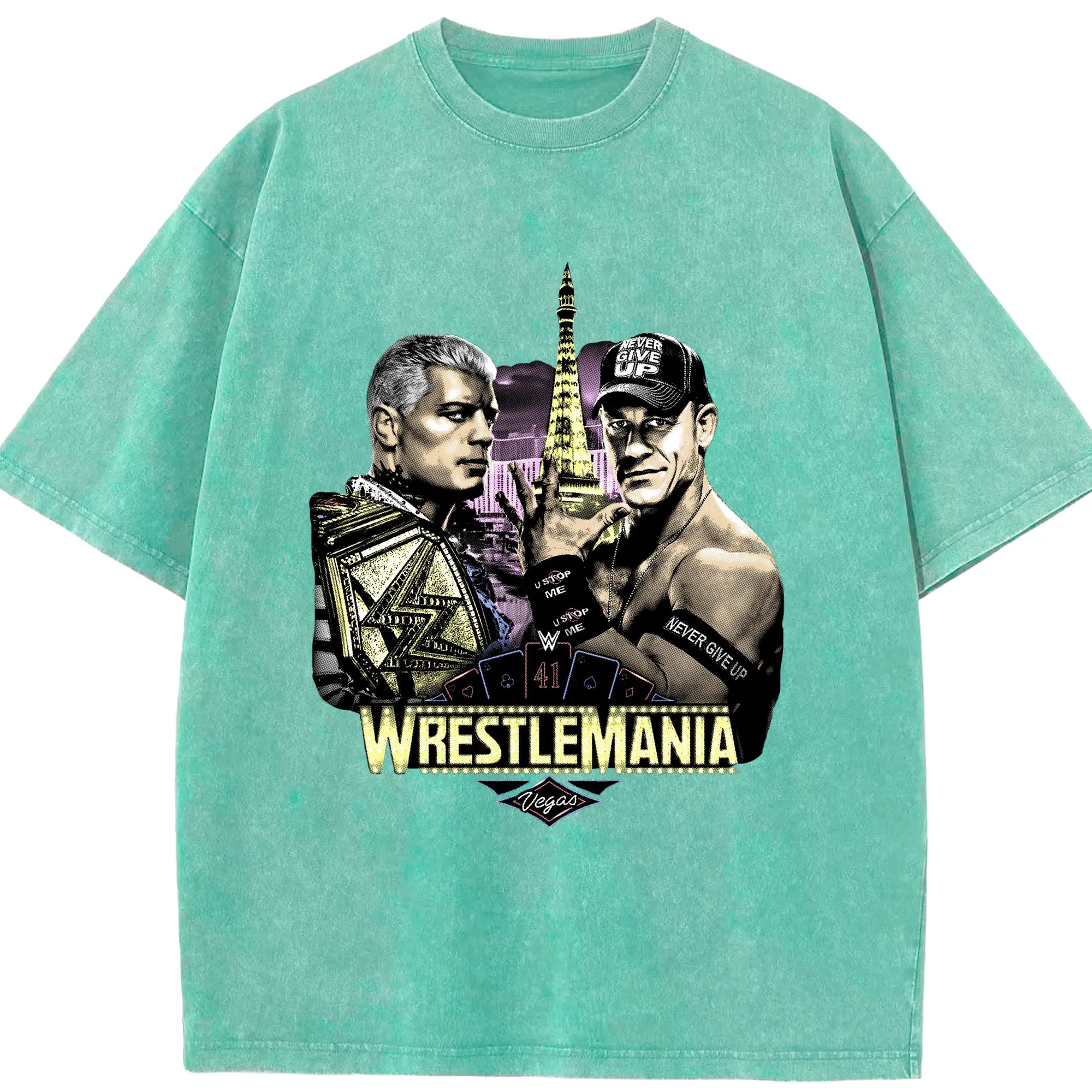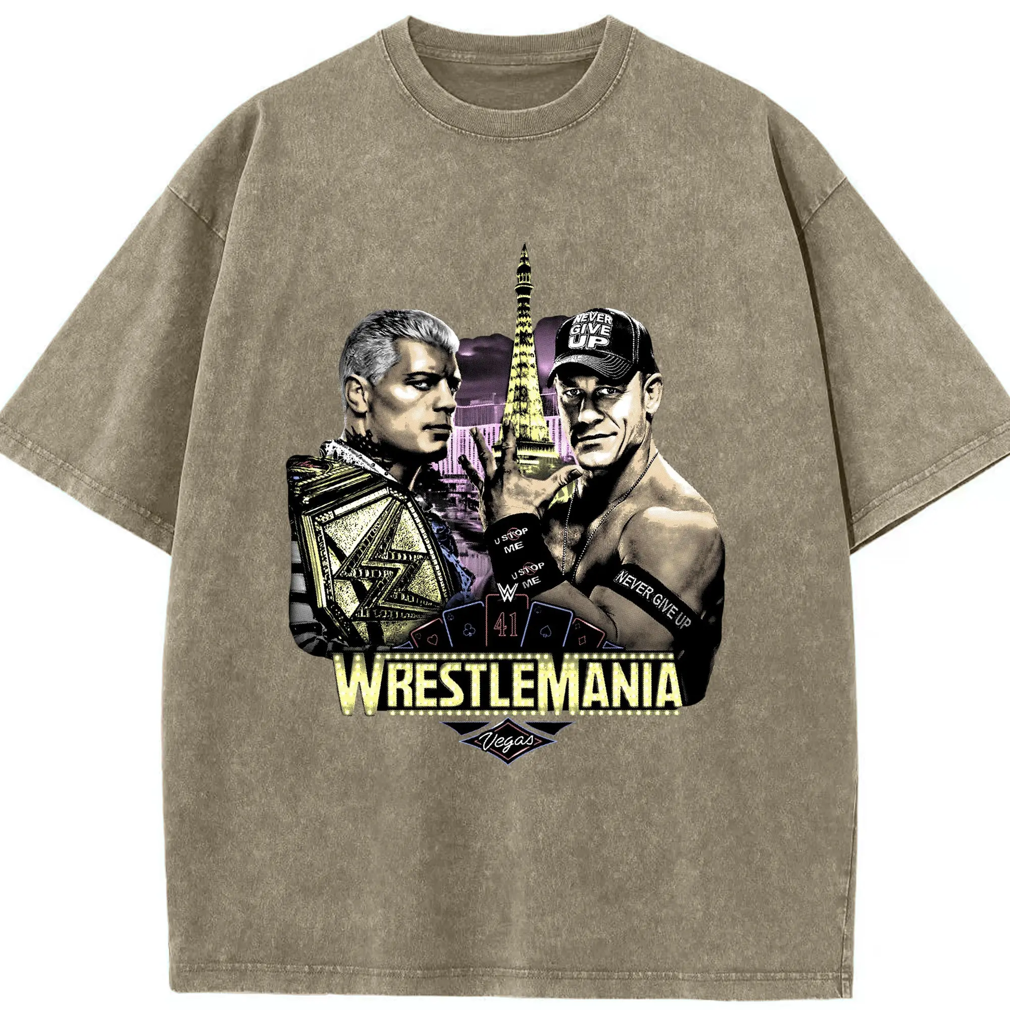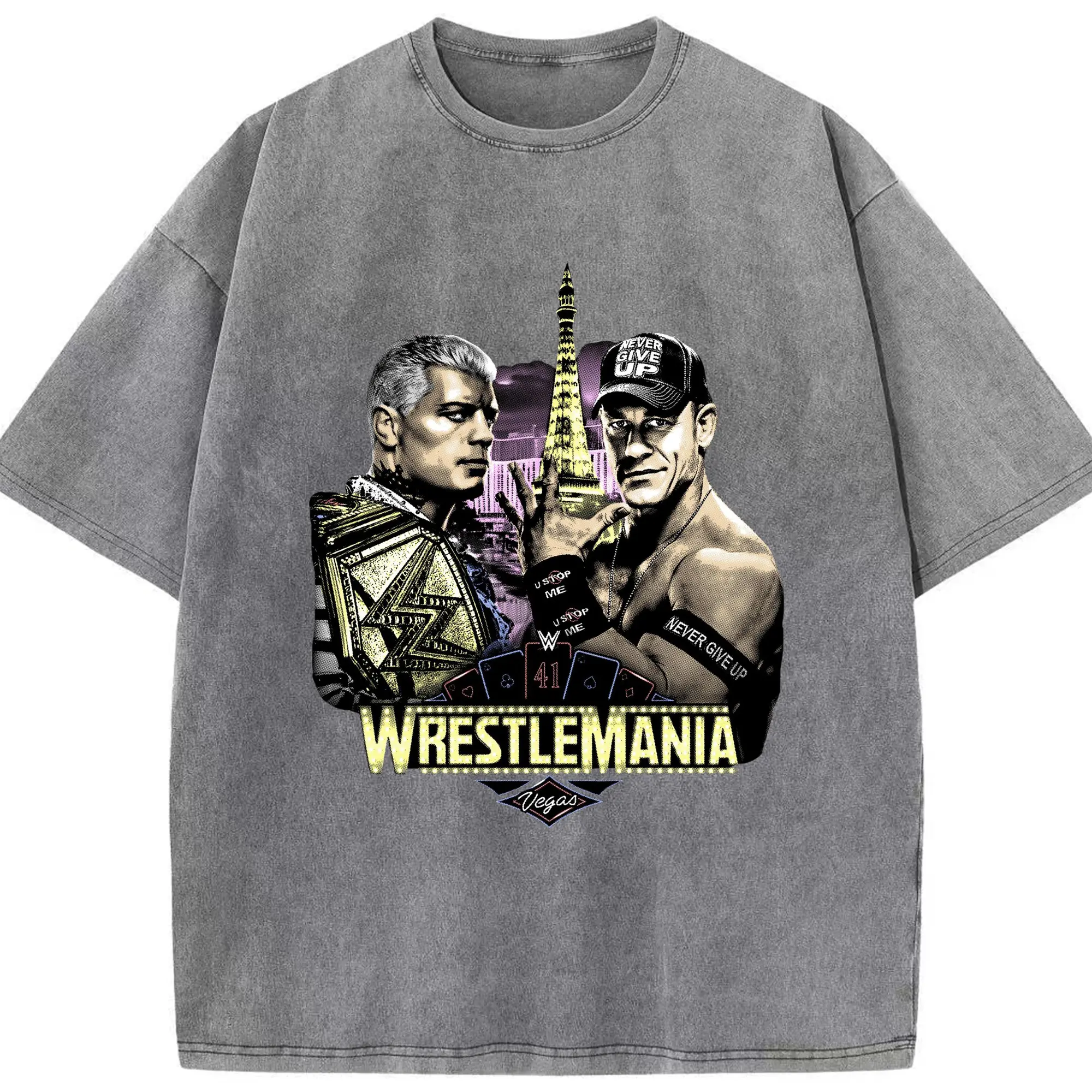 John Cena&Cody Rhodes WWE WrestleMania Las Vegas Wrestling DIY Shirt - Washed Vintage Look 230g Cotton Oversized T-Shirt With Front Heat Transfer Print – Soft, Lightweight, Stylish Fit – Comfortable Casual Wear For Sports & Everyday Use