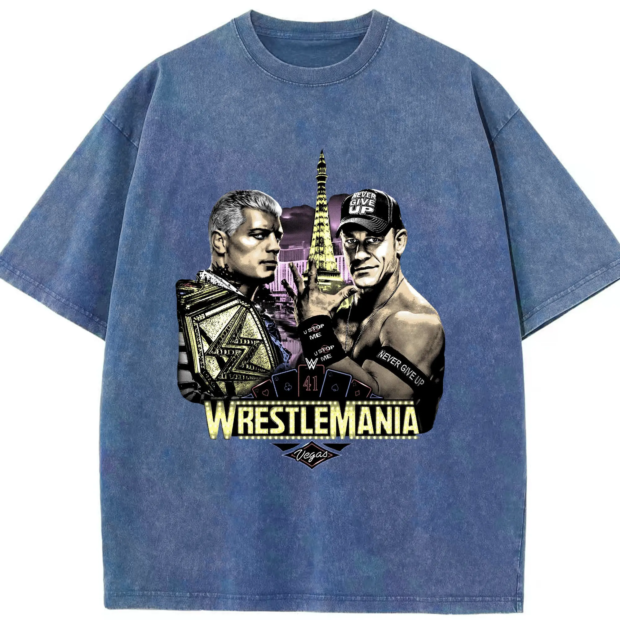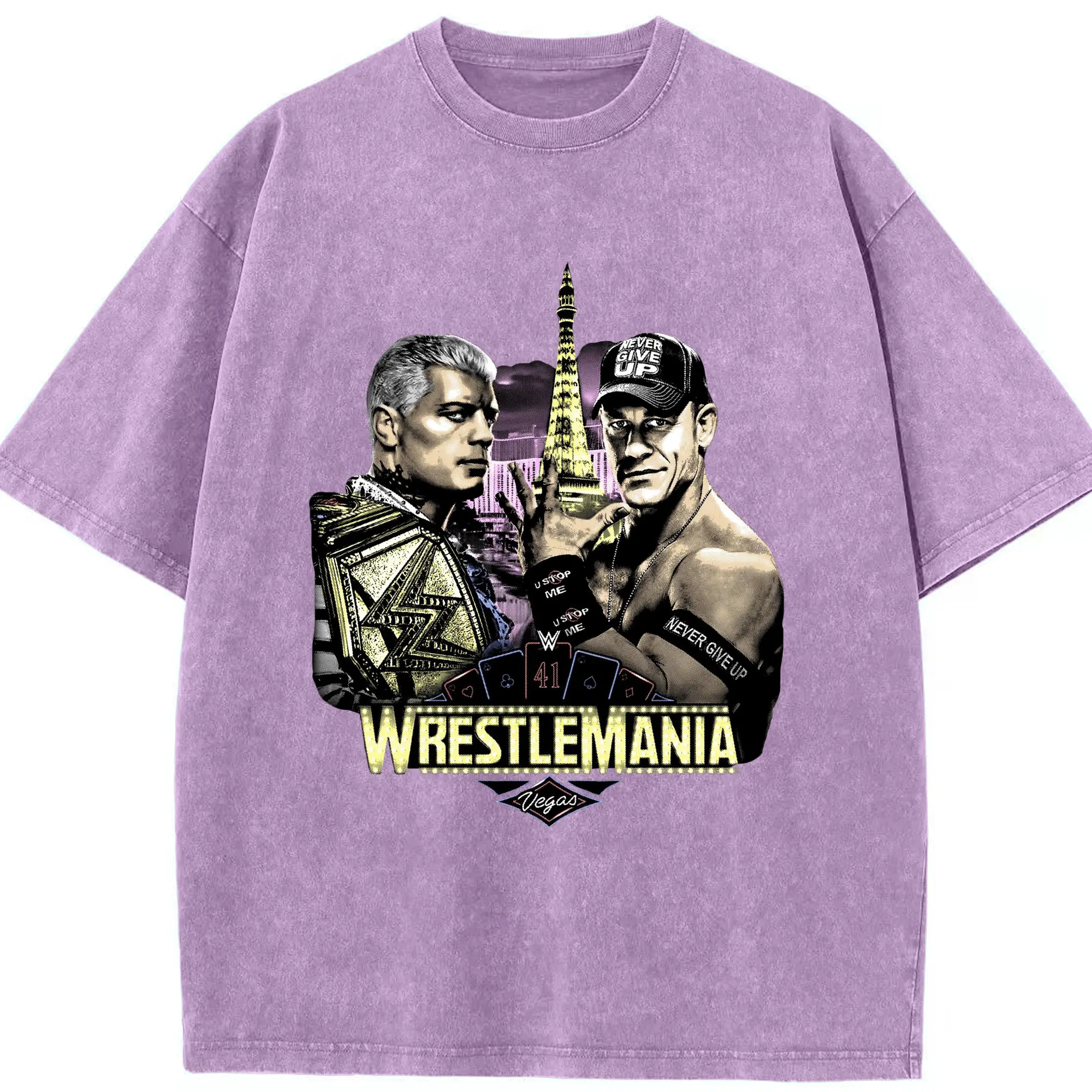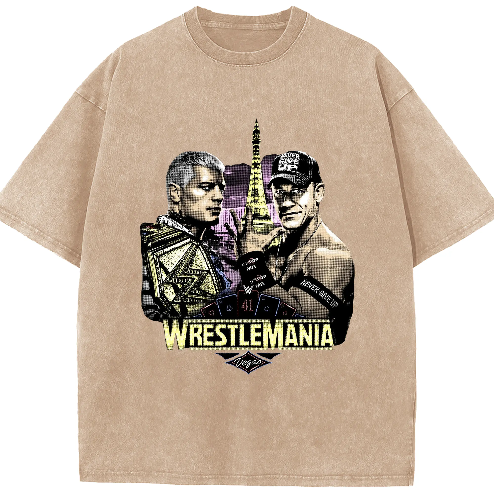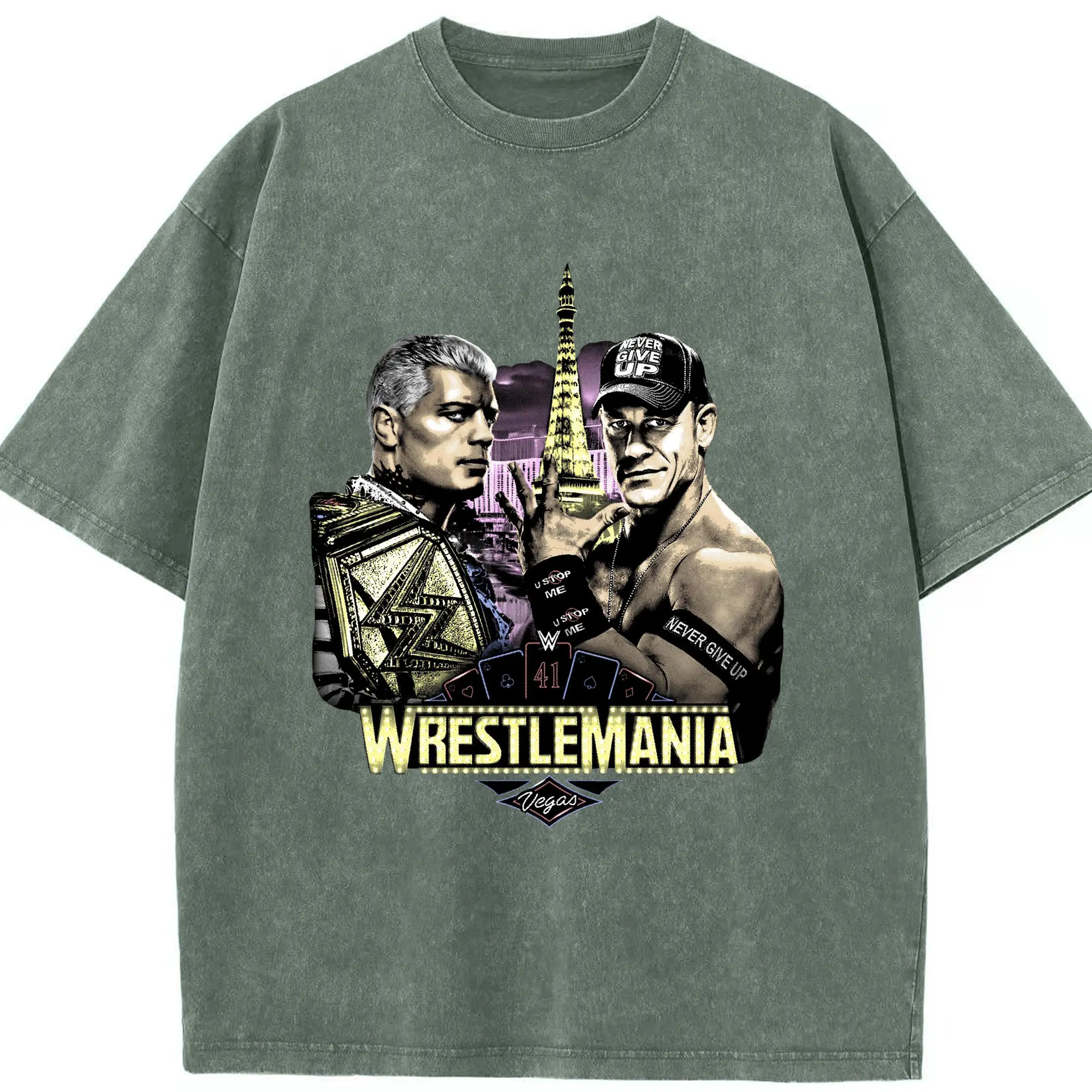 John Cena&Cody Rhodes WWE WrestleMania Las Vegas Wrestling DIY Shirt - Washed Vintage Look 230g Cotton Oversized T-Shirt With Front Heat Transfer Print – Soft, Lightweight, Stylish Fit – Comfortable Casual Wear For Sports & Everyday Use