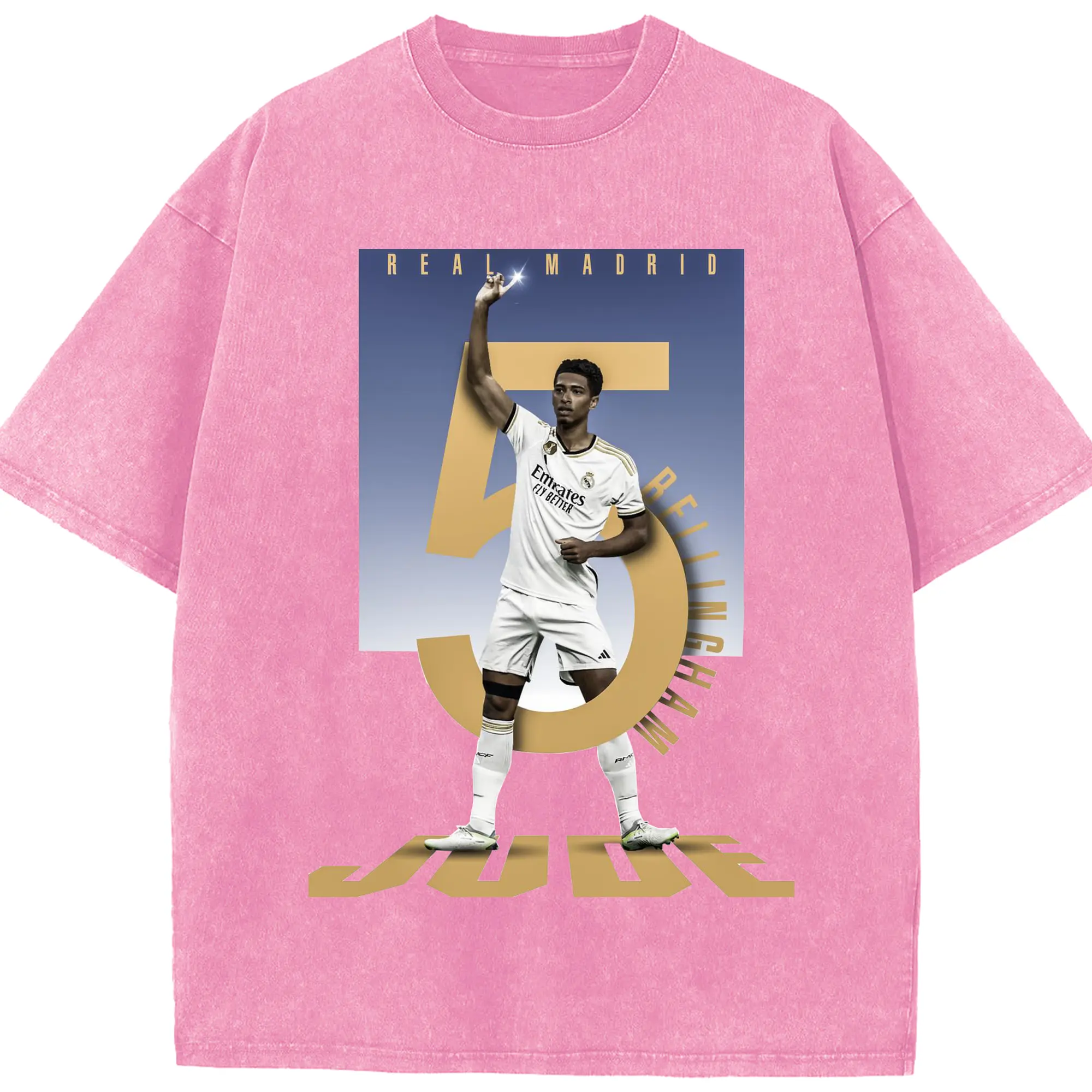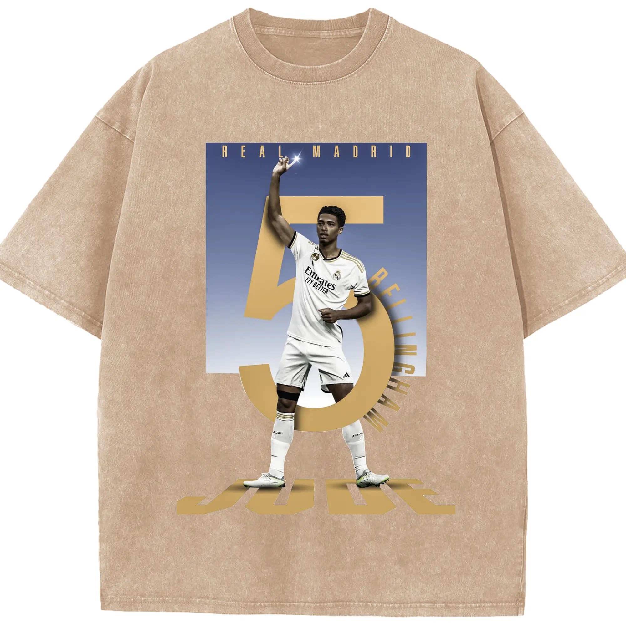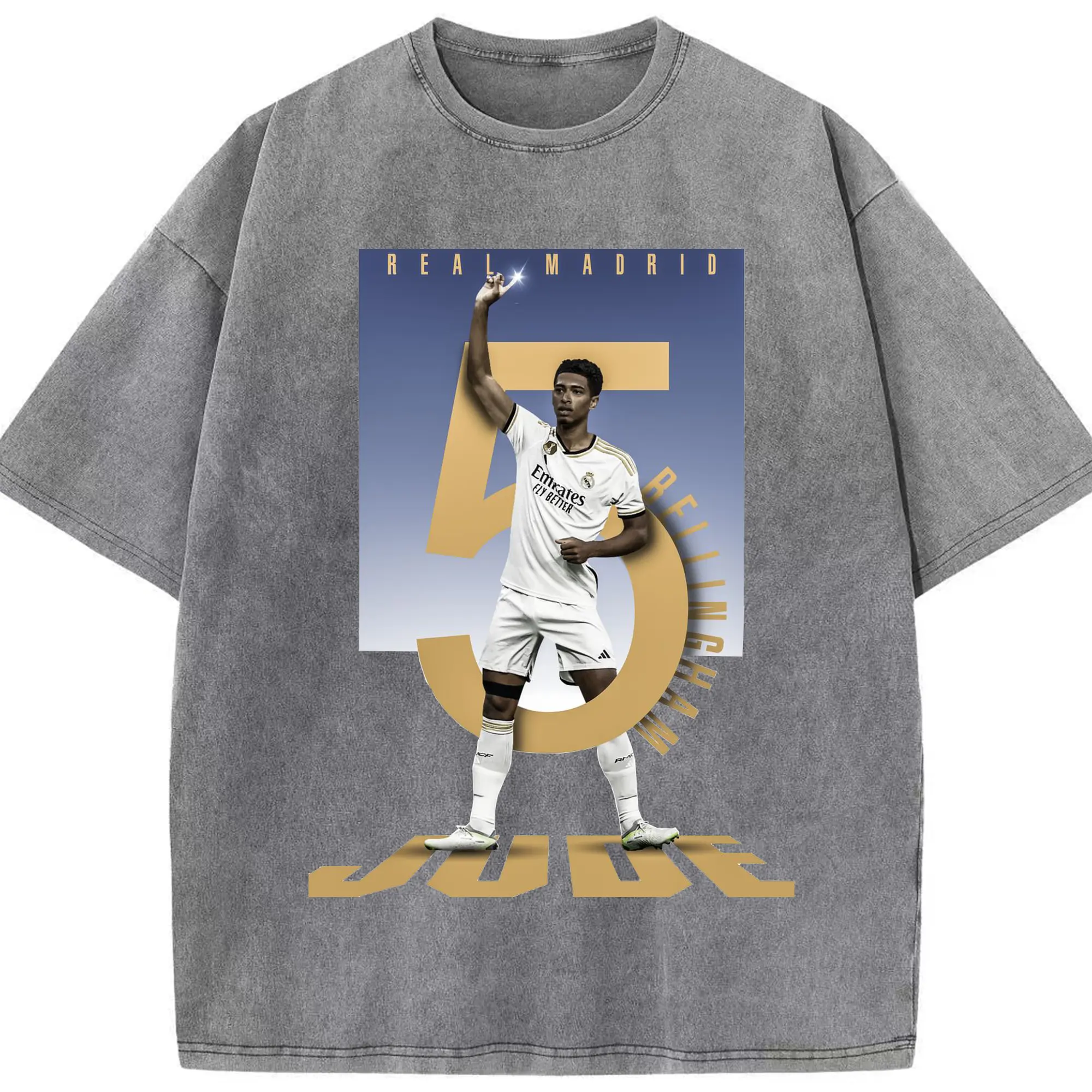 Jude Bellingham Real Madrid Number 5 DIY Shirt - Washed Vintage Look 230g Cotton Oversized T-Shirt With Front Heat Transfer Print – Soft, Lightweight, Stylish Fit – Comfortable Casual Wear For Sports & Everyday Use