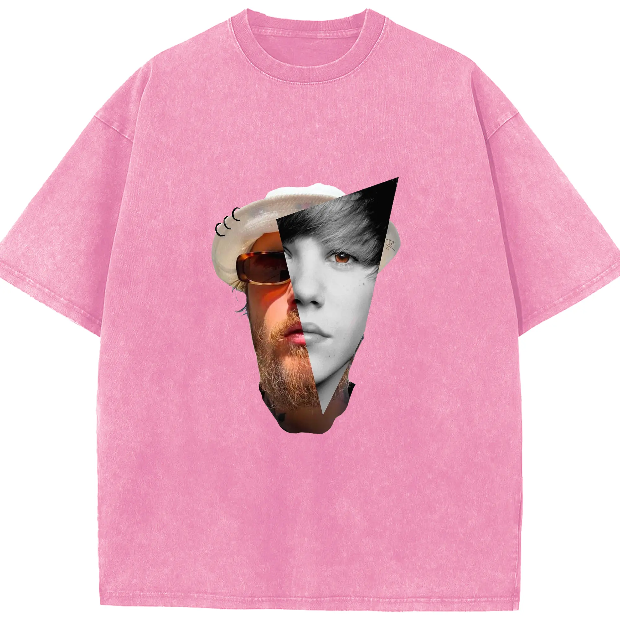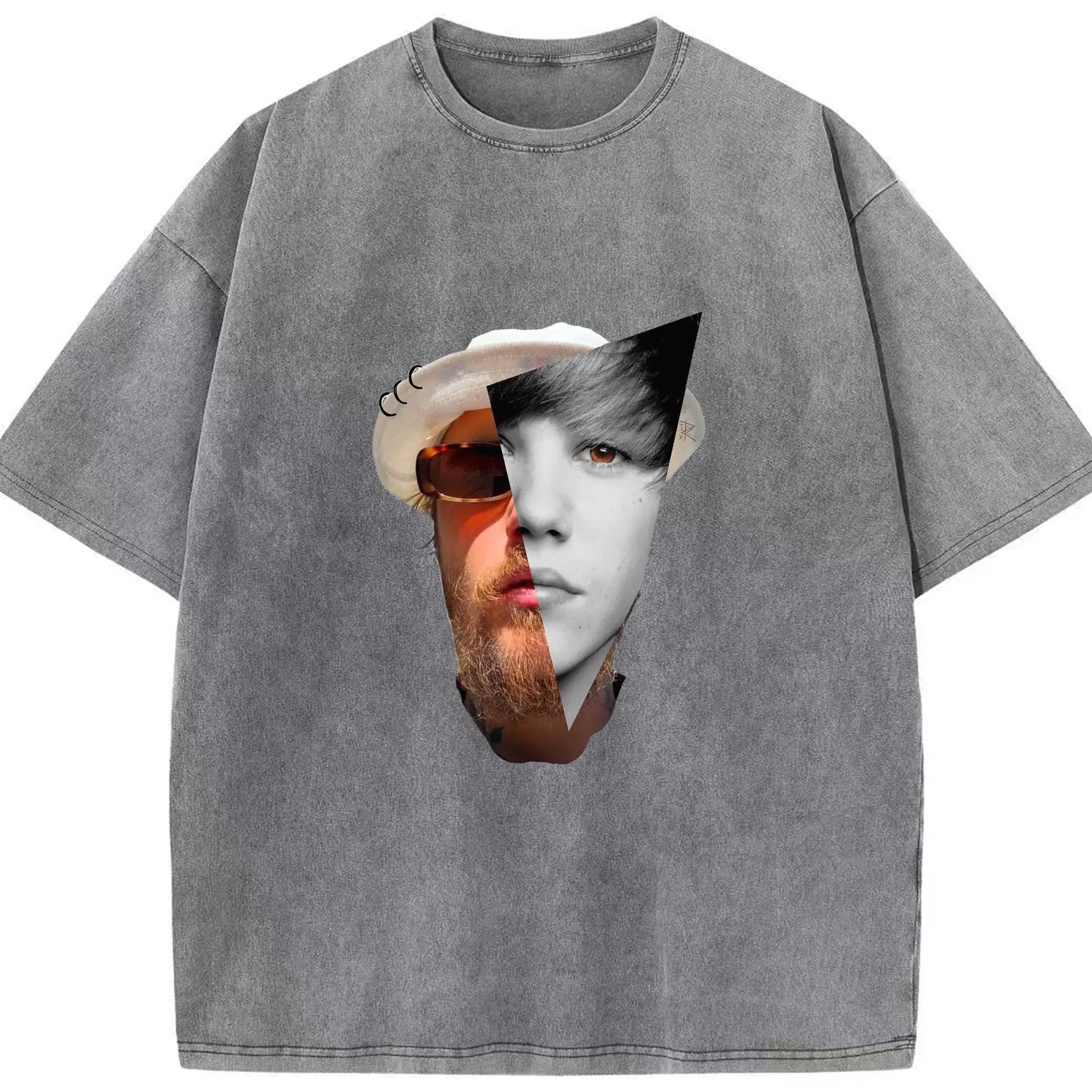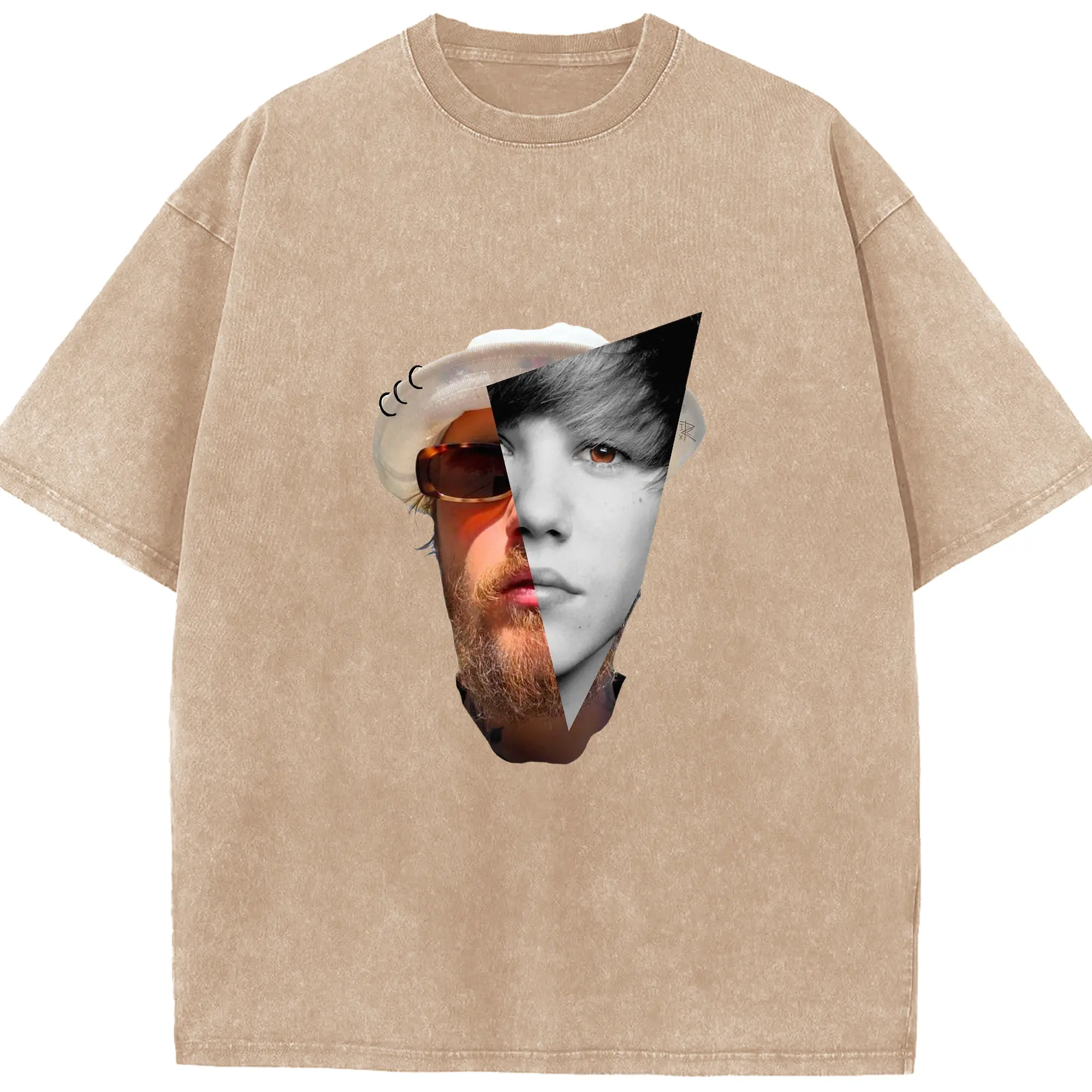 Justin Bieber Surreal Collage Avant-Garde DIY - Washed Vintage Look 230g Cotton Oversized T-Shirt With Front Heat Transfer Print – Soft, Lightweight, Stylish Fit – Comfortable Casual Wear For Sports & Everyday Use