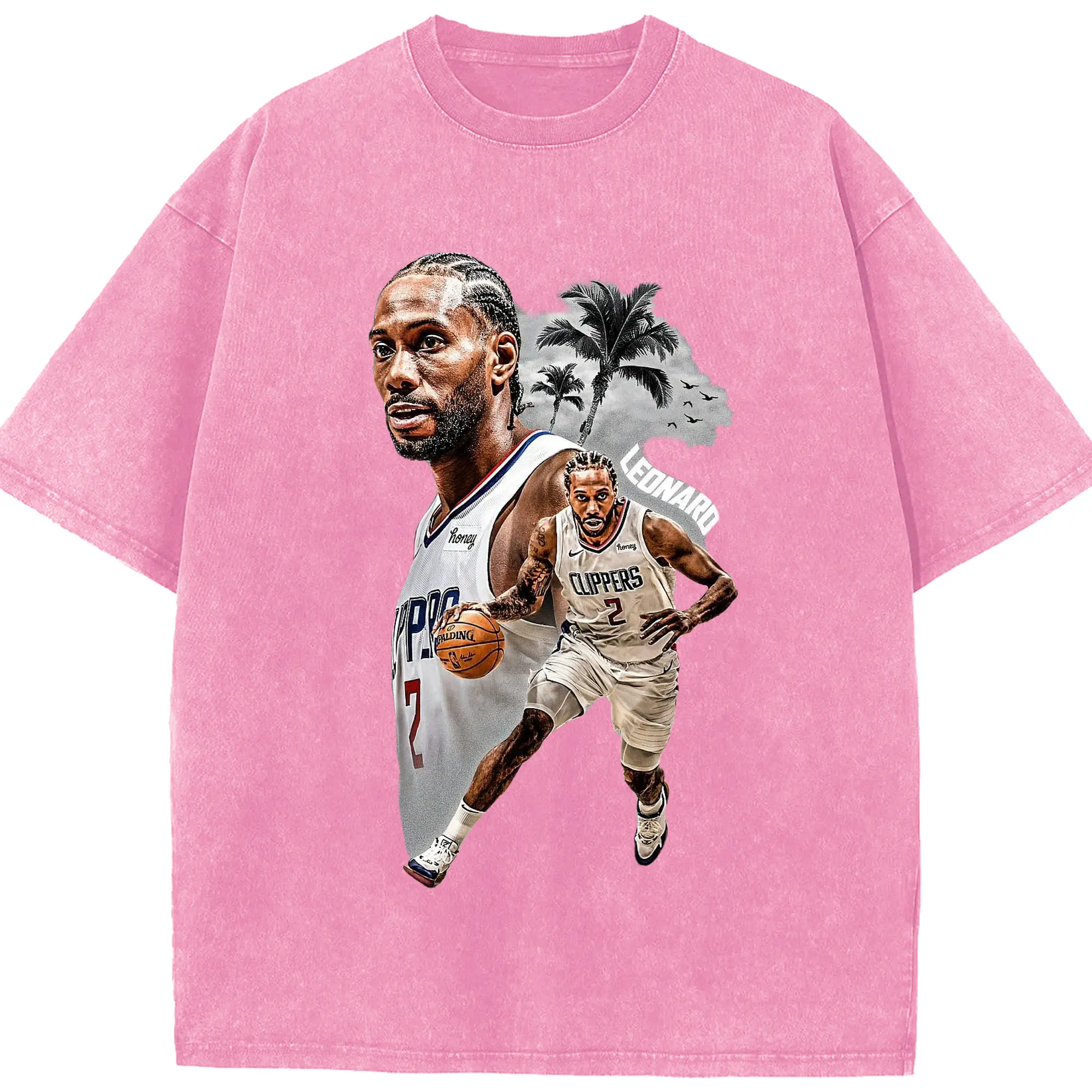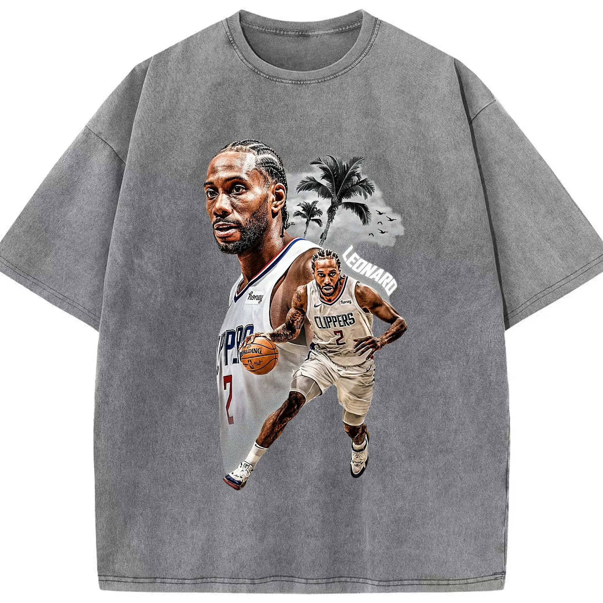 Kawhi Leonard LA Clippers On - Court Palm Tree Style Shirt - Washed Vintage Look 230g Cotton Oversized T-Shirt With Front Heat Transfer Print – Soft, Lightweight, Stylish Fit – Comfortable Casual Wear For Sports & Everyday Use