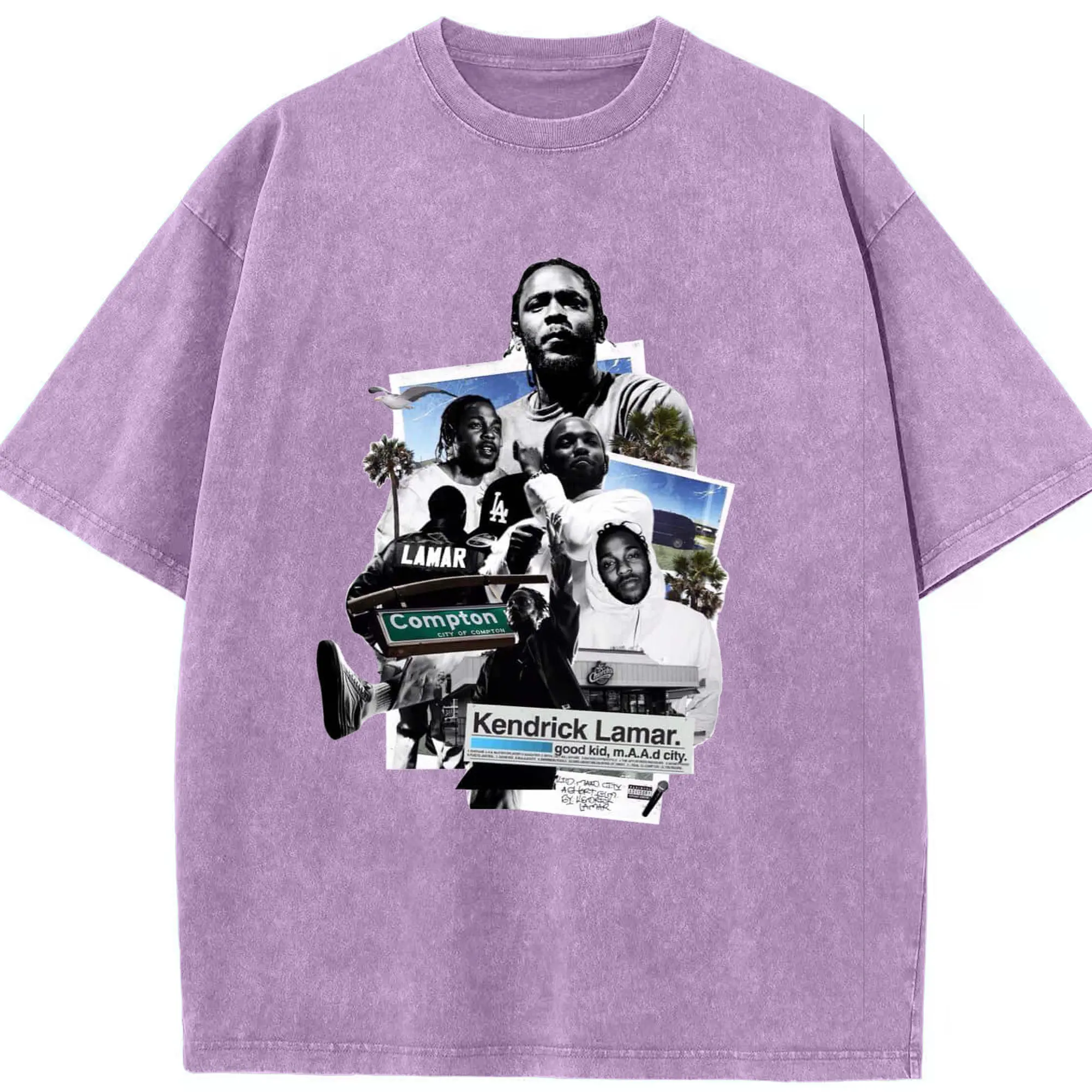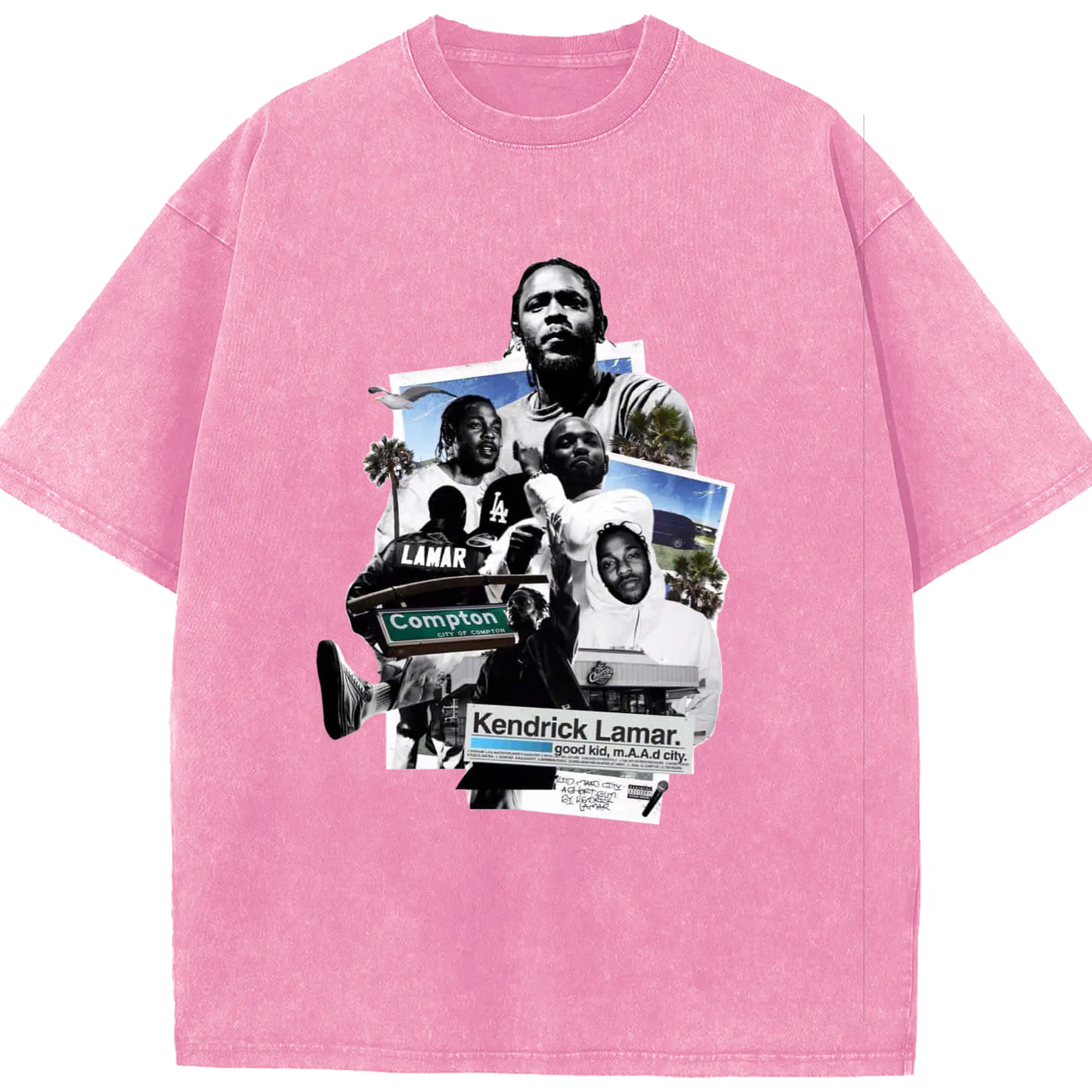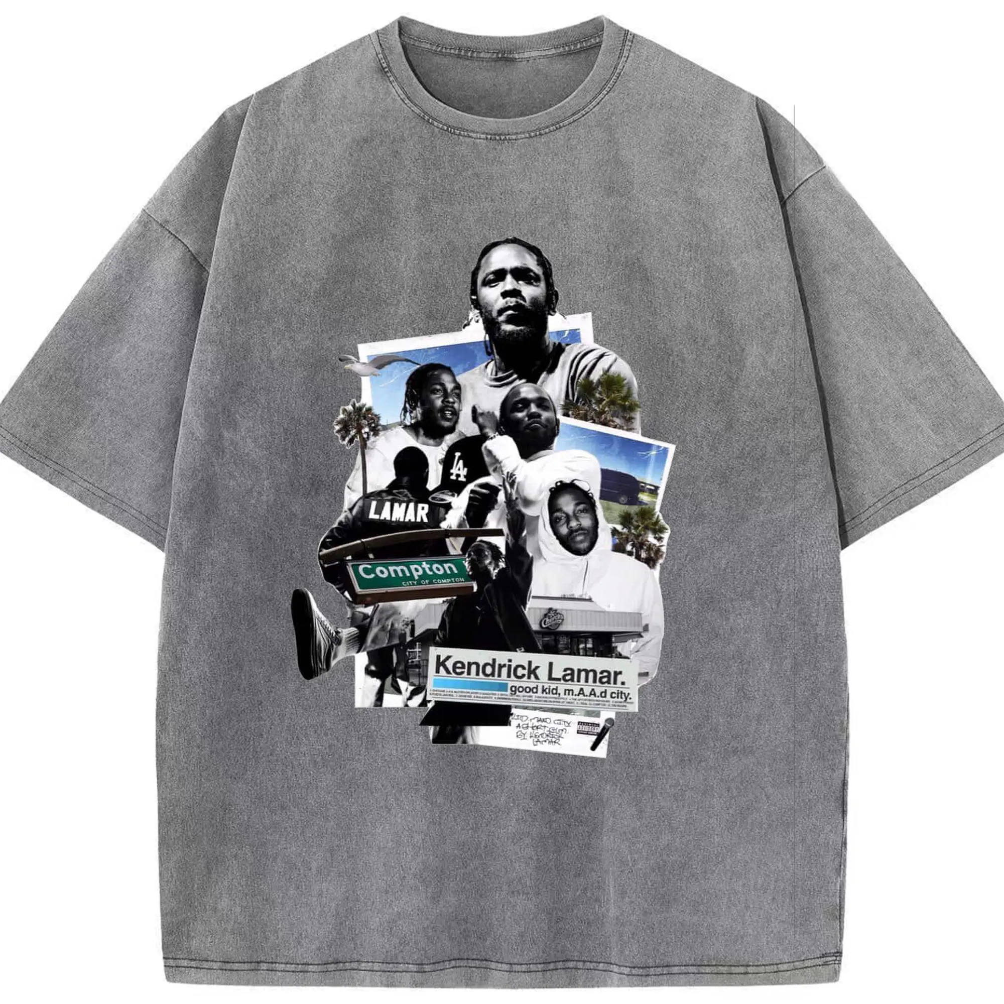 Kendrick Lamar Retro Collage 《good kid, m.A.A.d city》DIY - Washed Vintage Look 230g Cotton Oversized T-Shirt With Front Heat Transfer Print – Soft, Lightweight, Stylish Fit – Comfortable Casual Wear For Sports & Everyday Use