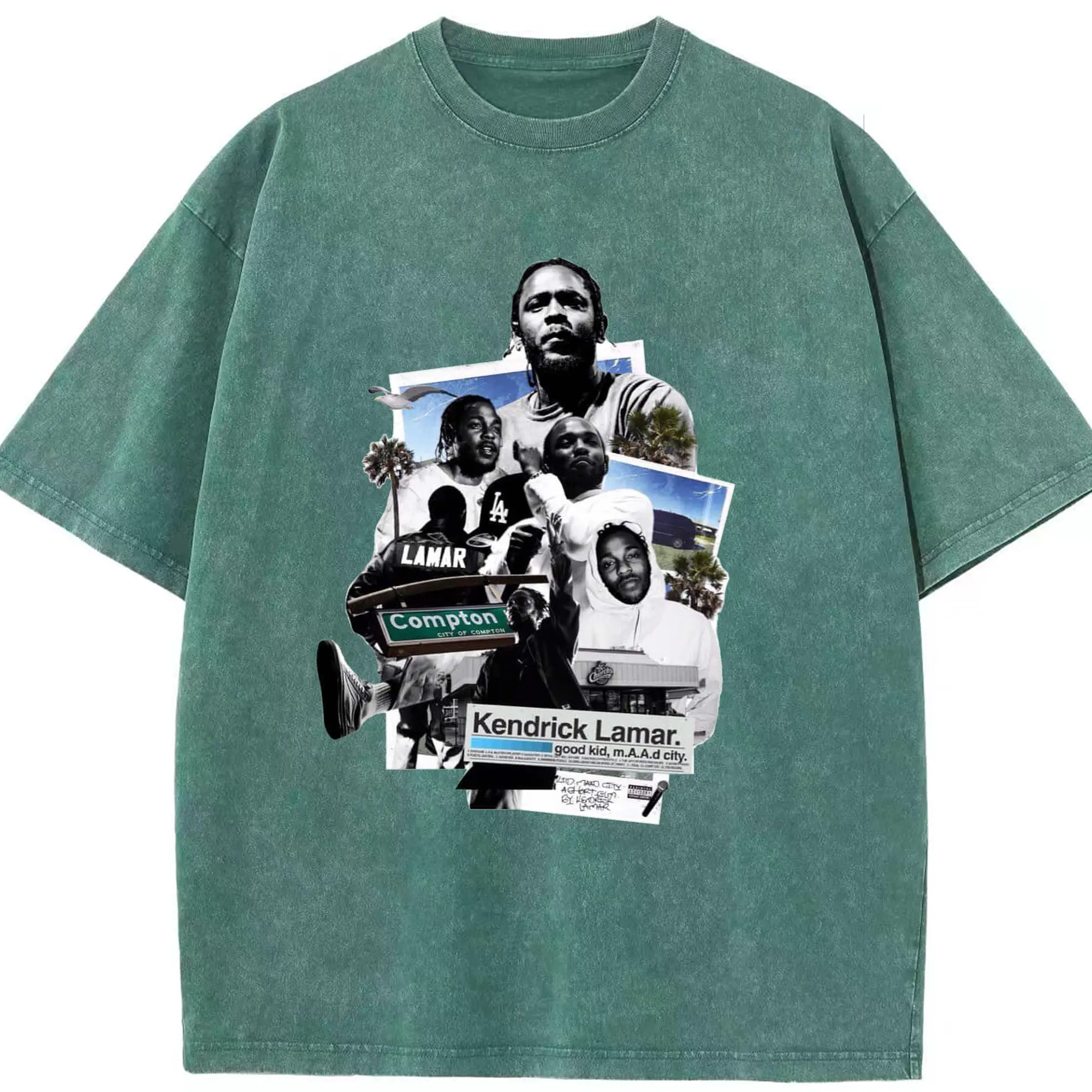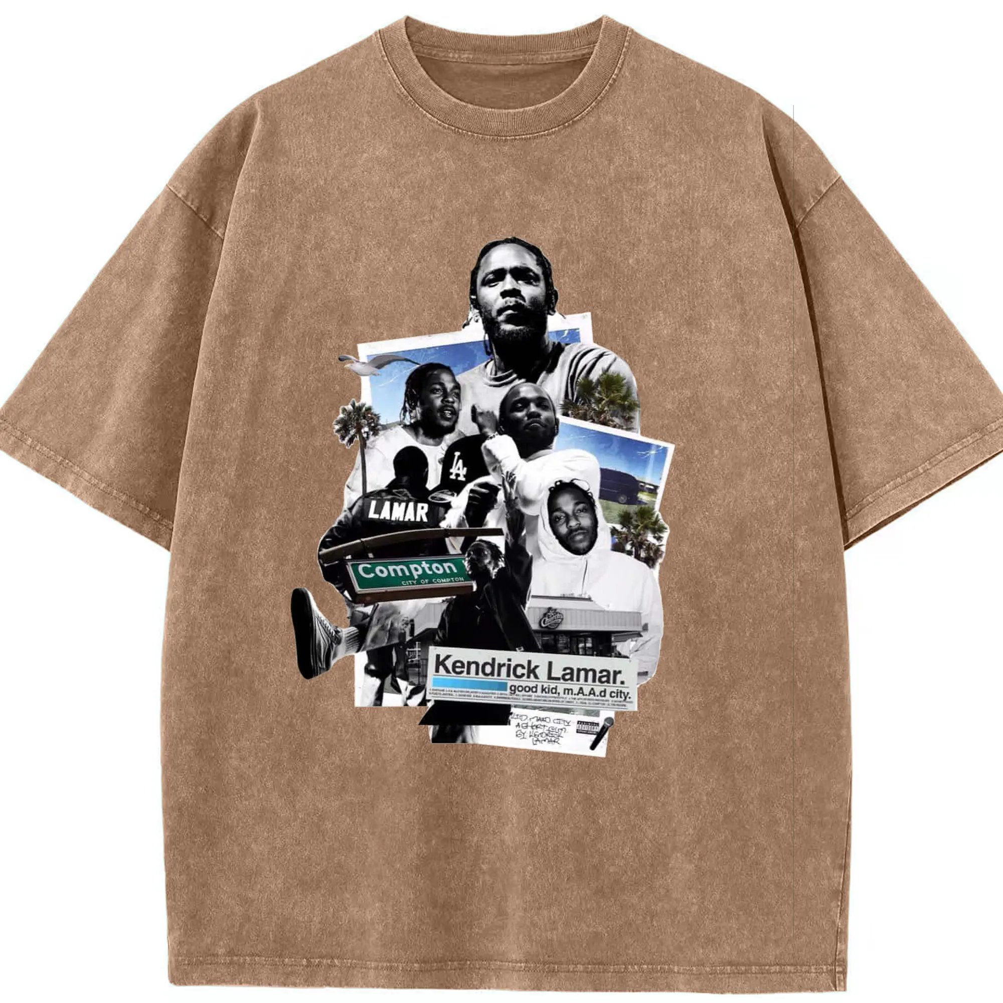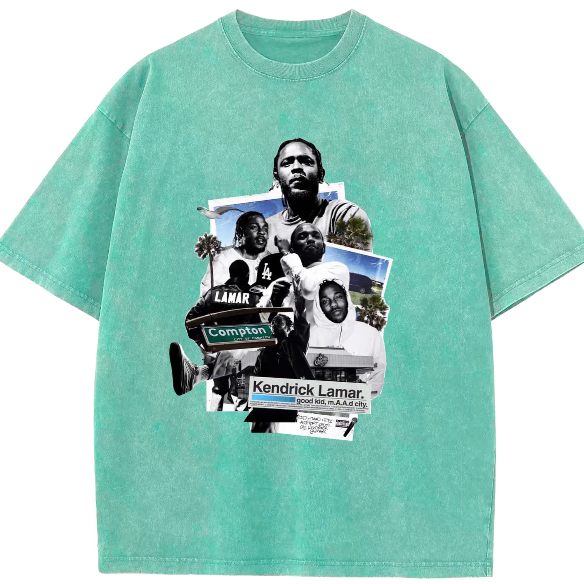 Kendrick Lamar Retro Collage 《good kid, m.A.A.d city》DIY - Washed Vintage Look 230g Cotton Oversized T-Shirt With Front Heat Transfer Print – Soft, Lightweight, Stylish Fit – Comfortable Casual Wear For Sports & Everyday Use