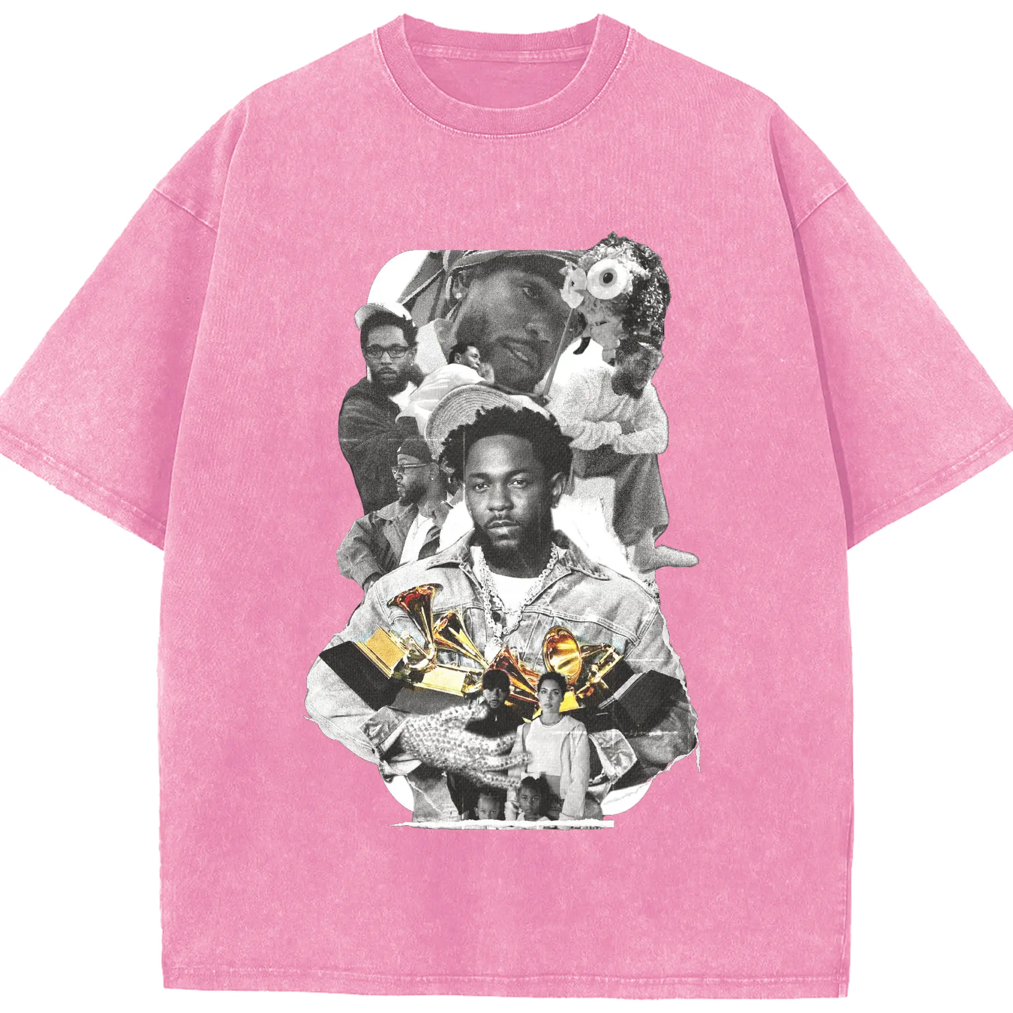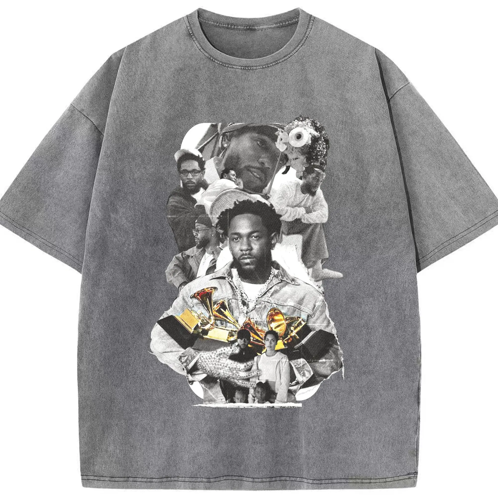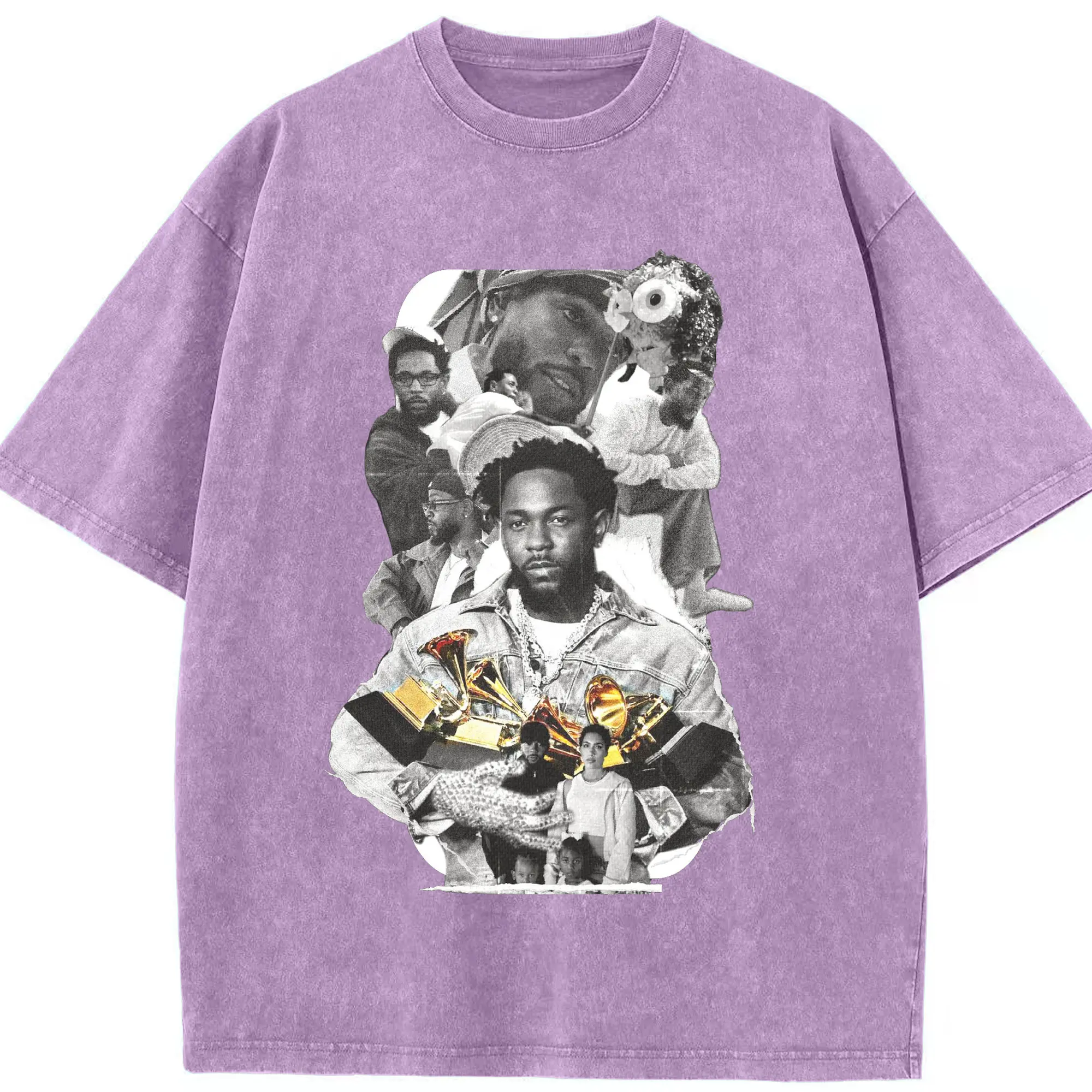 Kendrick Lamar Retro Collage Grammy Hip-Hop DIY - Washed Vintage Look 230g Cotton Oversized T-Shirt With Front Heat Transfer Print – Soft, Lightweight, Stylish Fit – Comfortable Casual Wear For Sports & Everyday Use