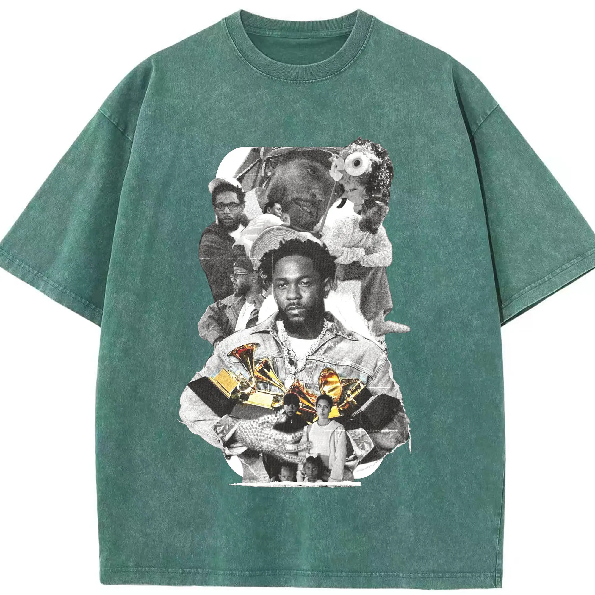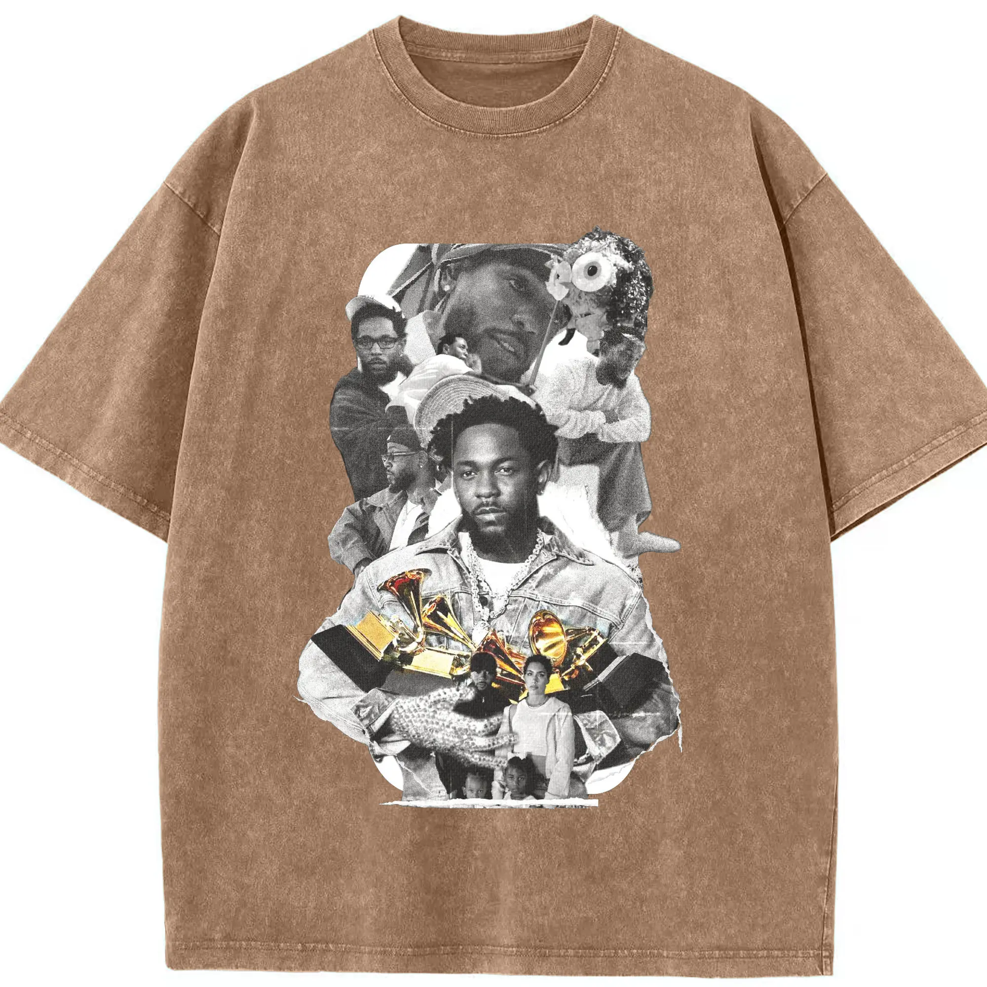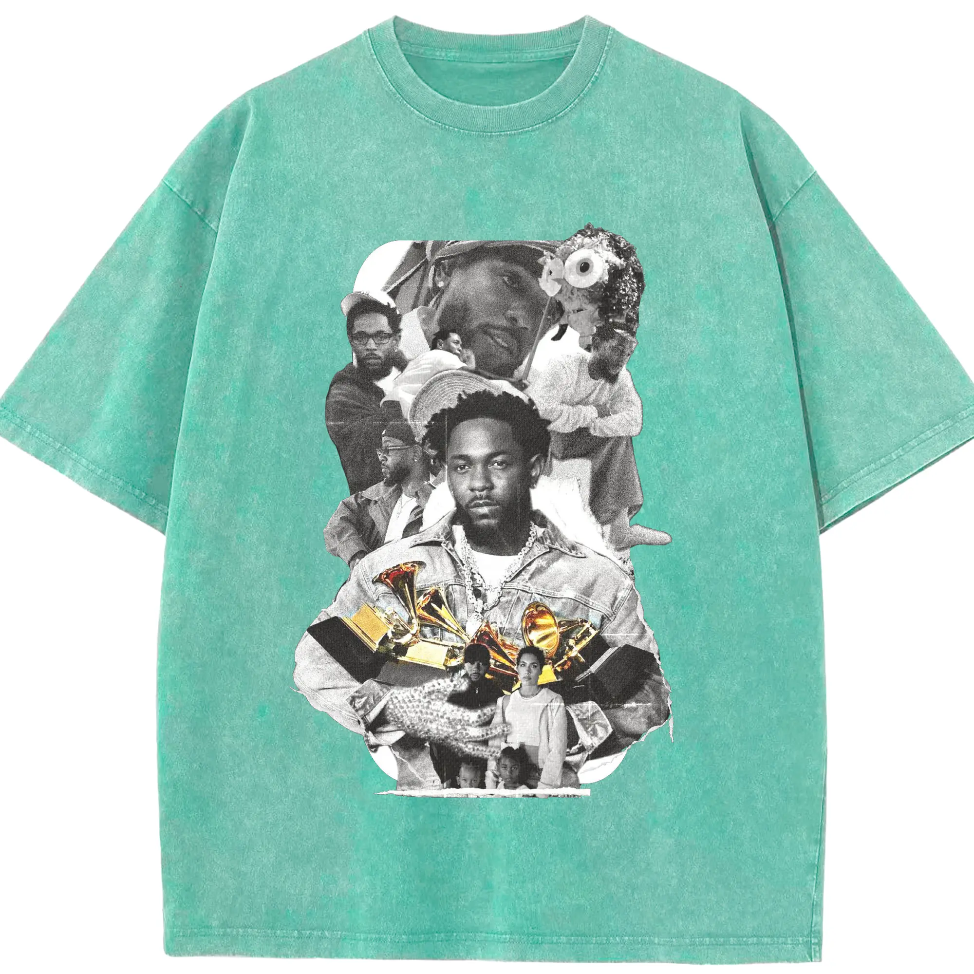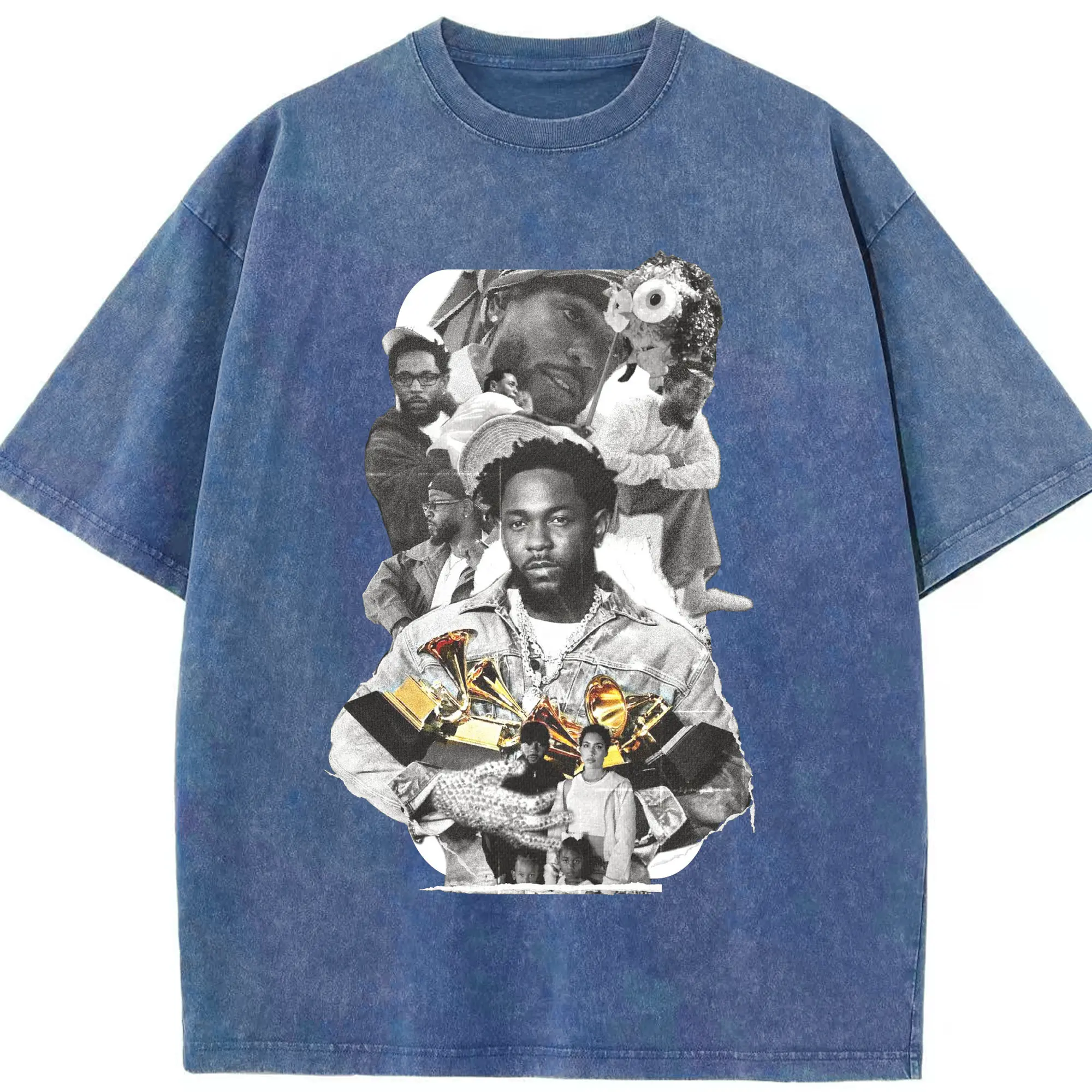 Kendrick Lamar Retro Collage Grammy Hip-Hop DIY - Washed Vintage Look 230g Cotton Oversized T-Shirt With Front Heat Transfer Print – Soft, Lightweight, Stylish Fit – Comfortable Casual Wear For Sports & Everyday Use