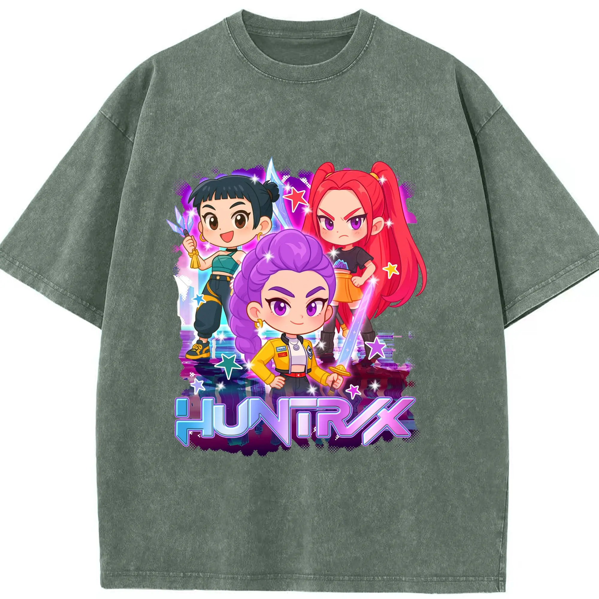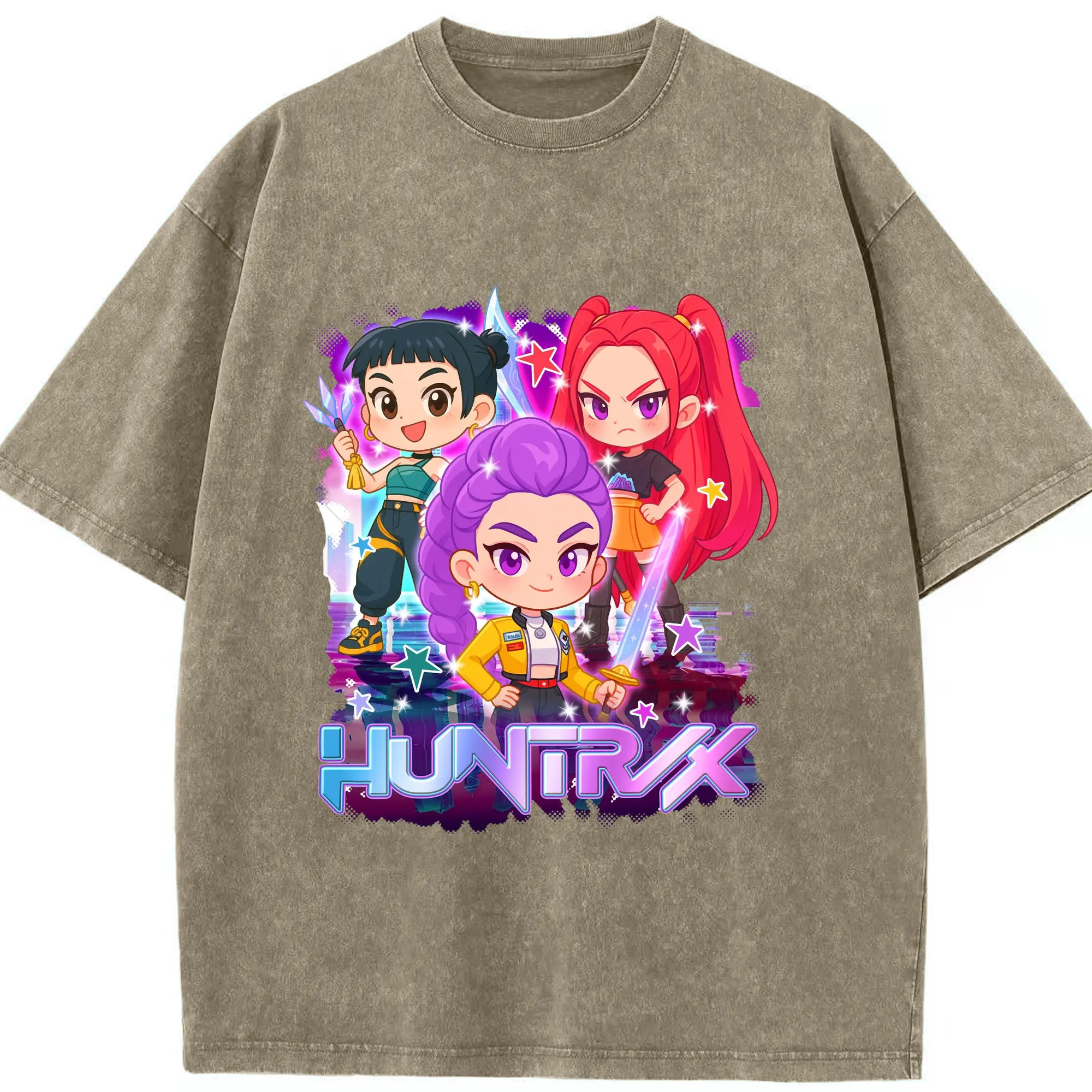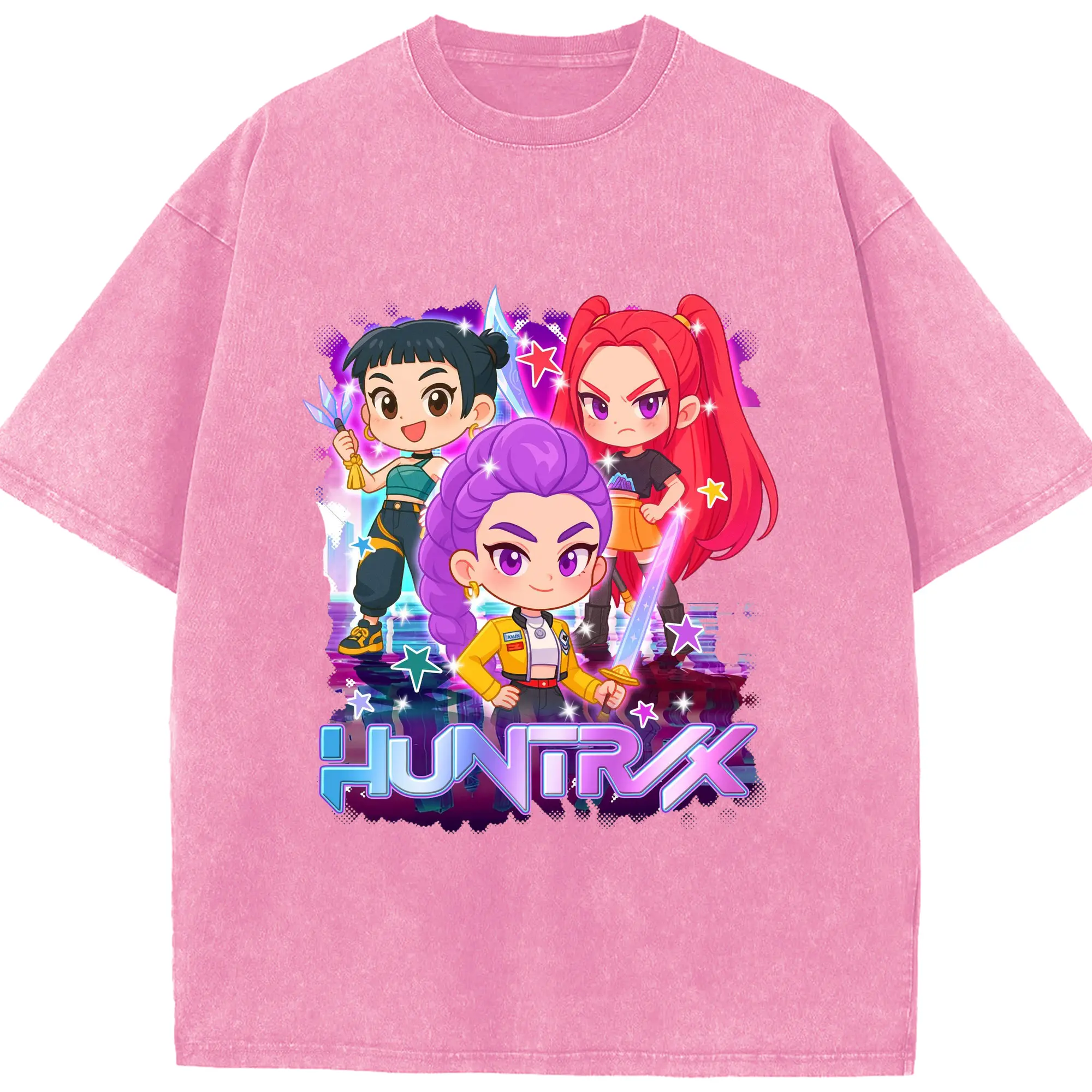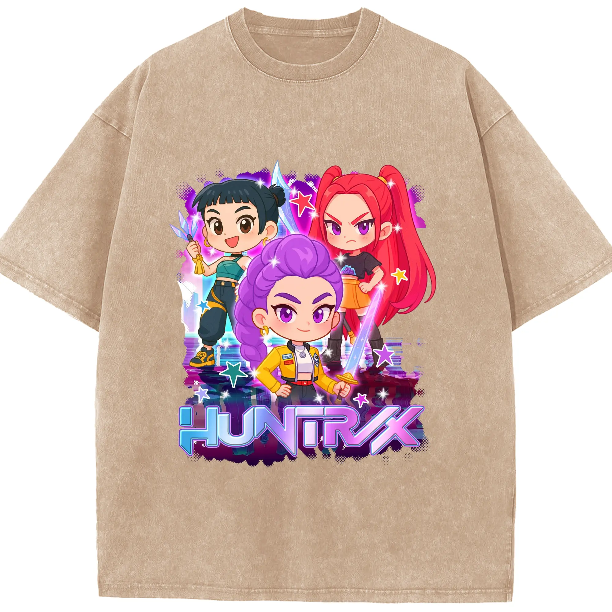 K-POP HUNTRIX Cyber Kawaii Girl Characters with Stars DIY Shirt - Washed Vintage Look 230g Cotton Oversized T-Shirt With Front Heat Transfer Print – Soft, Lightweight, Stylish Fit – Comfortable Casual Wear For Sports & Everyday Use
