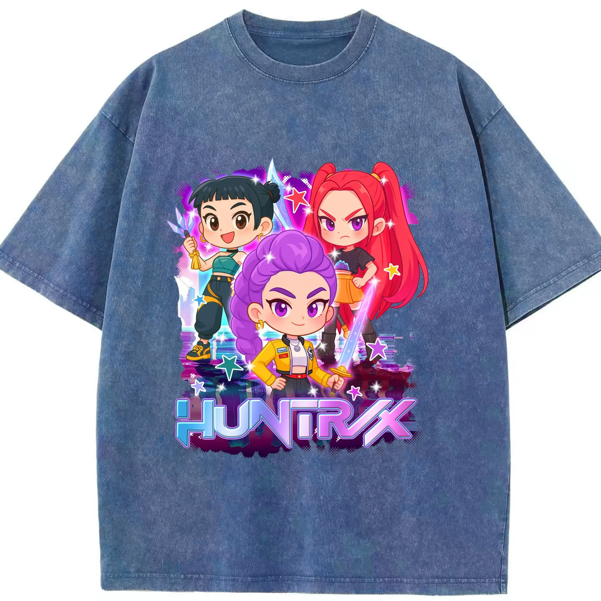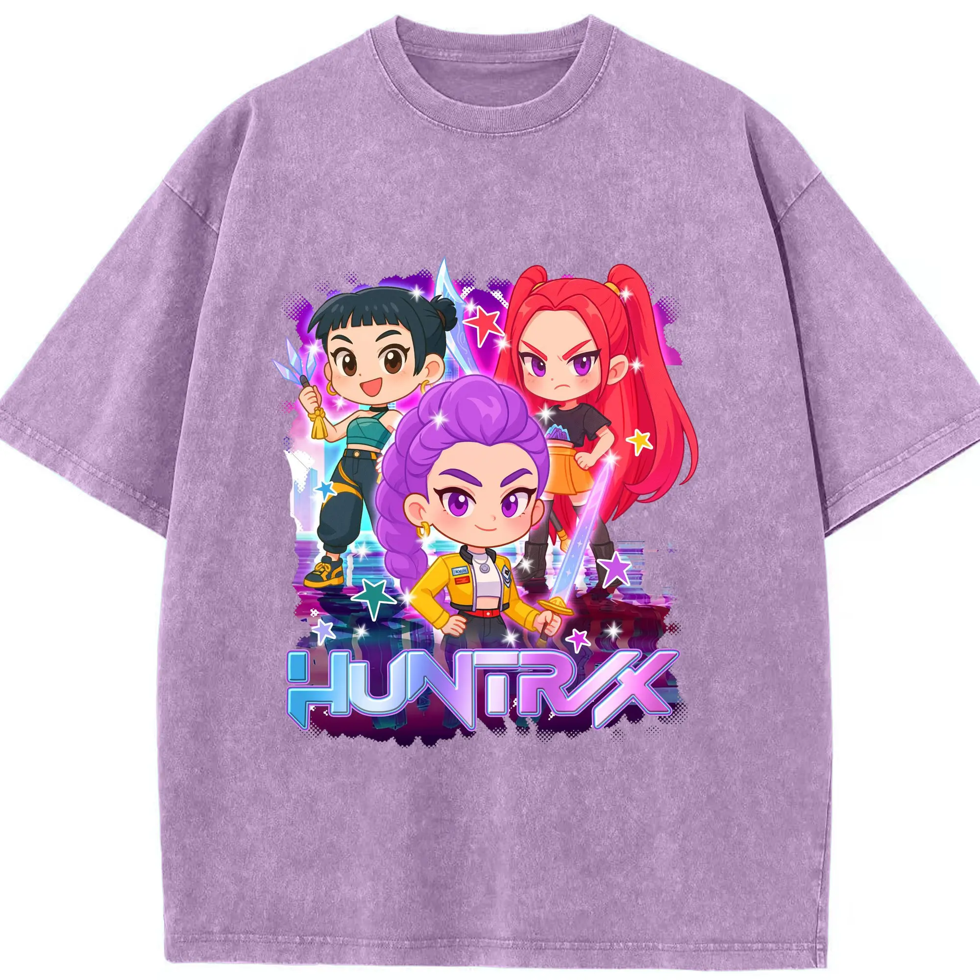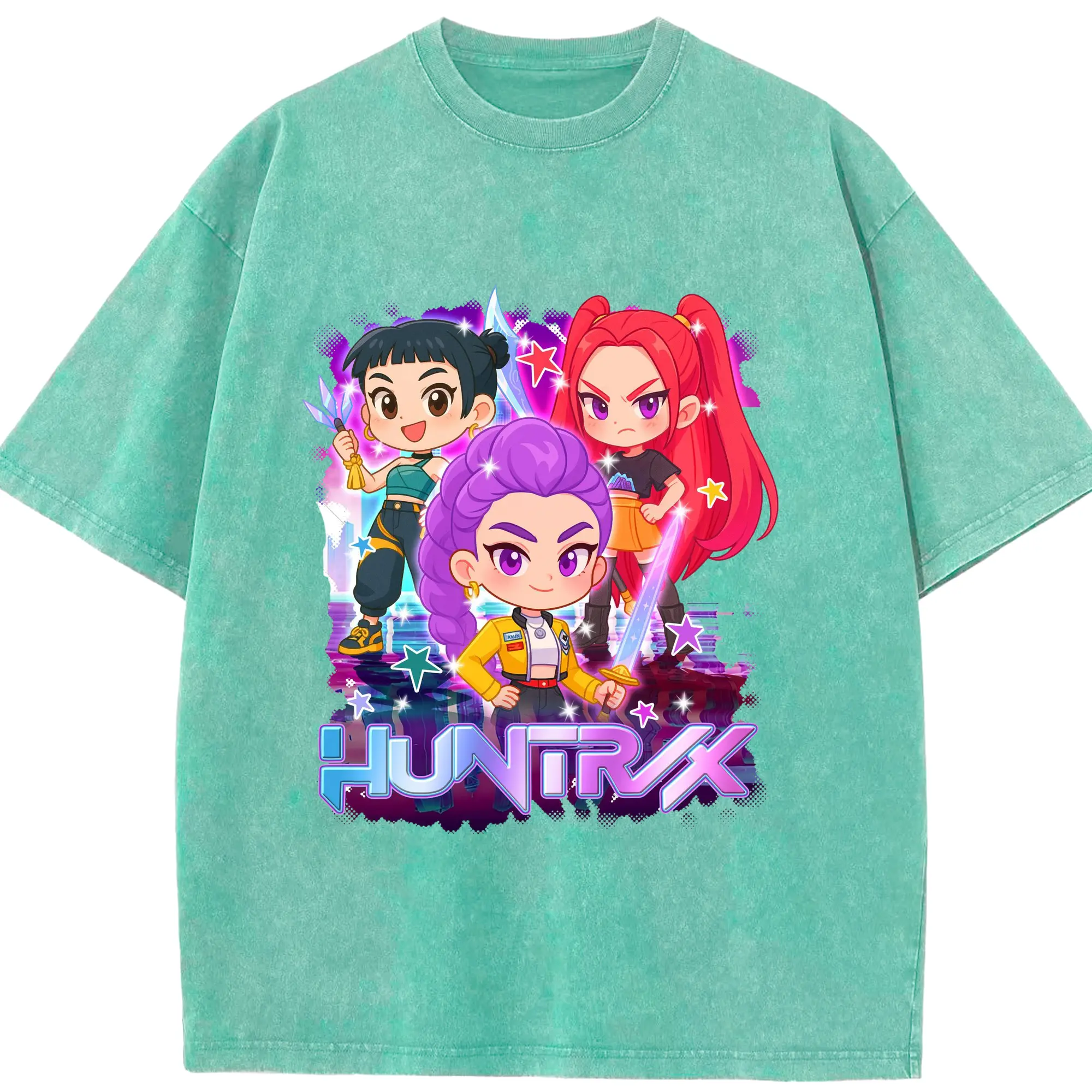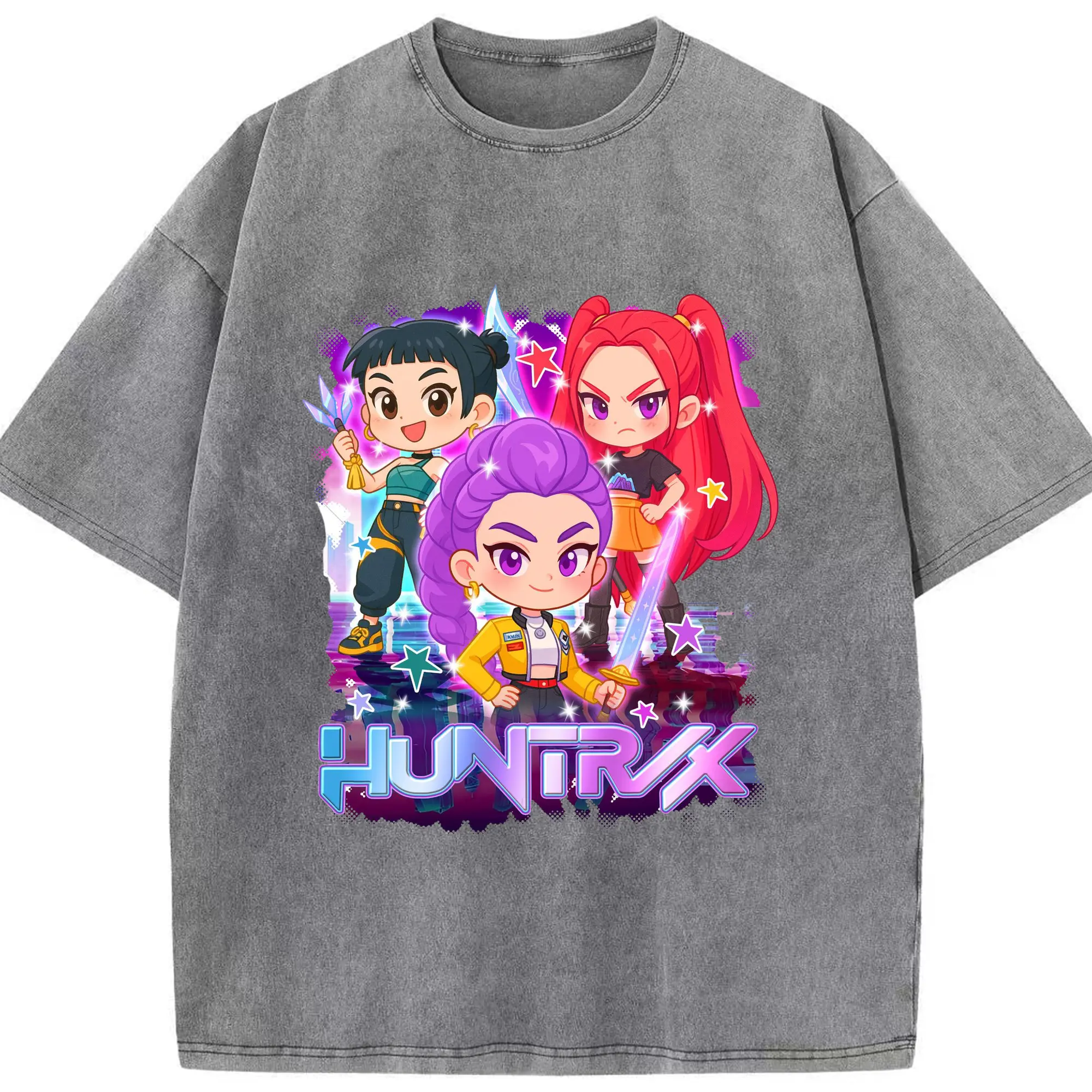 K-POP HUNTRIX Cyber Kawaii Girl Characters with Stars DIY Shirt - Washed Vintage Look 230g Cotton Oversized T-Shirt With Front Heat Transfer Print – Soft, Lightweight, Stylish Fit – Comfortable Casual Wear For Sports & Everyday Use