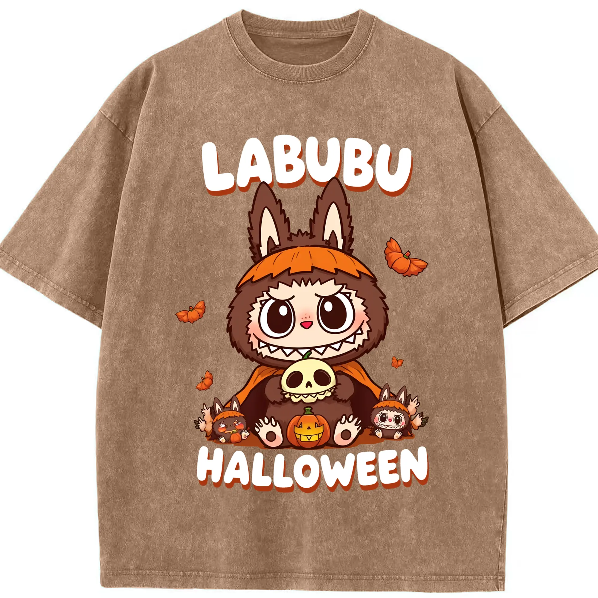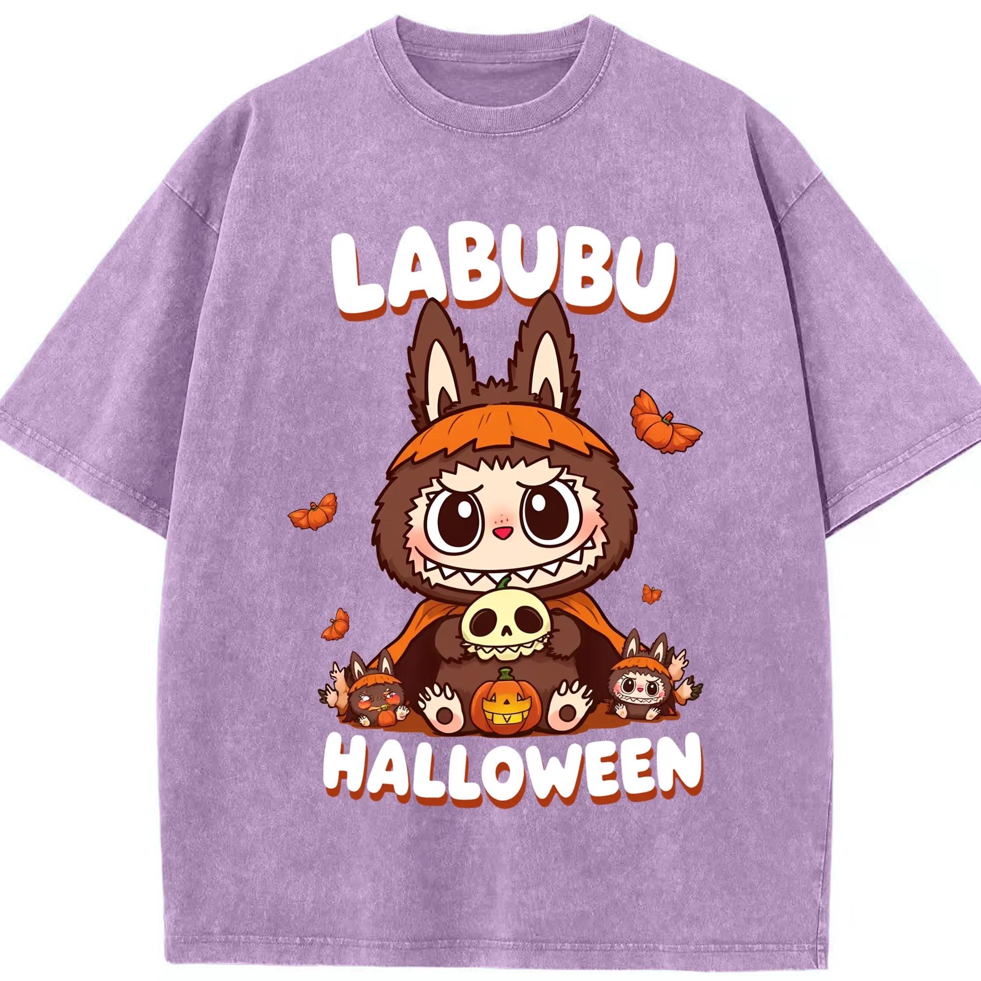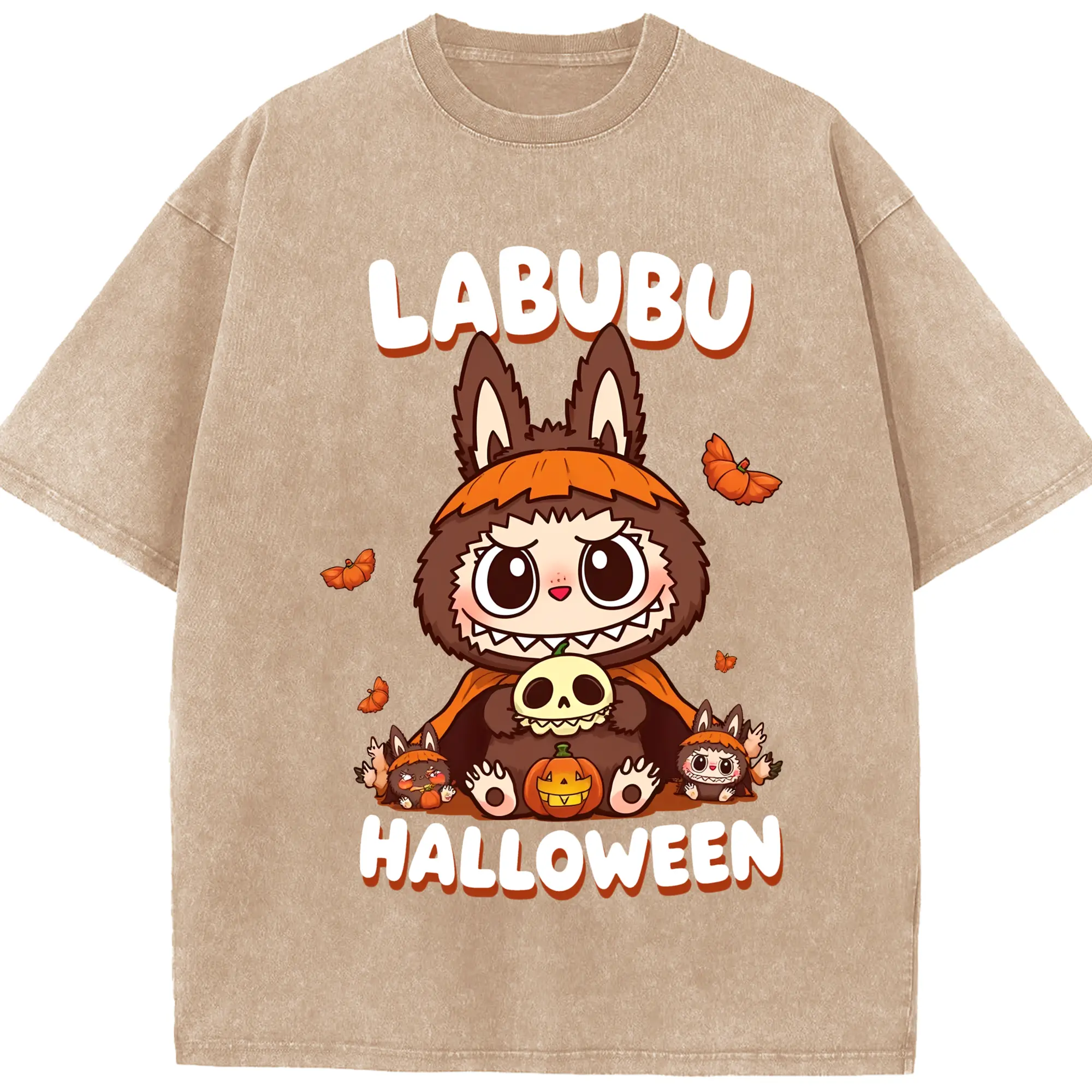 Labubu Cute Dark Pumpkin Trendy DIY - Washed Vintage Look 230g Cotton Oversized T-Shirt With Front Heat Transfer Print – Soft, Lightweight, Stylish Fit – Comfortable Casual Wear For Sports & Everyday Use