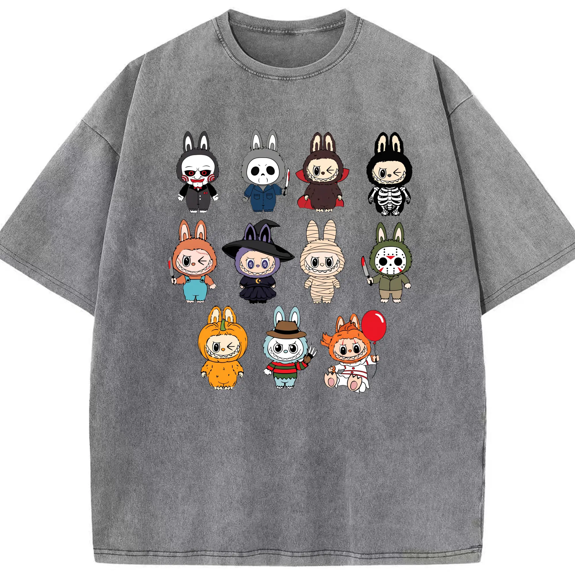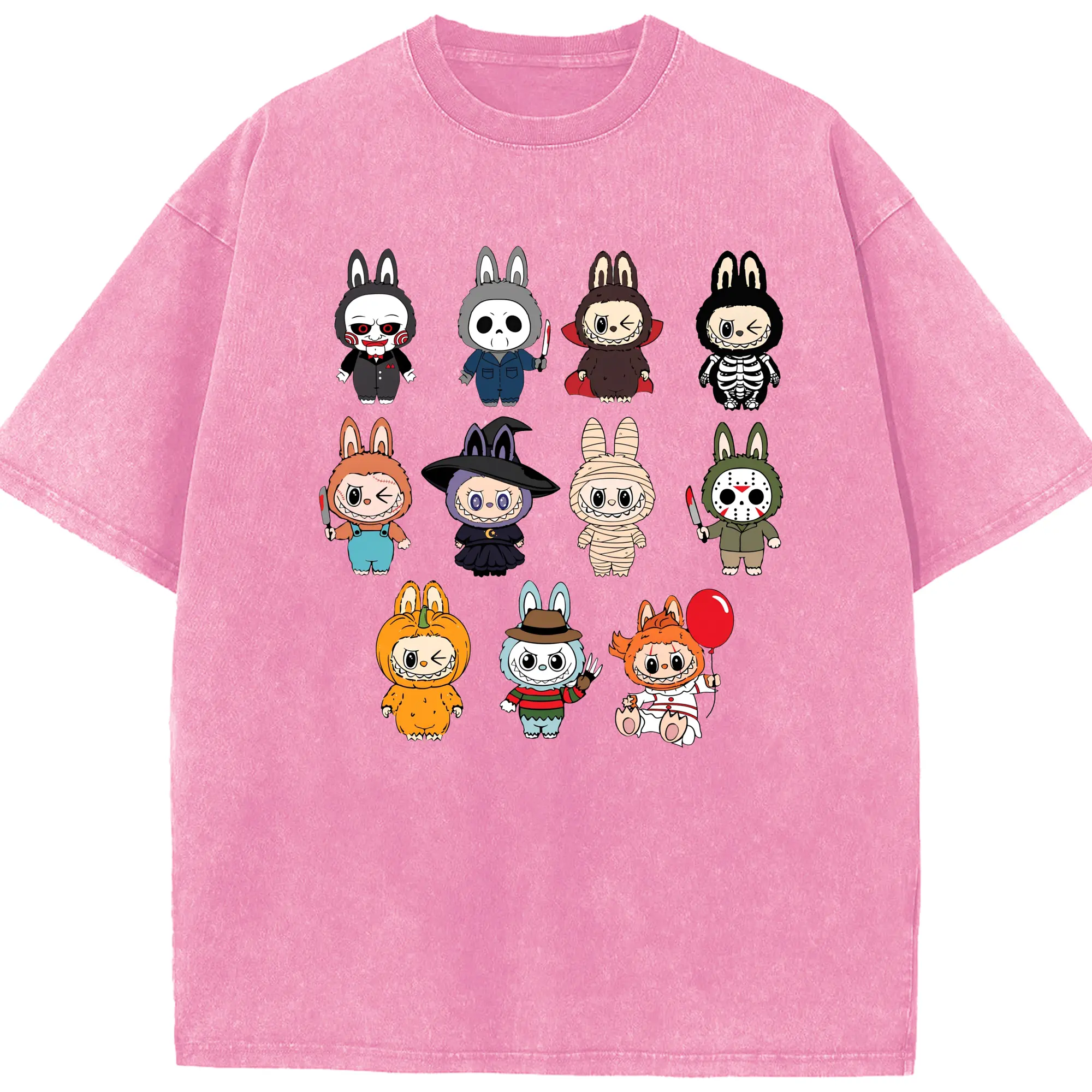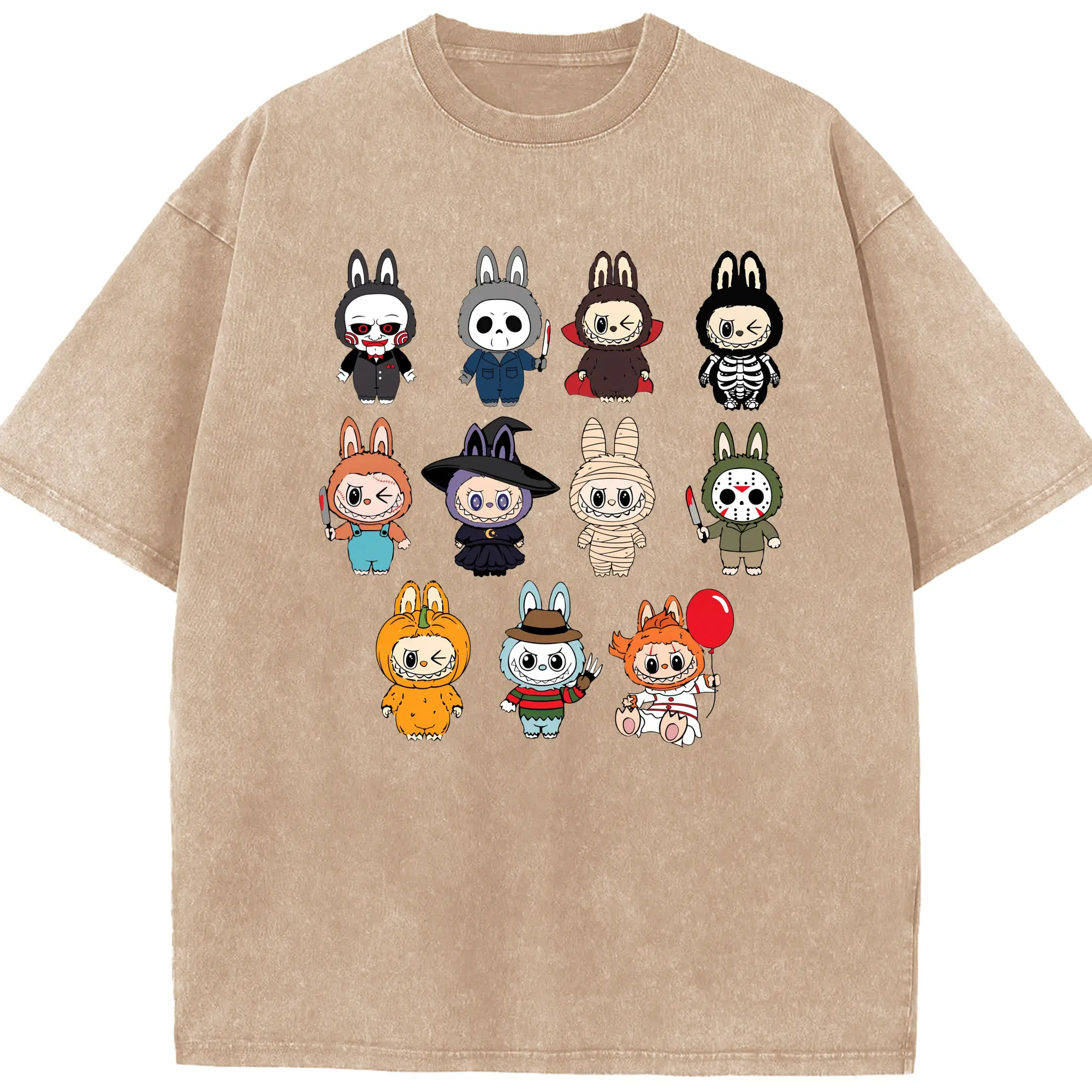 Labubu Cute Horror Movie Characters Collection DIY - Washed Vintage Look 230g Cotton Oversized T-Shirt With Front Heat Transfer Print – Soft, Lightweight, Stylish Fit – Comfortable Casual Wear For Sports & Everyday Use