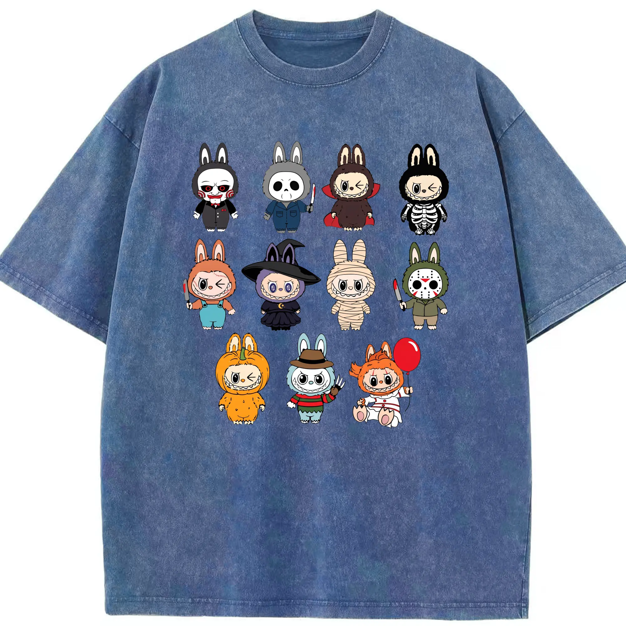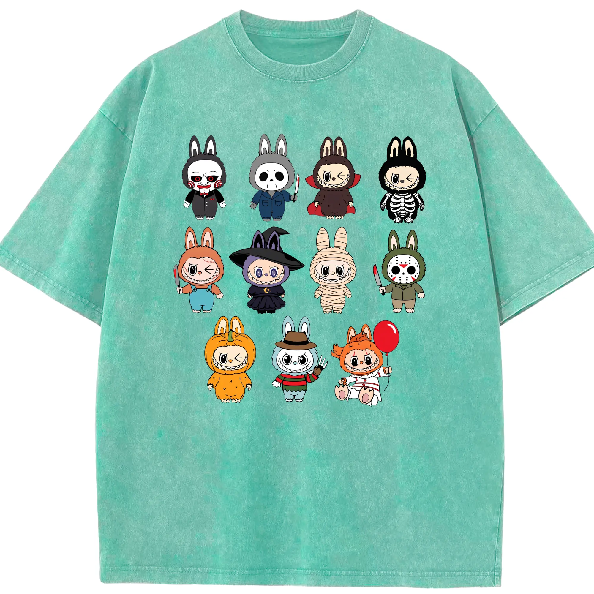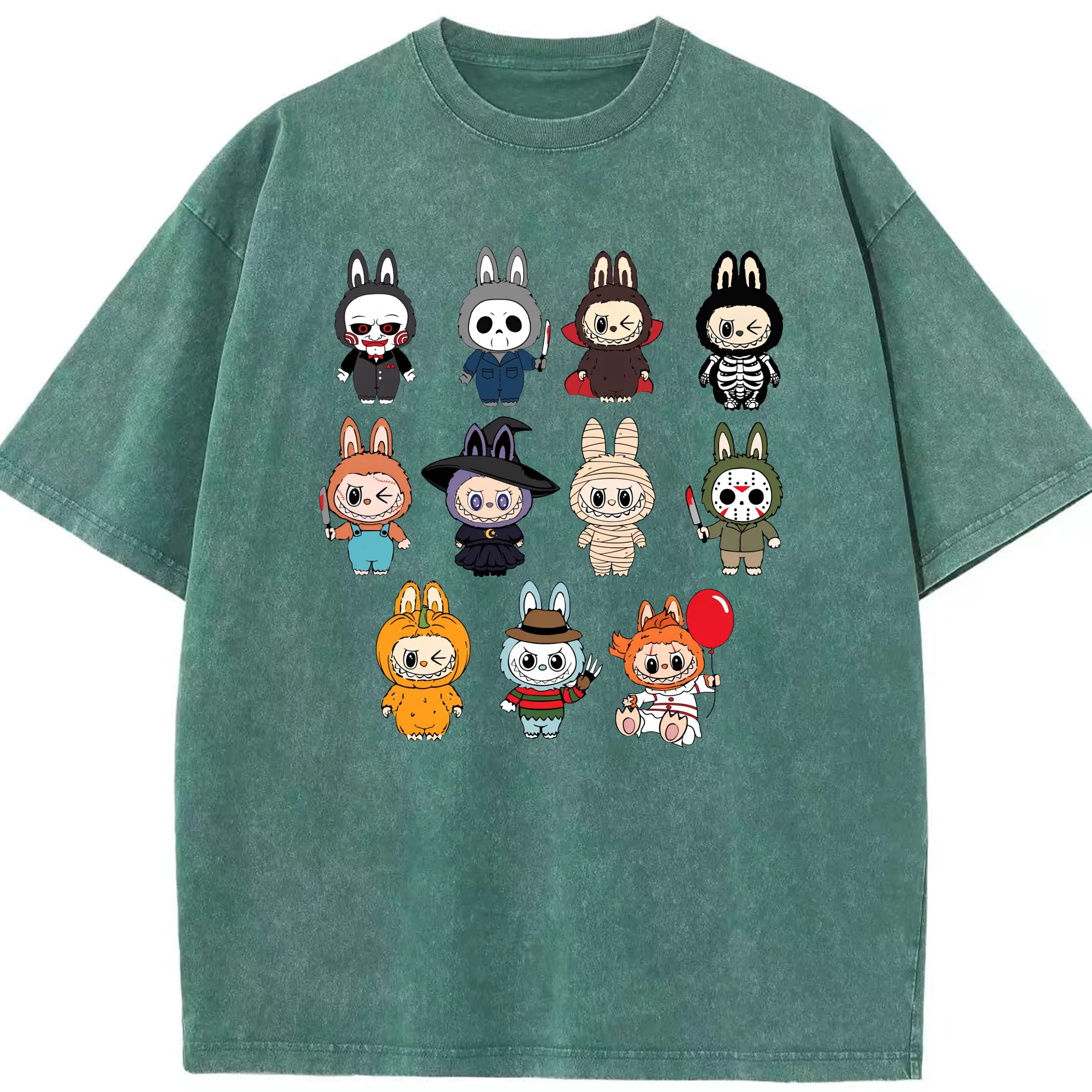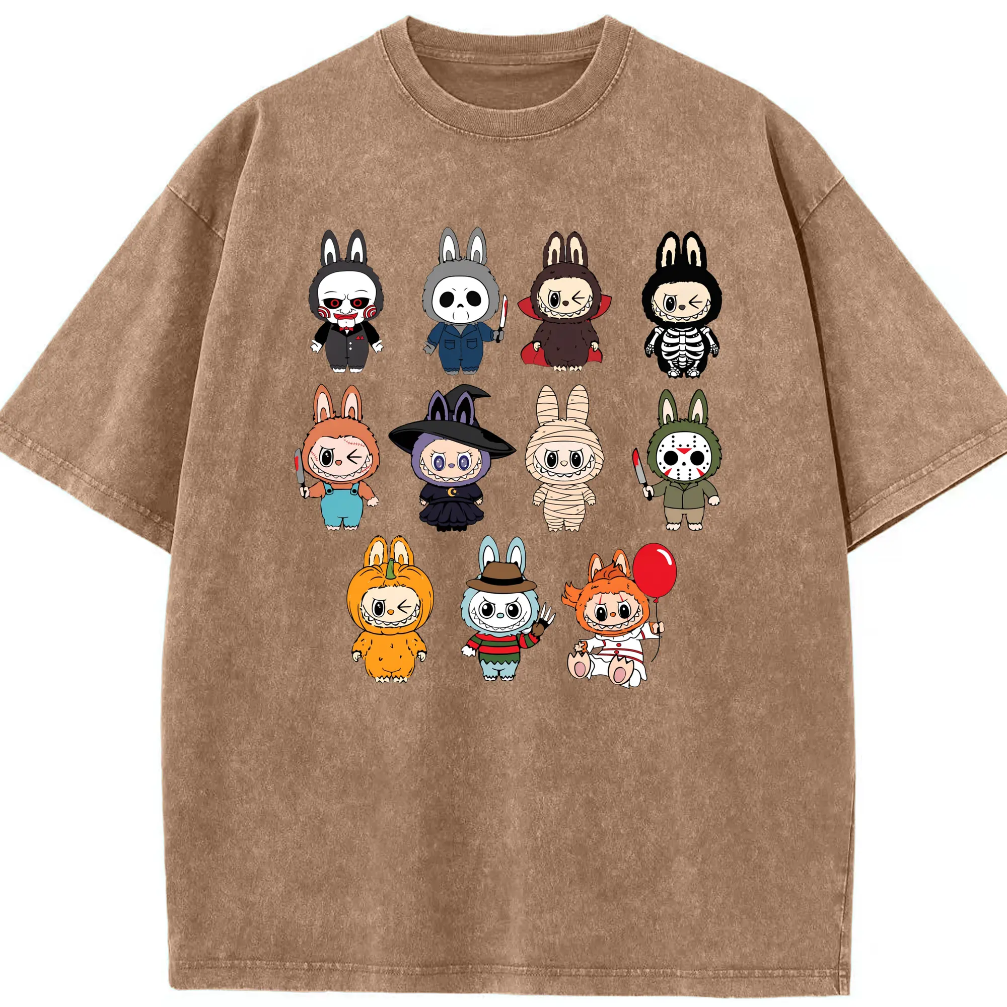 Labubu Cute Horror Movie Characters Collection DIY - Washed Vintage Look 230g Cotton Oversized T-Shirt With Front Heat Transfer Print – Soft, Lightweight, Stylish Fit – Comfortable Casual Wear For Sports & Everyday Use