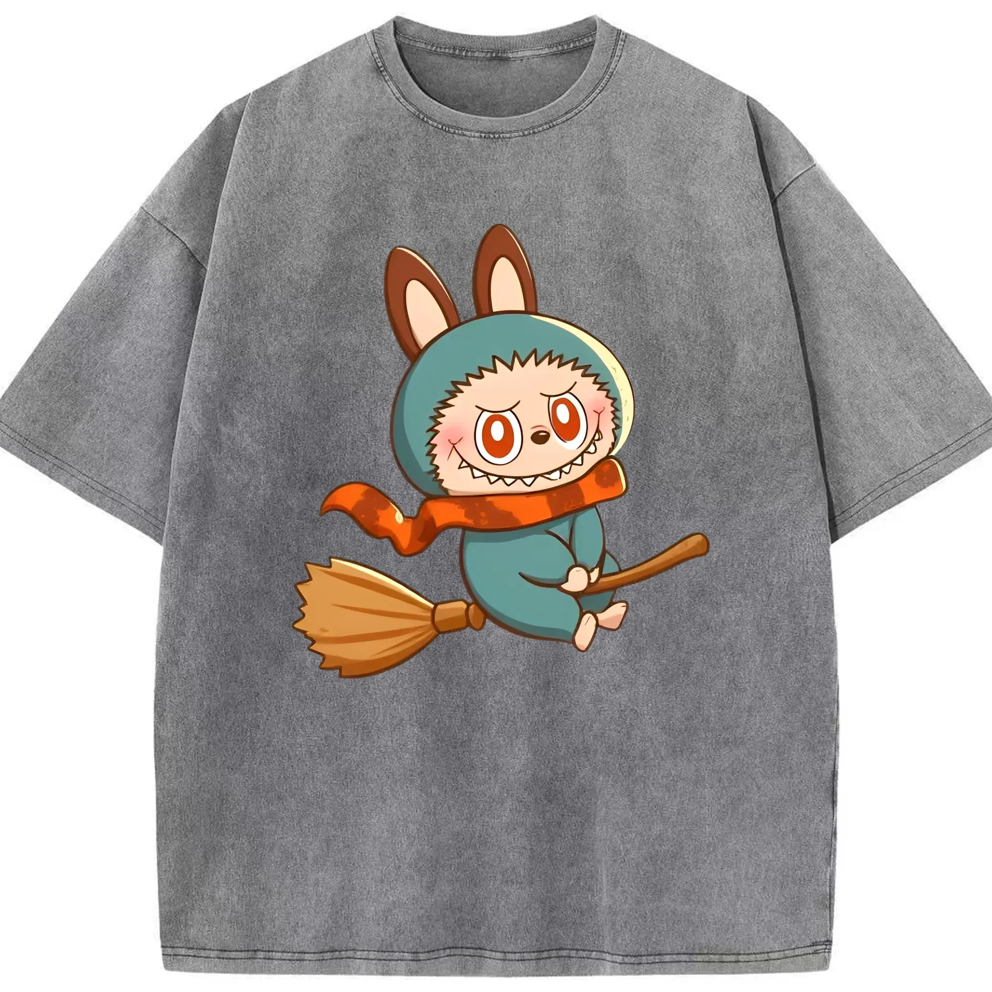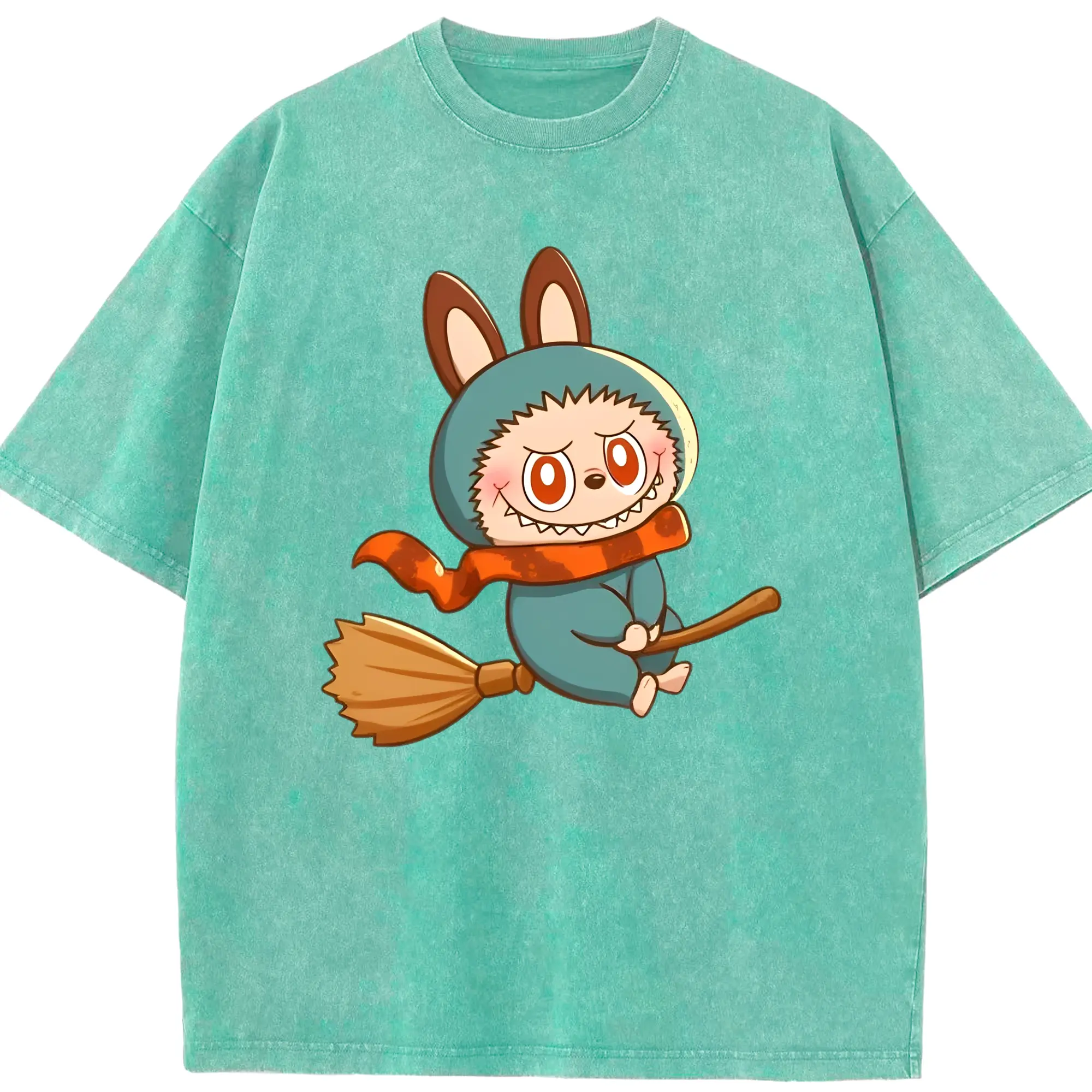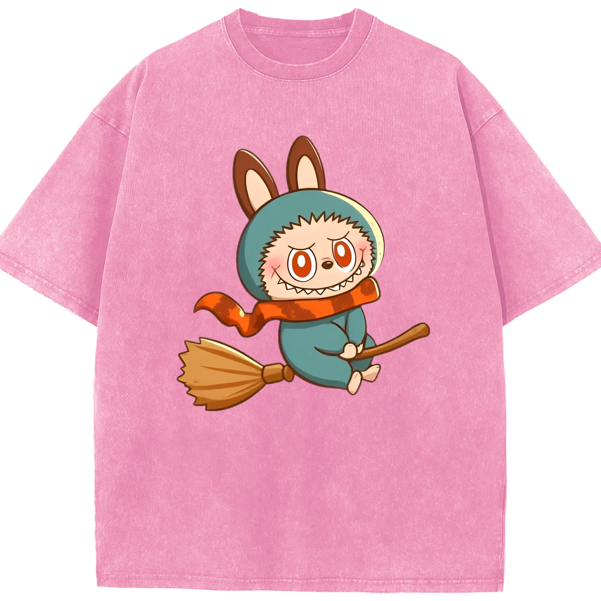 Labubu Cute Magical Witch Broom Cartoon DIY - Washed Vintage Look 230g Cotton Oversized T-Shirt With Front Heat Transfer Print – Soft, Lightweight, Stylish Fit – Comfortable Casual Wear For Sports & Everyday Use