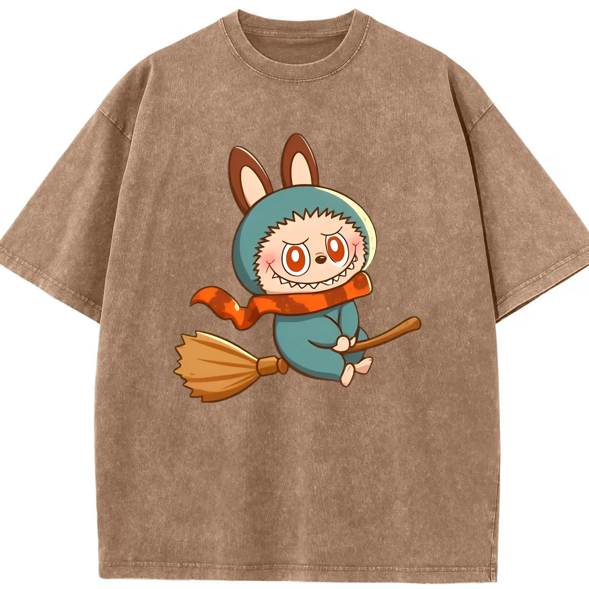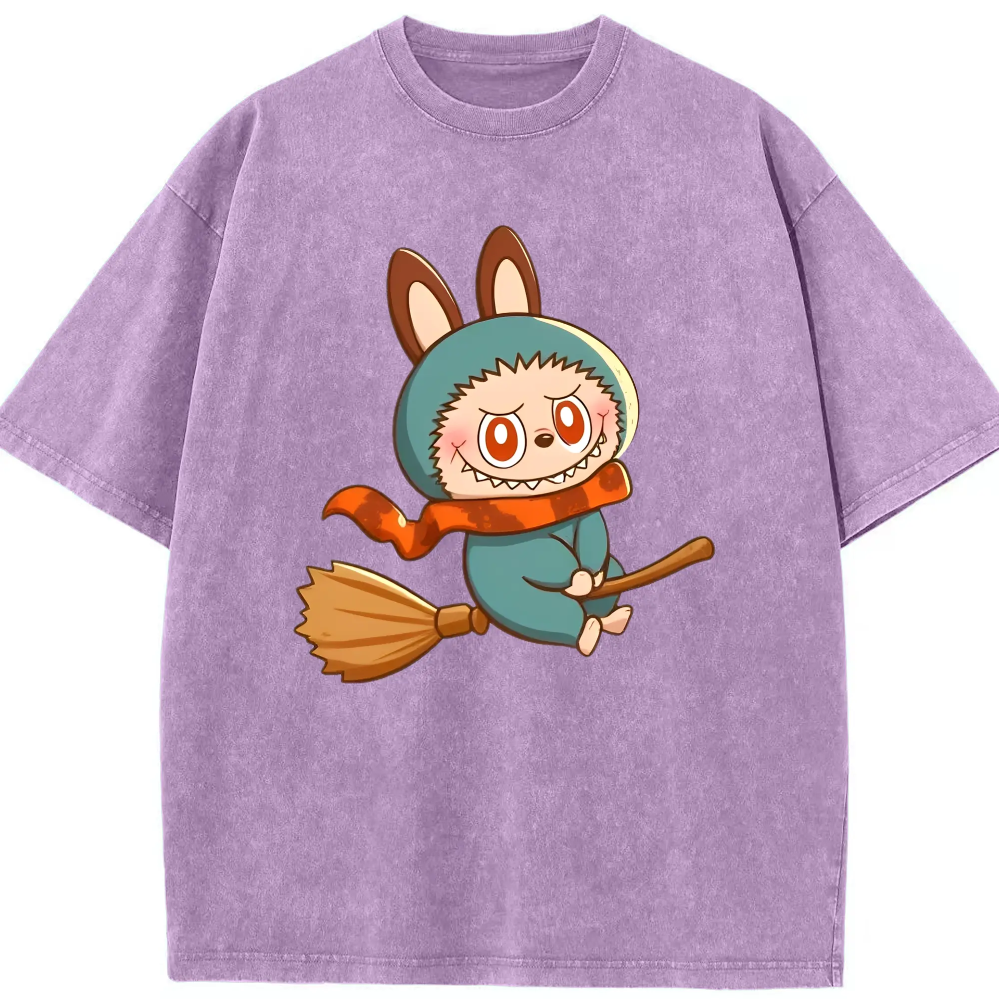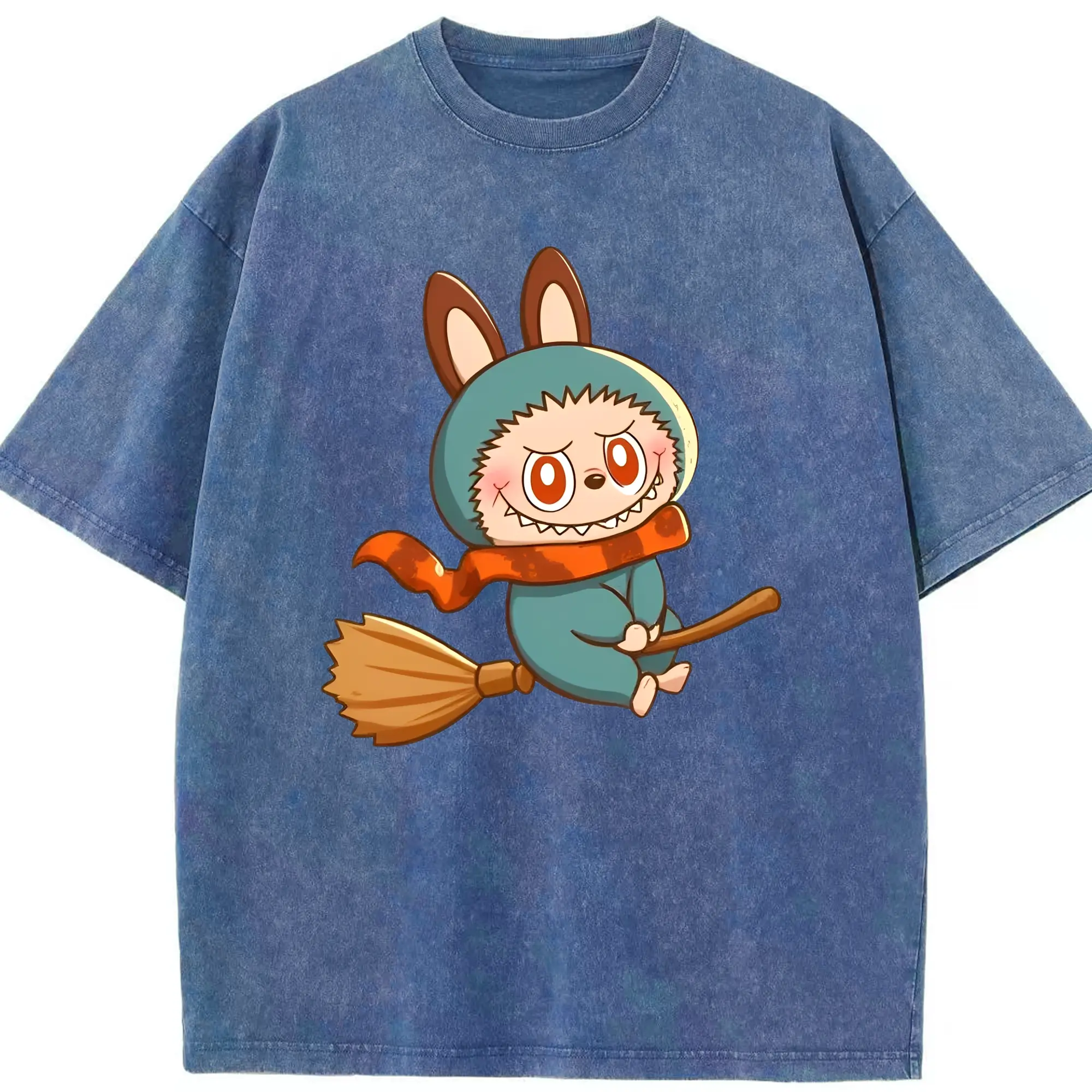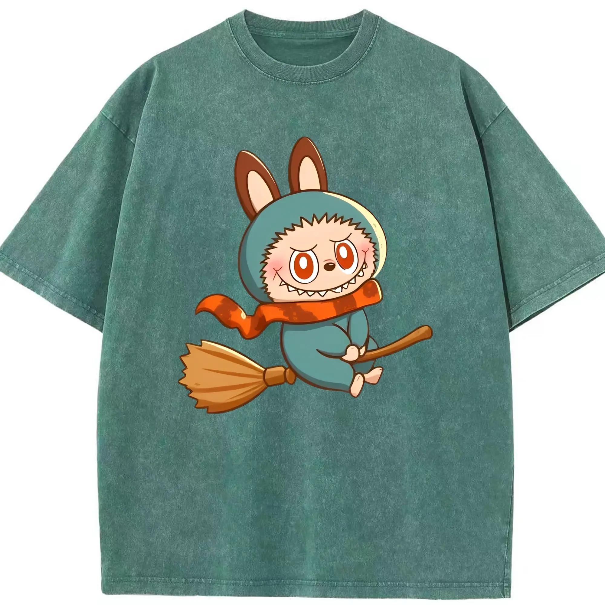 Labubu Cute Magical Witch Broom Cartoon DIY - Washed Vintage Look 230g Cotton Oversized T-Shirt With Front Heat Transfer Print – Soft, Lightweight, Stylish Fit – Comfortable Casual Wear For Sports & Everyday Use