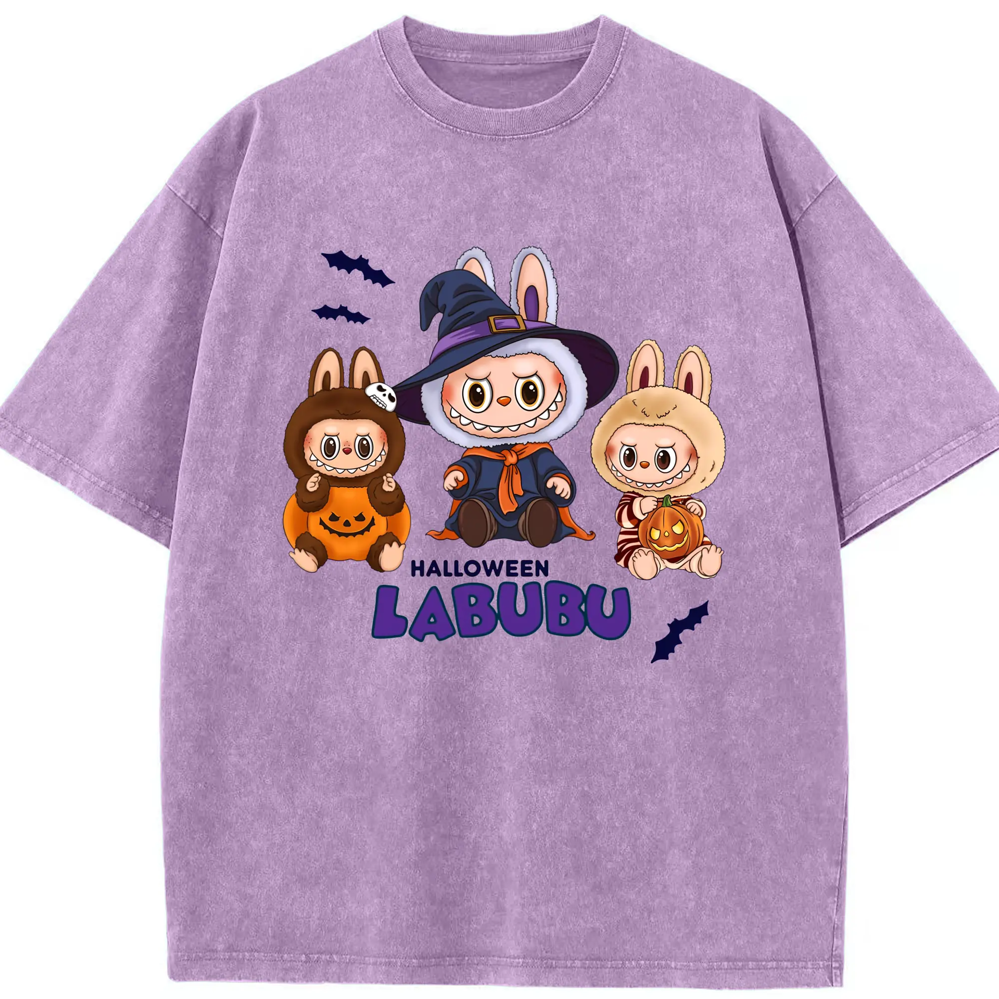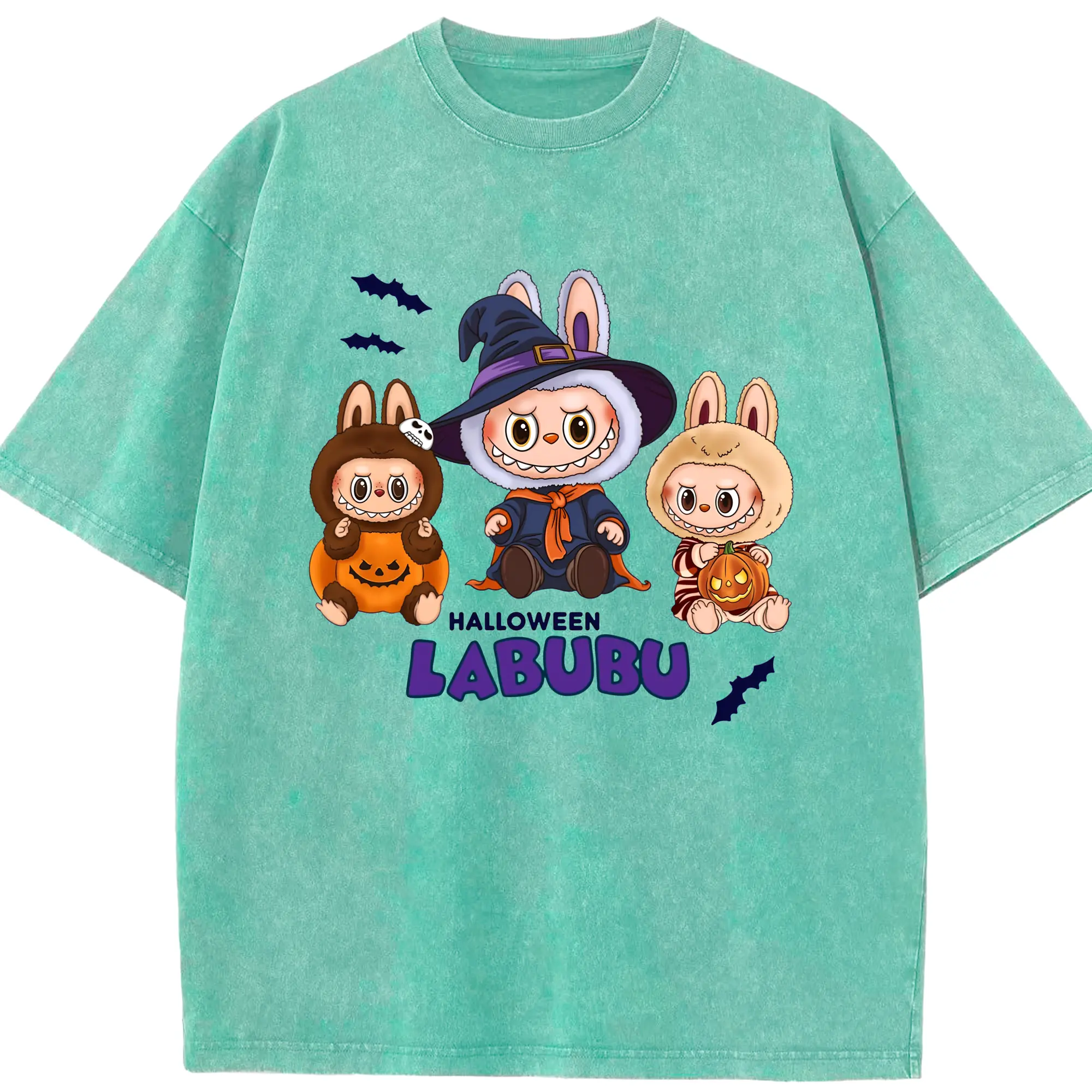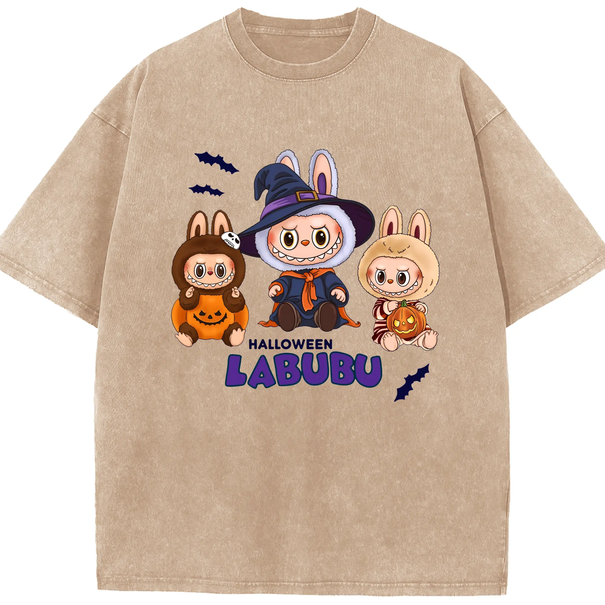 Labubu Halloween Character Collection Trendy DIY - Washed Vintage Look 230g Cotton Oversized T-Shirt With Front Heat Transfer Print – Soft, Lightweight, Stylish Fit – Comfortable Casual Wear For Sports & Everyday Use