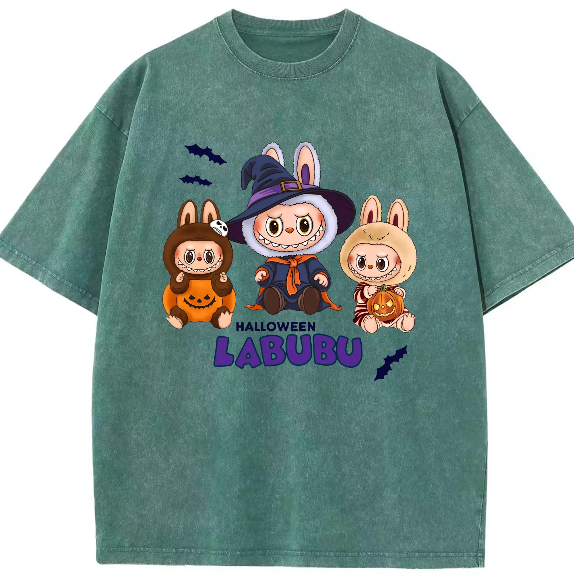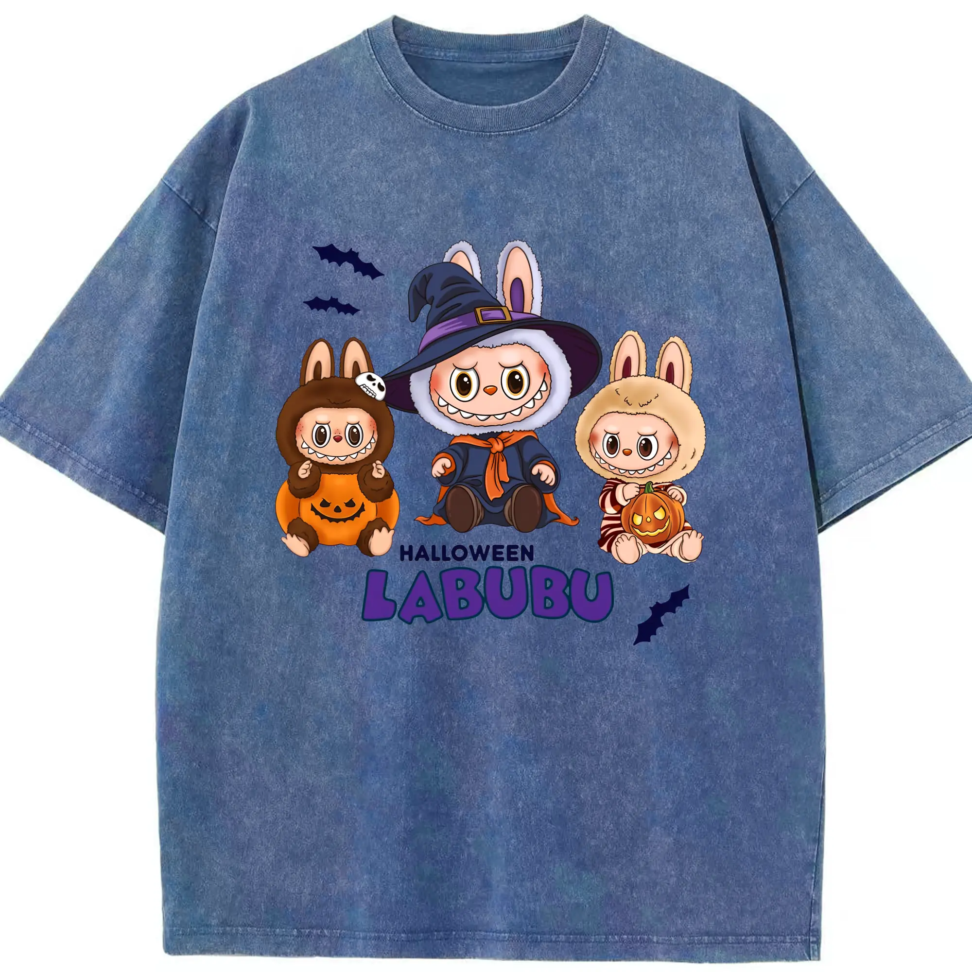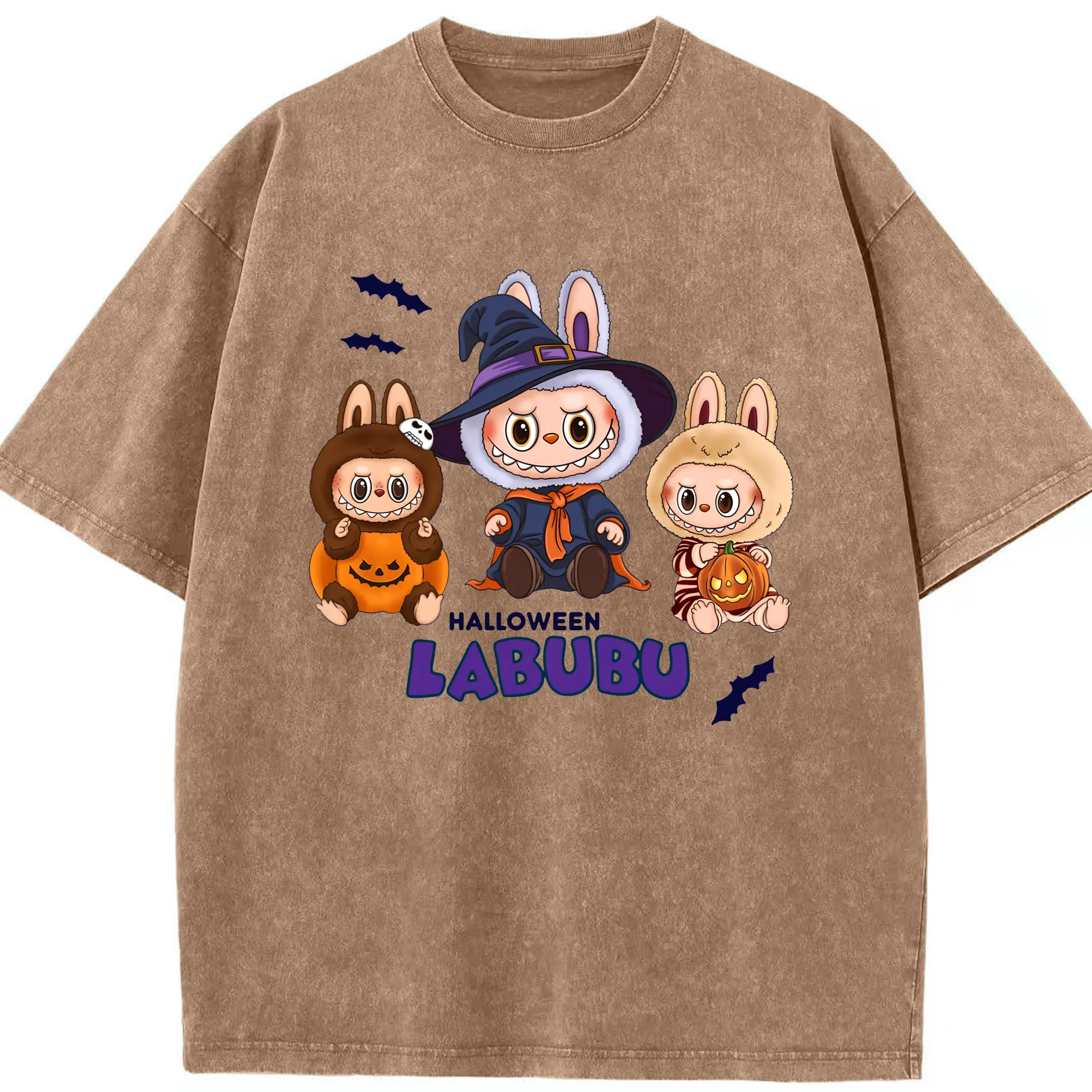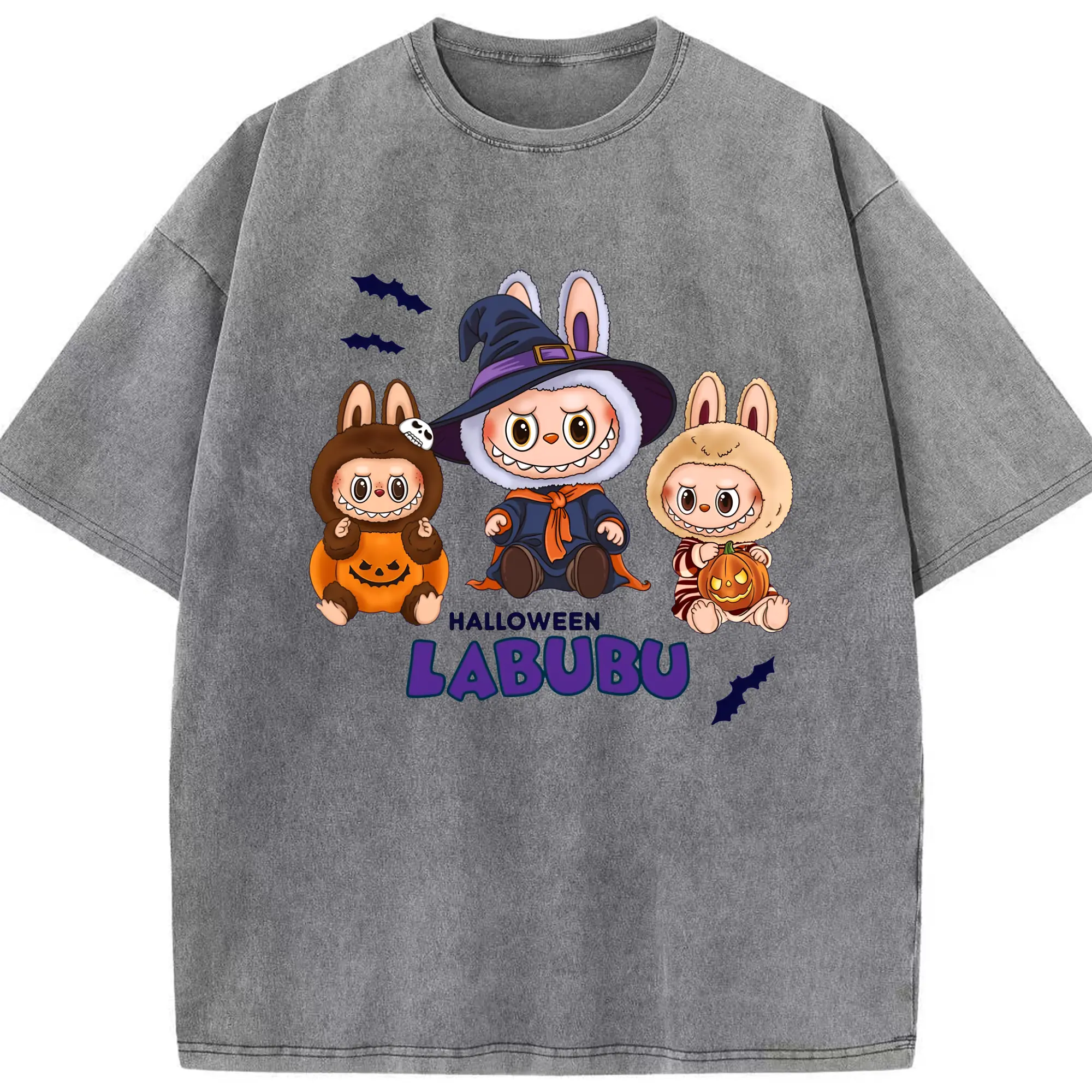 Labubu Halloween Character Collection Trendy DIY - Washed Vintage Look 230g Cotton Oversized T-Shirt With Front Heat Transfer Print – Soft, Lightweight, Stylish Fit – Comfortable Casual Wear For Sports & Everyday Use