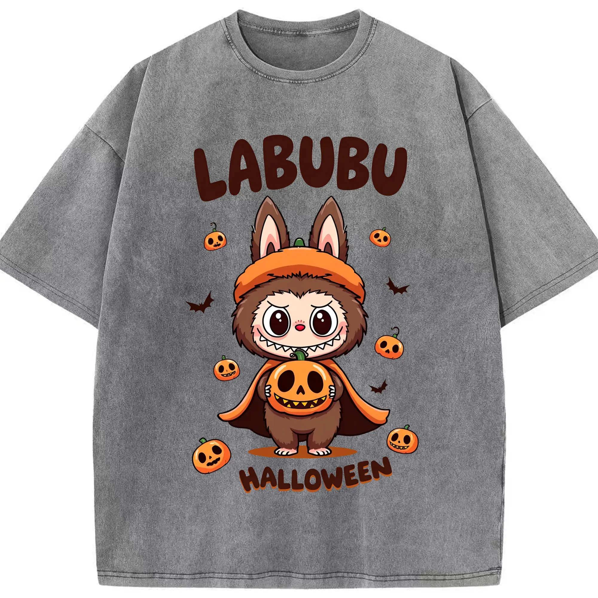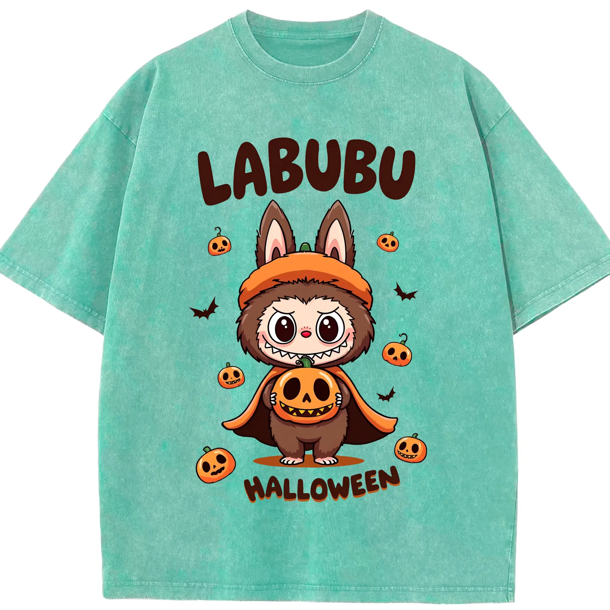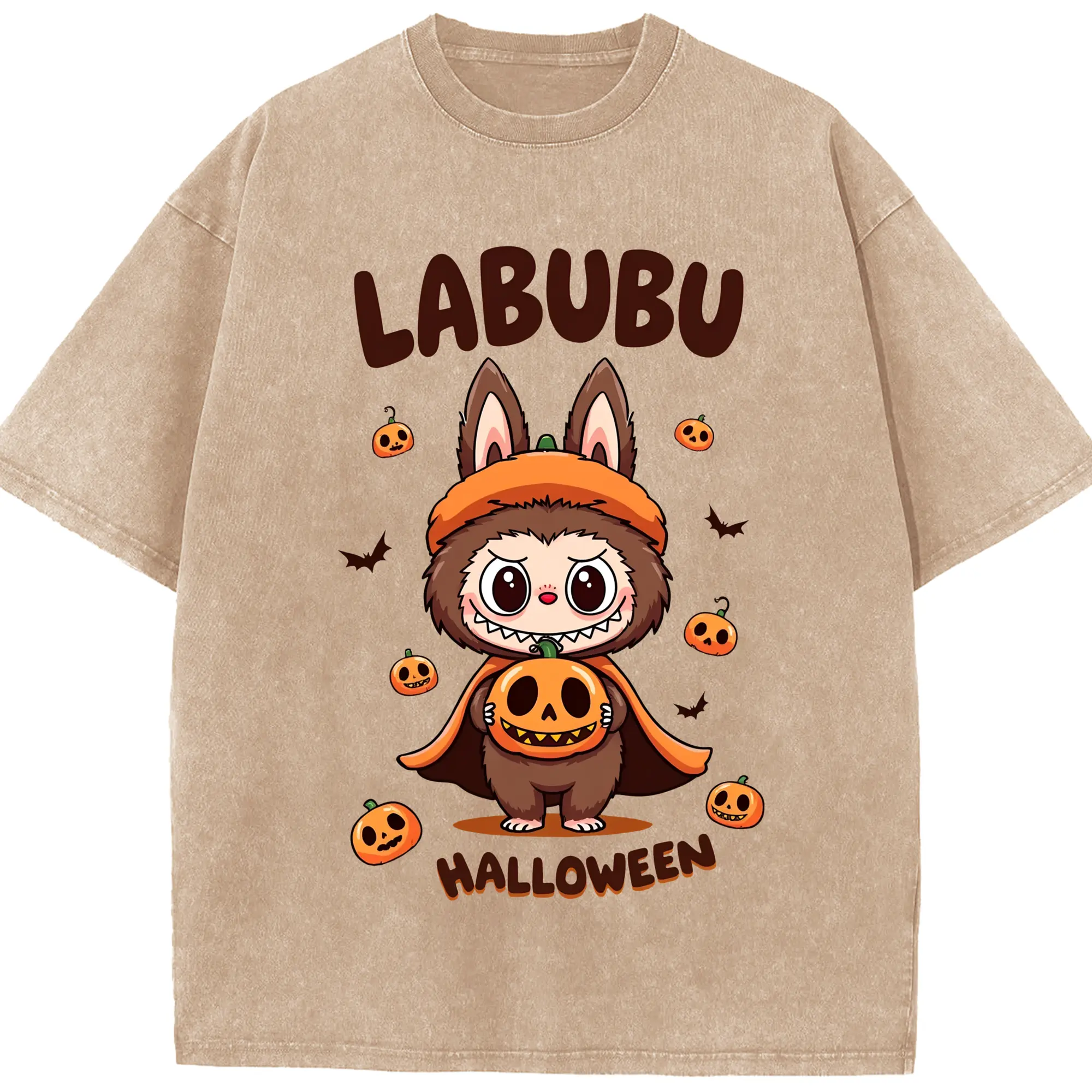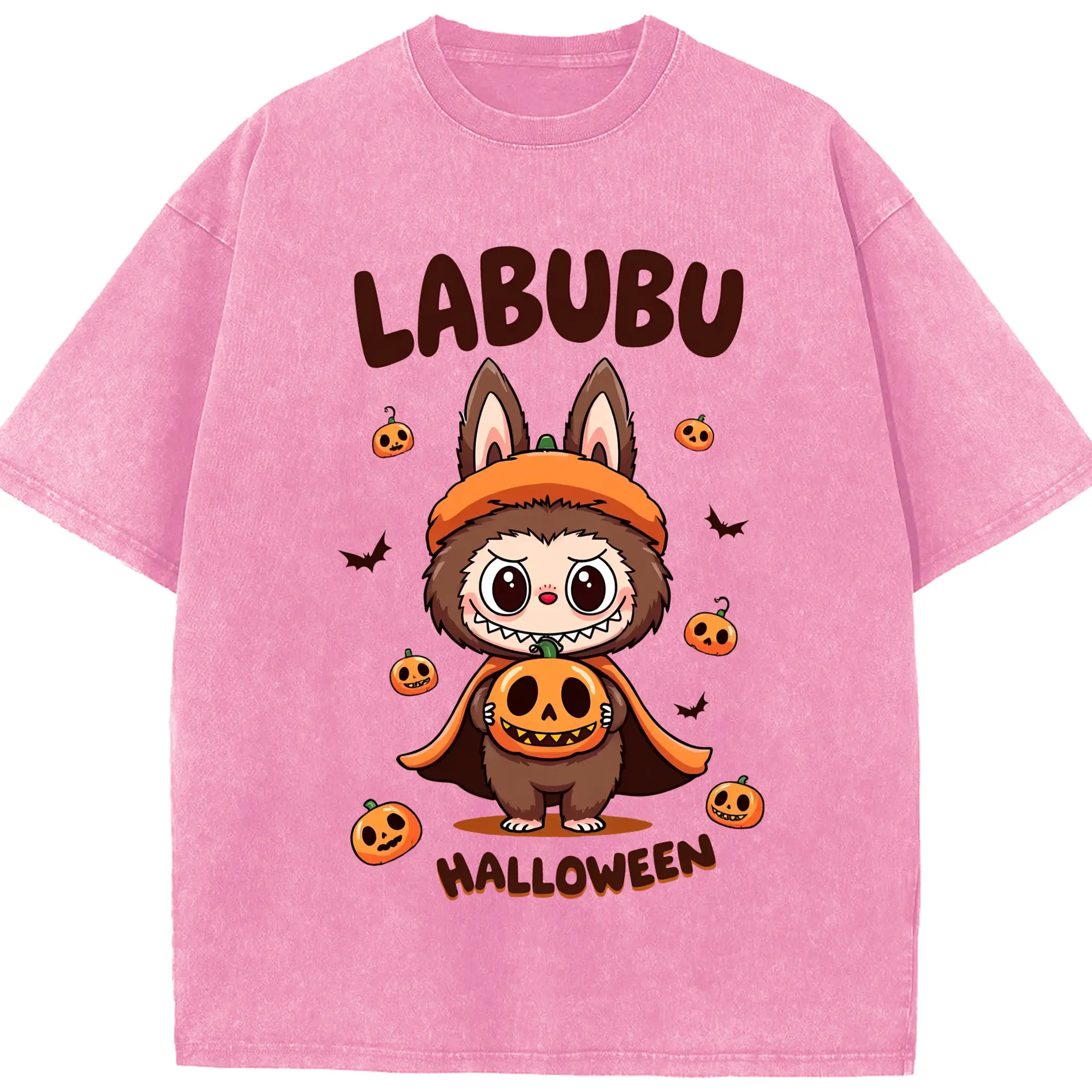 Labubu Halloween Cute Cartoon DIY - Washed Vintage Look 230g Cotton Oversized T-Shirt With Front Heat Transfer Print – Soft, Lightweight, Stylish Fit – Comfortable Casual Wear For Sports & Everyday Use